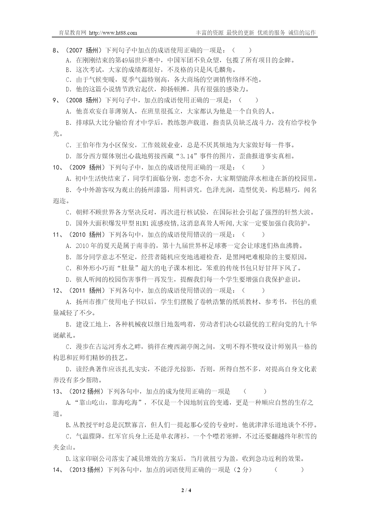 育星教育网http://www.ht88.com丰富的资源最快的更新优质的服务诚信的运作/NUMPAGES4扬州历年中考语文成语题集锦王存红1、(2000扬州)下列各句中加点的成语使用正确的一句是:()A.在铁的事实面前,他哑口无言,耷拉着脑袋。B.他决心以滴水穿石的顽强精神,集中精力,在两小时内读完这部长篇小说。C.这个著名的医院,今年又引进了2名博士,5名硕士,真是人才辈出。D.他俩有同一个心愿,又都有良好的品德,可谓同心同德,—定能合作得很好。2、(2001扬州)下列句中加点的成语使用正确的一项是:()A.你呀,教师的教育不理会,可那些不三不四的“朋友”一开口,你就豁然开朗。B.他慢慢地爬着,一寸一寸地挪动,循序渐进,移到敌人碉堡跟前,引爆了炸药包。C.这些事得发动群众,大家一起干,如果只凭几个人忙乎几天,也只能是事半功倍。D.在竞争日益激烈的今天,我们只有深入改革开放,择善而从,才能跟上时代的步伐。3、(2002扬州)下列句中加点的成语使用正确的一项是:()A.他办事不与人商量,喜欢自出心裁,不考虑后果,常常妨害大家的利益。B.吴垠在当选班长那天的班会上,振振有词地发表就职演说,受到大家的一致好评。C.学校篮球队在区内取胜后,又在市里夺冠,现在已经偃旗息鼓,回到了学校。D.我们严正警告吕秀莲,莫以为挟洋就可以妄自尊大,就能够肆无忌惮地分裂祖国。4、(2003扬州)下列句中加点的成语使用正确的一项是:()A.乒坛小将邱贻可在47届世乒赛上一鸣惊人,以4:2淘汰了男子单打头号种子选手波尔。B.初三(2)班全体同学刻苦钻研,合作探究,同学间相互不耻下问,形成了良好的学风。C.阿尔及利亚发生了强烈地震,顷刻间天翻地覆,不少高大建筑纷纷倒塌,人员伤亡严重。D.桌凳坏了,有人悄悄修好;地上有纸屑,有人随手捡起……同学们对身边小事无所不为。5、(2004扬州)下列句中加点的成语使用错误的一项是:()A.4月18日,扬州结束了没有火车的历史,这一令人欢欣鼓舞的消息很快传遍了祖国各地。B.各商家在商品交易会上推出许多新产品吸引顾客,整个交易大厅车水马龙,人山人海。C.同学之间有了矛盾,大家应该相互谅解,设身处地思考问题,那么矛盾很快就能化解。D.党和政府一直千方百计减轻农民负担,最近又发文件要求全国五年内逐步取消农业税。6、(2005扬州)下列句中加点的成语使用错误的一项是:()A.今年五一黄金周期间,清秀旖旎的瘦西湖风光令国内外游人流连忘返。B.为了在科技比赛中体现创新精神,许多同学处心积虑,设计了各种造型的航空模型。C.为了纪念安徒生诞辰200周年,国家邮政局发行了一套令人赏心悦目的《安徒生童话》邮票。D.在纪念反法西斯战争胜利60周年之际,有识之士提醒人们,要警惕日本军国主义死灰复燃。7、(2006扬州)下列句子中加点的成语使用正确的一项是:()A.经过武警官兵多日奋力扑救,云南森林大火得到基本控制,因而不再生灵涂炭。B.他们响应国家号召,见异思迁,毅然放弃都市的优越条件,扎根西部建功立业。C.许多同学读完《学生危机自救手册》后恍然大悟;学会自救可以躲过许多灾难!D.扬州茱萸湾公园成立了野生动物救助中心,一些遭伤害的野生动物又栩栩如生了。8、(2007扬州)下列句子中加点的成语使用正确的一项是:()A.在刚刚结束的第49届世乒赛中,中国军团不负众望,包揽了所有项目的金睥。B.这次考试,大家的成绩都很好,不及格的只是风毛麟角。C.由于气候变暖,夏季气温特别高,各大商场的空调销售络绎不绝。D.他的这篇小说情节跌宕起伏,抑扬顿摊,具有很强的感染力。9、(2008扬州)下列句子中,加点的成语使用正确的一项是:()A.他喜欢妄自菲薄别人,在班里很孤立,大家都认为他是一个自负的人。B.排球队大比分输给育才中学后,教练怨声载道,指责队员缺乏战斗力,没有给学校争光。C.王伯年作为小区保安,工作兢兢业业,总是不厌其烦地为大家做好每一件事。D.部分西方媒体别出心裁地剪接西藏“3.14”事件的图片,歪曲报道事实真相。10、(2009扬州)下列句子中,加点的成语使用正确的一项是:()A.初中生活快结束了,同学们面临分别,恋恋不舍,大家期望能萍水相逢在新的校园里。B.令中外游客叹为观止的扬州漆器,用料讲究,色泽光润,造型优美,构思精巧,闻名遐迩。C.朝鲜不顾世界各方坚决反对,再次进行核试验,在国际社会引起了强烈的轩然大波。D.国外大面积爆发甲型H1N1流感疫情,这消息真耸人听闻,大家一定要加强自我防护。11、(2010扬州)下列各句中,加点的成语使用错误的一项是:()A.2010年的夏天是属于南非的,第十九届世界杯足球赛一定会让球迷们