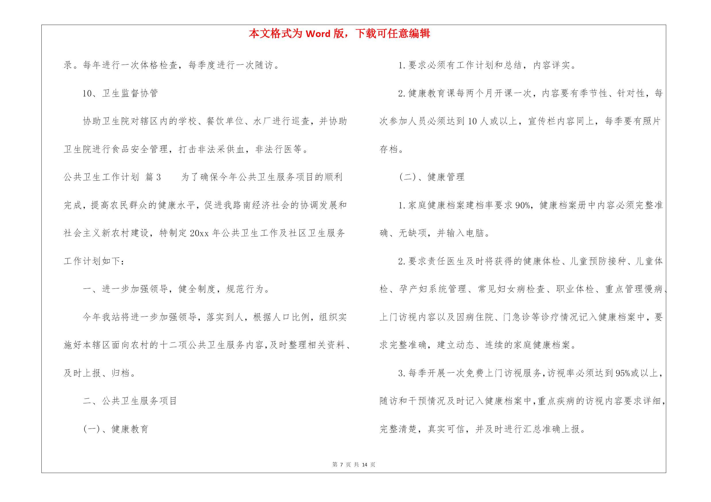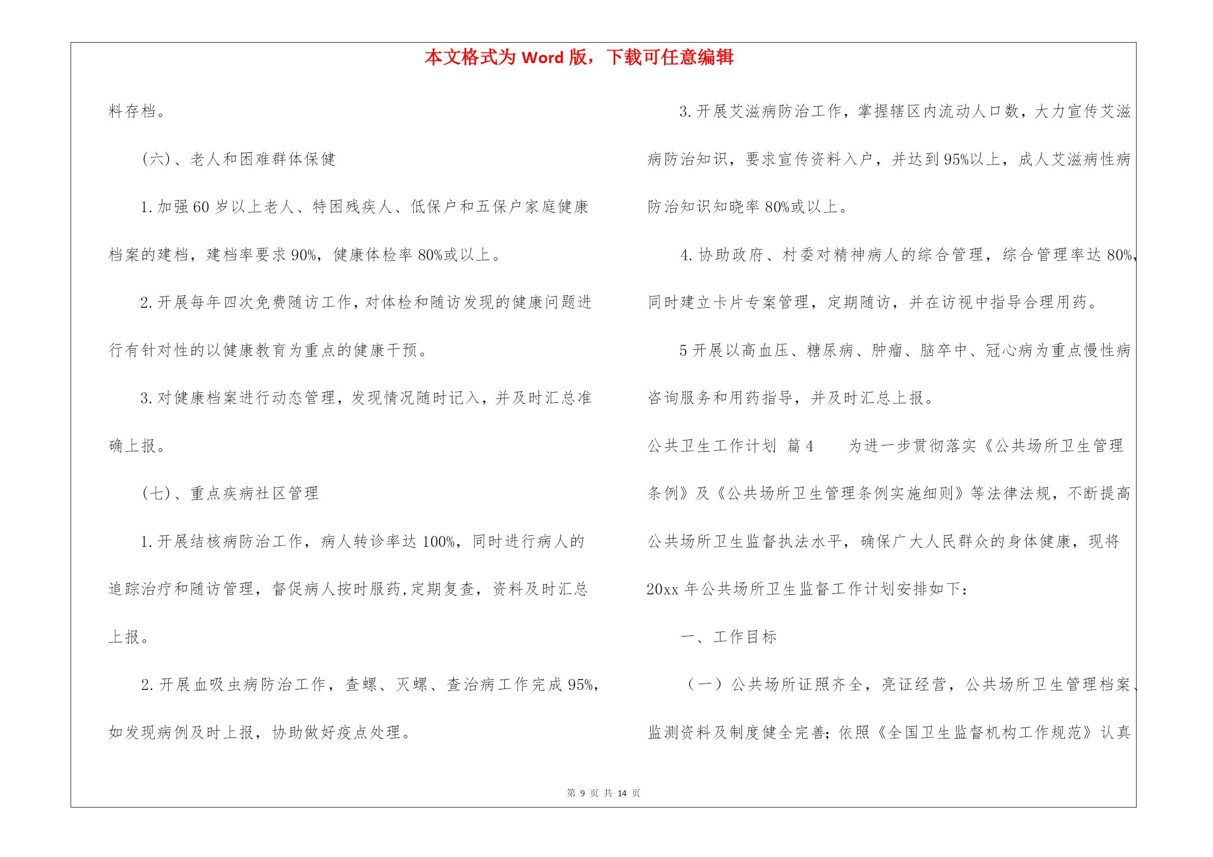 本文格式为Word版,下载可任意编辑第PAGE\*MERGEFORMAT14页共NUMPAGES\*MERGEFORMAT14页公共卫生工作计划五篇公共卫生工作计划范文五篇时光在流逝,从不停歇,我们的工作又进入新的阶段,为了在工作中有更好的成长,写一份工作计划,为接下来的工作做准备吧!但是要怎么样才能避免自嗨型工作计划呢?下面是我编写整理的公共卫生工作计划5篇,希望对大家有所帮助。公共卫生工作计划篇120xx年,我院在xx市卫生局的正确领导下,根据《国家基本公共卫生服务规范》和《xx市20xx年基本公共卫生服务项目实施方案》的要求,认真贯彻xx市卫生局各类文件精神,加强医院内部管理,狠抓基本公共卫生服务项目工作,充分调动全院职工的工作积极性和主动性,积极在全镇范围内开展公共卫生各项宣传,动员,体检工作.但由于恰逢紫帽片区改造项目的开展,本镇8个行政村中的5个行政村涉及到本次拆迁改造范围内,导致20xx年在本镇居民体检及各项宣传方面出现一些困难,大部分居民搬迁,进村入户体检率下降,部分居民联系方式改变,未取得较好的预期效果,公共卫生成绩有所下降.20xx年决定结合紫帽拆迁项目的时期,转换思路,改变原有的宣传体检方式,做好新一年的公共卫生工作.结合20xx年公共卫生检查存在的问题,现将我院基本公共卫生服务项目工作计划汇报如下:(一)、居民健康档案1、争取领导重视,搞好综合协调。为迅速完善居民健康档案和电子档案录入工作,向镇政府分管领导和主要领导汇报,争取紫帽镇党委政府的支持,争取未涉及到拆迁的3个村委支部书记对居民健康档案工作重视,每个村都安排专人负责协助建档工作,并组织开展对因拆迁移居到这3个村的居民进行摸排、体检、完善档案等管理。2、加强组织领导,落实工作责任。在由院长任组长,副院长任副组长的紫帽镇卫生院20xx年基本公共卫生服务项目工作领导小组,加强整个镇居民健康档案工作组织领导,制定操作性强、切实可行的实施方案。成立专门建档工作小组,负责具体建档工作;3、采取多种方式,建立和完善健康档案:一、来我院就诊的病人及其家属;二、下乡到村委会或老人会进行健康体检;三、卫生所负责人或其工作人员带队下乡体检:四:到镇内幼儿园、小学、中学体检;五、新农合、市医院、市中医院的慢性病资料;六、xx市疗养院、泉州三院的重症精神病人资料;七、市妇幼、镇计生办的孕产妇、06岁新生儿和儿童的资料。4、加强人员培训,强化服务意识。为确保居民健康档案保质保量完成,组织公共卫生人员积极参与XX市、xx市卫生局举办的公共卫生培训班,积极借鉴其他兄弟单位的好的方式、方法,并对我院每一名参与居民健康档案建立的工作人员传达培训内容和精神,让每一名公共人员熟悉居民健康档案建立的重要性和必要性,熟练掌握自己的本职工作和建档、录入程序。5、加大宣传力度,提高居民主动建档意识。提高我镇居民主动参与建档意识,采取发放各类宣传材料和各村广播的形式相结合,让每一名紫帽镇居民了解居民健康档案,积极主动配合我院建档工作小组顺利完成居民建档工作。(二)、健康教育1、严格按照健康教育服务规范要求,认真贯彻落实xx市卫生局及上级部门的各项健康教育项目工作,发放宣传材料、开展健康教育讲座、设置宣传栏等各种方式,针对重点人群、重点疾病和我镇主要卫生问题和危险因素开展健康教育和健康促进活动;并指导村卫生所定期开展健康教育活动。2、加强健康教育档案管理,要求每次健康教育活动都有完整的健康教育活动记录。(三)、预防接种为适龄儿童接种乙肝疫苗、卡介苗、脊灰疫苗、百白破疫苗、白破疫苗、麻疹疫苗、甲肝疫苗、流脑疫苗、乙脑疫苗、麻腮风疫苗等国家免疫规划疫苗;在重点地区,对重点人群进行针对性接种,包括肾综合征出血热疫苗、炭疽疫苗、钩体疫苗;发现、报告预防接种中的疑似异常反应,并协助调查处理。具备《疫苗储存和运输管理规范》规定的冷藏设施、设备和冷链管理制度并按照要求进行疫苗的领发和冷链管理,保证疫苗质量。此外我院还将不定时的到镇幼儿园进行随访,且在每年的一个阶段里的每个星期六专门开设幼儿园儿童疫苗接种门诊,对儿童进行疫苗补种。(四)、传染病及突发公共卫生事件报告及处理1、依据《传染病防治法》、《传染病信息报告管理规范》以及突发公共卫生事件报告及处理规范要求,建立健全传染病及突发公共卫生事件报告管理制度。2、定期对本单位人员进行传染病防治知识、技能的培训;及时发现、登记并报告紫帽镇内发现的传染病病例和疑似病例,参与现场疫点处理;开展结核病、艾滋病等传染病防治知识宣传和咨询服务;提高居民传染病防治知识的知晓率。(五)、0—6岁儿童健康管理按照《xx市20xx年基本公共卫生服务项目实施方案》规定,我院妇产科将为0-6岁婴幼儿、儿童建立儿童保健手册和完整电子健康档案,定期开展新生儿访视及儿童系统