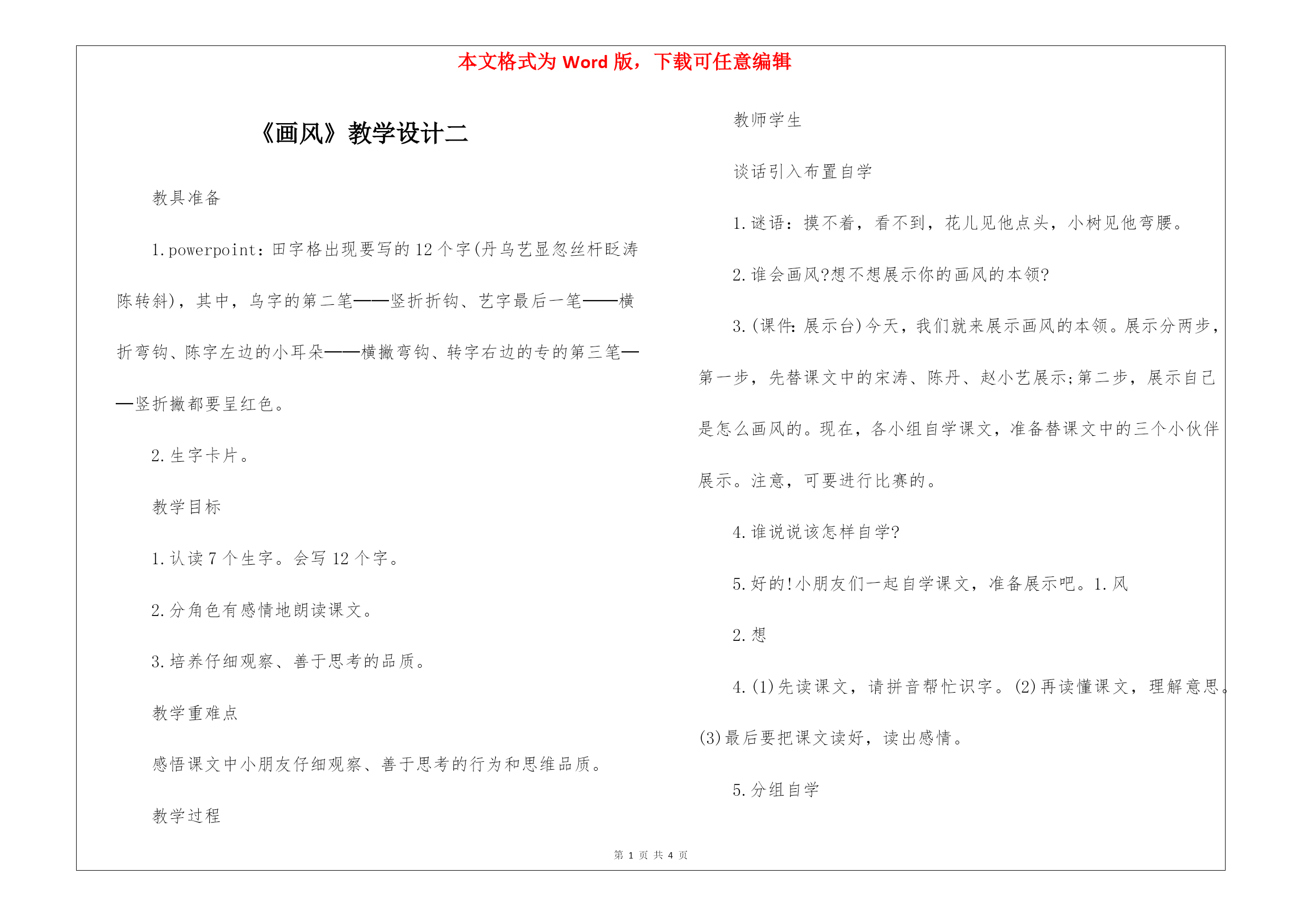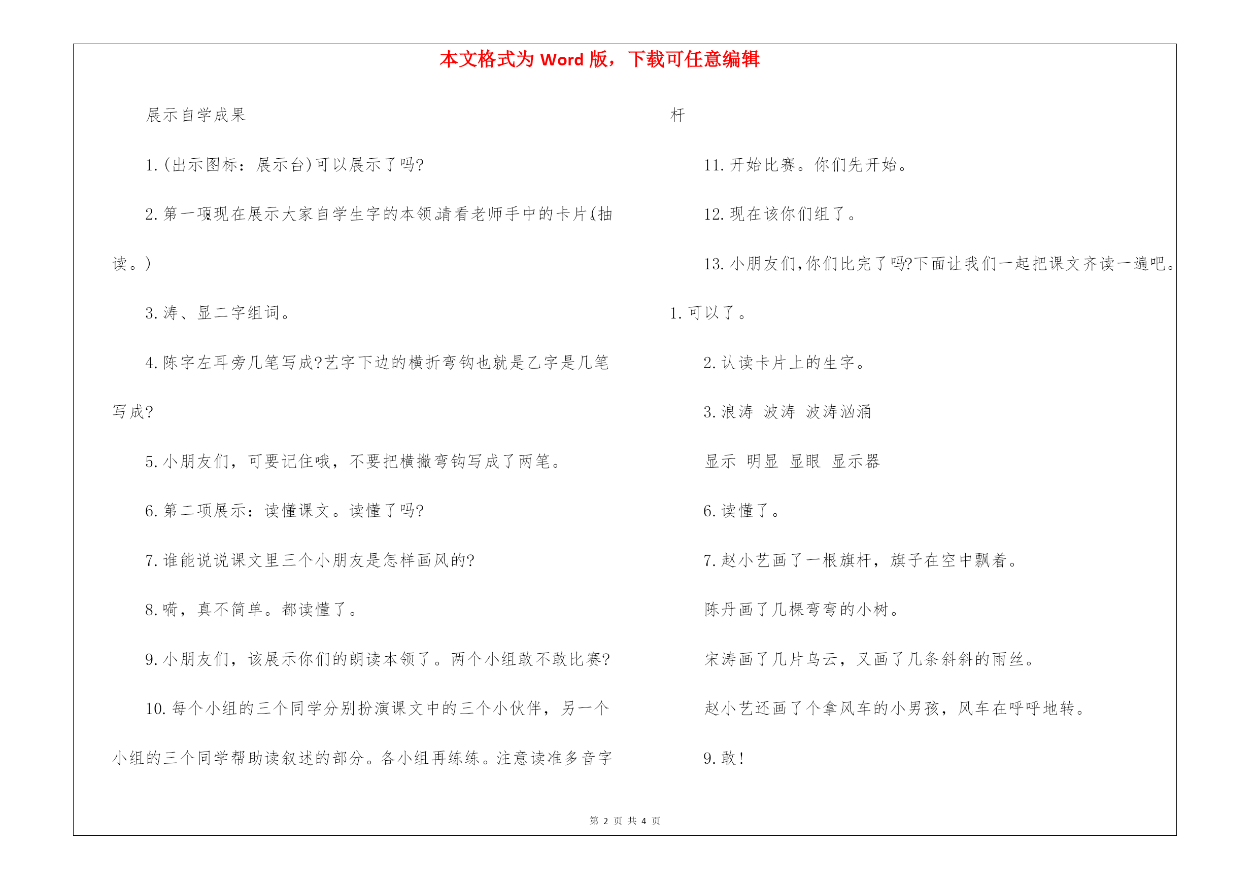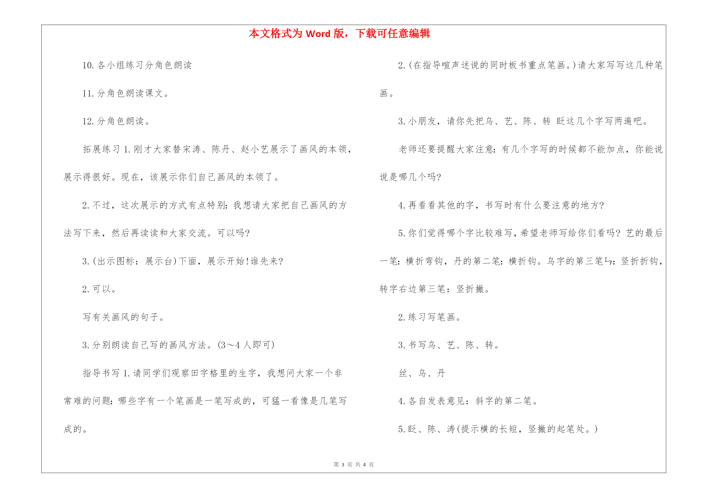 本文格式为Word版,下载可任意编辑第PAGE\*MERGEFORMAT4页共NUMPAGES\*MERGEFORMAT4页《画风》教学设计二教具准备1.powerpoint:田字格出现要写的12个字(丹乌艺显忽丝杆眨涛陈转斜),其中,乌字的第二笔──竖折折钩、艺字最后一笔──横折弯钩、陈字左边的小耳朵──横撇弯钩、转字右边的专的第三笔──竖折撇都要呈红色。2.生字卡片。教学目标1.认读7个生字。会写12个字。2.分角色有感情地朗读课文。3.培养仔细观察、善于思考的品质。教学重难点感悟课文中小朋友仔细观察、善于思考的行为和思维品质。教学过程教师学生谈话引入布置自学1.谜语:摸不着,看不到,花儿见他点头,小树见他弯腰。2.谁会画风?想不想展示你的画风的本领?3.(课件:展示台)今天,我们就来展示画风的本领。展示分两步,第一步,先替课文中的宋涛、陈丹、赵小艺展示;第二步,展示自己是怎么画风的。现在,各小组自学课文,准备替课文中的三个小伙伴展示。注意,可要进行比赛的。4.谁说说该怎样自学?5.好的!小朋友们一起自学课文,准备展示吧。1.风2.想4.(1)先读课文,请拼音帮忙识字。(2)再读懂课文,理解意思。(3)最后要把课文读好,读出感情。5.分组自学展示自学成果1.(出示图标:展示台)可以展示了吗?2.第一项:现在展示大家自学生字的本领。请看老师手中的卡片。(抽读。)3.涛、显二字组词。4.陈字左耳旁几笔写成?艺字下边的横折弯钩也就是乙字是几笔写成?5.小朋友们,可要记住哦,不要把横撇弯钩写成了两笔。6.第二项展示:读懂课文。读懂了吗?7.谁能说说课文里三个小朋友是怎样画风的?8.嗬,真不简单。都读懂了。9.小朋友们,该展示你们的朗读本领了。两个小组敢不敢比赛?10.每个小组的三个同学分别扮演课文中的三个小伙伴,另一个小组的三个同学帮助读叙述的部分。各小组再练练。注意读准多音字杆11.开始比赛。你们先开始。12.现在该你们组了。13.小朋友们,你们比完了吗?下面让我们一起把课文齐读一遍吧。1.可以了。2.认读卡片上的生字。3.浪涛波涛波涛汹涌显示明显显眼显示器6.读懂了。7.赵小艺画了一根旗杆,旗子在空中飘着。陈丹画了几棵弯弯的小树。宋涛画了几片乌云,又画了几条斜斜的雨丝。赵小艺还画了个拿风车的小男孩,风车在呼呼地转。9.敢!10.各小组练习分角色朗读11.分角色朗读课文。12.分角色朗读。拓展练习1.刚才大家替宋涛、陈丹、赵小艺展示了画风的本领,展示得很好。现在,该展示你们自己画风的本领了。2.不过,这次展示的方式有点特别:我想请大家把自己画风的方法写下来,然后再读读和大家交流。可以吗?3.(出示图标:展示台)下面,展示开始!谁先来?2.可以。写有关画风的句子。3.分别朗读自己写的画风方法。(3~4人即可)指导书写1.请同学们观察田字格里的生字,我想问大家一个非常难的问题:哪些字有一个笔画是一笔写成的,可猛一看像是几笔写成的。2.(在指导喧声述说的同时板书重点笔画。)请大家写写这几种笔画。3.小朋友,请你先把乌、艺、陈、转眨这几个字写两遍吧。老师还要提醒大家注意:有几个字写的时候都不能加点,你能说说是哪几个吗?4.再看看其他的字,书写时有什么要注意的地方?5.你们觉得哪个字比较难写,希望老师写给你们看吗?艺的最后一笔:横折弯钩,丹的第二笔:横折钩。乌字的第三笔ㄣ:竖折折钩,转字右边第三笔:竖折撇。2.练习写笔画。3.书写乌、艺、陈、转。丝、乌、丹4.各自发表意见:斜字的第二笔。5.眨、陈、涛(提示横的长短,竖撇的起笔处。)
