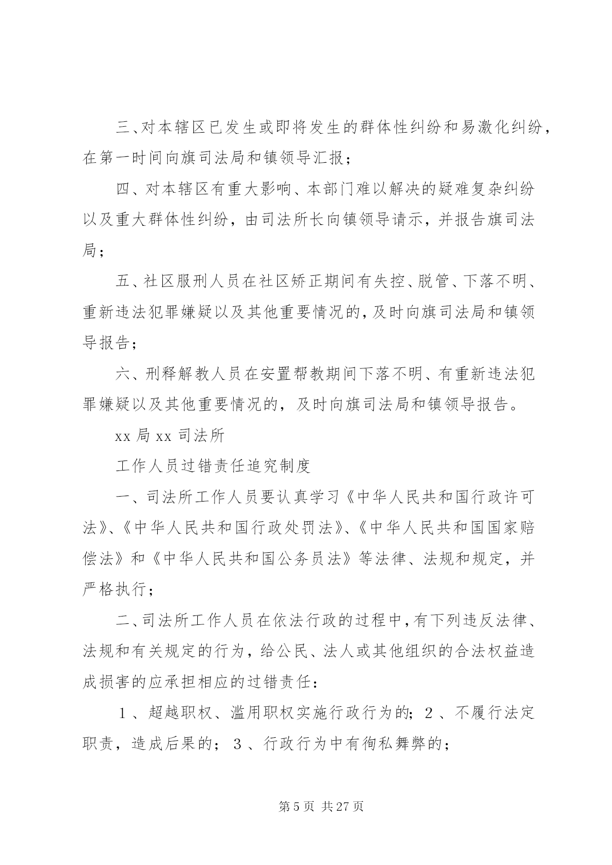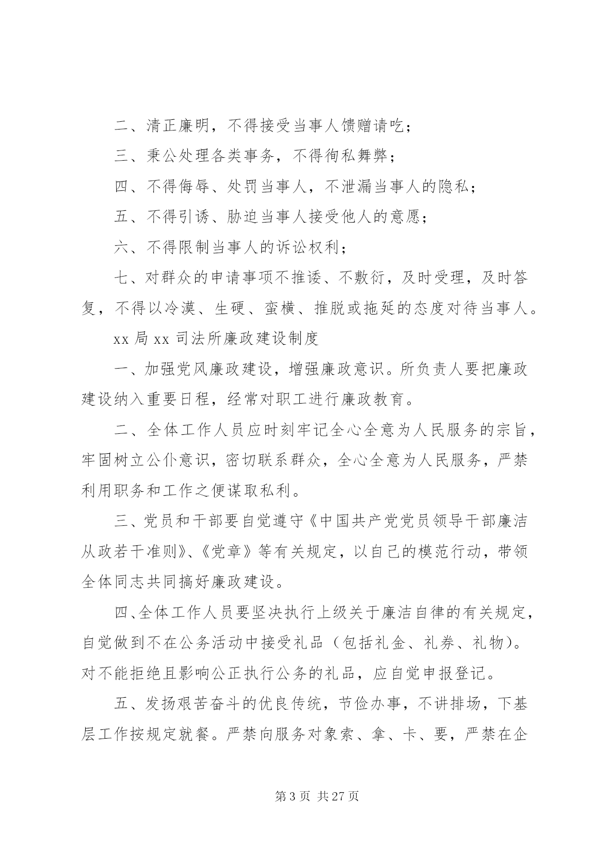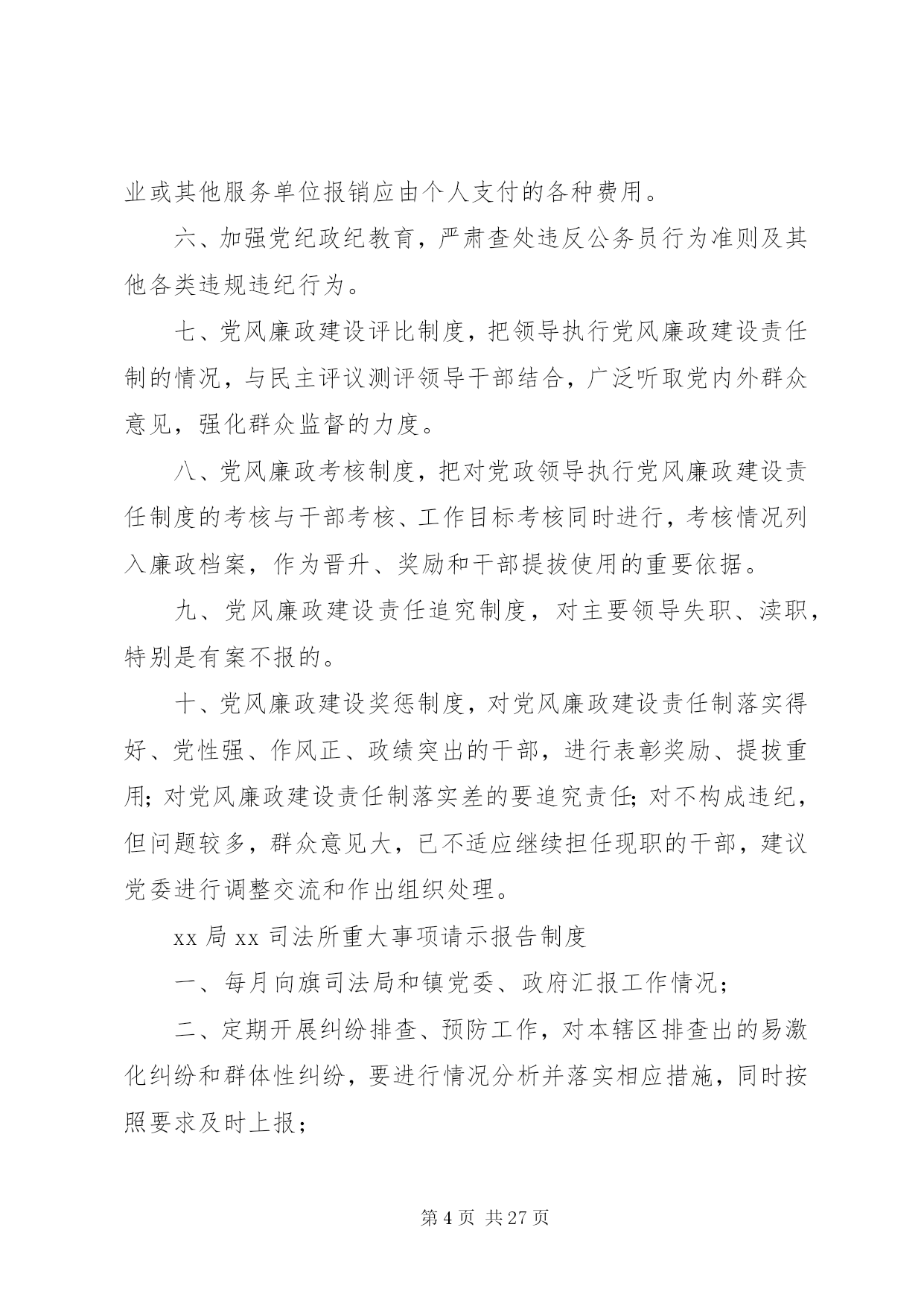 第PAGE\*Arabic\*MERGEFORMAT27页共NUMPAGES\*MERGEFORMAT27页苏木镇司法所各项制度xx局xx司法所工作职能一、指导管理人民调解工作,参与调解疑难、复杂民间纠纷;二、承担社区矫正日常工作,组织开展对社区服刑人员的管理、教育和帮助;三、指导管理基层法律服务工作;四、协调有关部门和单位开展对刑释解教人员的安置帮教工作;五、组织开展法制宣传教育工作;六、组织开展基层依法治理工作,为镇党委、政府依法行政、依法管理提供法律意见和建议;七、指导人民调解委员会处理社会矛盾纠纷;八、参与社会治安综合治理工作;九、完成旗司法局和镇党委、政府交办的维护社会稳定的有关工作。xx局xx司法所所长岗位职责一、全面负责司法所各项工作,认真制定和精心实施司法所年度和阶段性工作计划,按质按量全面完成全年各项工作任务;二、自觉服从旗司法局和镇党委、政府的领导,模范遵守、执行国家的法律、法规和党的政策,作风民主、求真务实,团结和带领全所人员,勇于探索、大胆开拓,优质高效地开展各项工作,为维护一方平安作出积极努力;三、不断加强内部管理,对所内人员明确分工、职责分明,对基层调解委员会进行业务指导并实施工作考核,对有关的信息、统计、资料收集等工作做到台帐齐全,档案完整;四、重视抓好全所人员的政治业务学习,与时俱进,不断提高全所人员的政治业务素质,确保全所人员胜任本职工作,并且无违法犯罪和违纪行为,无因素质低下、工作不力而造成工作上的重大失误;五、增强民主管理意识,所内重大事务通过所务会集体讨论决定,集思广益,防止工作失误。xx局xx司法所工作人员岗位职责一、按照岗位分工,爱岗敬业,认真履行和胜任本职工作;二、自觉遵守所内各项规章制度,严格各项工作程序;三、树立公仆意识,热情接待来访群众,并经常深入基层密切联系群众,尽力为群众排忧解难;四、对影响社会稳定的重大信息、重大事项以及需要协调有关部门联合处理的问题,应及时向所领导或上级分管领导请示汇报;五、完成领导交办的其他各项工作。xx局xx司法所廉洁自律制度一、按照司法行政工作的相关规定执行回避制度;二、清正廉明,不得接受当事人馈赠请吃;三、秉公处理各类事务,不得徇私舞弊;四、不得侮辱、处罚当事人,不泄漏当事人的隐私;五、不得引诱、胁迫当事人接受他人的意愿;六、不得限制当事人的诉讼权利;七、对群众的申请事项不推诿、不敷衍,及时受理,及时答复,不得以冷漠、生硬、蛮横、推脱或拖延的态度对待当事人。xx局xx司法所廉政建设制度一、加强党风廉政建设,增强廉政意识。所负责人要把廉政建设纳入重要日程,经常对职工进行廉政教育。二、全体工作人员应时刻牢记全心全意为人民服务的宗旨,牢固树立公仆意识,密切联系群众,全心全意为人民服务,严禁利用职务和工作之便谋取私利。三、党员和干部要自觉遵守《中国共产党党员领导干部廉洁从政若干准则》、《党章》等有关规定,以自己的模范行动,带领全体同志共同搞好廉政建设。四、全体工作人员要坚决执行上级关于廉洁自律的有关规定,自觉做到不在公务活动中接受礼品(包括礼金、礼券、礼物)。对不能拒绝且影响公正执行公务的礼品,应自觉申报登记。五、发扬艰苦奋斗的优良传统,节俭办事,不讲排场,下基层工作按规定就餐。严禁向服务对象索、拿、卡、要,严禁在企业或其他服务单位报销应由个人支付的各种费用。六、加强党纪政纪教育,严肃查处违反公务员行为准则及其他各类违规违纪行为。七、党风廉政建设评比制度,把领导执行党风廉政建设责任制的情况,与民主评议测评领导干部结合,广泛听取党内外群众意见,强化群众监督的力度。八、党风廉政考核制度,把对党政领导执行党风廉政建设责任制度的考核与干部考核、工作目标考核同时进行,考核情况列入廉政档案,作为晋升、奖励和干部提拔使用的重要依据。九、党风廉政建设责任追究制度,对主要领导失职、渎职,特别是有案不报的。十、党风廉政建设奖惩制度,对党风廉政建设责任制落实得好、党性强、作风正、政绩突出的干部,进行表彰奖励、提拔重用;对党风廉政建设责任制落实差的要追究责任;对不构成违纪,但问题较多,群众意见大,已不适应继续担任现职的干部,建议党委进行调整交流和作出组织处理。xx局xx司法所重大事项请示报告制度一、每月向旗司法局和镇党委、政府汇报工作情况;二、定期开展纠纷排查、预防工作,对本辖区排查出的易激化纠纷和群体性纠纷,要进行情况分析并落实相应措施,同时按照要求及时上报;三、对本辖区已发生或即将发生的群体性纠纷和易激化纠纷,在第一时间向旗司法局和镇领导汇报;四、对本辖区有重大影响、本部门难以解决的疑难复杂纠纷以及重大群体性纠纷,由司法所长向镇领导请示,并报告旗司法局;五、社区服刑人员在社区矫正期间有失控、脱管、下落不明、重新违法犯罪嫌疑以及其他重要情况的,及时