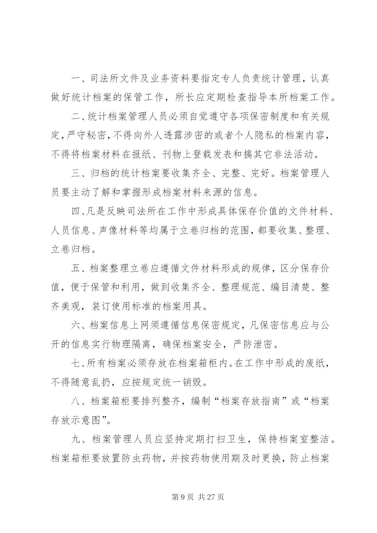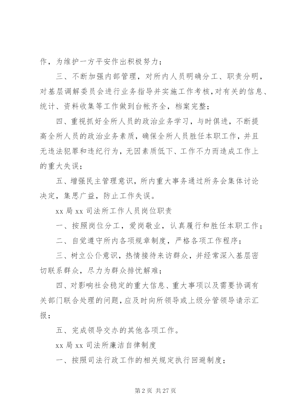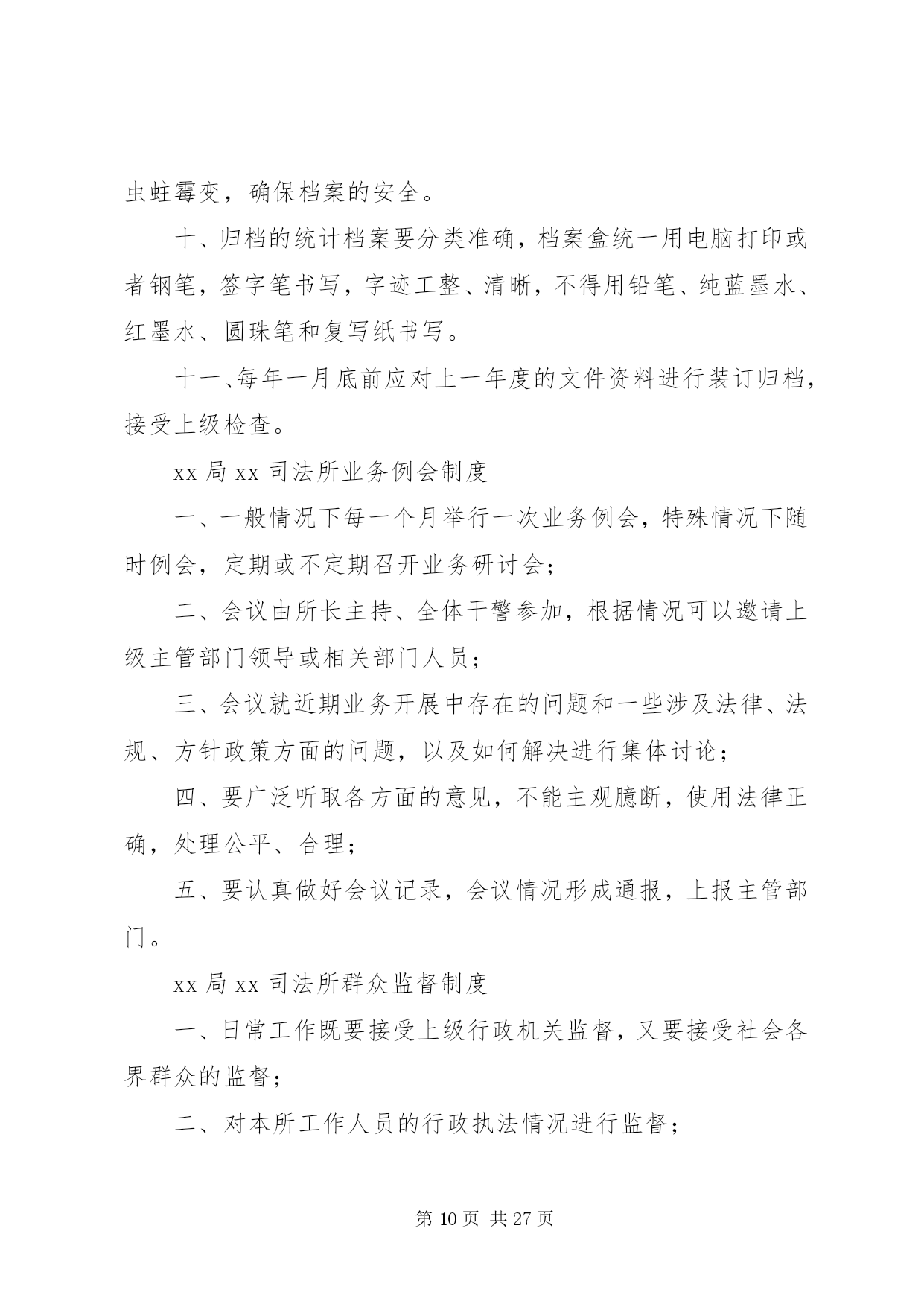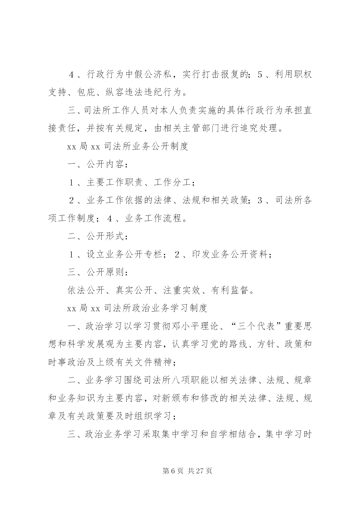 第PAGE\*Arabic\*MERGEFORMAT27页共NUMPAGES\*MERGEFORMAT27页苏木镇司法所各项制度xx局xx司法所工作职能一、指导管理人民调解工作,参与调解疑难、复杂民间纠纷;二、承担社区矫正日常工作,组织开展对社区服刑人员的管理、教育和帮助;三、指导管理基层法律服务工作;四、协调有关部门和单位开展对刑释解教人员的安置帮教工作;五、组织开展法制宣传教育工作;六、组织开展基层依法治理工作,为镇党委、政府依法行政、依法管理提供法律意见和建议;七、指导人民调解委员会处理社会矛盾纠纷;八、参与社会治安综合治理工作;九、完成旗司法局和镇党委、政府交办的维护社会稳定的有关工作。xx局xx司法所所长岗位职责一、全面负责司法所各项工作,认真制定和精心实施司法所年度和阶段性工作计划,按质按量全面完成全年各项工作任务;二、自觉服从旗司法局和镇党委、政府的领导,模范遵守、执行国家的法律、法规和党的政策,作风民主、求真务实,团结和带领全所人员,勇于探索、大胆开拓,优质高效地开展各项工作,为维护一方平安作出积极努力;三、不断加强内部管理,对所内人员明确分工、职责分明,对基层调解委员会进行业务指导并实施工作考核,对有关的信息、统计、资料收集等工作做到台帐齐全,档案完整;四、重视抓好全所人员的政治业务学习,与时俱进,不断提高全所人员的政治业务素质,确保全所人员胜任本职工作,并且无违法犯罪和违纪行为,无因素质低下、工作不力而造成工作上的重大失误;五、增强民主管理意识,所内重大事务通过所务会集体讨论决定,集思广益,防止工作失误。xx局xx司法所工作人员岗位职责一、按照岗位分工,爱岗敬业,认真履行和胜任本职工作;二、自觉遵守所内各项规章制度,严格各项工作程序;三、树立公仆意识,热情接待来访群众,并经常深入基层密切联系群众,尽力为群众排忧解难;四、对影响社会稳定的重大信息、重大事项以及需要协调有关部门联合处理的问题,应及时向所领导或上级分管领导请示汇报;五、完成领导交办的其他各项工作。xx局xx司法所廉洁自律制度一、按照司法行政工作的相关规定执行回避制度;二、清正廉明,不得接受当事人馈赠请吃;三、秉公处理各类事务,不得徇私舞弊;四、不得侮辱、处罚当事人,不泄漏当事人的隐私;五、不得引诱、胁迫当事人接受他人的意愿;六、不得限制当事人的诉讼权利;七、对群众的申请事项不推诿、不敷衍,及时受理,及时答复,不得以冷漠、生硬、蛮横、推脱或拖延的态度对待当事人。xx局xx司法所廉政建设制度一、加强党风廉政建设,增强廉政意识。所负责人要把廉政建设纳入重要日程,经常对职工进行廉政教育。二、全体工作人员应时刻牢记全心全意为人民服务的宗旨,牢固树立公仆意识,密切联系群众,全心全意为人民服务,严禁利用职务和工作之便谋取私利。三、党员和干部要自觉遵守《中国共产党党员领导干部廉洁从政若干准则》、《党章》等有关规定,以自己的模范行动,带领全体同志共同搞好廉政建设。四、全体工作人员要坚决执行上级关于廉洁自律的有关规定,自觉做到不在公务活动中接受礼品(包括礼金、礼券、礼物)。对不能拒绝且影响公正执行公务的礼品,应自觉申报登记。五、发扬艰苦奋斗的优良传统,节俭办事,不讲排场,下基层工作按规定就餐。严禁向服务对象索、拿、卡、要,严禁在企业或其他服务单位报销应由个人支付的各种费用。六、加强党纪政纪教育,严肃查处违反公务员行为准则及其他各类违规违纪行为。七、党风廉政建设评比制度,把领导执行党风廉政建设责任制的情况,与民主评议测评领导干部结合,广泛听取党内外群众意见,强化群众监督的力度。八、党风廉政考核制度,把对党政领导执行党风廉政建设责任制度的考核与干部考核、工作目标考核同时进行,考核情况列入廉政档案,作为晋升、奖励和干部提拔使用的重要依据。九、党风廉政建设责任追究制度,对主要领导失职、渎职,特别是有案不报的。十、党风廉政建设奖惩制度,对党风廉政建设责任制落实得好、党性强、作风正、政绩突出的干部,进行表彰奖励、提拔重用;对党风廉政建设责任制落实差的要追究责任;对不构成违纪,但问题较多,群众意见大,已不适应继续担任现职的干部,建议党委进行调整交流和作出组织处理。xx局xx司法所重大事项请示报告制度一、每月向旗司法局和镇党委、政府汇报工作情况;二、定期开展纠纷排查、预防工作,对本辖区排查出的易激化纠纷和群体性纠纷,要进行情况分析并落实相应措施,同时按照要求及时上报;三、对本辖区已发生或即将发生的群体性纠纷和易激化纠纷,在第一时间向旗司法局和镇领导汇报;四、对本辖区有重大影响、本部门难以解决的疑难复杂纠纷以及重大群体性纠纷,由司法所长向镇领导请示,并报告旗司法局;五、社区服刑人员在社区矫正期间有失控、脱管、下落不明、重新违法犯罪嫌疑以及其他重要情况的,及时