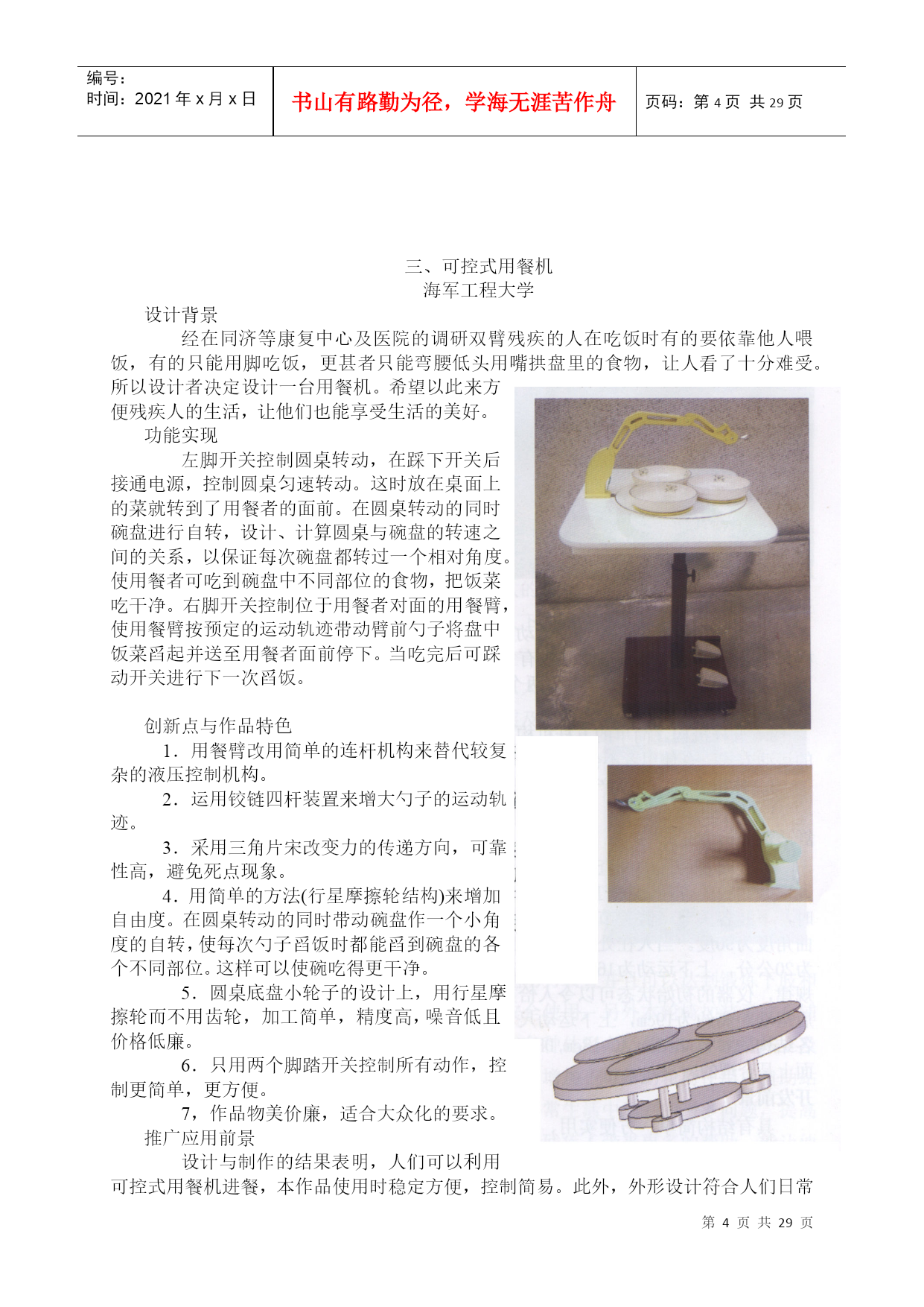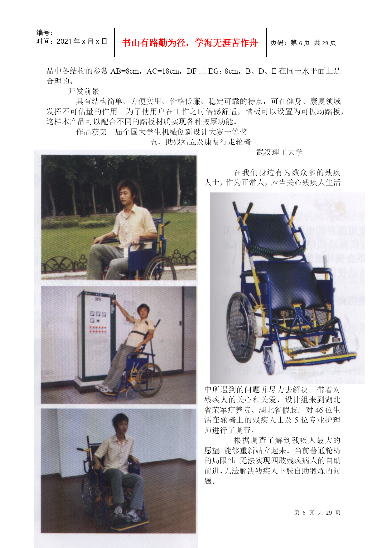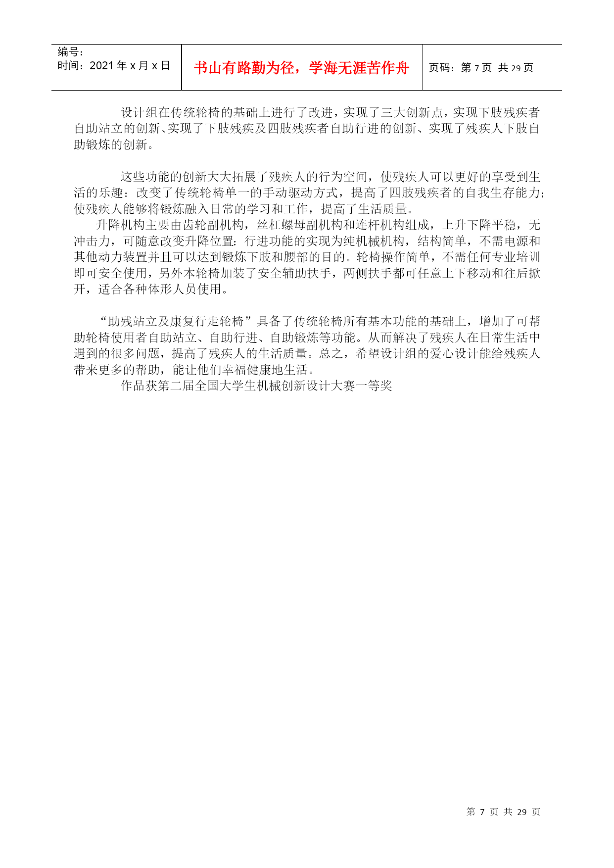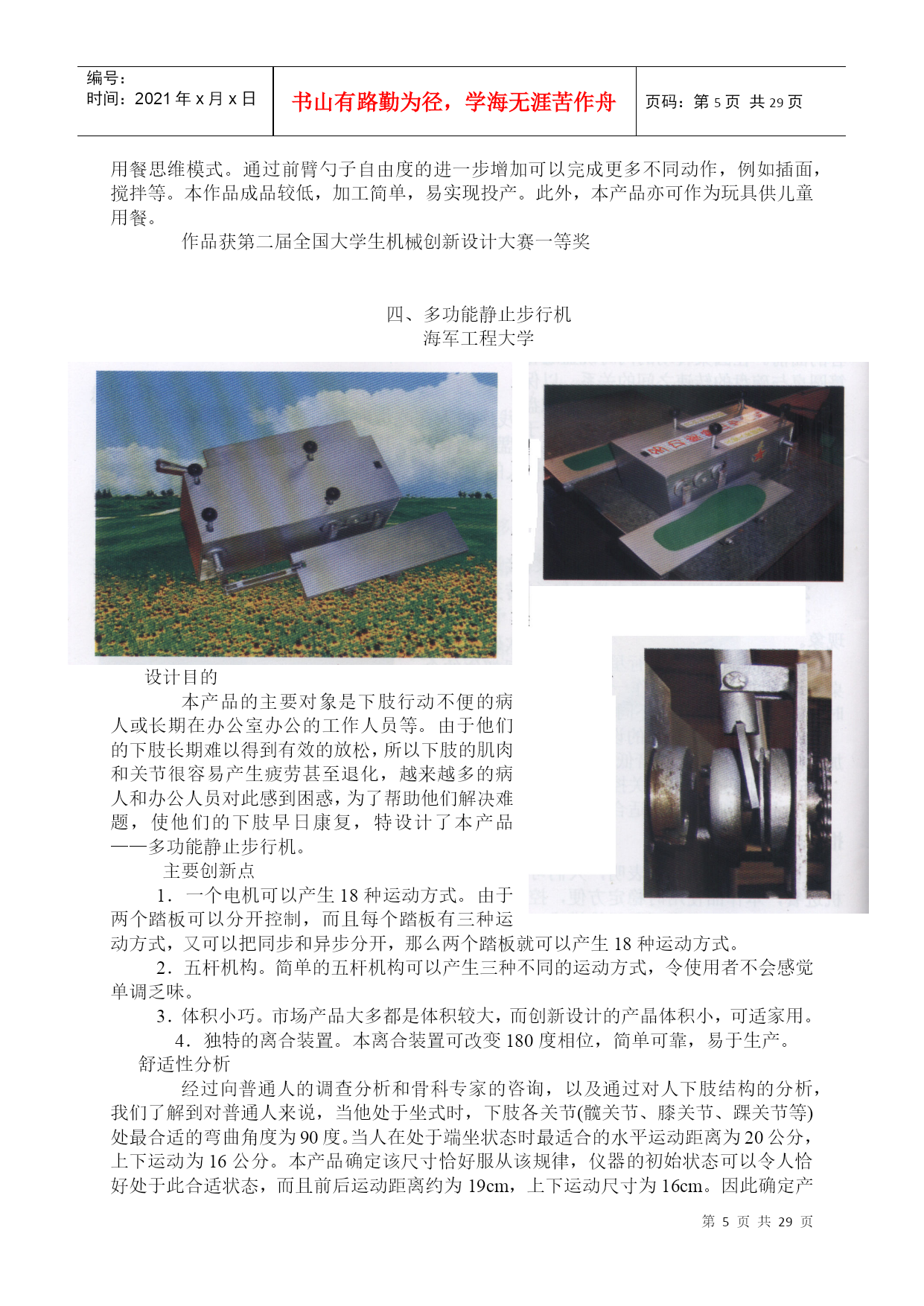编号:时间:2021年x月x日书山有路勤为径,学海无涯苦作舟页码:第PAGE29页共NUMPAGES29页第PAGE\*MERGEFORMAT29页共NUMPAGES\*MERGEFORMAT29页湖北机械创新大赛集(摘录部分)一、星轮行星轮转换式可爬楼轮椅华中科技大学作品简介:本产品为星轮行星轮转换式可爬楼轮椅。平地运行时系统处于行星轮状态,当需要爬楼时通过离合器将行星齿轮系锁死使系统转换为星轮状态,从而使得轮椅在能有效攀爬楼梯的同时又能很好地适应平地行走。此轮椅可广泛用于社区,医院,养老院等,适用于腿脚不便的残疾人和老年人,能很好地实现平地行走,攀爬楼梯,翻越台阶,门槛等功能。作品获第二届全国大学生机械创新设计大赛一等奖二、助残多功能手华中科技大学作品简介:作品是为下肢残疾坐轮椅者、卧床不起者和行动不便的老人等设计的一种延长上肢从而方便抓取的助残器具。能够实现拿取放置在不远处但是伸手又够不到的轻小物品。使用者单手握动手柄,通过操纵类似钳子的夹持机构,抓取物体。作品中部的六杆机构实现机械手的伸缩,将拿取的物品移近使用者。夹持部分设计成特殊形状,以适应夹取不同大小物体的要求。突破常规思路,用简单的六杆机构实现伸缩功能,使得这种延长手臂的助残机械手更具实用性,更方便残疾人的使用。本品极具推广应用价值。设计过程中切实考虑了实际应用中的很多问题,相比国外产品功能更加强大,真正填补了此类助残用品的国内空白。作品获第二后全国大学生机械创新设计大赛一等奖三、可控式用餐机海军工程大学设计背景经在同济等康复中心及医院的调研双臂残疾的人在吃饭时有的要依靠他人喂饭,有的只能用脚吃饭,更甚者只能弯腰低头用嘴拱盘里的食物,让人看了十分难受。所以设计者决定设计一台用餐机。希望以此来方便残疾人的生活,让他们也能享受生活的美好。功能实现左脚开关控制圆桌转动,在踩下开关后接通电源,控制圆桌匀速转动。这时放在桌面上的菜就转到了用餐者的面前。在圆桌转动的同时碗盘进行自转,设计、计算圆桌与碗盘的转速之间的关系,以保证每次碗盘都转过一个相对角度。使用餐者可吃到碗盘中不同部位的食物,把饭菜吃干净。右脚开关控制位于用餐者对面的用餐臂,使用餐臂按预定的运动轨迹带动臂前勺子将盘中饭菜舀起并送至用餐者面前停下。当吃完后可踩动开关进行下一次舀饭。创新点与作品特色1.用餐臂改用简单的连杆机构来替代较复杂的液压控制机构。2.运用铰链四杆装置来增大勺子的运动轨迹。3.采用三角片宋改变力的传递方向,可靠性高,避免死点现象。4.用简单的方法(行星摩擦轮结构)来增加自由度。在圆桌转动的同时带动碗盘作一个小角度的自转,使每次勺子舀饭时都能舀到碗盘的各个不同部位。这样可以使碗吃得更干净。5.圆桌底盘小轮子的设计上,用行星摩擦轮而不用齿轮,加工简单,精度高,噪音低且价格低廉。6.只用两个脚踏开关控制所有动作,控制更简单,更方便。7,作品物美价廉,适合大众化的要求。推广应用前景设计与制作的结果表明,人们可以利用可控式用餐机进餐,本作品使用时稳定方便,控制简易。此外,外形设计符合人们日常用餐思维模式。通过前臂勺子自由度的进一步增加可以完成更多不同动作,例如插面,搅拌等。本作品成品较低,加工简单,易实现投产。此外,本产品亦可作为玩具供儿童用餐。作品获第二届全国大学生机械创新设计大赛一等奖四、多功能静止步行机海军工程大学设计目的本产品的主要对象是下肢行动不便的病人或长期在办公室办公的工作人员等。由于他们的下肢长期难以得到有效的放松,所以下肢的肌肉和关节很容易产生疲劳甚至退化,越来越多的病人和办公人员对此感到困惑,为了帮助他们解决难题,使他们的下肢早日康复,特设计了本产品——多功能静止步行机。主要创新点1.一个电机可以产生18种运动方式。由于两个踏板可以分开控制,而且每个踏板有三种运动方式,又可以把同步和异步分开,那么两个踏板就可以产生18种运动方式。2.五杆机构。简单的五杆机构可以产生三种不同的运动方式,令使用者不会感觉单调乏味。3.体积小巧。市场产品大多都是体积较大,而创新设计的产晶体积小,可适家用。4.独特的离合装置。本离合装置可改变180度相位,简单可靠,易于生产。舒适性分析经过向普通人的调查分析和骨科专家的咨询,以及通过对人下肢结构的分析,我们了解到对普通人来说,当他处于坐式时,下肢各关节(髋关节、膝关节、踝关节等)处最合适的弯曲角度为90度。当人在处于端坐状态时最适合的水平运动距离为20公分,上下运动为16公分。本产品确定该尺寸恰好服从该规律,仪器的初始状态可以令人恰好处于此合适状态,而且前