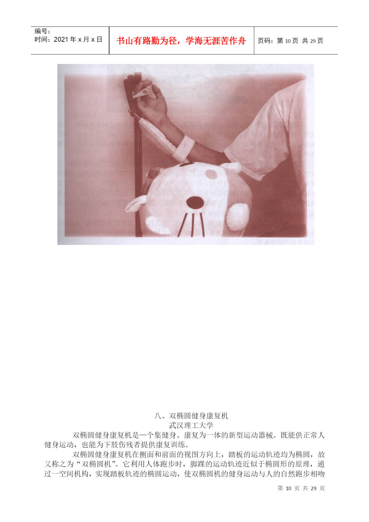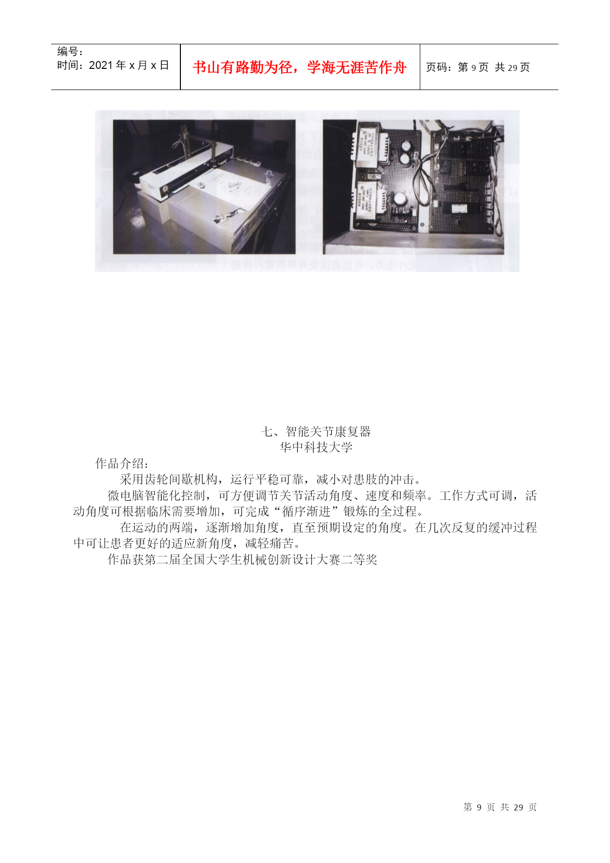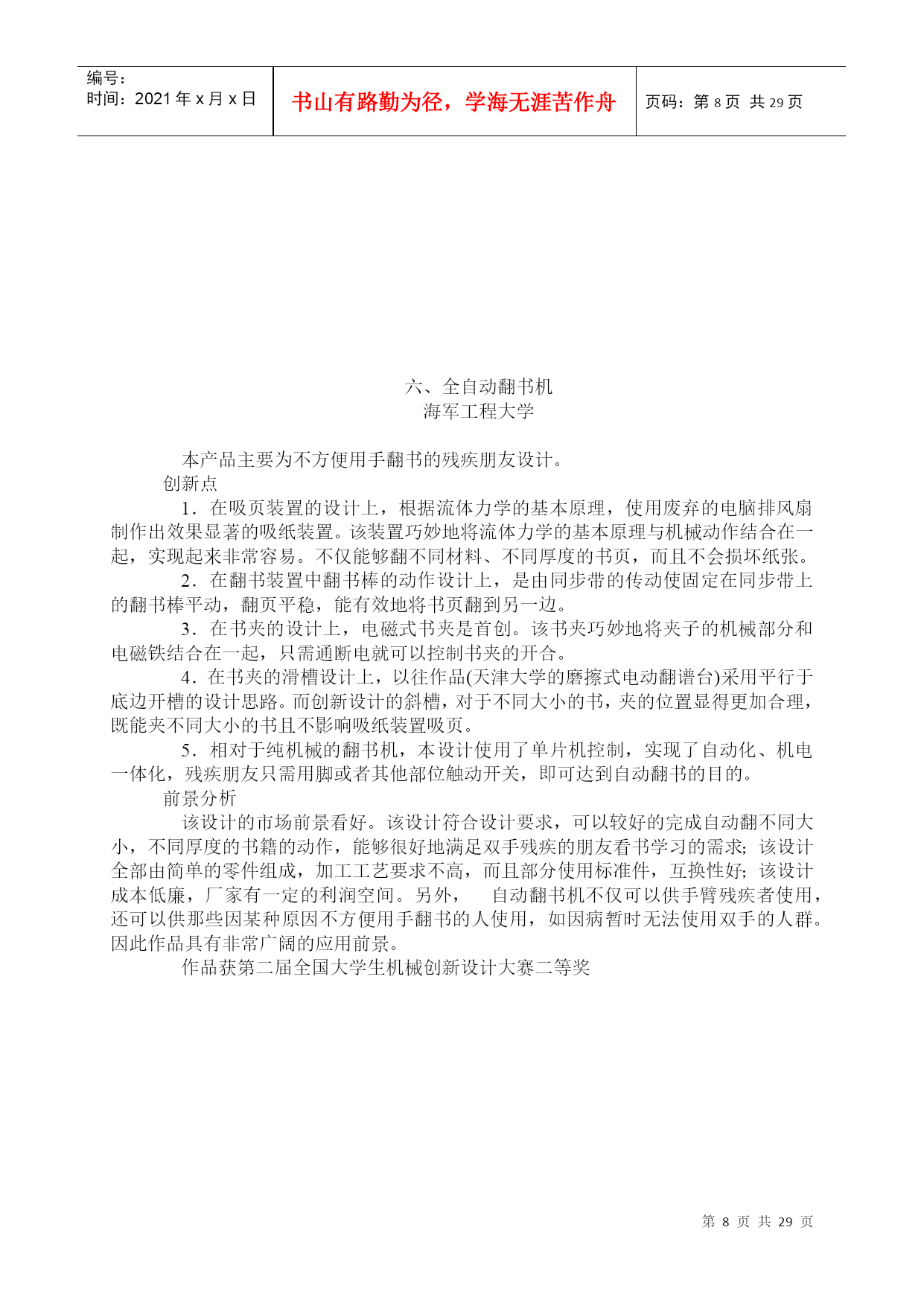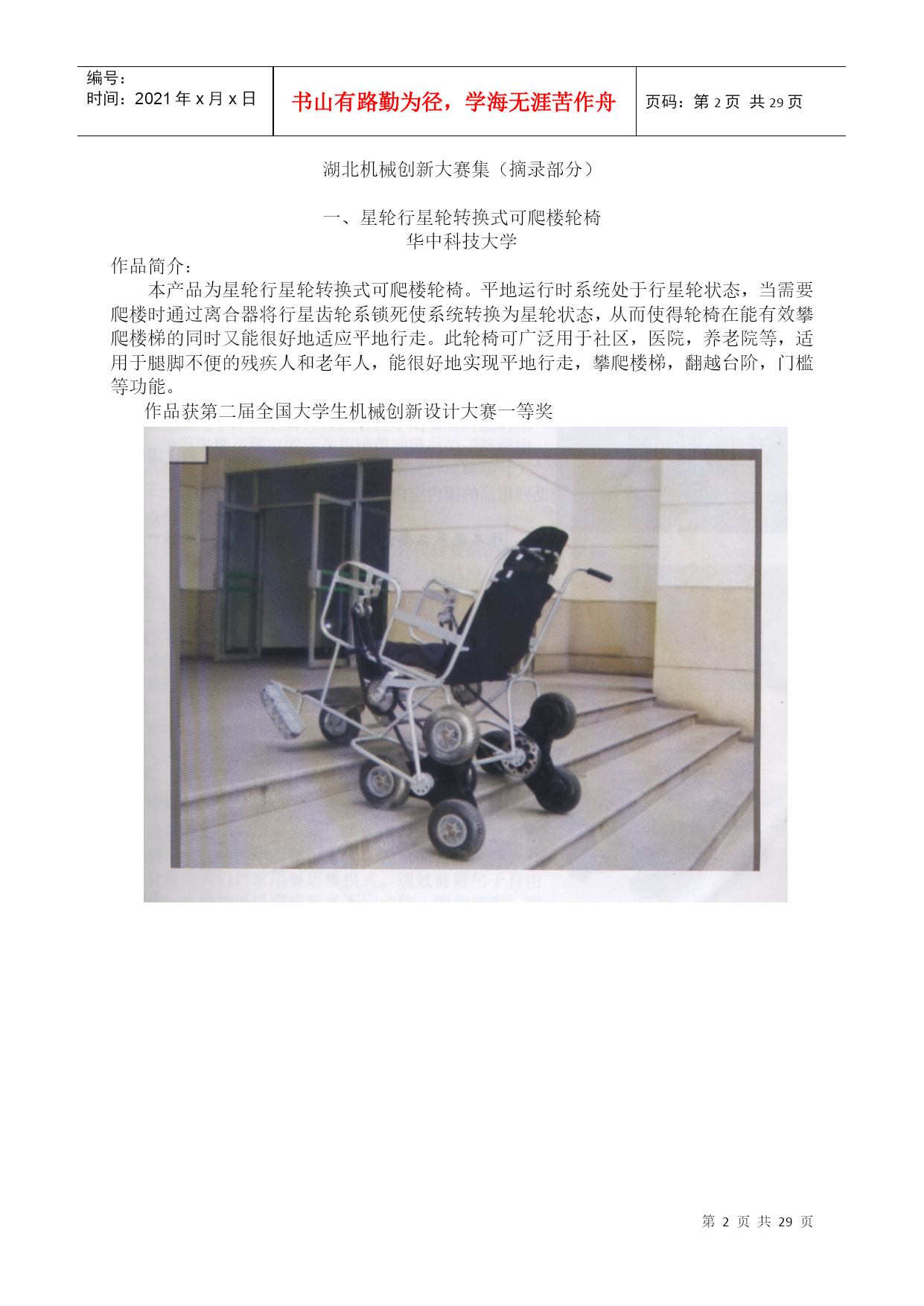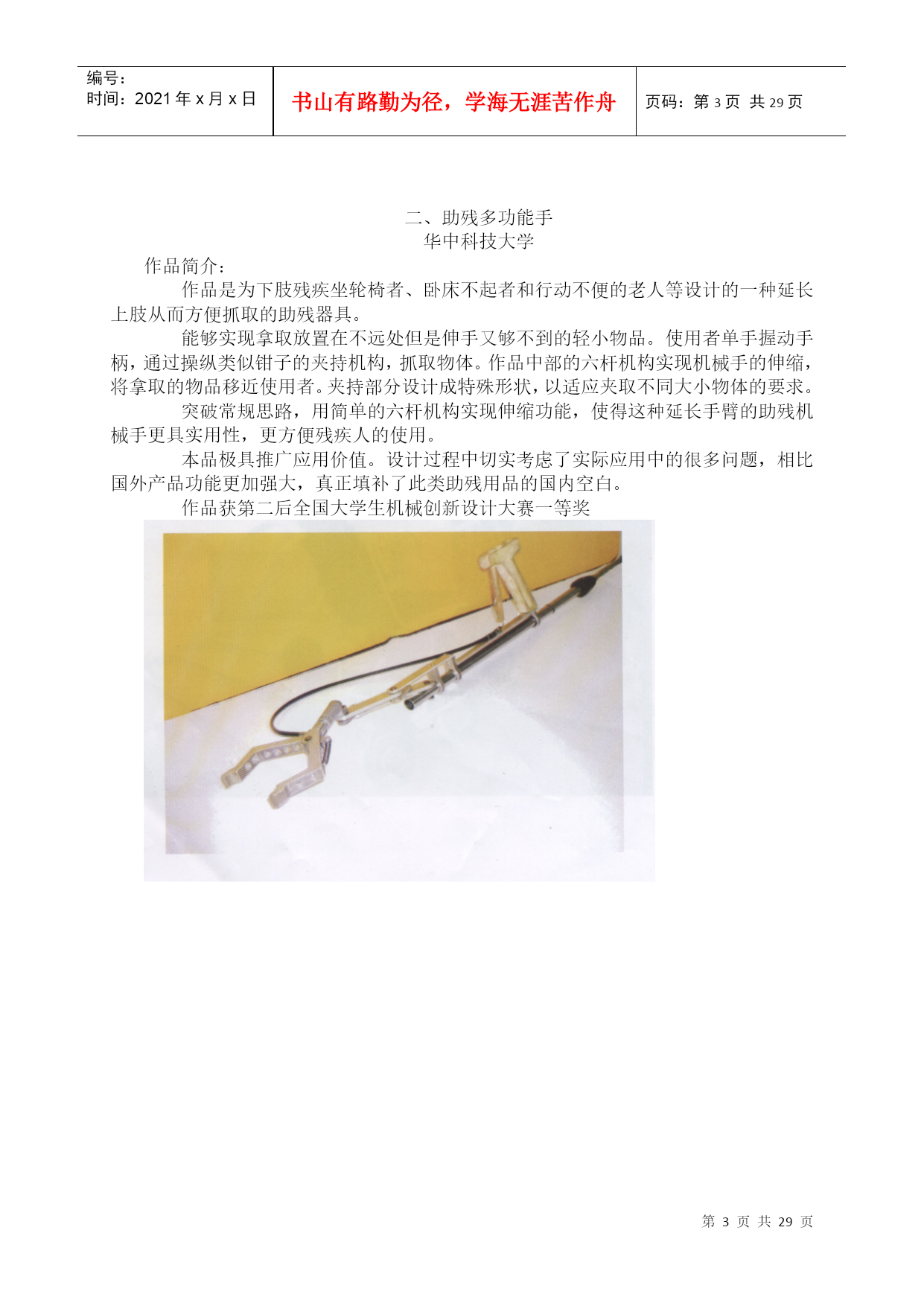 编号:时间:2021年x月x日书山有路勤为径,学海无涯苦作舟页码:第PAGE29页共NUMPAGES29页第PAGE\*MERGEFORMAT29页共NUMPAGES\*MERGEFORMAT29页湖北机械创新大赛集(摘录部分)一、星轮行星轮转换式可爬楼轮椅华中科技大学作品简介:本产品为星轮行星轮转换式可爬楼轮椅。平地运行时系统处于行星轮状态,当需要爬楼时通过离合器将行星齿轮系锁死使系统转换为星轮状态,从而使得轮椅在能有效攀爬楼梯的同时又能很好地适应平地行走。此轮椅可广泛用于社区,医院,养老院等,适用于腿脚不便的残疾人和老年人,能很好地实现平地行走,攀爬楼梯,翻越台阶,门槛等功能。作品获第二届全国大学生机械创新设计大赛一等奖二、助残多功能手华中科技大学作品简介:作品是为下肢残疾坐轮椅者、卧床不起者和行动不便的老人等设计的一种延长上肢从而方便抓取的助残器具。能够实现拿取放置在不远处但是伸手又够不到的轻小物品。使用者单手握动手柄,通过操纵类似钳子的夹持机构,抓取物体。作品中部的六杆机构实现机械手的伸缩,将拿取的物品移近使用者。夹持部分设计成特殊形状,以适应夹取不同大小物体的要求。突破常规思路,用简单的六杆机构实现伸缩功能,使得这种延长手臂的助残机械手更具实用性,更方便残疾人的使用。本品极具推广应用价值。设计过程中切实考虑了实际应用中的很多问题,相比国外产品功能更加强大,真正填补了此类助残用品的国内空白。作品获第二后全国大学生机械创新设计大赛一等奖三、可控式用餐机海军工程大学设计背景经在同济等康复中心及医院的调研双臂残疾的人在吃饭时有的要依靠他人喂饭,有的只能用脚吃饭,更甚者只能弯腰低头用嘴拱盘里的食物,让人看了十分难受。所以设计者决定设计一台用餐机。希望以此来方便残疾人的生活,让他们也能享受生活的美好。功能实现左脚开关控制圆桌转动,在踩下开关后接通电源,控制圆桌匀速转动。这时放在桌面上的菜就转到了用餐者的面前。在圆桌转动的同时碗盘进行自转,设计、计算圆桌与碗盘的转速之间的关系,以保证每次碗盘都转过一个相对角度。使用餐者可吃到碗盘中不同部位的食物,把饭菜吃干净。右脚开关控制位于用餐者对面的用餐臂,使用餐臂按预定的运动轨迹带动臂前勺子将盘中饭菜舀起并送至用餐者面前停下。当吃完后可踩动开关进行下一次舀饭。创新点与作品特色1.用餐臂改用简单的连杆机构来替代较复杂的液压控制机构。2.运用铰链四杆装置来增大勺子的运动轨迹。3.采用三角片宋改变力的传递方向,可靠性高,避免死点现象。4.用简单的方法(行星摩擦轮结构)来增加自由度。在圆桌转动的同时带动碗盘作一个小角度的自转,使每次勺子舀饭时都能舀到碗盘的各个不同部位。这样可以使碗吃得更干净。5.圆桌底盘小轮子的设计上,用行星摩擦轮而不用齿轮,加工简单,精度高,噪音低且价格低廉。6.只用两个脚踏开关控制所有动作,控制更简单,更方便。7,作品物美价廉,适合大众化的要求。推广应用前景设计与制作的结果表明,人们可以利用可控式用餐机进餐,本作品使用时稳定方便,控制简易。此外,外形设计符合人们日常用餐思维模式。通过前臂勺子自由度的进一步增加可以完成更多不同动作,例如插面,搅拌等。本作品成品较低,加工简单,易实现投产。此外,本产品亦可作为玩具供儿童用餐。作品获第二届全国大学生机械创新设计大赛一等奖四、多功能静止步行机海军工程大学设计目的本产品的主要对象是下肢行动不便的病人或长期在办公室办公的工作人员等。由于他们的下肢长期难以得到有效的放松,所以下肢的肌肉和关节很容易产生疲劳甚至退化,越来越多的病人和办公人员对此感到困惑,为了帮助他们解决难题,使他们的下肢早日康复,特设计了本产品——多功能静止步行机。主要创新点1.一个电机可以产生18种运动方式。由于两个踏板可以分开控制,而且每个踏板有三种运动方式,又可以把同步和异步分开,那么两个踏板就可以产生18种运动方式。2.五杆机构。简单的五杆机构可以产生三种不同的运动方式,令使用者不会感觉单调乏味。3.体积小巧。市场产品大多都是体积较大,而创新设计的产晶体积小,可适家用。4.独特的离合装置。本离合装置可改变180度相位,简单可靠,易于生产。舒适性分析经过向普通人的调查分析和骨科专家的咨询,以及通过对人下肢结构的分析,我们了解到对普通人来说,当他处于坐式时,下肢各关节(髋关节、膝关节、踝关节等)处最合适的弯曲角度为90度。当人在处于端坐状态时最适合的水平运动距离为20公分,上下运动为16公分。本产品确定该尺寸恰好服从该规律,仪器的初始状态可以令人恰好处于此合适状态,而且前