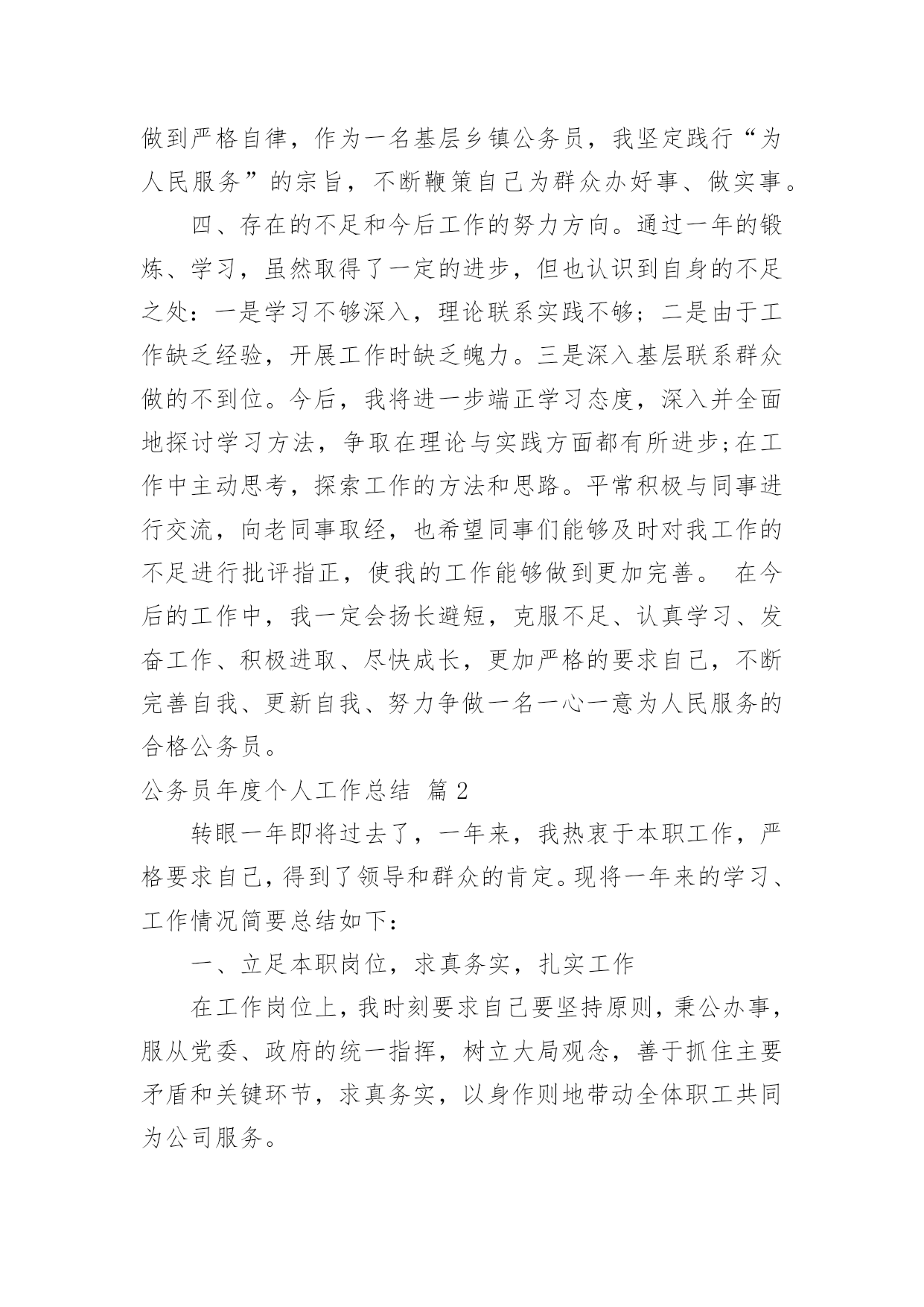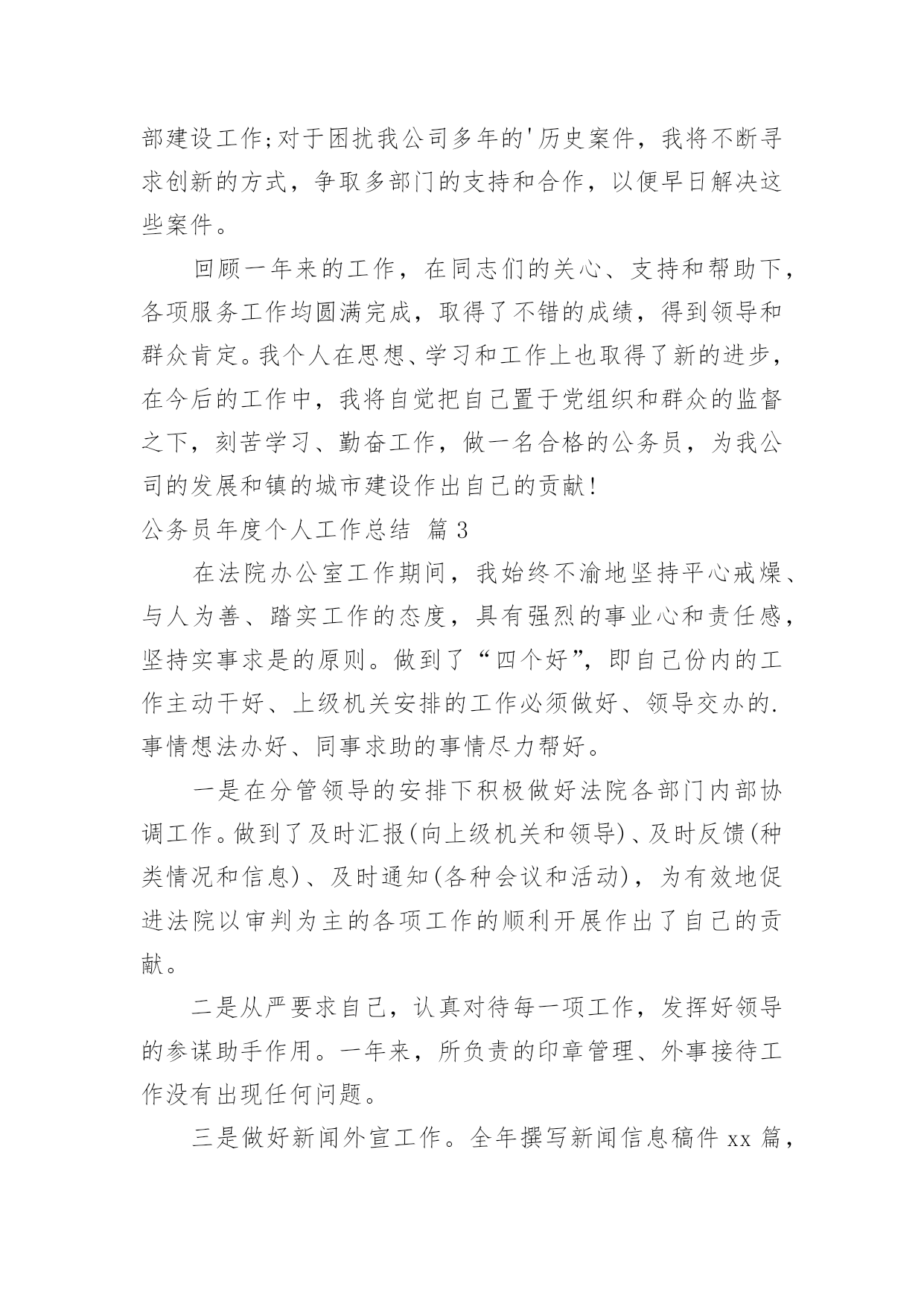 公务员年度个人工作总结【精品】公务员年度个人工作总结三篇总结是指社会团体、企业单位和个人对某一阶段的学习、工作或其完成情况加以回顾和分析,得出教训和一些规律性认识的一种书面材料,它是增长才干的一种好办法,为此要我们写一份总结。你所见过的总结应该是什么样的?以下是小编为大家整理的公务员年度个人工作总结3篇,仅供参考,欢迎大家阅读。公务员年度个人工作总结篇1xx年度,在乡领导的关心、栽培和同事们的帮助、支持下,我严格要求自己,勤奋学习,积极进取,努力提高自己的理论和实践水平,以坚定的思想信念,务实的工作作风、饱满的工作热情和严谨的生活作风,较好地完成了自己的本职工作和领导交办的各项工作,各方面都取得了新的进步,现将一年来的学习、工作情况简要总结简要总结如下:一、严于律己,自觉加强党性锻炼,政治思想觉悟得到提高。一年来,我始终坚持以马克思、列宁主义,毛泽东思想,邓小平理论、“三个代表”和依法治国重要思想为指导,以实现伟大“中国梦”为目标,进一步加党性修养,牢固树立正确的`世界观、人生观和价值观,以及正确的权力观、地位观和利益观,自觉加强理论学习,刻苦钻研业务知识,努力提高理论知识和业务工作水平。热爱祖国、热爱党、热爱社会主义,坚定共产主义信念,与党组织保持高度一致。认真贯彻执行党的路线、方针、政策,工作积极主动,勤奋努力,不畏艰难,尽职尽责,任劳任怨,在平凡的工作岗位上作出力所能及的贡献。二、强化理论和业务学习,不断提高自身综合素质。我重视加强理论和业务知识学习,在工作中,坚持一边工作一边学习,不断提高自身综合素质水平。一是加强思想政治理论学习,不断提高自己的政治理论水平。认真学习和深刻领会党的十八大精神,深入学习依法治国思想和西藏自治区、拉萨市及城关区一系列发展稳定西藏的重要思想,努力学习现行政策、法律法规知识,悉心钻研本职业务,做到学习理论与业务知识相结合,通过学习,不断提高做好乡镇综治、党建工作和应对复杂局面、处理复杂问题的能力,具有一定的理论水平、政治敏锐性和政治鉴别力。二是认真学习工作业务知识,在学习方法上做到在重点中找重点,抓住重点,并结合自己存在哪些不足之处,有针对性地进行学习,不断提高自己的业务工作能力。三、努力工作,按质按量完成各项工作。一年来,我始终坚持严格要求自己,勤奋努力,时刻牢记全心全意为人民服务的宗旨,努力作好本职工作。在工作中及时调整工作角色,开拓创新,努力学习,贴近群众,深入调研,积极工作,不断提高自身素质,同时,积极完成领导安排的各种工作任务。乡里的综治、党建等工作对于我来说已不只是一份简单的工作,而是一份事业、一份责任。在工作生活中,我始终做到严格自律,作为一名基层乡镇公务员,我坚定践行“为人民服务”的宗旨,不断鞭策自己为群众办好事、做实事。四、存在的不足和今后工作的努力方向。通过一年的锻炼、学习,虽然取得了一定的进步,但也认识到自身的不足之处:一是学习不够深入,理论联系实践不够;二是由于工作缺乏经验,开展工作时缺乏魄力。三是深入基层联系群众做的不到位。今后,我将进一步端正学习态度,深入并全面地探讨学习方法,争取在理论与实践方面都有所进步;在工作中主动思考,探索工作的方法和思路。平常积极与同事进行交流,向老同事取经,也希望同事们能够及时对我工作的不足进行批评指正,使我的工作能够做到更加完善。在今后的工作中,我一定会扬长避短,克服不足、认真学习、发奋工作、积极进取、尽快成长,更加严格的要求自己,不断完善自我、更新自我、努力争做一名一心一意为人民服务的合格公务员。公务员年度个人工作总结篇2转眼一年即将过去了,一年来,我热衷于本职工作,严格要求自己,得到了领导和群众的肯定。现将一年来的学习、工作情况简要总结如下:一、立足本职岗位,求真务实,扎实工作在工作岗位上,我时刻要求自己要坚持原则,秉公办事,服从党委、政府的统一指挥,树立大局观念,善于抓住主要矛盾和关键环节,求真务实,以身作则地带动全体职工共同为公司服务。20__年,在镇委、镇政府的支持下,__公司迎难而上,财务状况稳健,利润增长平衡,总体上取得不错的成绩。在具体工作方面,我着力加强公司的内部管理,楼盘款项催收,促进新项目的发展建设和历史案件的处理等方面。在工作中,认真收集各项信息资料,全面、准确地了解和掌握各方面工作的开展情况,分析工作存在的主要问题,总结工作经验,及时向领导汇报,让领导尽量能全面、准确地了解最近工作的实际情况,为解决问题作出科学的、正确的决策。二、严于律己,加强党性锻炼,提高党性修养在政治思想方面,我一直在各方面严格要求自己,不断加强理论学习和实践学习,自觉加强党性锻炼,使党性修养和政治思想觉悟进一步提高,坚持以优良作风和党风投入到工作中。同时,在公司支部建设方面,由于支部成立时间尚短,所以我集中在完善支部各项工作建设,促进