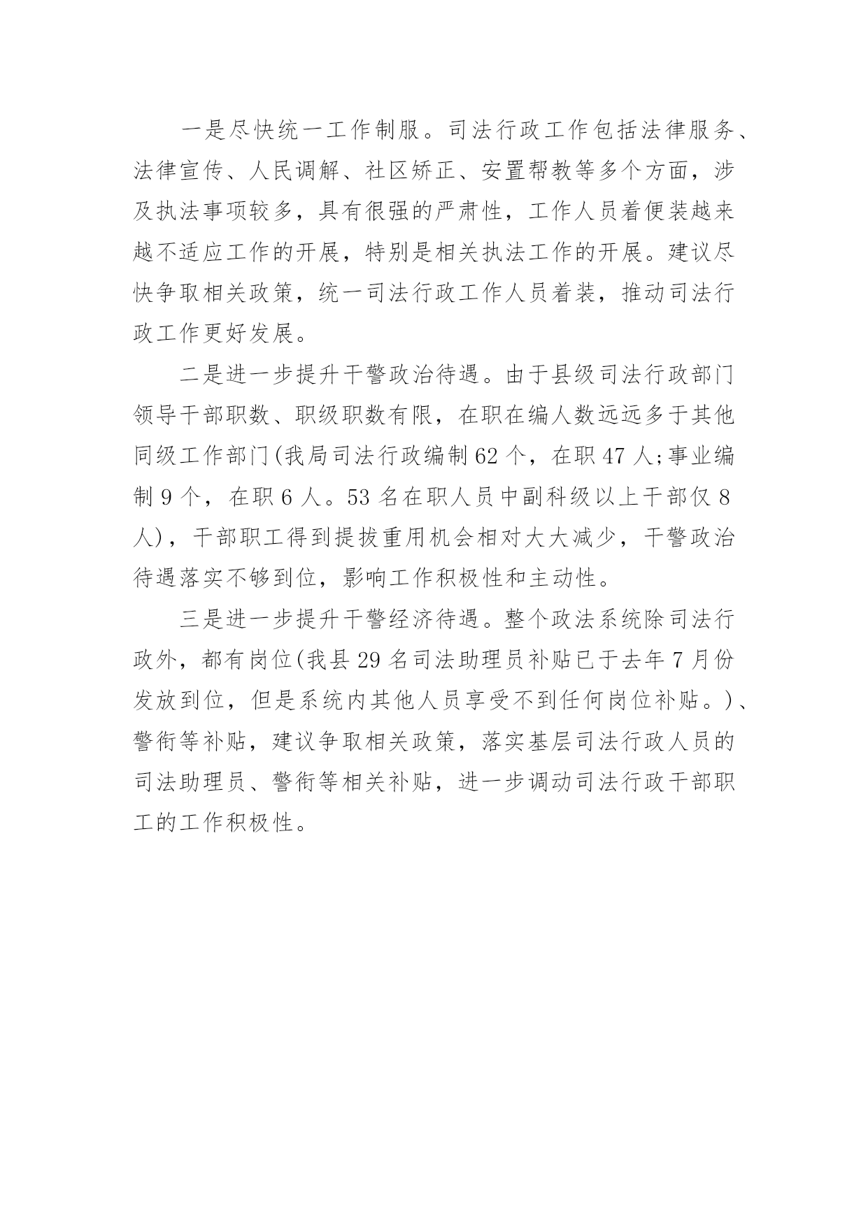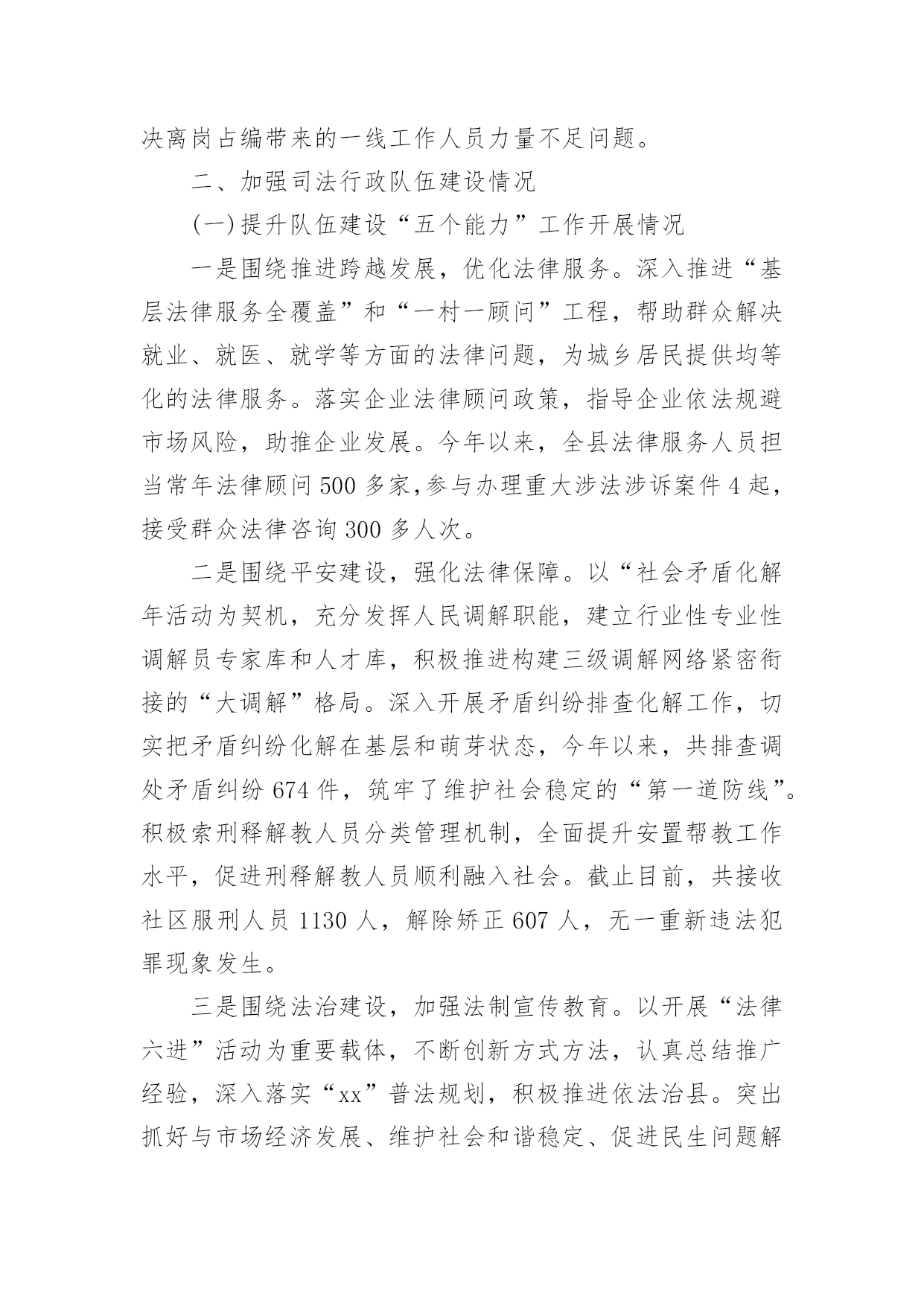 司法队伍建设调研报告在我们平凡的日常里,越来越多人会去使用报告,我们在写报告的时候要注意逻辑的合理性。相信许多人会觉得报告很难写吧,以下是小编帮大家整理的司法队伍建设调研报告,欢迎阅读与收藏。一、关于基层司法行政干警离岗占编问题(一)我县司法行政机关干部提前离岗年龄情况:主要领导干部(正科级)52周岁,其他领导干部51周岁,一般干部不提前离岗。(二)干部离岗占编情况:目前,县司法局共使用司法行政编制62个,事业编制9个。其中,县局机关司法行政编制18个(在职14人,离岗4人),基层司法所司法行政编制38个(在职29人,无人离岗),公证处司法行政编制6个(在职4人,离岗1人,空编1人),法律援助中心事业编制5个(在职4人,离岗1人),社区矫正办公室事业编制4个(在职2人,空编2人)。局机关、公证处、法律援助中心离岗人员占实有人员比例分别为:22%、20%、20%。(三)解决这一问题的做法和建议:一是组织人事编制部门对我系统离岗人员做不占编制处理。二是上级部门根据司法行政实际,出台单列编制有关政策,通过允许提前退休、临时超编等办法腾出年级已大但尚未退休人员所占编制。三是完善轮岗交流机制,合理利用离岗人员,发挥其特长,解决离岗占编带来的一线工作人员力量不足问题。二、加强司法行政队伍建设情况(一)提升队伍建设“五个能力”工作开展情况一是围绕推进跨越发展,优化法律服务。深入推进“基层法律服务全覆盖”和“一村一顾问”工程,帮助群众解决就业、就医、就学等方面的法律问题,为城乡居民提供均等化的法律服务。落实企业法律顾问政策,指导企业依法规避市场风险,助推企业发展。今年以来,全县法律服务人员担当常年法律顾问500多家,参与办理重大涉法涉诉案件4起,接受群众法律咨询300多人次。二是围绕平安建设,强化法律保障。以“社会矛盾化解年活动为契机,充分发挥人民调解职能,建立行业性专业性调解员专家库和人才库,积极推进构建三级调解网络紧密衔接的“大调解”格局。深入开展矛盾纠纷排查化解工作,切实把矛盾纠纷化解在基层和萌芽状态,今年以来,共排查调处矛盾纠纷674件,筑牢了维护社会稳定的“第一道防线”。积极索刑释解教人员分类管理机制,全面提升安置帮教工作水平,促进刑释解教人员顺利融入社会。截止目前,共接收社区服刑人员1130人,解除矫正607人,无一重新违法犯罪现象发生。三是围绕法治建设,加强法制宣传教育。以开展“法律六进”活动为重要载体,不断创新方式方法,认真总结推广经验,深入落实“xx”普法规划,积极推进依法治县。突出抓好与市场经济发展、维护社会和谐稳定、促进民生问题解决、城市规划建设管理等方面法律法规的宣传;突出抓好领导干部、公务员、事业单位人员、青少年学生、企业经营管理人员、农民等重点对象的法制教育;突出抓好重大项目建设、城镇等重点区域的法制宣传教育,不断增强全县人民的法制观念和法律素质,不断提高依法行政、依法办事的能力,更好地服务全县改革发展稳定工作大局。充分运用法律服务热线、普法网站、电视报刊、短信平台等现代媒体资源开展普法工作,进一步加强中小学、企业等法制宣传教育阵地建设,不断提高法制宣传教育的覆盖面和实效性。深入推进依法治理工作,积极开展法治镇(街道)、法治村(社区)、法治学校、法治企业等创建活动,进一步提高全社会法治化管理水平。今年以来,举办法治宣传活动3次,出动宣传车20辆,发放宣传材料2500余份。四是围绕解决民生问题,加强法律援助。围绕移民安置、土地征用、城镇拆迁、环境治理中遇到的涉法涉诉问题,以及就业、就学、就医、社会保障等民生问题,提供及时便捷的法律服务。认真落实法律援助措施,加强法律援助便民服务示范窗口建设,提高法律援助覆盖面,着力完善独生子女户、农村低保户、五保供养户及弱势群体的便民法律援助措施,推进解决困难群众请律师难、打官司难的问题。依法保障困难群众的合法利益。今年以来,全县法律服务人员累计办理法律援助案件65件,受援对象达90人,进一步维护了弱势群体的合法权益。(二)对市局在加强司法行政队伍建设方面的意见、建议一是尽快统一工作制服。司法行政工作包括法律服务、法律宣传、人民调解、社区矫正、安置帮教等多个方面,涉及执法事项较多,具有很强的严肃性,工作人员着便装越来越不适应工作的开展,特别是相关执法工作的开展。建议尽快争取相关政策,统一司法行政工作人员着装,推动司法行政工作更好发展。二是进一步提升干警政治待遇。由于县级司法行政部门领导干部职数、职级职数有限,在职在编人数远远多于其他同级工作部门(我局司法行政编制62个,在职47人;事业编制9个,在职6人。53名在职人员中副科级以上干部仅8人),干部职工得到提拔重用机会相对大大减少,干警政治待遇落实不够到位,影响工作积极性和主动性。三是进一步提升干警经济待遇。整个政法系统除司法行政