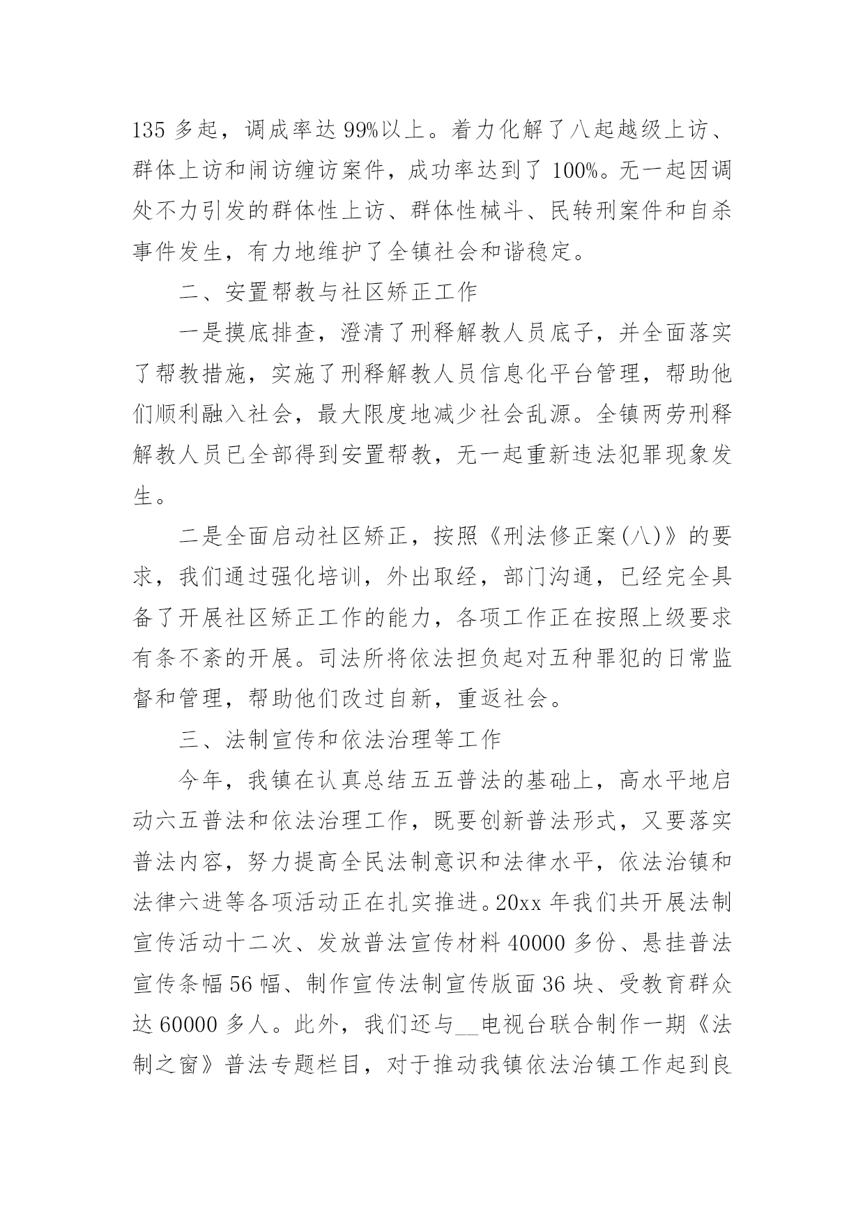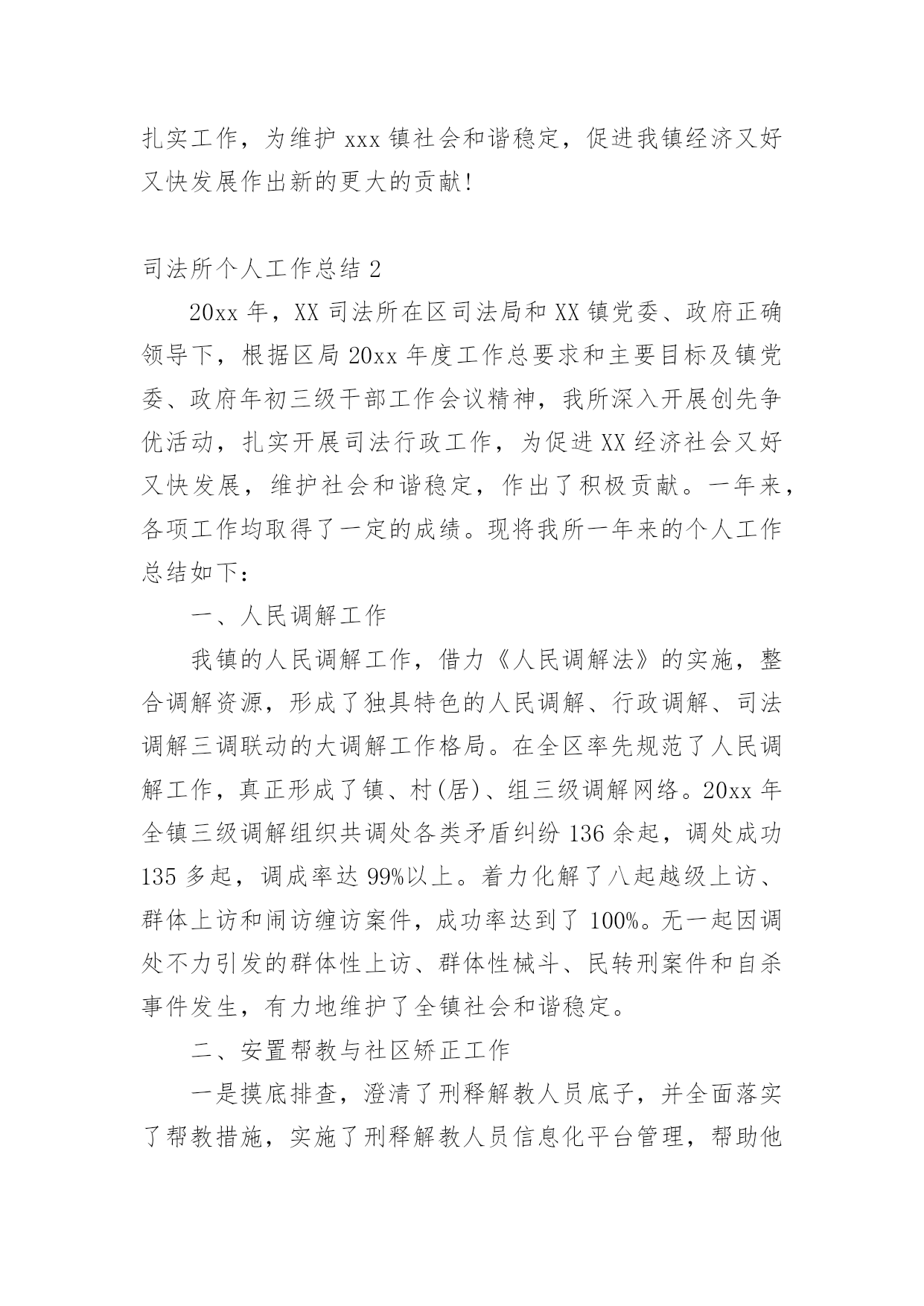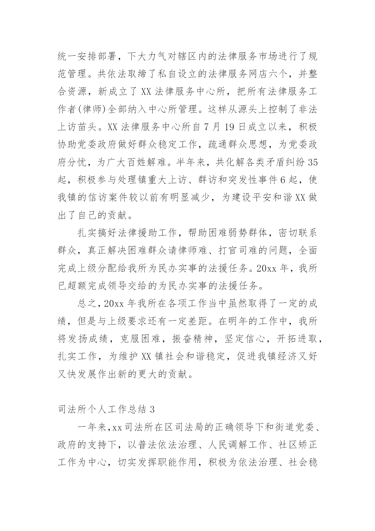 司法所个人工作总结司法所个人工作总结(15篇)总结是对某一阶段的工作、学习或思想中的经验或情况进行分析研究的书面材料,通过它可以正确认识以往学习和工作中的优缺点,让我们一起来学习写总结吧。总结怎么写才不会千篇一律呢?下面是小编为大家收集的司法所个人工作总结,欢迎大家借鉴与参考,希望对大家有所帮助。司法所个人工作总结120xx年,xxx司法所在区司法局和xxx镇党委、政府正确领导下,根据区局20xx年度工作总要求和主要目标及镇党委、政府年初三级干部工作会议精神,我所深入开展创先争优活动,扎实开展司法行政工作,为促进经济社会又好又快发展,维护社会和谐稳定,作出了积极贡献。一年来,各项工作均取得了一定的成绩。现将我所一年来的个人工作总结如下:一、人民调解工作我镇的人民调解工作,借力《人民调解法》的实施,整合调解资源,形成了独具特色的人民调解、行政调解、司法调解三调联动的大调解工作格局。在全区率先规范了人民调解工作,真正形成了镇、村(居)、组三级调解网络。20xx年全镇三级调解组织共调处各类矛盾纠纷136余起,调处成功135多起,调成率达99%以上。着力化解了八起越级上访、群体上访和闹访缠访案件,成功率达到了100%。无一起因调处不力引发的群体性上访、群体性械斗、民转刑案件和自杀事件发生,有力地维护了全镇社会和谐稳定。二、安置帮教与社区矫正工作一是摸底排查,澄清了刑释解教人员底子,并全面落实了帮教措施,实施了刑释解教人员信息化平台管理,帮助他们顺利融入社会,最大限度地减少社会乱源。全镇两劳刑释解教人员已全部得到安置帮教,无一起重新违法犯罪现象发生。二是全面启动社区矫正,按照《刑法修正案(八)》的要求,我们通过强化培训,外出取经,部门沟通,已经完全具备了开展社区矫正工作的能力,各项工作正在按照上级要求有条不紊的开展。司法所将依法担负起对五种罪犯的日常监督和管理,帮助他们改过自新,重返社会。三、法制宣传和依法治理等工作今年,我镇在认真总结五五普法的基础上,高水平地启动六五普法和依法治理工作,既要创新普法形式,又要落实普法内容,努力提高全民法制意识和法律水平,依法治镇和法律六进等各项活动正在扎实推进。20xx年我们共开展法制宣传活动十二次、发放普法宣传材料40000多份、悬挂普法宣传条幅56幅、制作宣传法制宣传版面36块、受教育群众达60000多人。此外,我们还与__电视台联合制作一期《法制之窗》普法专题栏目,对于推动我镇依法治镇工作起到良好的效果。四、法律服务与法律援助我们以法律服务质量年活动为契机,不断拓展服务领域,加快提升服务质量,尽量延伸服务触角,为政府当好参谋,为百姓排忧解难,为企业保驾护航。进一步加强法制教育,下大力规范服务市场,树立司法为民,公正执法的`政法队伍形象。今年七月份,我们根据市、区司法局和镇党委政府的统一安排部署,下大力气对辖区内的法律服务市场进行了规范管理。共依法取缔了私自设立的法律服务网店六个,并整合资源,新成立了__法律服务中心所,把所有法律服务工作者(律师)全部纳入中心所管理。这样从源头上控制了非法上访苗头。__法律服务中心所自7月19日成立以来,积极协助党委政府做好群众稳定工作,疏通群众思想,为党委政府分忧,为广大百姓解难。半年来,共化解各类矛盾纠纷35起,积极参与处理镇重大上访、群访和突发性事件6起,使我镇的信访案件较以前有明显减少,为建设平安和谐__做出了自己的贡献。扎实搞好法律援助工作,帮助困难弱势群体,密切联系群众,真正解决困难群众请律师难、打官司难的问题,全面完成上级分配给我所为民办实事的法援任务。20xx年,我所已超额完成领导交给的为民办实事的法援任务。总之,20xx年我所在各项工作当中虽然取得了一定的成绩,但是与上级要求还有一定差距。在明年的工作中,我所将发扬成绩,克服困难,振奋精神,坚定信心,开拓进取,扎实工作,为维护xxx镇社会和谐稳定,促进我镇经济又好又快发展作出新的更大的贡献!司法所个人工作总结220xx年,XX司法所在区司法局和XX镇党委、政府正确领导下,根据区局20xx年度工作总要求和主要目标及镇党委、政府年初三级干部工作会议精神,我所深入开展创先争优活动,扎实开展司法行政工作,为促进XX经济社会又好又快发展,维护社会和谐稳定,作出了积极贡献。一年来,各项工作均取得了一定的成绩。现将我所一年来的个人工作总结如下:一、人民调解工作我镇的人民调解工作,借力《人民调解法》的实施,整合调解资源,形成了独具特色的人民调解、行政调解、司法调解三调联动的大调解工作格局。在全区率先规范了人民调解工作,真正形成了镇、村(居)、组三级调解网络。20xx年全镇三级调解组织共调处各类矛盾纠纷136余起,调处成功135多起,调成率达99%以上。着力化解了八起越级上访、群体上访和闹访缠访案件,成功率达到