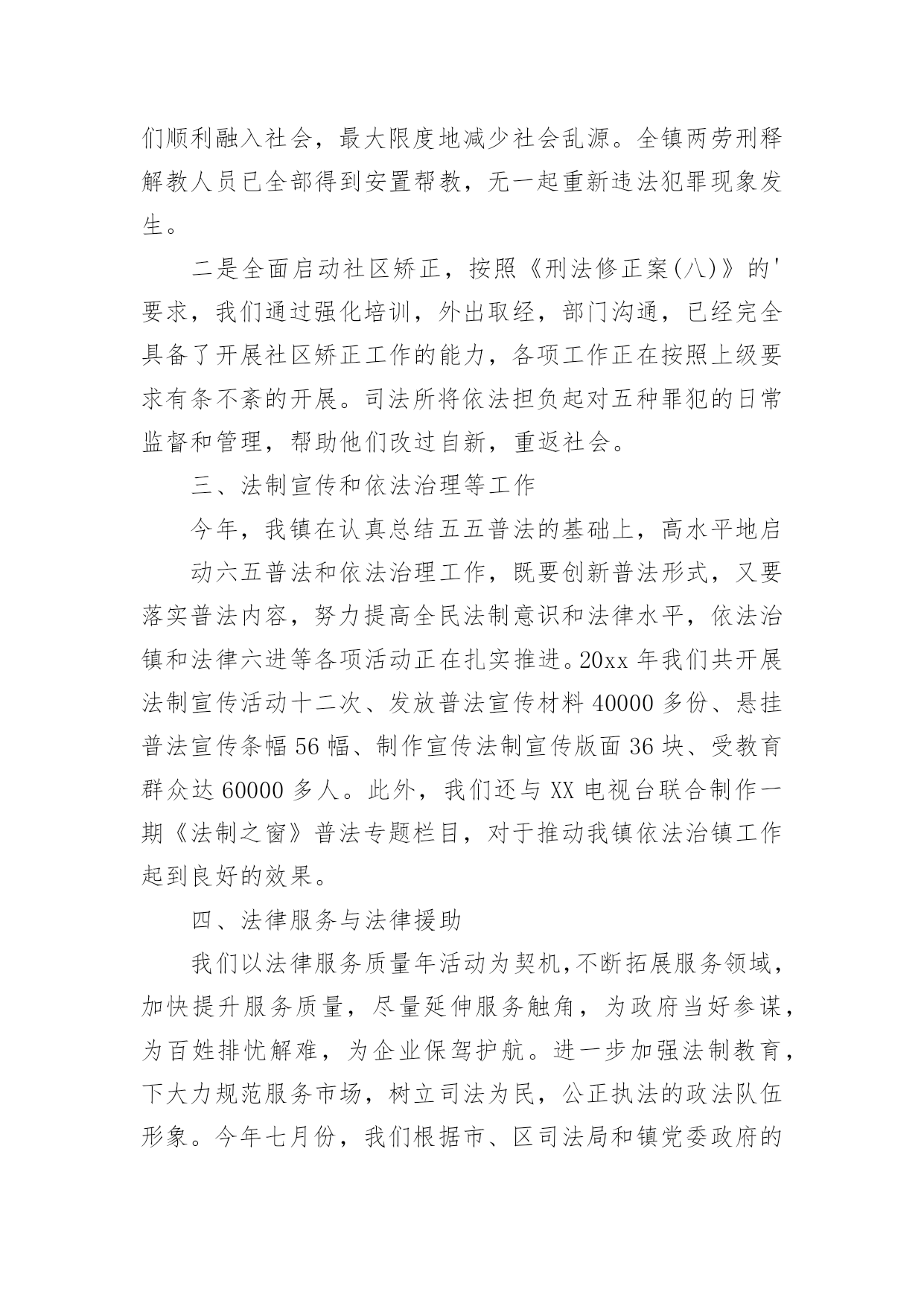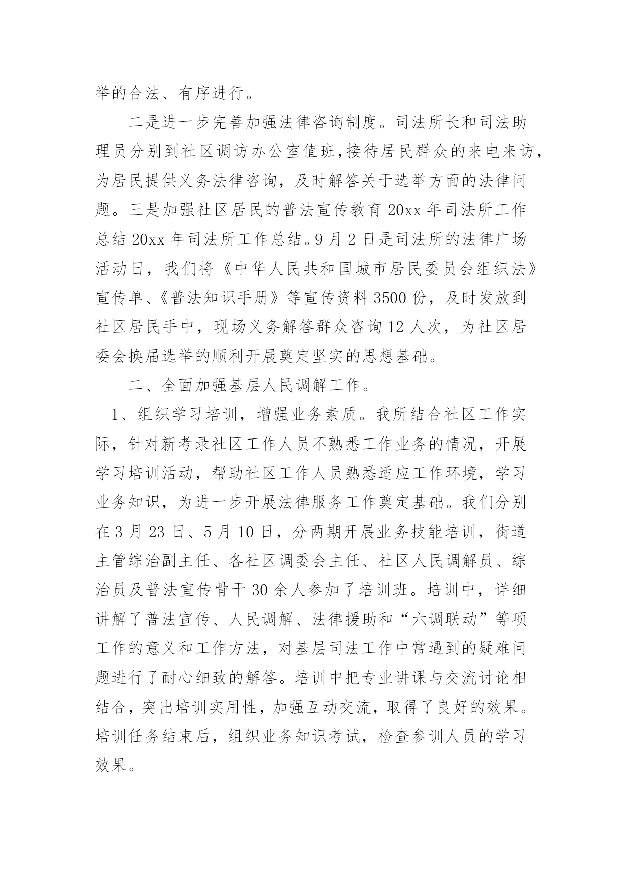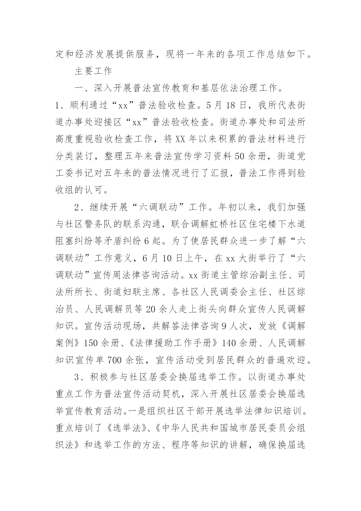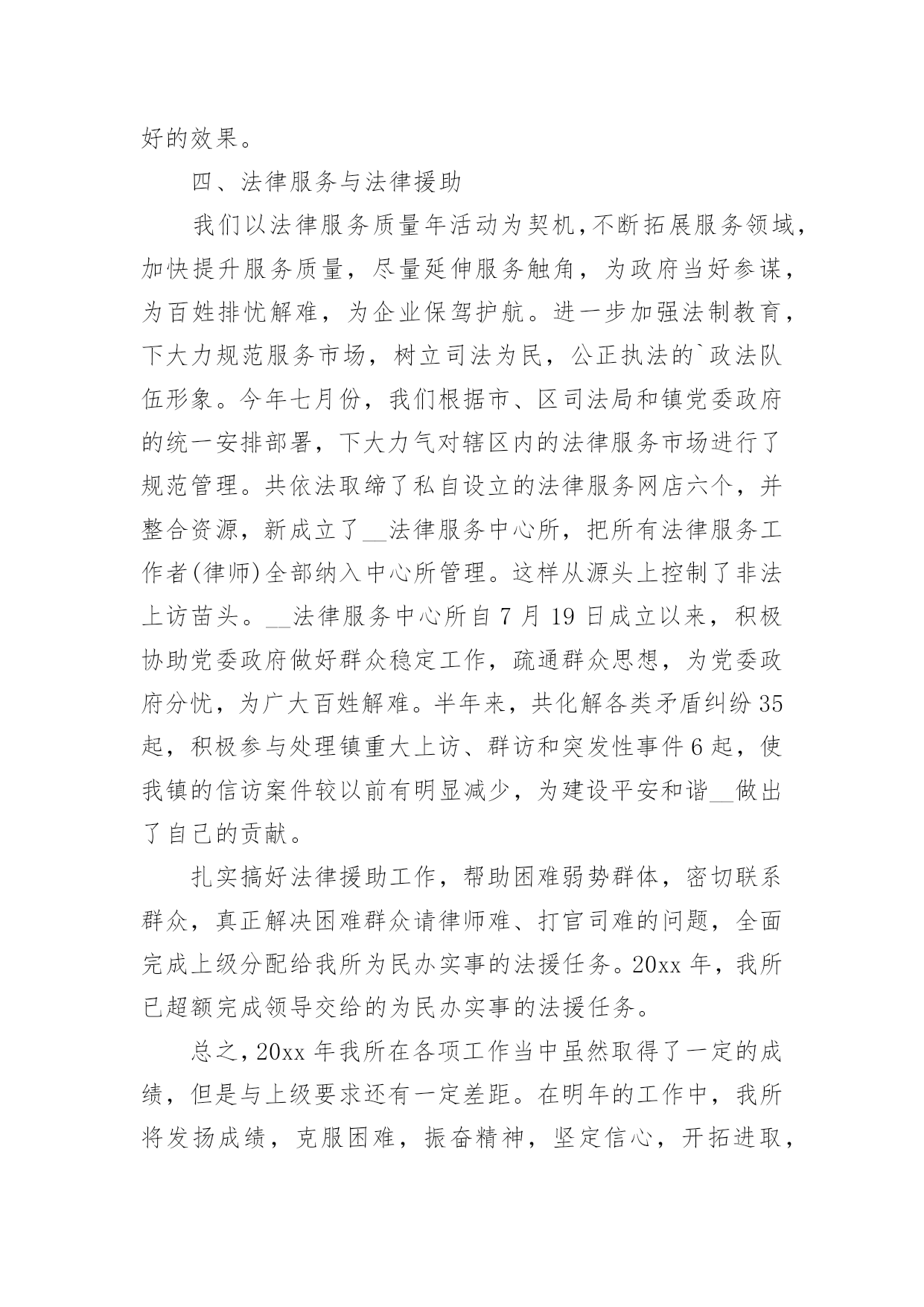 司法所个人工作总结司法所个人工作总结(15篇)总结是对某一阶段的工作、学习或思想中的经验或情况进行分析研究的书面材料,通过它可以正确认识以往学习和工作中的优缺点,让我们一起来学习写总结吧。总结怎么写才不会千篇一律呢?下面是小编为大家收集的司法所个人工作总结,欢迎大家借鉴与参考,希望对大家有所帮助。司法所个人工作总结120xx年,xxx司法所在区司法局和xxx镇党委、政府正确领导下,根据区局20xx年度工作总要求和主要目标及镇党委、政府年初三级干部工作会议精神,我所深入开展创先争优活动,扎实开展司法行政工作,为促进经济社会又好又快发展,维护社会和谐稳定,作出了积极贡献。一年来,各项工作均取得了一定的成绩。现将我所一年来的个人工作总结如下:一、人民调解工作我镇的人民调解工作,借力《人民调解法》的实施,整合调解资源,形成了独具特色的人民调解、行政调解、司法调解三调联动的大调解工作格局。在全区率先规范了人民调解工作,真正形成了镇、村(居)、组三级调解网络。20xx年全镇三级调解组织共调处各类矛盾纠纷136余起,调处成功135多起,调成率达99%以上。着力化解了八起越级上访、群体上访和闹访缠访案件,成功率达到了100%。无一起因调处不力引发的群体性上访、群体性械斗、民转刑案件和自杀事件发生,有力地维护了全镇社会和谐稳定。二、安置帮教与社区矫正工作一是摸底排查,澄清了刑释解教人员底子,并全面落实了帮教措施,实施了刑释解教人员信息化平台管理,帮助他们顺利融入社会,最大限度地减少社会乱源。全镇两劳刑释解教人员已全部得到安置帮教,无一起重新违法犯罪现象发生。二是全面启动社区矫正,按照《刑法修正案(八)》的要求,我们通过强化培训,外出取经,部门沟通,已经完全具备了开展社区矫正工作的能力,各项工作正在按照上级要求有条不紊的开展。司法所将依法担负起对五种罪犯的日常监督和管理,帮助他们改过自新,重返社会。三、法制宣传和依法治理等工作今年,我镇在认真总结五五普法的基础上,高水平地启动六五普法和依法治理工作,既要创新普法形式,又要落实普法内容,努力提高全民法制意识和法律水平,依法治镇和法律六进等各项活动正在扎实推进。20xx年我们共开展法制宣传活动十二次、发放普法宣传材料40000多份、悬挂普法宣传条幅56幅、制作宣传法制宣传版面36块、受教育群众达60000多人。此外,我们还与__电视台联合制作一期《法制之窗》普法专题栏目,对于推动我镇依法治镇工作起到良好的效果。四、法律服务与法律援助我们以法律服务质量年活动为契机,不断拓展服务领域,加快提升服务质量,尽量延伸服务触角,为政府当好参谋,为百姓排忧解难,为企业保驾护航。进一步加强法制教育,下大力规范服务市场,树立司法为民,公正执法的`政法队伍形象。今年七月份,我们根据市、区司法局和镇党委政府的统一安排部署,下大力气对辖区内的法律服务市场进行了规范管理。共依法取缔了私自设立的法律服务网店六个,并整合资源,新成立了__法律服务中心所,把所有法律服务工作者(律师)全部纳入中心所管理。这样从源头上控制了非法上访苗头。__法律服务中心所自7月19日成立以来,积极协助党委政府做好群众稳定工作,疏通群众思想,为党委政府分忧,为广大百姓解难。半年来,共化解各类矛盾纠纷35起,积极参与处理镇重大上访、群访和突发性事件6起,使我镇的信访案件较以前有明显减少,为建设平安和谐__做出了自己的贡献。扎实搞好法律援助工作,帮助困难弱势群体,密切联系群众,真正解决困难群众请律师难、打官司难的问题,全面完成上级分配给我所为民办实事的法援任务。20xx年,我所已超额完成领导交给的为民办实事的法援任务。总之,20xx年我所在各项工作当中虽然取得了一定的成绩,但是与上级要求还有一定差距。在明年的工作中,我所将发扬成绩,克服困难,振奋精神,坚定信心,开拓进取,扎实工作,为维护xxx镇社会和谐稳定,促进我镇经济又好又快发展作出新的更大的贡献!司法所个人工作总结220xx年,XX司法所在区司法局和XX镇党委、政府正确领导下,根据区局20xx年度工作总要求和主要目标及镇党委、政府年初三级干部工作会议精神,我所深入开展创先争优活动,扎实开展司法行政工作,为促进XX经济社会又好又快发展,维护社会和谐稳定,作出了积极贡献。一年来,各项工作均取得了一定的成绩。现将我所一年来的个人工作总结如下:一、人民调解工作我镇的人民调解工作,借力《人民调解法》的实施,整合调解资源,形成了独具特色的人民调解、行政调解、司法调解三调联动的大调解工作格局。在全区率先规范了人民调解工作,真正形成了镇、村(居)、组三级调解网络。20xx年全镇三级调解组织共调处各类矛盾纠纷136余起,调处成功135多起,调成率达99%以上。着力化解了八起越级上访、群体上访和闹访缠访案件,成功率达到