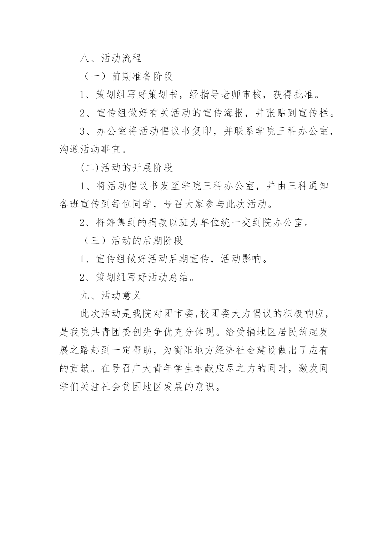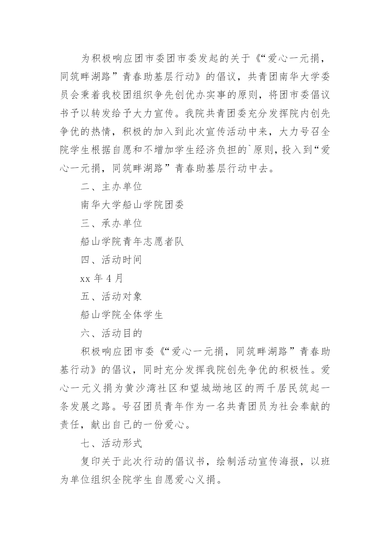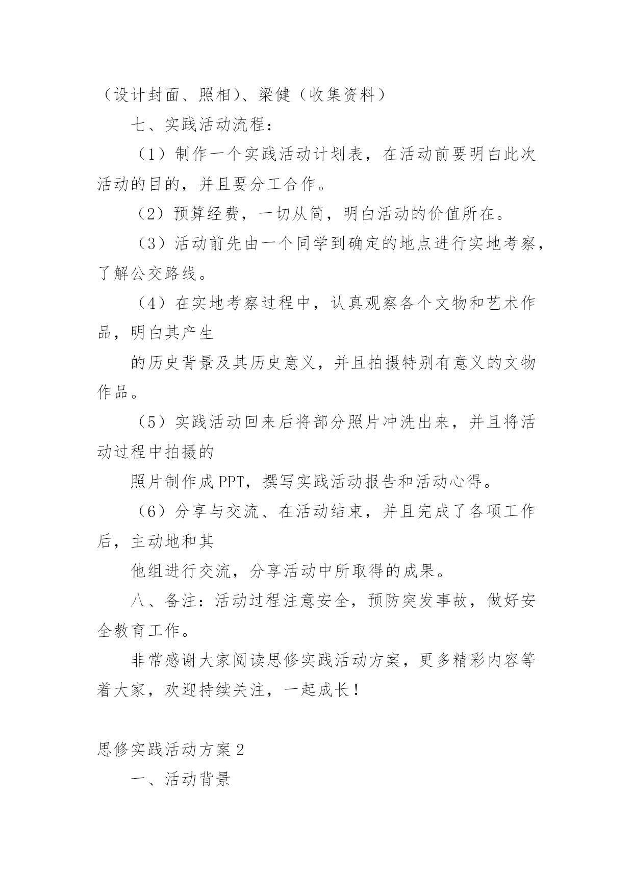 思修实践活动方案为了确保事情或工作有效开展,通常会被要求事先制定方案,方案是计划中内容最为复杂的一种。那么什么样的方案才是好的呢?以下是小编精心整理的思修实践活动方案,供大家参考借鉴,希望可以帮助到有需要的朋友。思修实践活动方案1一、实践活动的目的为了贯彻“以德为行,以学为上”的教学理念,为了践行“校以育人为本,师以严教为业,生以成才为志”的口号,以“教育学生,引导学生成才”为宗旨而开展《思想道德修养与法律基础》的课外实践活动。通过本次活动,使得同学们更好地了解中国悠久的.历史文化,提高同学们的艺术修养、道德修养,陶冶性情,树立“传承和发展中国悠久历史文化”的远大理想,并且努力学习,发奋图强,顽强拼搏,成为一个对社会、对国家有用的人才。二、实践活动类型:参观广东省博物馆三、实践活动时间:20xx年5月25号四、实践活动地点:广东省博物馆新馆五、参加的成员:罗思洁、何振良、林炎辉、朱家荣、冯文斌、梁健六、活动分工:罗思洁(实践报告)、何振良(制作PPT)、林炎辉(组织策划)、朱家荣(收集资料)、冯文斌(设计封面、照相)、梁健(收集资料)七、实践活动流程:(1)制作一个实践活动计划表,在活动前要明白此次活动的目的,并且要分工合作。(2)预算经费,一切从简,明白活动的价值所在。(3)活动前先由一个同学到确定的地点进行实地考察,了解公交路线。(4)在实地考察过程中,认真观察各个文物和艺术作品,明白其产生的历史背景及其历史意义,并且拍摄特别有意义的文物作品。(5)实践活动回来后将部分照片冲洗出来,并且将活动过程中拍摄的照片制作成PPT,撰写实践活动报告和活动心得。(6)分享与交流、在活动结束,并且完成了各项工作后,主动地和其他组进行交流,分享活动中所取得的成果。八、备注:活动过程注意安全,预防突发事故,做好安全教育工作。非常感谢大家阅读思修实践活动方案,更多精彩内容等着大家,欢迎持续关注,一起成长!思修实践活动方案2一、活动背景为积极响应团市委团市委发起的关于《“爱心一元捐,同筑畔湖路”青春助基层行动》的倡议,共青团南华大学委员会秉着我校团组织争先创优办实事的原则,将团市委倡议书予以转发给予大力宣传。我院共青团委充分发挥院内创先争优的热情,积极的加入到此次宣传活动中来,大力号召全院学生根据自愿和不增加学生经济负担的`原则,投入到“爱心一元捐,同筑畔湖路”青春助基层行动中去。二、主办单位南华大学船山学院团委三、承办单位船山学院青年志愿者队四、活动时间xx年4月五、活动对象船山学院全体学生六、活动目的积极响应团市委《“爱心一元捐,同筑畔湖路”青春助基行动》的倡议,同时充分发挥我院创先争优的积极性。爱心一元义捐为黄沙湾社区和望城坳地区的两千居民筑起一条发展之路。号召团员青年作为一名共青团员为社会奉献的责任,献出自己的一份爱心。七、活动形式复印关于此次行动的倡议书,绘制活动宣传海报,以班为单位组织全院学生自愿爱心义捐。八、活动流程(一)前期准备阶段1、策划组写好策划书,经指导老师审核,获得批准。2、宣传组做好有关活动的宣传海报,并张贴到宣传栏。3、办公室将活动倡议书复印,并联系学院三科办公室,沟通活动事宜。(二)活动的开展阶段1、将活动倡议书发至学院三科办公室,并由三科通知各班宣传到每位同学,号召大家参与此次活动。2、将筹集到的捐款以班为单位统一交到院办公室。(三)活动的后期阶段1、宣传组做好活动后期宣传,活动影响。2、策划组写好活动总结。九、活动意义此次活动是我院对团市委,校团委大力倡议的积极响应,是我院共青团委创先争优充分体现。给受捐地区居民筑起发展之路起到一定帮助,为衡阳地方经济社会建设做出了应有的贡献。在号召广大青年学生奉献应尽之力的同时,激发同学们关注社会贫困地区发展的意识。