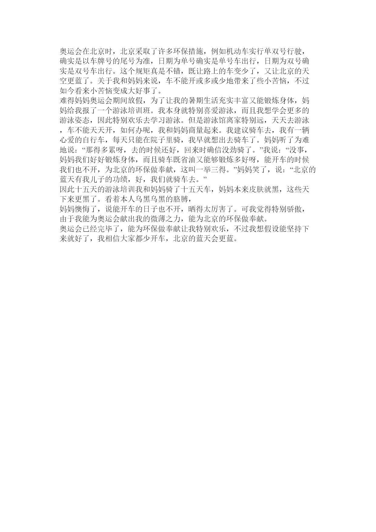 我为环保做奉献作文篇一:我为环保做奉献我这几天特别欢乐,由于我被评为优秀的环保人员,也发了一个大红色证书,以便明白这是如何回事?听我渐渐告诉你。前天下午,在回家的路上,我觉察一个可疑的人在区的角落里,他鬼祟,左眼看,右看,然后蹲下,两分钟后,然后站起来,我开场照顾关于他,只是好奇的模样。后来,不知何故,我的好奇心变得越来越强大,并走近了一步,叔叔大概看到我向前走了几步,并有一些步骤,我伸出我的颈项向前。,我看到他通过这个地点比一个小广告。啊,他是坚持小广告。我说,叔叔,你在找东西吗?叔叔紧张地说,不,我正在清理小广告。他完成了剩下的小广告被张贴一个口袋,从他的口袋里拿出一把小铲子...我想:假设让他跑掉,他确信会去贴。因此我对他说:叔叔能够用我的使用吗?叔叔会笑,说:好吧!不,我仍然不行。我变成了走廊,在电梯上,在机上低声说:“有一个小广告下的人,监视阿姨听说,立即报道邻里,立即下楼,叔叔赶上,原来的两个是邻居。叔叔不明白如何觉察,邻居的领导对我的行为大家都欣赏,给了我一张证书。我们的生活环境需要大家保护,我大声呼吁:治疗城市皮肤病,每个人都负责,请采取行动,建一个漂亮的家。篇二:我为环保做奉献这几天我特别欢乐,由于我被居委会评为“优秀环保小卫士”,还颁发了一个大红色的证书,要想明白这是如何回事?听我渐渐给你讲。前天下午放学,在回家的路上,我在小区里的墙角边觉察一名可疑的男子,他鬼鬼祟祟,左看看,右看看,然后蹲下去,过了两分钟左右又站了起来,我开场还没有在意他,只是好奇的看着。后来,不知怎的,我的好奇心越来越强,就走近了一步,那个叔叔好似看见我往前走了几步,就有认识的向后退了几步,我把颈项向前伸了伸,我看见他走过的地点多了一张小广告。啊,他是来贴小广告的。我想了想便说:“叔叔,你是在找东西吗?”叔叔一听,紧张地说:“不是的,我在清理小广告。”他说完就把要贴的剩余小广告放进了口袋里,从口袋里拿出了一把小铲子,??我一想:假设让他跑掉了,他一定会再去贴。因此我对他说:“叔叔能借我用一下吗?”叔叔一听便笑着说:“好呀!”“不,我仍然不用了。”我转身进了楼道里,上了电梯,小声对着呼叫机说:“下面有一个贴小广告的人,监视器里的阿姨听见了,立即报告了居委会,就立即下楼将那位叔叔抓了起来,原来二层确实是居委会。叔叔不明白本人是如何被觉察的,居委会的领导对我的行为大家欣赏,还给我颁发一个证书。我们的生活环境需要大家来保护,我大声呼吁:治疗城市皮肤病,人人有责,请大家行动起来,共建漂亮的家园。篇三:环保征文—-我为蓝天做奉献(丁漠涵)环保征文我为蓝天做奉献花园村第二小学三班丁漠涵奥运会在北京时,北京采取了许多环保措施,例如机动车实行单双号行驶,确实是以车牌号的尾号为准,日期为单号确实是单号车出行,日期为双号确实是双号车出行。这个规矩真是不错,既让路上的车变少了,又让北京的天空更蓝了。关于我和妈妈来说,车不能开或多或少地带来了些小苦恼,不过如今看来小苦恼变成大好事了。难得妈妈奥运会期间放假,为了让我的暑期生活充实丰富又能锻炼身体,妈妈给我报了一个游泳培训班。我本身就特别喜爱游泳,而且我想学会更多的游泳姿态,因此特别欢乐去学习游泳。但是游泳馆离家特别远,天天去游泳,车不能天天开,如何办呢,我和妈妈商量起来。我建议骑车去,我有一辆心爱的自行车,每天只能在院子里骑,我早就想出去骑车了。妈妈听了为难地说:“那得多累呀,去的时候还好,回来时确信没劲骑了。”我说:“没事,妈妈我们好好锻炼身体,而且骑车既省油又能够锻炼多好呀,能开车的时候我们也不开,为北京的环保做奉献,这叫一举三得。”妈妈笑了,说:“北京的蓝天有我儿子的功绩,好,我们就骑车去。”因此十五天的游泳培训我和妈妈骑了十五天车,妈妈本来皮肤就黑,这些天下来更黑了。看着本人乌黑乌黑的胳膊,妈妈懊悔了,说能开车的日子也不开,晒得太厉害了。可我觉得特别骄傲,由于我能为奥运会献出我的微薄之力,能为北京的环保做奉献。奥运会已经完毕了,能为环保做奉献让我特别欢乐,不过我想假设能坚持下来就好了,我相信大家都少开车,北京的蓝天会更蓝。