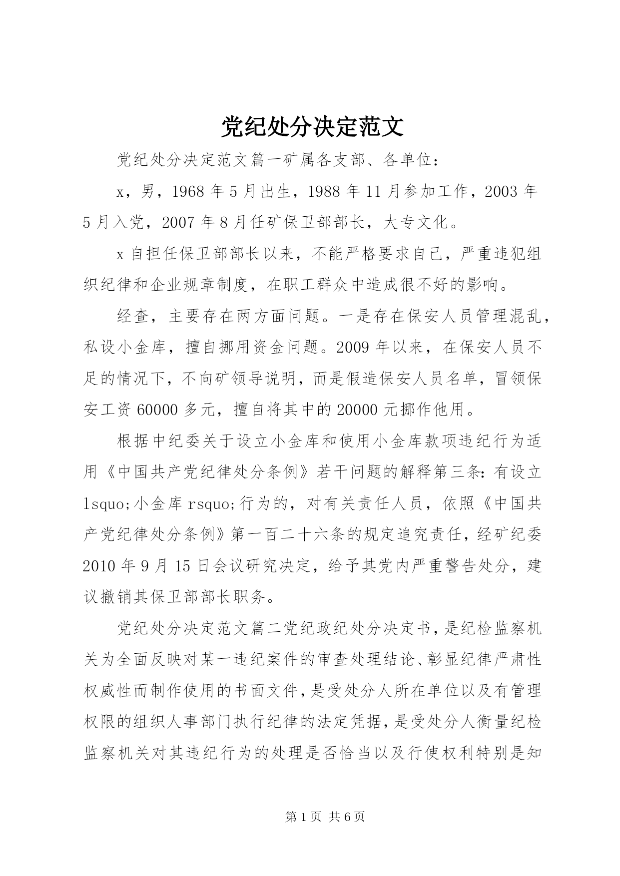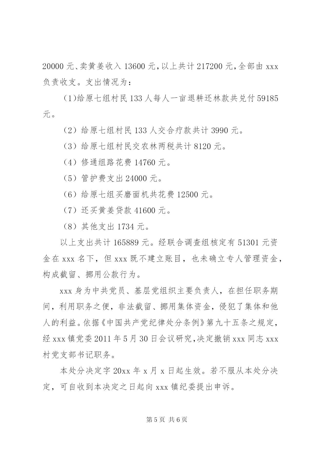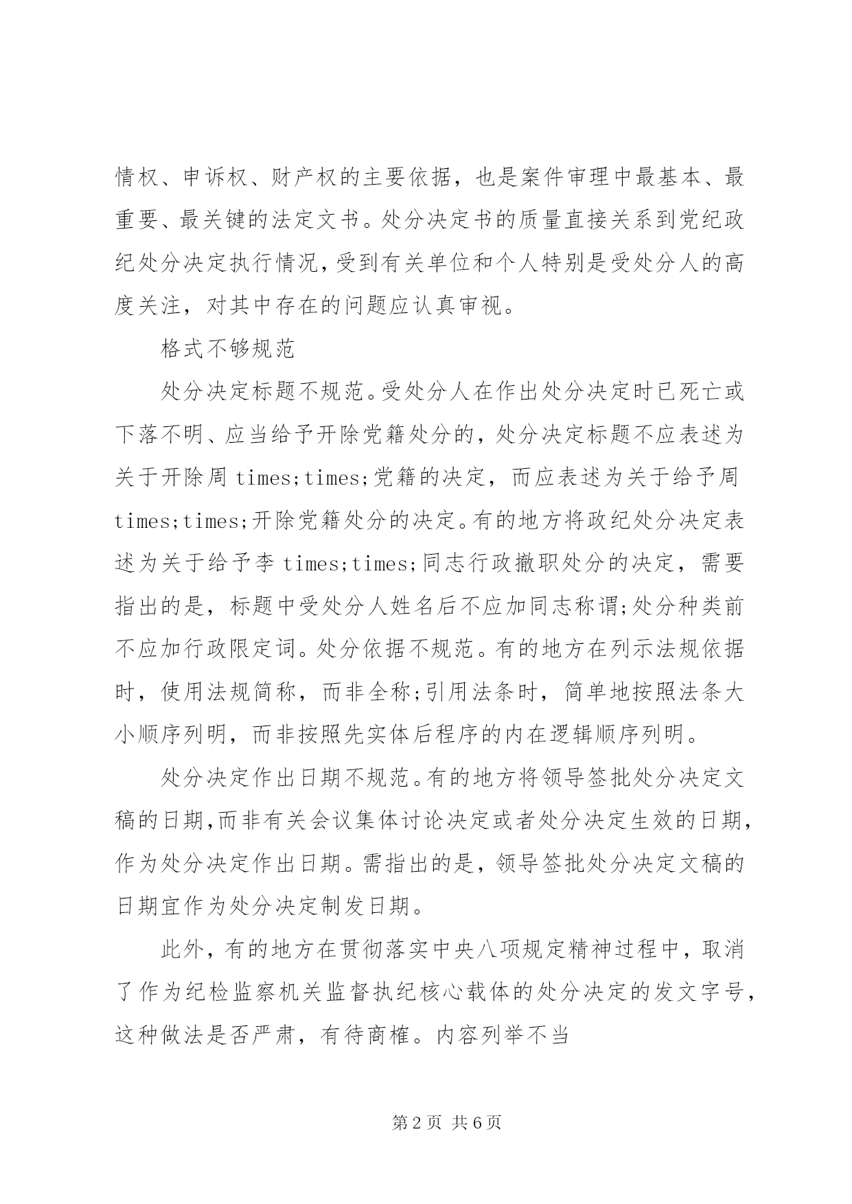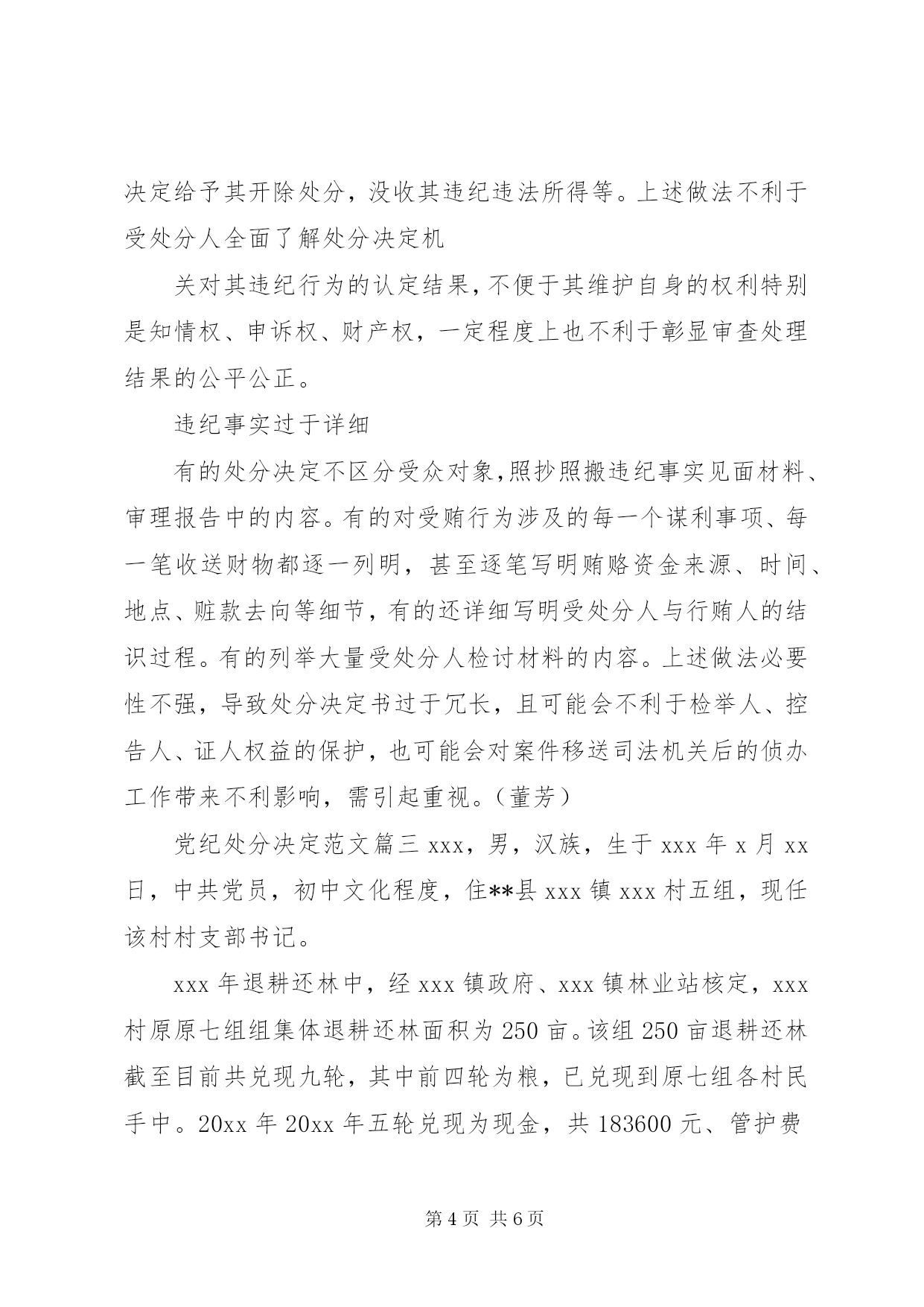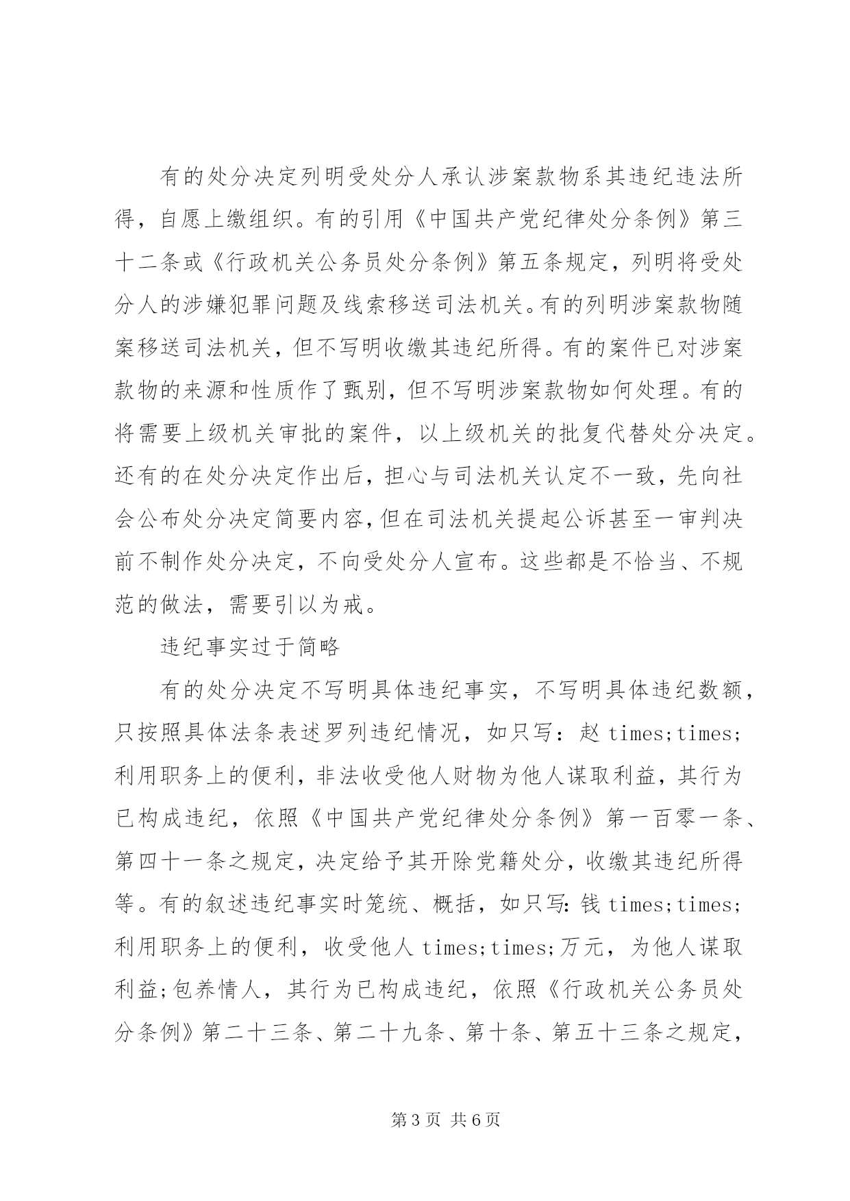 第PAGE\*Arabic\*MERGEFORMAT6页共NUMPAGES\*MERGEFORMAT6页党纪处分决定范文党纪处分决定范文篇一矿属各支部、各单位:x,男,1968年5月出生,1988年11月参加工作,2003年5月入党,2007年8月任矿保卫部部长,大专文化。x自担任保卫部部长以来,不能严格要求自己,严重违犯组织纪律和企业规章制度,在职工群众中造成很不好的影响。经查,主要存在两方面问题。一是存在保安人员管理混乱,私设小金库,擅自挪用资金问题。2009年以来,在保安人员不足的情况下,不向矿领导说明,而是假造保安人员名单,冒领保安工资60000多元,擅自将其中的20000元挪作他用。根据中纪委关于设立小金库和使用小金库款项违纪行为适用《中国共产党纪律处分条例》若干问题的解释第三条:有设立lsquo;小金库rsquo;行为的,对有关责任人员,依照《中国共产党纪律处分条例》第一百二十六条的规定追究责任,经矿纪委2010年9月15日会议研究决定,给予其党内严重警告处分,建议撤销其保卫部部长职务。党纪处分决定范文篇二党纪政纪处分决定书,是纪检监察机关为全面反映对某一违纪案件的审查处理结论、彰显纪律严肃性权威性而制作使用的书面文件,是受处分人所在单位以及有管理权限的组织人事部门执行纪律的法定凭据,是受处分人衡量纪检监察机关对其违纪行为的处理是否恰当以及行使权利特别是知情权、申诉权、财产权的主要依据,也是案件审理中最基本、最重要、最关键的法定文书。处分决定书的质量直接关系到党纪政纪处分决定执行情况,受到有关单位和个人特别是受处分人的高度关注,对其中存在的问题应认真审视。格式不够规范处分决定标题不规范。受处分人在作出处分决定时已死亡或下落不明、应当给予开除党籍处分的,处分决定标题不应表述为关于开除周times;times;党籍的决定,而应表述为关于给予周times;times;开除党籍处分的决定。有的地方将政纪处分决定表述为关于给予李times;times;同志行政撤职处分的决定,需要指出的是,标题中受处分人姓名后不应加同志称谓;处分种类前不应加行政限定词。处分依据不规范。有的地方在列示法规依据时,使用法规简称,而非全称;引用法条时,简单地按照法条大小顺序列明,而非按照先实体后程序的内在逻辑顺序列明。处分决定作出日期不规范。有的地方将领导签批处分决定文稿的日期,而非有关会议集体讨论决定或者处分决定生效的日期,作为处分决定作出日期。需指出的是,领导签批处分决定文稿的日期宜作为处分决定制发日期。此外,有的地方在贯彻落实中央八项规定精神过程中,取消了作为纪检监察机关监督执纪核心载体的处分决定的发文字号,这种做法是否严肃,有待商榷。内容列举不当有的处分决定列明受处分人承认涉案款物系其违纪违法所得,自愿上缴组织。有的引用《中国共产党纪律处分条例》第三十二条或《行政机关公务员处分条例》第五条规定,列明将受处分人的涉嫌犯罪问题及线索移送司法机关。有的列明涉案款物随案移送司法机关,但不写明收缴其违纪所得。有的案件已对涉案款物的来源和性质作了甄别,但不写明涉案款物如何处理。有的将需要上级机关审批的案件,以上级机关的批复代替处分决定。还有的在处分决定作出后,担心与司法机关认定不一致,先向社会公布处分决定简要内容,但在司法机关提起公诉甚至一审判决前不制作处分决定,不向受处分人宣布。这些都是不恰当、不规范的做法,需要引以为戒。违纪事实过于简略有的处分决定不写明具体违纪事实,不写明具体违纪数额,只按照具体法条表述罗列违纪情况,如只写:赵times;times;利用职务上的便利,非法收受他人财物为他人谋取利益,其行为已构成违纪,依照《中国共产党纪律处分条例》第一百零一条、第四十一条之规定,决定给予其开除党籍处分,收缴其违纪所得等。有的叙述违纪事实时笼统、概括,如只写:钱times;times;利用职务上的便利,收受他人times;times;万元,为他人谋取利益;包养情人,其行为已构成违纪,依照《行政机关公务员处分条例》第二十三条、第二十九条、第十条、第五十三条之规定,决定给予其开除处分,没收其违纪违法所得等。上述做法不利于受处分人全面了解处分决定机关对其违纪行为的认定结果,不便于其维护自身的权利特别是知情权、申诉权、财产权,一定程度上也不利于彰显审查处理结果的公平公正。违纪事实过于详细有的处分决定不区分受众对象,照抄照搬违纪事实见面材料、审理报告中的内容。有的对受贿行为涉及的每一个谋利事项、每一笔收送财物都逐一列明,甚至逐笔写明贿赂资金来源、时间、地点、赃款去向等细节,有的还详细写明受处分人与行贿人的结识过程。有的列举大量受处分人检讨材料的内容。上述做法必要性不强,导致处分决定书过于冗长,且可能会不利于检举人、控告人、证人权益的保