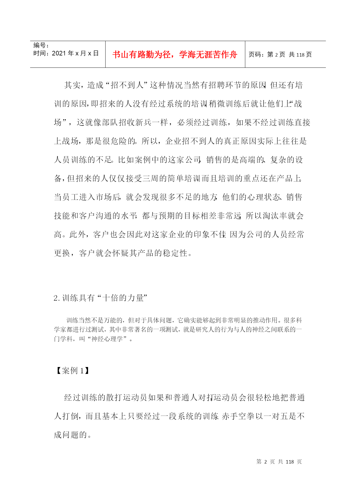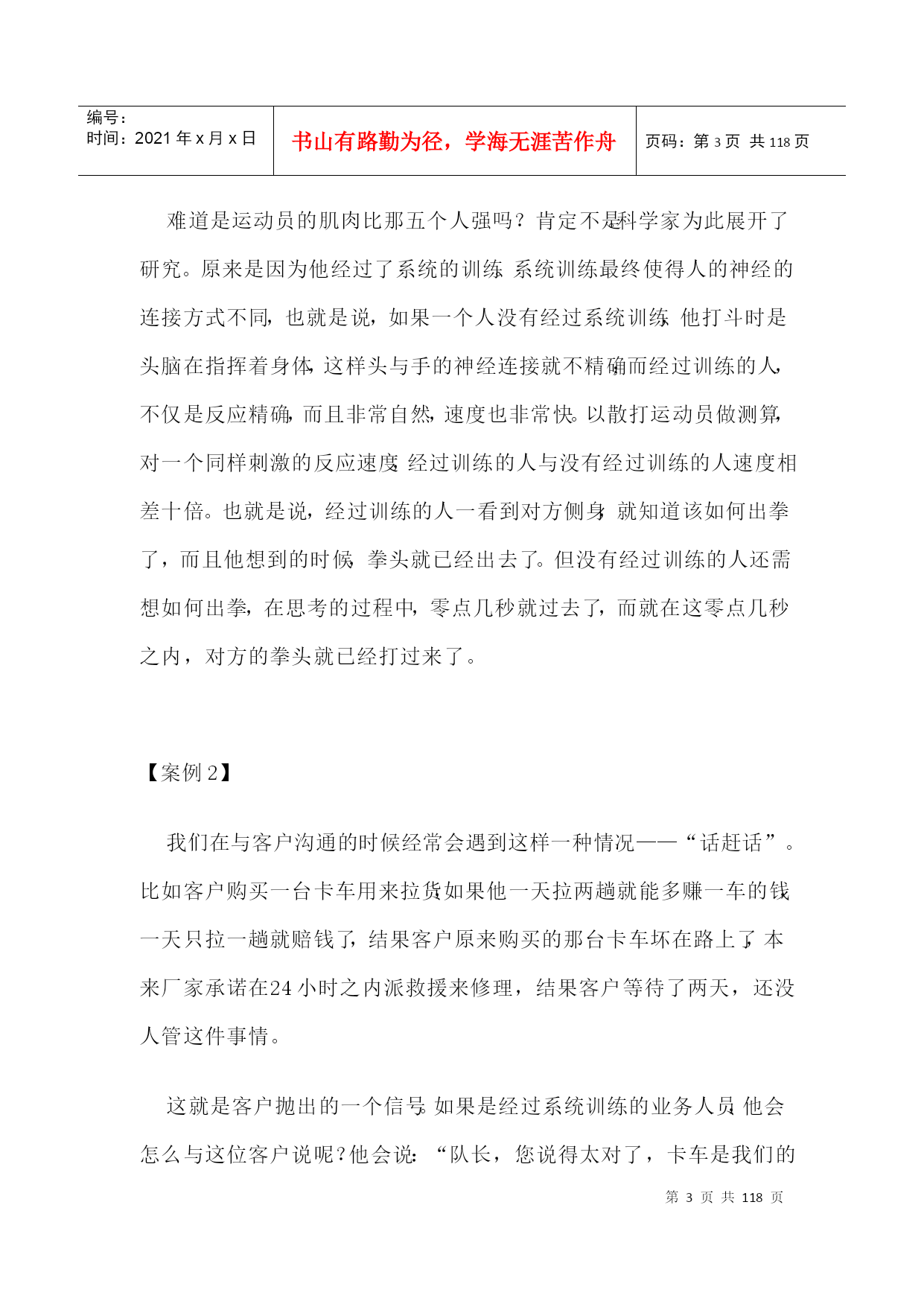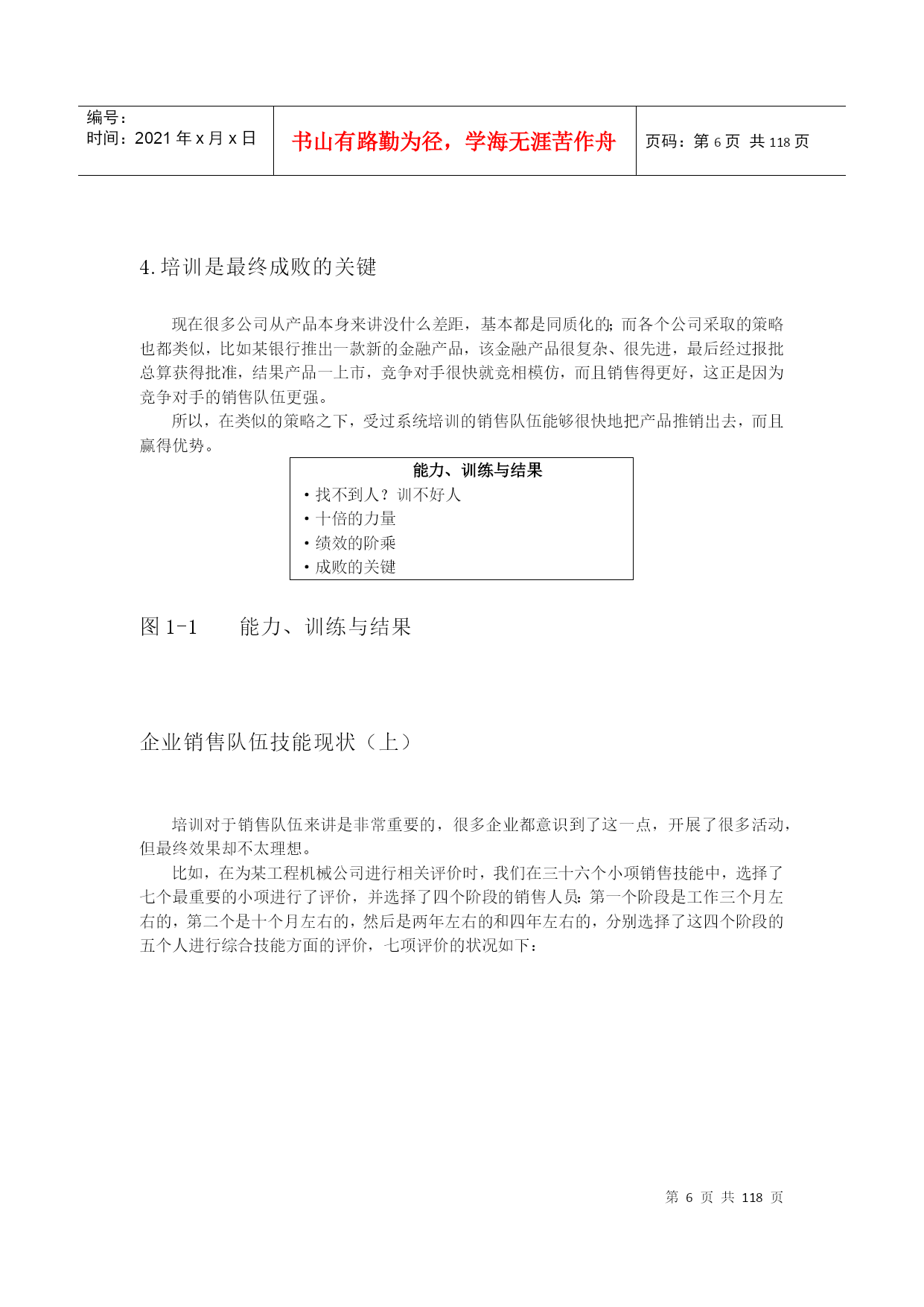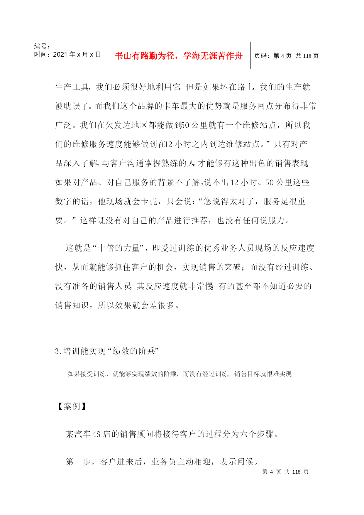 编号:时间:2021年x月x日书山有路勤为径,学海无涯苦作舟页码:第PAGE118页共NUMPAGES118页第PAGE\*MERGEFORMAT118页共NUMPAGES\*MERGEFORMAT118页第一讲企业销售队伍培训现状及问题(上)在本门课程中,我们首先介绍一下企业销售队伍的训练状态,因为优秀的营销策略和过硬的产品需要一支队伍去推行,而队伍执行与培训有着密切的关系。第二部分,我们将按照销售人员整个进程发展的脉络,介绍一下入门期、成长期、成熟前期和成熟后期的特点。课程的最后一部分是销售队伍培训体系的建设,包括销售队伍培训体系建设的要点,企业内部销售教练的选拔和培养等。培训的重要性1.“招不到人”的原因是培训得不好企业中任何优秀的政策都需要通过执行才会有效,而执行的效果则与销售的培训密切相关。【案例】某机床制造企业代理了欧洲一个非常优秀的品牌,这家公司目前在发展中遇到了一个难题,就是市场发展太快,很多区域市场基本上是空白,等着人们去开拓,但是公司又招不到合适的人。招来一个人,发现过了三个月、半年实在不符合公司要求,让他离开了,然后又招一个人,又不胜任。后来,总经理认为该公司产品技术含量比较高,应该从内部培养,于是就从车间质检培养销售人员,结果效果也不尽如人意。最近几年,公司的淘汰率非常高,连十分之一都没有留下。其实,造成“招不到人”这种情况当然有招聘环节的原因,但还有培训的原因,即招来的人没有经过系统的培训,稍微训练后就让他们上“战场”,这就像部队招收新兵一样,必须经过训练,如果不经过训练直接上战场,那是很危险的。所以,企业招不到人的真正原因实际上往往是人员训练的不足。比如案例中的这家公司,销售的是高端的、复杂的设备,但招来的人仅仅接受三周的简单培训,而且培训的重点还在产品上。当员工进入市场后,就会发现很多不足的地方,他们的心理状态、销售技能和客户沟通的水平,都与预期的目标相差非常远,所以淘汰率就会高。此外,客户也会因此对这家企业的印象不佳,因为公司的人员经常更换,客户就会怀疑其产品的稳定性。2.训练具有“十倍的力量”训练当然不是万能的,但对于具体问题,它确实能够起到非常明显的推动作用。很多科学家都进行过测试,其中非常著名的一项测试,就是研究人的行为与人的神经之间联系的一门学科,叫“神经心理学”。【案例1】经过训练的散打运动员如果和普通人对打,运动员会很轻松地把普通人打倒,而且基本上只要经过一段系统的训练,赤手空拳以一对五是不成问题的。难道是运动员的肌肉比那五个人强吗?肯定不是。科学家为此展开了研究。原来是因为他经过了系统的训练。系统训练最终使得人的神经的连接方式不同,也就是说,如果一个人没有经过系统训练,他打斗时是头脑在指挥着身体,这样头与手的神经连接就不精确;而经过训练的人,不仅是反应精确,而且非常自然,速度也非常快。以散打运动员做测算,对一个同样刺激的反应速度,经过训练的人与没有经过训练的人速度相差十倍。也就是说,经过训练的人一看到对方侧身,就知道该如何出拳了,而且他想到的时候,拳头就已经出去了。但没有经过训练的人还需想如何出拳,在思考的过程中,零点几秒就过去了,而就在这零点几秒之内,对方的拳头就已经打过来了。【案例2】我们在与客户沟通的时候经常会遇到这样一种情况——“话赶话”。比如客户购买一台卡车用来拉货,如果他一天拉两趟就能多赚一车的钱,一天只拉一趟就赔钱了,结果客户原来购买的那台卡车坏在路上了,本来厂家承诺在24小时之内派救援来修理,结果客户等待了两天,还没人管这件事情。这就是客户抛出的一个信号。如果是经过系统训练的业务人员,他会怎么与这位客户说呢?他会说:“队长,您说得太对了,卡车是我们的生产工具,我们必须很好地利用它,但是如果坏在路上,我们的生产就被耽误了。而我们这个品牌的卡车最大的优势就是服务网点分布得非常广泛。我们在欠发达地区都能做到50公里就有一个维修站点,所以我们的维修服务速度能够做到在12小时之内到达维修站点。”只有对产品深入了解,与客户沟通掌握熟练的人,才能够有这种出色的销售表现。如果对产品、对自己服务的背景不了解,说不出12小时、50公里这些数字的话,他现场就会卡壳,只会说:“您说得太对了,服务是很重要。”这样既没有对自己的产品进行推荐,也没有任何说服力。这就是“十倍的力量”,即受过训练的优秀业务人员现场的反应速度快,从而就能够抓住客户的机会,实现销售的突破;而没有经过训练、没有准备的销售人员,其反应速度就非常慢,有的甚至都不知道必要的销售知识,所以效果就会差很多。3.培训能实现“绩效的阶乘”如果接受训练,就能够实现绩效的阶乘,而没有经过训练,销售目标就很难实现。【案例】某汽车4S店的销售顾问将接待