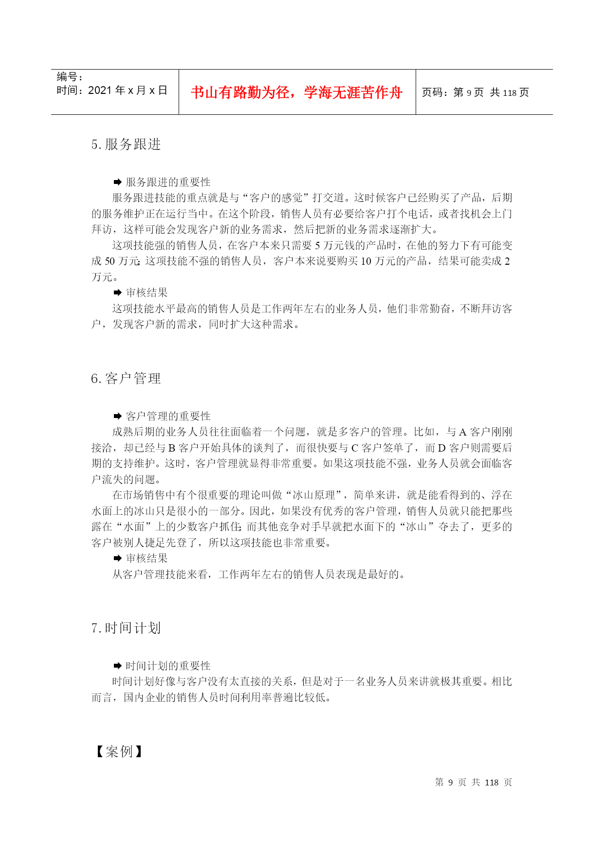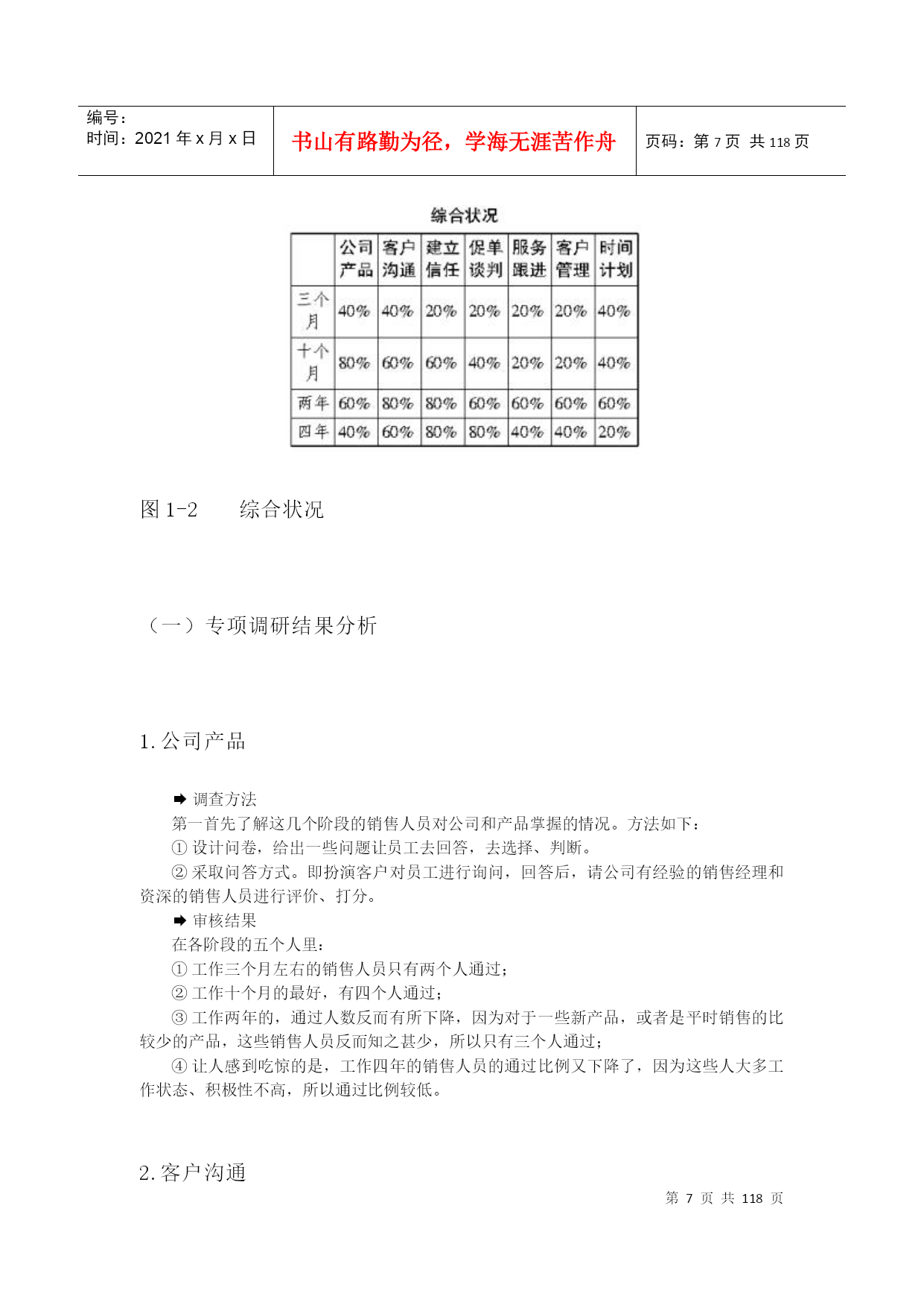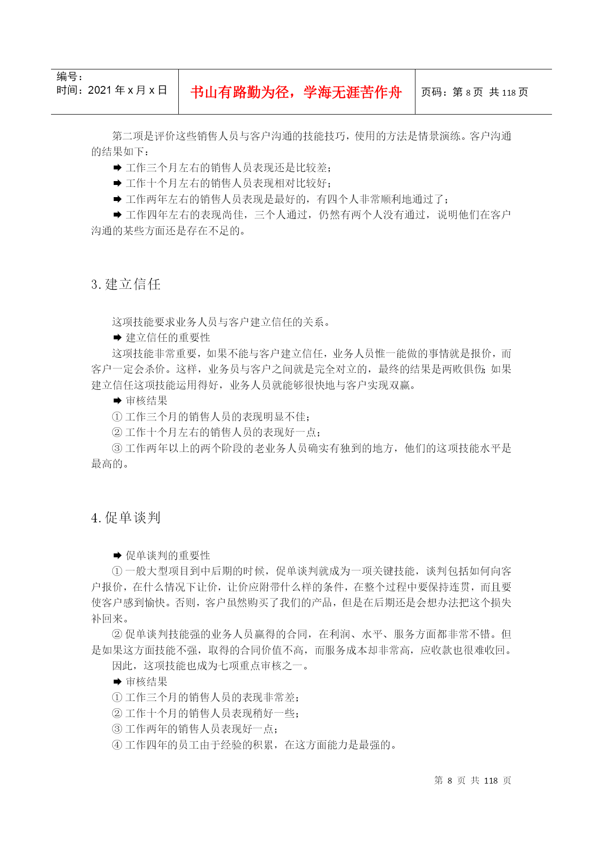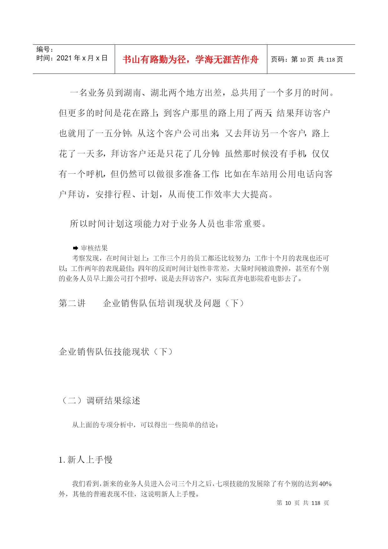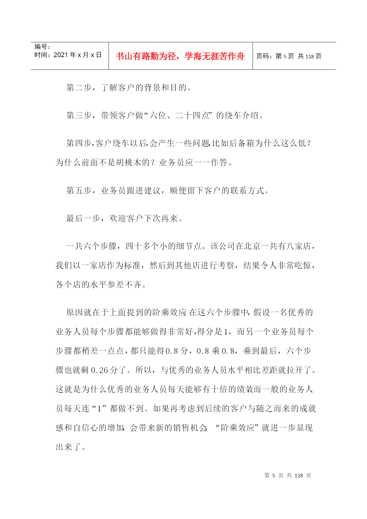 编号:时间:2021年x月x日书山有路勤为径,学海无涯苦作舟页码:第PAGE118页共NUMPAGES118页第PAGE\*MERGEFORMAT118页共NUMPAGES\*MERGEFORMAT118页第一讲企业销售队伍培训现状及问题(上)在本门课程中,我们首先介绍一下企业销售队伍的训练状态,因为优秀的营销策略和过硬的产品需要一支队伍去推行,而队伍执行与培训有着密切的关系。第二部分,我们将按照销售人员整个进程发展的脉络,介绍一下入门期、成长期、成熟前期和成熟后期的特点。课程的最后一部分是销售队伍培训体系的建设,包括销售队伍培训体系建设的要点,企业内部销售教练的选拔和培养等。培训的重要性1.“招不到人”的原因是培训得不好企业中任何优秀的政策都需要通过执行才会有效,而执行的效果则与销售的培训密切相关。【案例】某机床制造企业代理了欧洲一个非常优秀的品牌,这家公司目前在发展中遇到了一个难题,就是市场发展太快,很多区域市场基本上是空白,等着人们去开拓,但是公司又招不到合适的人。招来一个人,发现过了三个月、半年实在不符合公司要求,让他离开了,然后又招一个人,又不胜任。后来,总经理认为该公司产品技术含量比较高,应该从内部培养,于是就从车间质检培养销售人员,结果效果也不尽如人意。最近几年,公司的淘汰率非常高,连十分之一都没有留下。其实,造成“招不到人”这种情况当然有招聘环节的原因,但还有培训的原因,即招来的人没有经过系统的培训,稍微训练后就让他们上“战场”,这就像部队招收新兵一样,必须经过训练,如果不经过训练直接上战场,那是很危险的。所以,企业招不到人的真正原因实际上往往是人员训练的不足。比如案例中的这家公司,销售的是高端的、复杂的设备,但招来的人仅仅接受三周的简单培训,而且培训的重点还在产品上。当员工进入市场后,就会发现很多不足的地方,他们的心理状态、销售技能和客户沟通的水平,都与预期的目标相差非常远,所以淘汰率就会高。此外,客户也会因此对这家企业的印象不佳,因为公司的人员经常更换,客户就会怀疑其产品的稳定性。2.训练具有“十倍的力量”训练当然不是万能的,但对于具体问题,它确实能够起到非常明显的推动作用。很多科学家都进行过测试,其中非常著名的一项测试,就是研究人的行为与人的神经之间联系的一门学科,叫“神经心理学”。【案例1】经过训练的散打运动员如果和普通人对打,运动员会很轻松地把普通人打倒,而且基本上只要经过一段系统的训练,赤手空拳以一对五是不成问题的。难道是运动员的肌肉比那五个人强吗?肯定不是。科学家为此展开了研究。原来是因为他经过了系统的训练。系统训练最终使得人的神经的连接方式不同,也就是说,如果一个人没有经过系统训练,他打斗时是头脑在指挥着身体,这样头与手的神经连接就不精确;而经过训练的人,不仅是反应精确,而且非常自然,速度也非常快。以散打运动员做测算,对一个同样刺激的反应速度,经过训练的人与没有经过训练的人速度相差十倍。也就是说,经过训练的人一看到对方侧身,就知道该如何出拳了,而且他想到的时候,拳头就已经出去了。但没有经过训练的人还需想如何出拳,在思考的过程中,零点几秒就过去了,而就在这零点几秒之内,对方的拳头就已经打过来了。【案例2】我们在与客户沟通的时候经常会遇到这样一种情况——“话赶话”。比如客户购买一台卡车用来拉货,如果他一天拉两趟就能多赚一车的钱,一天只拉一趟就赔钱了,结果客户原来购买的那台卡车坏在路上了,本来厂家承诺在24小时之内派救援来修理,结果客户等待了两天,还没人管这件事情。这就是客户抛出的一个信号。如果是经过系统训练的业务人员,他会怎么与这位客户说呢?他会说:“队长,您说得太对了,卡车是我们的生产工具,我们必须很好地利用它,但是如果坏在路上,我们的生产就被耽误了。而我们这个品牌的卡车最大的优势就是服务网点分布得非常广泛。我们在欠发达地区都能做到50公里就有一个维修站点,所以我们的维修服务速度能够做到在12小时之内到达维修站点。”只有对产品深入了解,与客户沟通掌握熟练的人,才能够有这种出色的销售表现。如果对产品、对自己服务的背景不了解,说不出12小时、50公里这些数字的话,他现场就会卡壳,只会说:“您说得太对了,服务是很重要。”这样既没有对自己的产品进行推荐,也没有任何说服力。这就是“十倍的力量”,即受过训练的优秀业务人员现场的反应速度快,从而就能够抓住客户的机会,实现销售的突破;而没有经过训练、没有准备的销售人员,其反应速度就非常慢,有的甚至都不知道必要的销售知识,所以效果就会差很多。3.培训能实现“绩效的阶乘”如果接受训练,就能够实现绩效的阶乘,而没有经过训练,销售目标就很难实现。【案例】某汽车4S店的销售顾问将接待