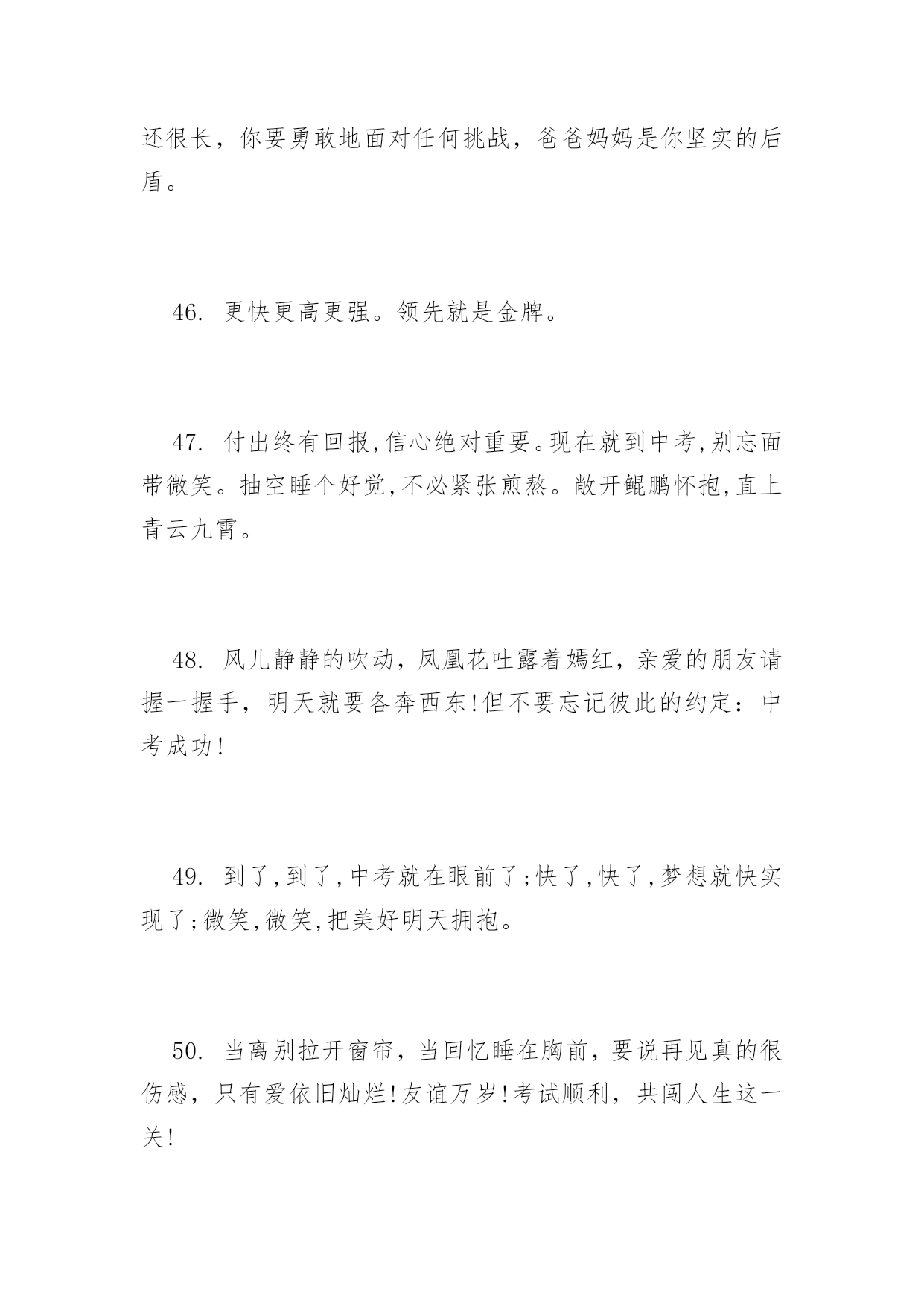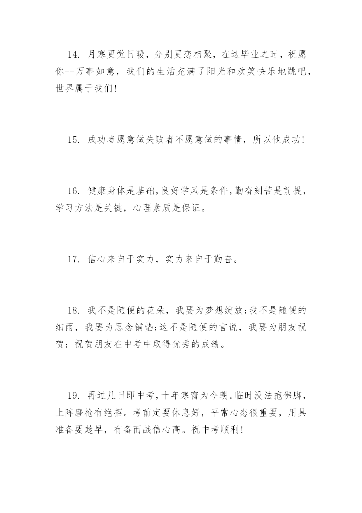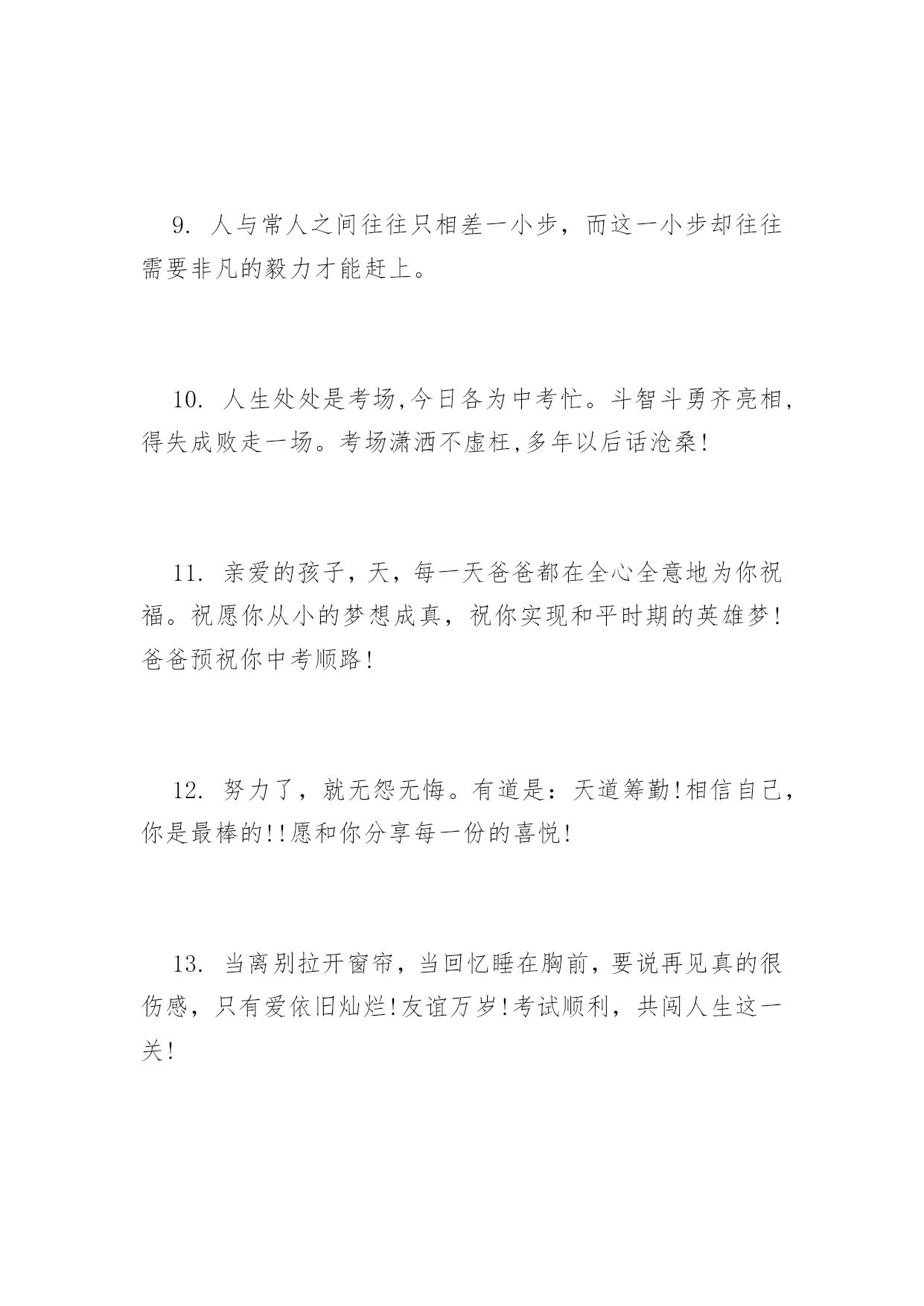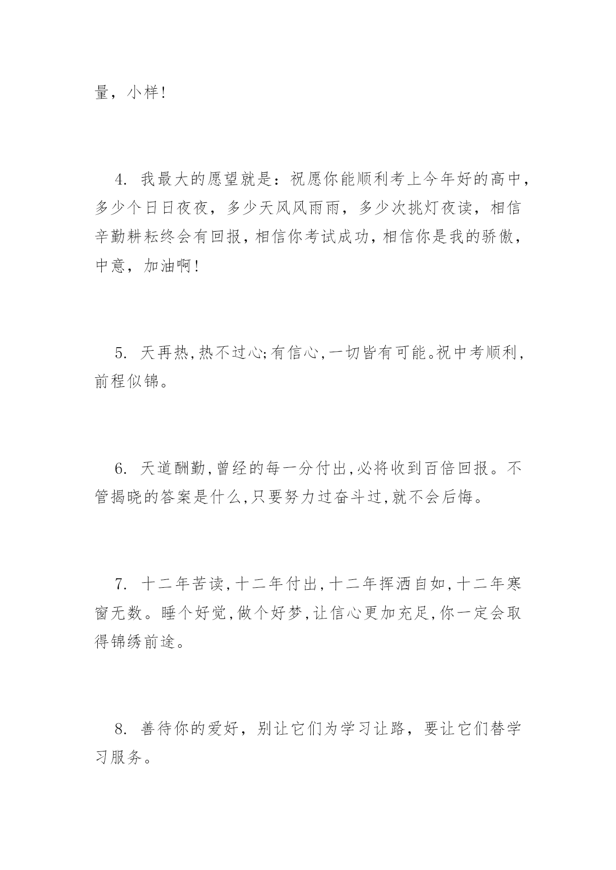 中考祝福语人生处处是考场,今日各为中考忙。以下是CN人才网小编为大家精心搜集和整理的2016年中考祝福语大全,希望大家喜欢!2016年中考祝福语大全(一)1.终有一天,相约巅峰欢呼起舞!祝考试顺利!2.中考的前一天晚上肯定有人失眠,这都是自己心态不好的结果,我中考前一天也失眠,不过第二天一样精神抖擞地参加考试,所以我想提醒参加中考的学弟学妹们,失眠没什么的,一定要放松,不要因为想着前天晚上的失眠而影响中考,最后祝参加中考的学弟学妹们中考顺利,金榜题名!3.只因上课困窘,鸡蛋堆成凤凰。不停咬笔把头晃,两眼放光。如虎似狼,与君同样紧张。看来,只有瞒天过海,暗渡陈仓,怎料老师四眼皆放光!暗示:有胆来创,没胆思量,小样!4.我最大的愿望就是:祝愿你能顺利考上今年好的高中,多少个日日夜夜,多少天风风雨雨,多少次挑灯夜读,相信辛勤耕耘终会有回报,相信你考试成功,相信你是我的骄傲,中意,加油啊!5.天再热,热不过心;有信心,一切皆有可能。祝中考顺利,前程似锦。6.天道酬勤,曾经的每一分付出,必将收到百倍回报。不管揭晓的答案是什么,只要努力过奋斗过,就不会后悔。7.十二年苦读,十二年付出,十二年挥洒自如,十二年寒窗无数。睡个好觉,做个好梦,让信心更加充足,你一定会取得锦绣前途。8.善待你的爱好,别让它们为学习让路,要让它们替学习服务。9.人与常人之间往往只相差一小步,而这一小步却往往需要非凡的毅力才能赶上。10.人生处处是考场,今日各为中考忙。斗智斗勇齐亮相,得失成败走一场。考场潇洒不虚枉,多年以后话沧桑!11.亲爱的孩子,天,每一天爸爸都在全心全意地为你祝福。祝愿你从小的梦想成真,祝你实现和平时期的英雄梦!爸爸预祝你中考顺路!12.努力了,就无怨无悔。有道是:天道筹勤!相信自己,你是最棒的!!愿和你分享每一份的喜悦!13.当离别拉开窗帘,当回忆睡在胸前,要说再见真的很伤感,只有爱依旧灿烂!友谊万岁!考试顺利,共闯人生这一关!14.月寒更觉日暖,分别更恋相聚,在这毕业之时,祝愿你--万事如意,我们的生活充满了阳光和欢笑快乐地跳吧,世界属于我们!15.成功者愿意做失败者不愿意做的事情,所以他成功!16.健康身体是基础,良好学风是条件,勤奋刻苦是前提,学习方法是关键,心理素质是保证。17.信心来自于实力,实力来自于勤奋。18.我不是随便的花朵,我要为梦想绽放;我不是随便的细雨,我要为思念铺垫;这不是随便的言说,我要为朋友祝贺:祝贺朋友在中考中取得优秀的成绩。19.再过几日即中考,十年寒窗为今朝。临时没法抱佛脚,上阵磨枪有绝招。考前定要休息好,平常心态很重要,用具准备要趁早,有备而战信心高。祝中考顺利!20.六月艳阳天,中考即在前,十年寒窗苦,朝暮读圣贤;学非单行道,之外路千条,心态摆平稳,从容去应考。榜上有名固可喜,名落孙山亦莫恼!祝中考大捷!21.十年寒窗苦,一朝成名耀。我知道我们辛苦,我们心酸,我们彷徨,我们无助。但兄弟,让我们挺住,让我们努力,让我们坚持。上天会成就我们的!22.今朝苦学迎夜灯,他年折桂步蟾宫。墙上的日历一页页的撕去,显赫的倒计时渐渐临近,我亲爱的朋友,请努力起来吧!为了六月的辉煌,请惜取每一寸光阴。23.付出终有回报,信心绝对重要。现在就到中考,别忘面带微笑。抽空睡个好觉,不必紧张煎熬。敞开鲲鹏怀抱,直上青云九霄。24.世界上最受欢迎的人从来不是那种不停地往后看着昨天的困苦悲伤失败和惨痛挫折的人,而是那种怀着信心希望勇气和愉快的求知欲而放眼未来的人。25.昨夜临阵磨枪,本想不快也光。如今面对试卷一张,谁知如此迷惘。过往所学皆忘,回忆往事沧桑。昔时心高气旺,幻想提名金榜。26.自信,是无尽智慧的凝聚。平淡,是成功路上的驿站。27.祝中考一切顺利成功!美梦成真!!28.祝愿天下所有考生开心度过中考。祝福你们旗开得胜,取得美好佳绩。平心对待高考,你们是最棒的!仁慈的上帝会祝福你们的,相信自己,一定能行!29.祝福我的好朋友考试成功!虽然最近我不再陪伴你学习,但是我在心里依然惦记着你相信你一定会成功的不管你能否看到都希望你能感受到我真诚的祝福!祝考试一切顺利!美梦成真!昨天,我们给你鼓励。今天,我们一起加油努力!30.周星驰:曾经有一份认真的复习放在我面前,我没有珍惜,等我失去的时候才后悔莫及,人世间最痛苦的事莫过于此。假如教委能够给我一个再来一次的机会,我会对自己说三个字:学彻底。假如非要在这份学习加上一个期限,我希望是……就半年!31.努力的苦读,就为这一刻啰!把你的实力全部发挥,所有关爱着你的人,都会为你祝福祈祷,相信你会考出满意的成绩,榜上有名喔!32.你还好吧,你远方的老同学真心的祝福你在今年的中考之中金榜提名,一举夺魁,考入心中理想的高中,进而步入