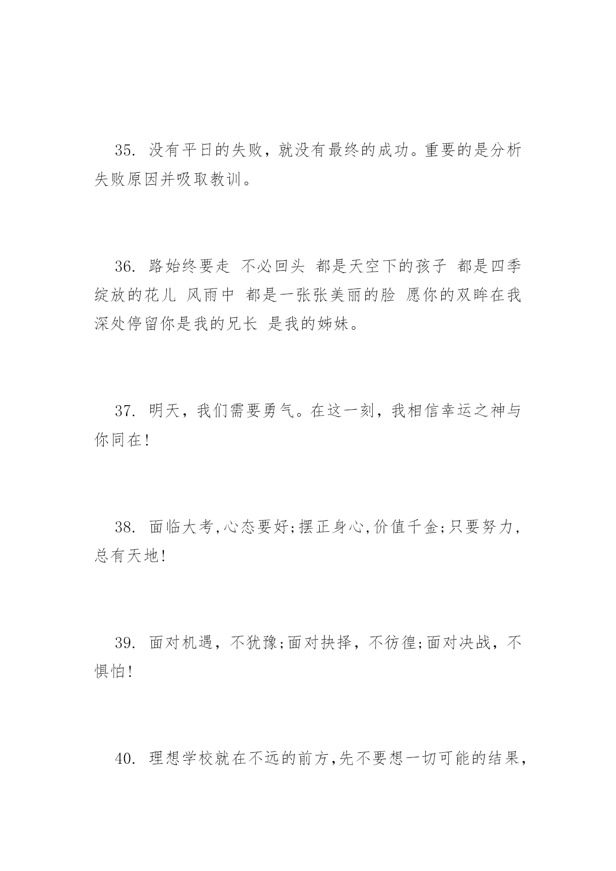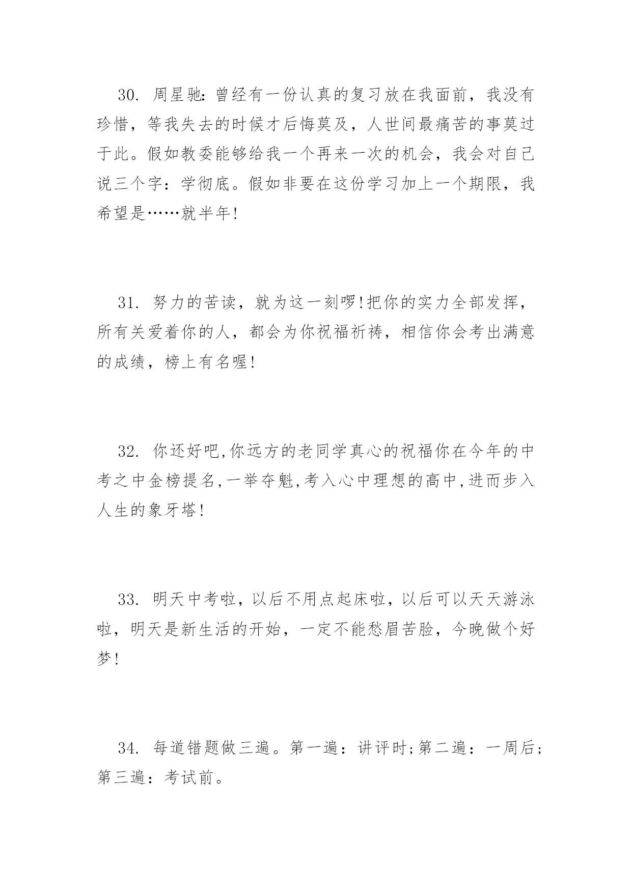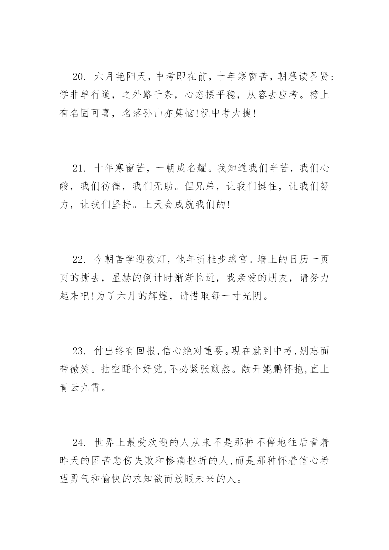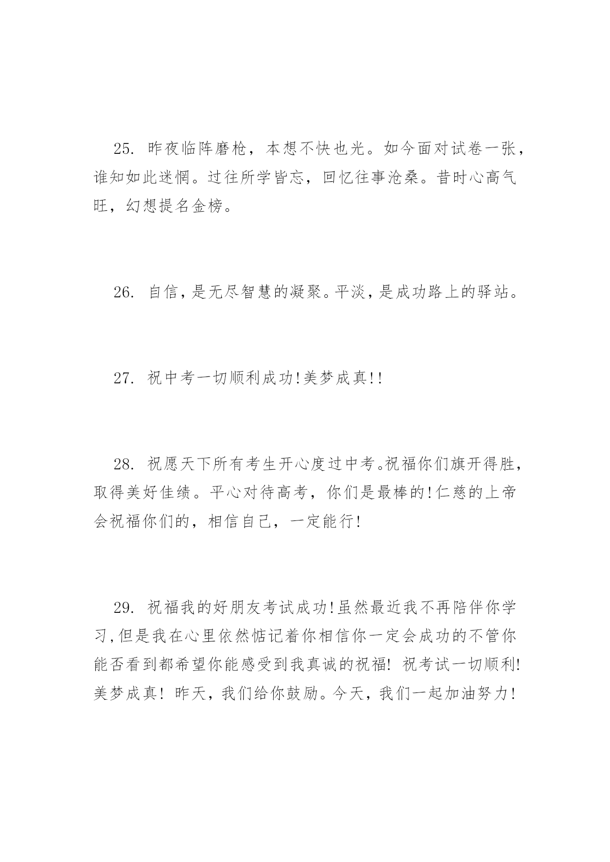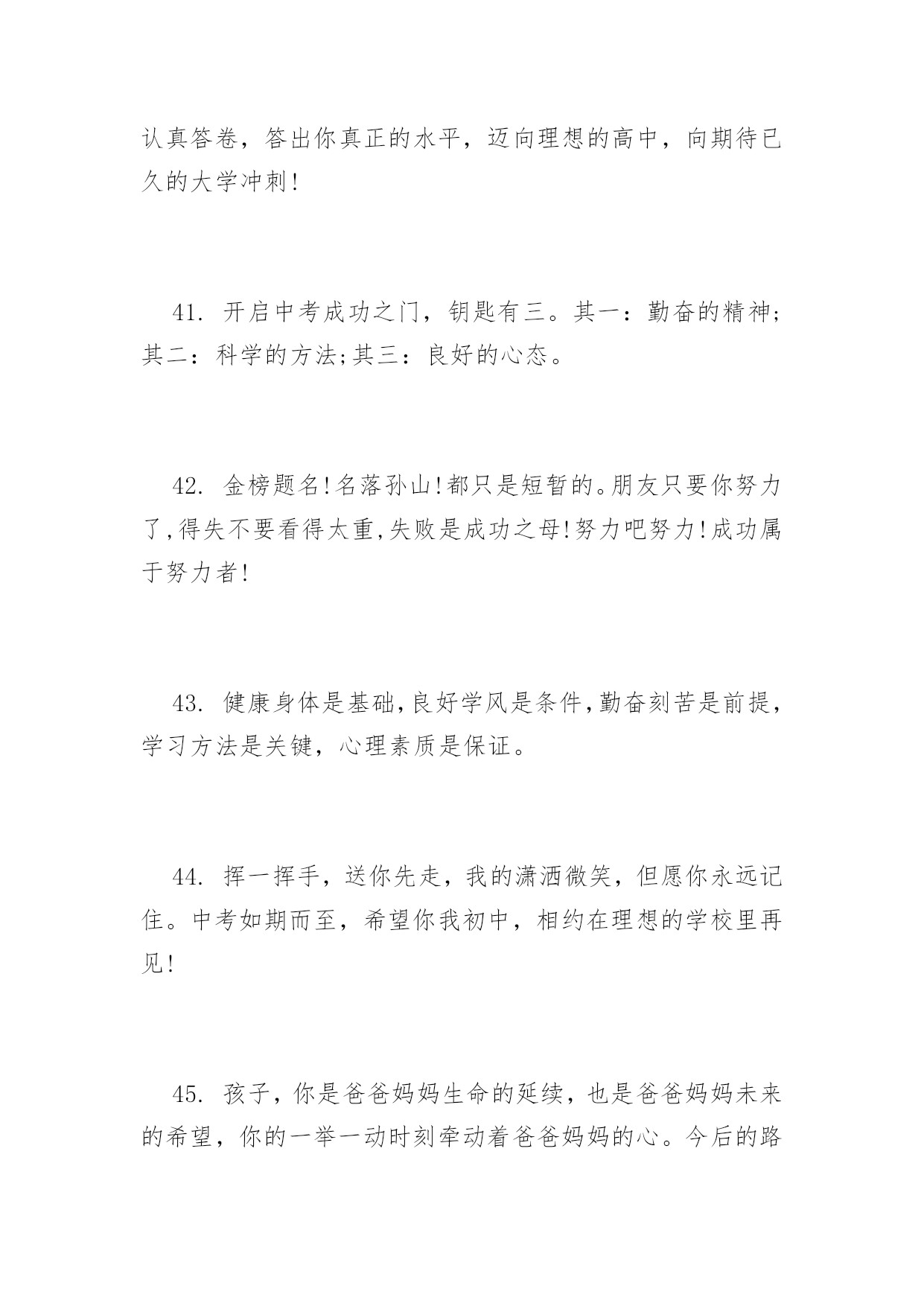 中考祝福语人生处处是考场,今日各为中考忙。以下是CN人才网小编为大家精心搜集和整理的2016年中考祝福语大全,希望大家喜欢!2016年中考祝福语大全(一)1.终有一天,相约巅峰欢呼起舞!祝考试顺利!2.中考的前一天晚上肯定有人失眠,这都是自己心态不好的结果,我中考前一天也失眠,不过第二天一样精神抖擞地参加考试,所以我想提醒参加中考的学弟学妹们,失眠没什么的,一定要放松,不要因为想着前天晚上的失眠而影响中考,最后祝参加中考的学弟学妹们中考顺利,金榜题名!3.只因上课困窘,鸡蛋堆成凤凰。不停咬笔把头晃,两眼放光。如虎似狼,与君同样紧张。看来,只有瞒天过海,暗渡陈仓,怎料老师四眼皆放光!暗示:有胆来创,没胆思量,小样!4.我最大的愿望就是:祝愿你能顺利考上今年好的高中,多少个日日夜夜,多少天风风雨雨,多少次挑灯夜读,相信辛勤耕耘终会有回报,相信你考试成功,相信你是我的骄傲,中意,加油啊!5.天再热,热不过心;有信心,一切皆有可能。祝中考顺利,前程似锦。6.天道酬勤,曾经的每一分付出,必将收到百倍回报。不管揭晓的答案是什么,只要努力过奋斗过,就不会后悔。7.十二年苦读,十二年付出,十二年挥洒自如,十二年寒窗无数。睡个好觉,做个好梦,让信心更加充足,你一定会取得锦绣前途。8.善待你的爱好,别让它们为学习让路,要让它们替学习服务。9.人与常人之间往往只相差一小步,而这一小步却往往需要非凡的毅力才能赶上。10.人生处处是考场,今日各为中考忙。斗智斗勇齐亮相,得失成败走一场。考场潇洒不虚枉,多年以后话沧桑!11.亲爱的孩子,天,每一天爸爸都在全心全意地为你祝福。祝愿你从小的梦想成真,祝你实现和平时期的英雄梦!爸爸预祝你中考顺路!12.努力了,就无怨无悔。有道是:天道筹勤!相信自己,你是最棒的!!愿和你分享每一份的喜悦!13.当离别拉开窗帘,当回忆睡在胸前,要说再见真的很伤感,只有爱依旧灿烂!友谊万岁!考试顺利,共闯人生这一关!14.月寒更觉日暖,分别更恋相聚,在这毕业之时,祝愿你--万事如意,我们的生活充满了阳光和欢笑快乐地跳吧,世界属于我们!15.成功者愿意做失败者不愿意做的事情,所以他成功!16.健康身体是基础,良好学风是条件,勤奋刻苦是前提,学习方法是关键,心理素质是保证。17.信心来自于实力,实力来自于勤奋。18.我不是随便的花朵,我要为梦想绽放;我不是随便的细雨,我要为思念铺垫;这不是随便的言说,我要为朋友祝贺:祝贺朋友在中考中取得优秀的成绩。19.再过几日即中考,十年寒窗为今朝。临时没法抱佛脚,上阵磨枪有绝招。考前定要休息好,平常心态很重要,用具准备要趁早,有备而战信心高。祝中考顺利!20.六月艳阳天,中考即在前,十年寒窗苦,朝暮读圣贤;学非单行道,之外路千条,心态摆平稳,从容去应考。榜上有名固可喜,名落孙山亦莫恼!祝中考大捷!21.十年寒窗苦,一朝成名耀。我知道我们辛苦,我们心酸,我们彷徨,我们无助。但兄弟,让我们挺住,让我们努力,让我们坚持。上天会成就我们的!22.今朝苦学迎夜灯,他年折桂步蟾宫。墙上的日历一页页的撕去,显赫的倒计时渐渐临近,我亲爱的朋友,请努力起来吧!为了六月的辉煌,请惜取每一寸光阴。23.付出终有回报,信心绝对重要。现在就到中考,别忘面带微笑。抽空睡个好觉,不必紧张煎熬。敞开鲲鹏怀抱,直上青云九霄。24.世界上最受欢迎的人从来不是那种不停地往后看着昨天的困苦悲伤失败和惨痛挫折的人,而是那种怀着信心希望勇气和愉快的求知欲而放眼未来的人。25.昨夜临阵磨枪,本想不快也光。如今面对试卷一张,谁知如此迷惘。过往所学皆忘,回忆往事沧桑。昔时心高气旺,幻想提名金榜。26.自信,是无尽智慧的凝聚。平淡,是成功路上的驿站。27.祝中考一切顺利成功!美梦成真!!28.祝愿天下所有考生开心度过中考。祝福你们旗开得胜,取得美好佳绩。平心对待高考,你们是最棒的!仁慈的上帝会祝福你们的,相信自己,一定能行!29.祝福我的好朋友考试成功!虽然最近我不再陪伴你学习,但是我在心里依然惦记着你相信你一定会成功的不管你能否看到都希望你能感受到我真诚的祝福!祝考试一切顺利!美梦成真!昨天,我们给你鼓励。今天,我们一起加油努力!30.周星驰:曾经有一份认真的复习放在我面前,我没有珍惜,等我失去的时候才后悔莫及,人世间最痛苦的事莫过于此。假如教委能够给我一个再来一次的机会,我会对自己说三个字:学彻底。假如非要在这份学习加上一个期限,我希望是……就半年!31.努力的苦读,就为这一刻啰!把你的实力全部发挥,所有关爱着你的人,都会为你祝福祈祷,相信你会考出满意的成绩,榜上有名喔!32.你还好吧,你远方的老同学真心的祝福你在今年的中考之中金榜提名,一举夺魁,考入心中理想的高中,进而步入