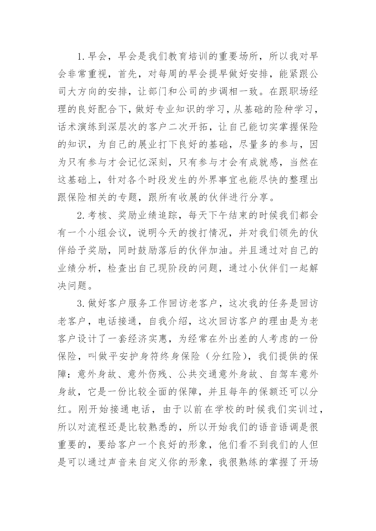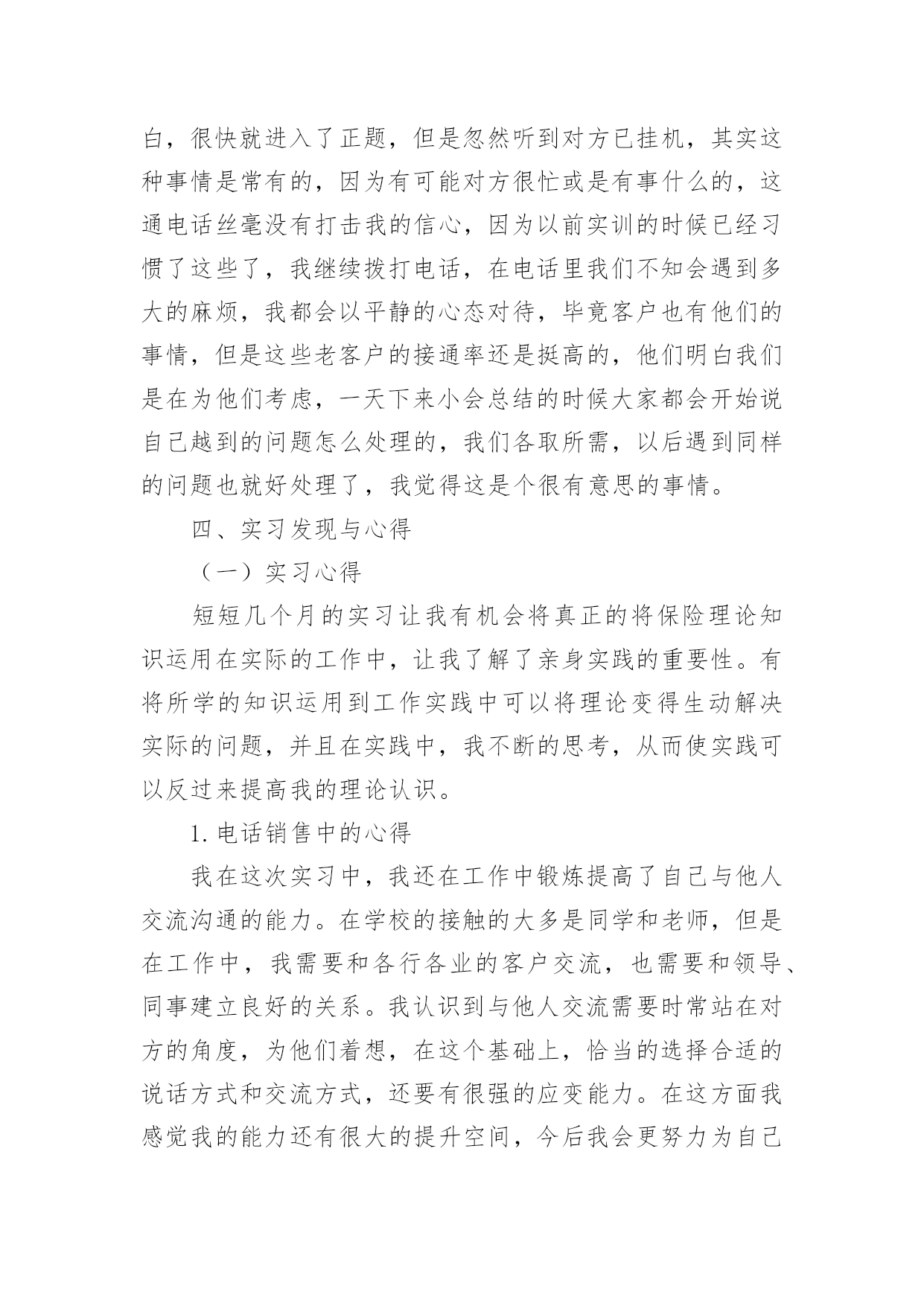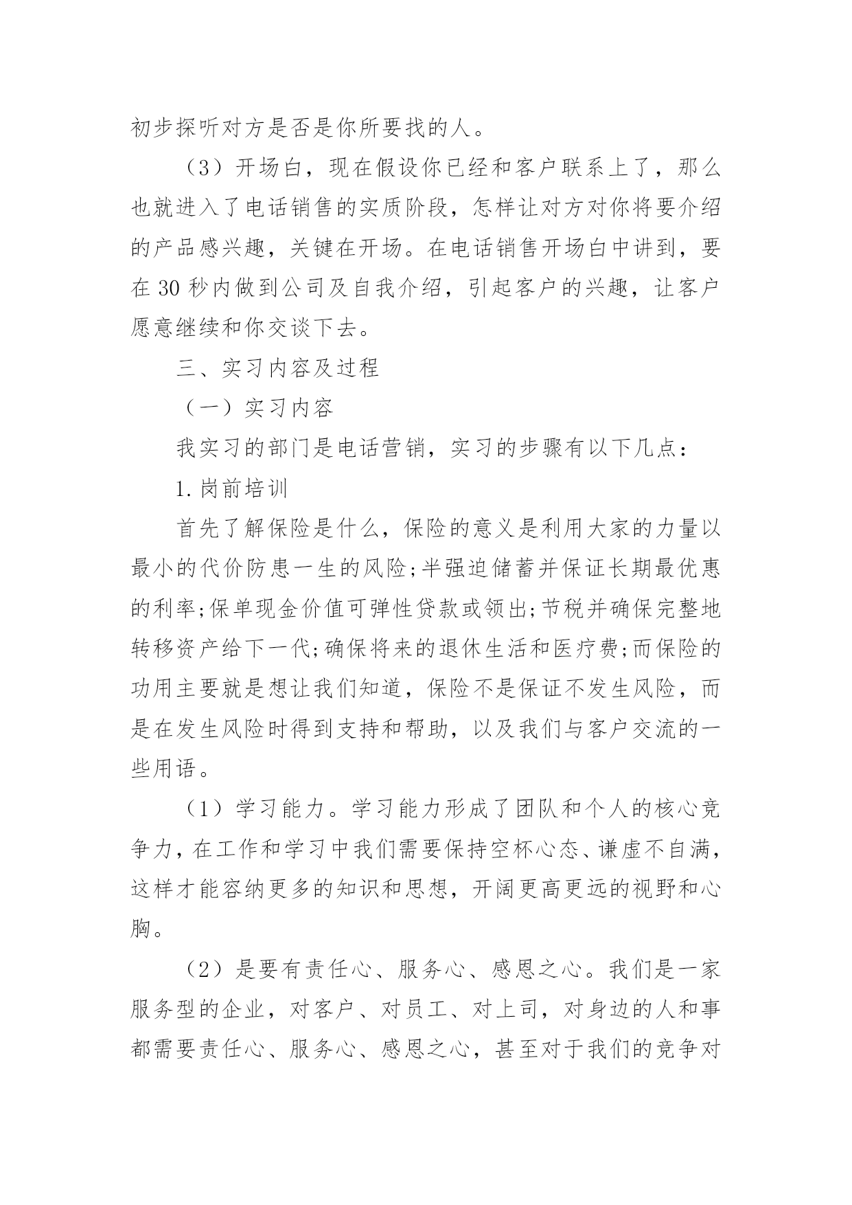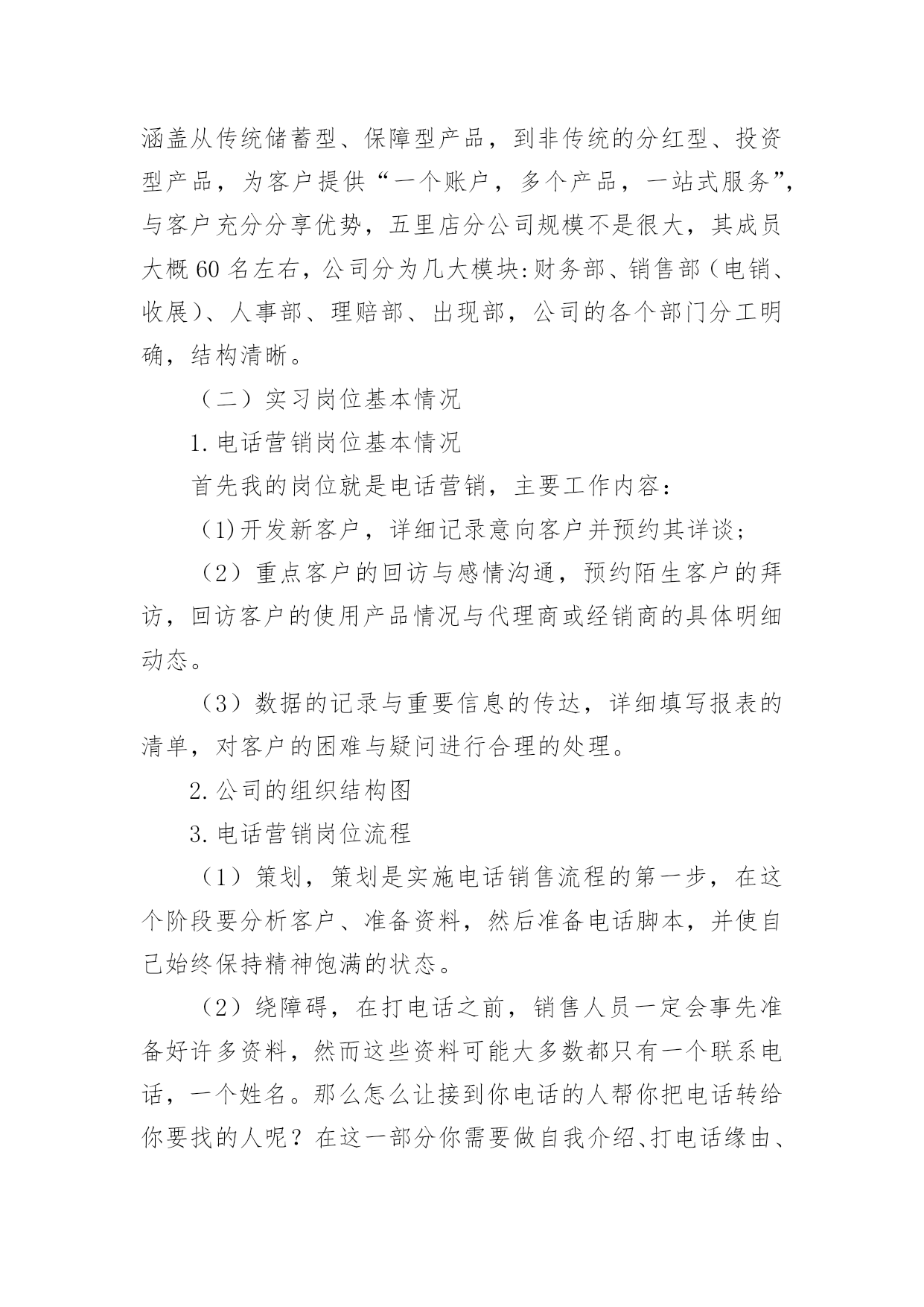 保险电话销售工作总结总结是事后对某一时期、某一项目或某些工作进行回顾和分析,从而做出带有规律性的结论,它可以帮助我们总结以往思想,发扬成绩,因此好好准备一份总结吧。那么总结有什么格式呢?以下是小编为大家收集的保险电话销售工作总结,欢迎大家分享。保险电话销售工作总结1一、前言实习是每一个大学毕业生必须拥有的一段经历,它使我们在实践中了解社会、在实践中巩固知识;实习又是对每一位大学毕业生专业知识的一种检验,它让我们学到了很多在课堂上根本就学不到的知识,既开阔了视野,又增长了见识,为我们以后进一步走向社会打下坚实的基础,也是我们走向工作岗位一步。我的实习目的是在八周的实习时间里,充分了解财产保险公司基层公司的工作内容和工作流程,熟悉保险公司的工作环境,掌握保险公司工作的相关技能,为今后踏上保险工作岗位做好准备,熟悉金融市场多元化。二、实习单位及实习岗位基本情况(一)实习单位基本情况中国平安人寿保险股份有限公司是中国平安保险(集团)股份有限责任公司旗下的重要成员,于20xx年成立,目前拥有各险、银保、电销等三大销售渠道,产品体系清晰完整,涵盖从传统储蓄型、保障型产品,到非传统的分红型、投资型产品,为客户提供“一个账户,多个产品,一站式服务”,与客户充分分享优势,五里店分公司规模不是很大,其成员大概60名左右,公司分为几大模块:财务部、销售部(电销、收展)、人事部、理赔部、出现部,公司的各个部门分工明确,结构清晰。(二)实习岗位基本情况1.电话营销岗位基本情况首先我的岗位就是电话营销,主要工作内容:(1)开发新客户,详细记录意向客户并预约其详谈;(2)重点客户的回访与感情沟通,预约陌生客户的拜访,回访客户的使用产品情况与代理商或经销商的具体明细动态。(3)数据的记录与重要信息的传达,详细填写报表的清单,对客户的困难与疑问进行合理的处理。2.公司的组织结构图3.电话营销岗位流程(1)策划,策划是实施电话销售流程的第一步,在这个阶段要分析客户、准备资料,然后准备电话脚本,并使自己始终保持精神饱满的状态。(2)绕障碍,在打电话之前,销售人员一定会事先准备好许多资料,然而这些资料可能大多数都只有一个联系电话,一个姓名。那么怎么让接到你电话的人帮你把电话转给你要找的人呢?在这一部分你需要做自我介绍、打电话缘由、初步探听对方是否是你所要找的人。(3)开场白,现在假设你已经和客户联系上了,那么也就进入了电话销售的实质阶段,怎样让对方对你将要介绍的产品感兴趣,关键在开场。在电话销售开场白中讲到,要在30秒内做到公司及自我介绍,引起客户的兴趣,让客户愿意继续和你交谈下去。三、实习内容及过程(一)实习内容我实习的部门是电话营销,实习的步骤有以下几点:1.岗前培训首先了解保险是什么,保险的意义是利用大家的力量以最小的代价防患一生的风险;半强迫储蓄并保证长期最优惠的利率;保单现金价值可弹性贷款或领出;节税并确保完整地转移资产给下一代;确保将来的退休生活和医疗费;而保险的功用主要就是想让我们知道,保险不是保证不发生风险,而是在发生风险时得到支持和帮助,以及我们与客户交流的一些用语。(1)学习能力。学习能力形成了团队和个人的核心竞争力,在工作和学习中我们需要保持空杯心态、谦虚不自满,这样才能容纳更多的知识和思想,开阔更高更远的视野和心胸。(2)是要有责任心、服务心、感恩之心。我们是一家服务型的企业,对客户、对员工、对上司,对身边的人和事都需要责任心、服务心、感恩之心,甚至对于我们的竞争对手,我们都需要怀有感恩之心,行业竞争和竞争对手是企业动力之一,我可以取精华去糟粕,不断提升我们的团队和自我,感恩对手为我们追求卓越提供了压力也营造了动力。(3)是追求卓越不断修炼。有人说江山易改本性难移,然而对于管理者而言,高情商是必备的素质,需要我们不断提高自己的心胸,包容豁达,因此性格修炼是成为一名称职的职业人所不能缺少的特质。2.保险专业知识培训老师教我们把书本上的知识运用到实际生活中,让我们回忆以前在学校的实训课课程,然后在老师面前实际操作,看我们的应用能力,还教我们一些工作技巧,还教我们一些保险电话销售方面的一些历史,告诉我们现在电话销售已经流行起来了,大部分客户都是通过电话联系而产生的。培训老师告诉我们,不要认为我们打电话过去是不好的,我们是在为顾客考虑,为他们的健康与理财等个方面考虑,当他们每天忙于工作的时候,奔波在各个城市的时候,有我们为他们考虑一些安全问题等等,我们是在为他们谋福利。然后我们开始演习打电话,两人一组,培训老师再给我们指出不恰当的地方。3.培训结束培训结束了,我们还有最后一个通关考试就可以上岗了,最后一个通关考试是给我们的主管打电话,她当客户,提一些问题,看我们的处事能力,再主管决定我们是否可以上岗。(二)实习过程1.早会,早会是我们教育培训的重