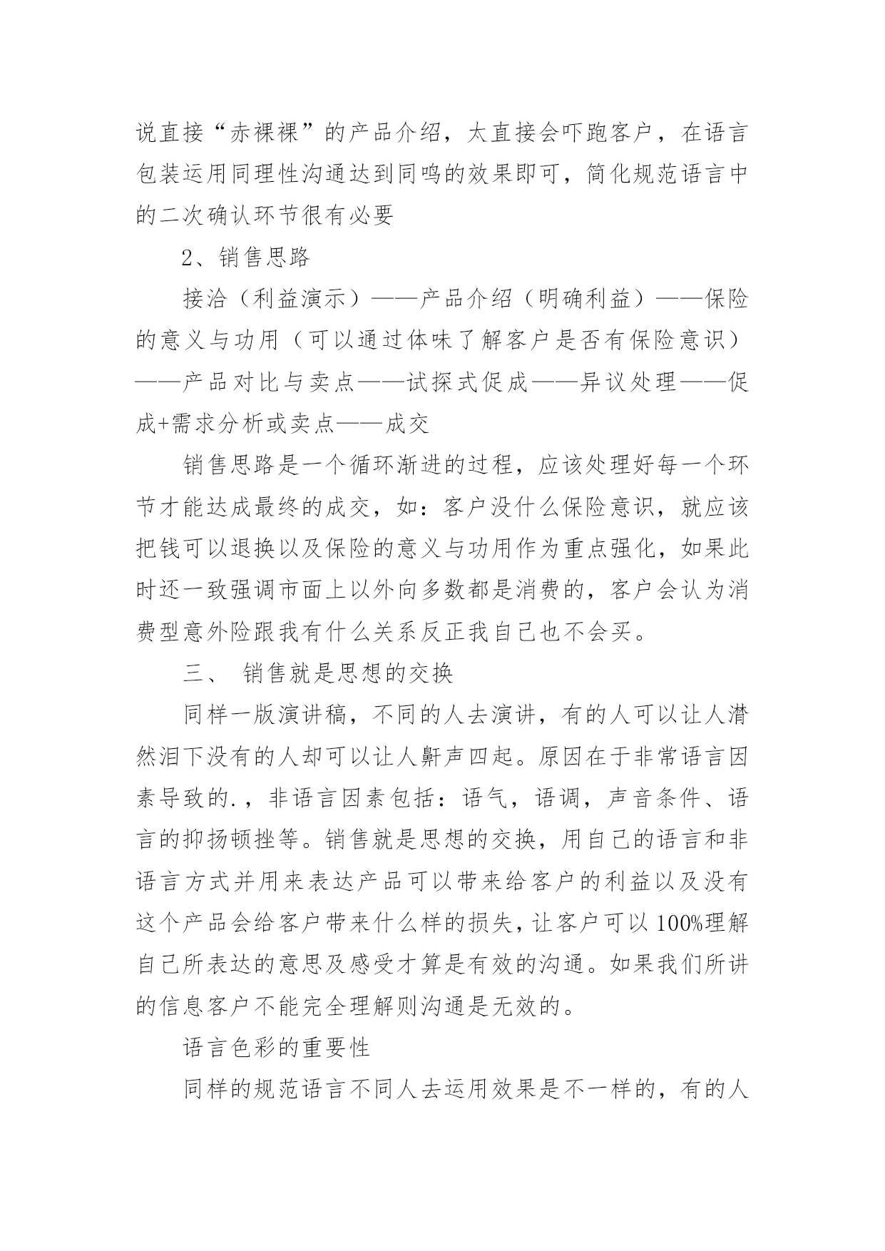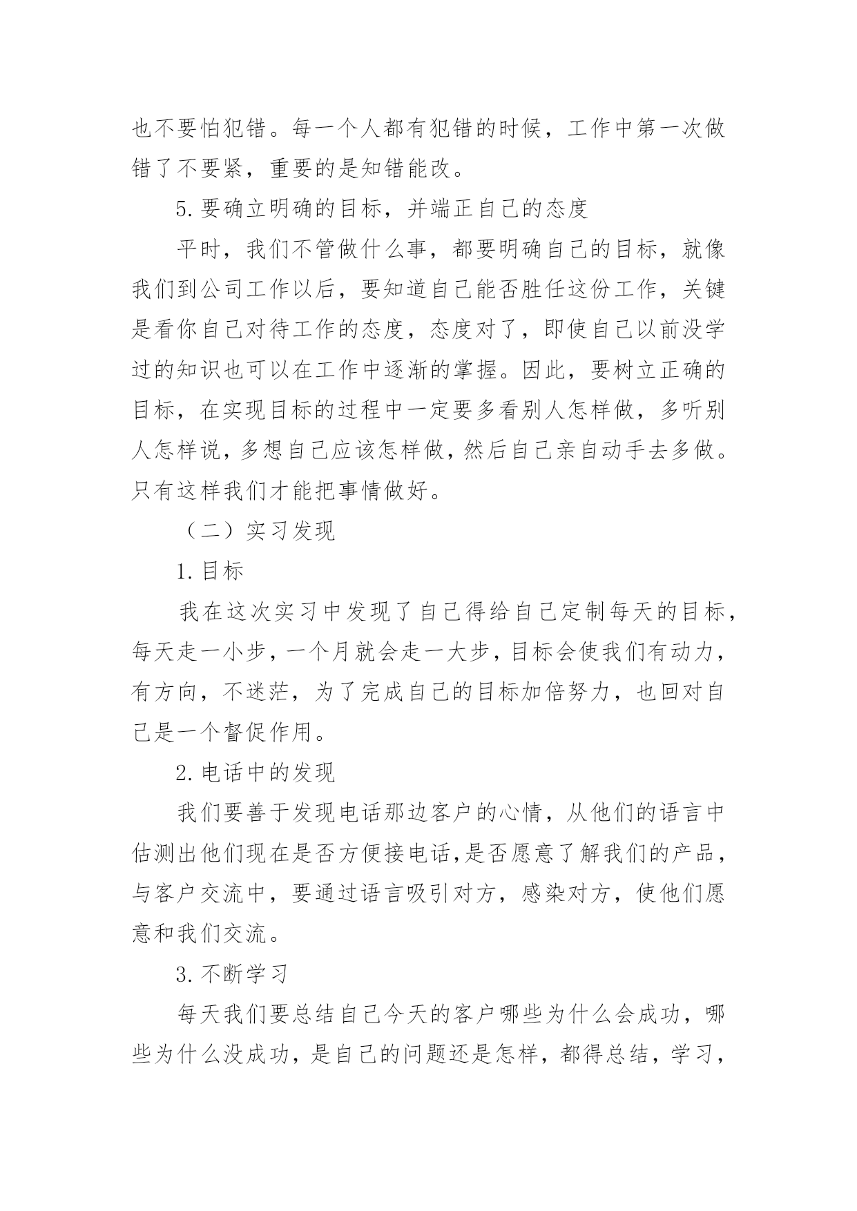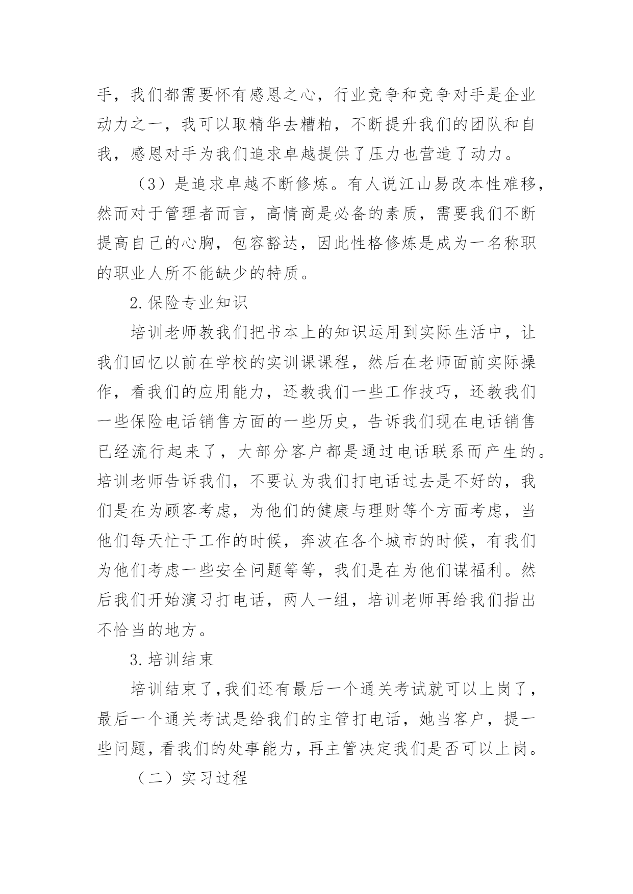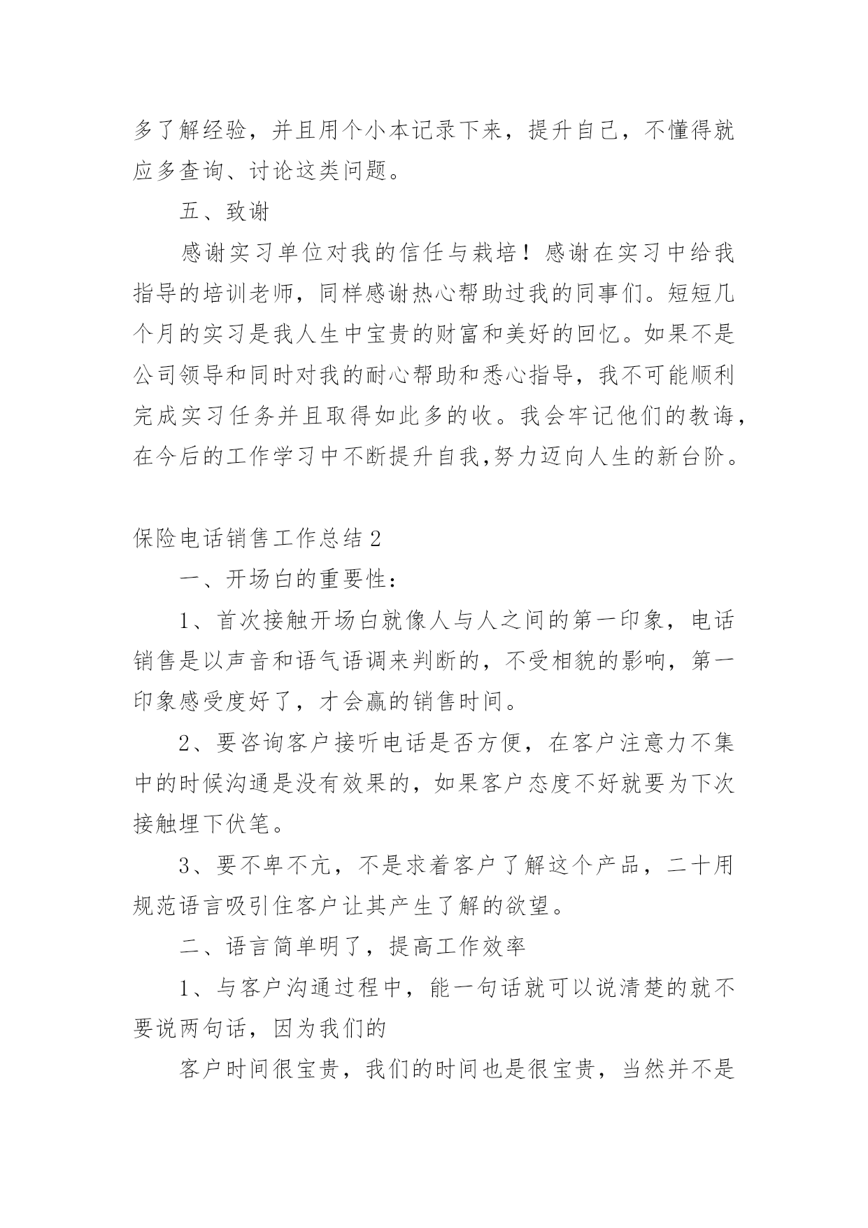 保险电话销售工作总结总结是事后对某一时期、某一项目或某些工作进行回顾和分析,从而做出带有规律性的结论,它可以帮助我们总结以往思想,发扬成绩,因此好好准备一份总结吧。那么总结有什么格式呢?以下是小编为大家收集的保险电话销售工作总结,欢迎大家分享。保险电话销售工作总结1一、前言实习是每一个大学毕业生必须拥有的一段经历,它使我们在实践中了解社会、在实践中巩固知识;实习又是对每一位大学毕业生专业知识的一种检验,它让我们学到了很多在课堂上根本就学不到的知识,既开阔了视野,又增长了见识,为我们以后进一步走向社会打下坚实的基础,也是我们走向工作岗位一步。我的实习目的是在八周的实习时间里,充分了解财产保险公司基层公司的工作内容和工作流程,熟悉保险公司的工作环境,掌握保险公司工作的相关技能,为今后踏上保险工作岗位做好准备,熟悉金融市场多元化。二、实习单位及实习岗位基本情况(一)实习单位基本情况中国平安人寿保险股份有限公司是中国平安保险(集团)股份有限责任公司旗下的重要成员,于20xx年成立,目前拥有各险、银保、电销等三大销售渠道,产品体系清晰完整,涵盖从传统储蓄型、保障型产品,到非传统的分红型、投资型产品,为客户提供“一个账户,多个产品,一站式服务”,与客户充分分享优势,五里店分公司规模不是很大,其成员大概60名左右,公司分为几大模块:财务部、销售部(电销、收展)、人事部、理赔部、出现部,公司的各个部门分工明确,结构清晰。(二)实习岗位基本情况1.电话营销岗位基本情况首先我的岗位就是电话营销,主要工作内容:(1)开发新客户,详细记录意向客户并预约其详谈;(2)重点客户的回访与感情沟通,预约陌生客户的拜访,回访客户的使用产品情况与代理商或经销商的具体明细动态。(3)数据的记录与重要信息的传达,详细填写报表的清单,对客户的困难与疑问进行合理的处理。2.公司的组织结构图3.电话营销岗位流程(1)策划,策划是实施电话销售流程的第一步,在这个阶段要分析客户、准备资料,然后准备电话脚本,并使自己始终保持精神饱满的状态。(2)绕障碍,在打电话之前,销售人员一定会事先准备好许多资料,然而这些资料可能大多数都只有一个联系电话,一个姓名。那么怎么让接到你电话的人帮你把电话转给你要找的人呢?在这一部分你需要做自我介绍、打电话缘由、初步探听对方是否是你所要找的人。(3)开场白,现在假设你已经和客户联系上了,那么也就进入了电话销售的实质阶段,怎样让对方对你将要介绍的产品感兴趣,关键在开场。在电话销售开场白中讲到,要在30秒内做到公司及自我介绍,引起客户的兴趣,让客户愿意继续和你交谈下去。三、实习内容及过程(一)实习内容我实习的部门是电话营销,实习的步骤有以下几点:1.岗前培训首先了解保险是什么,保险的意义是利用大家的力量以最小的代价防患一生的风险;半强迫储蓄并保证长期最优惠的利率;保单现金价值可弹性贷款或领出;节税并确保完整地转移资产给下一代;确保将来的退休生活和医疗费;而保险的功用主要就是想让我们知道,保险不是保证不发生风险,而是在发生风险时得到支持和帮助,以及我们与客户交流的一些用语。(1)学习能力。学习能力形成了团队和个人的核心竞争力,在工作和学习中我们需要保持空杯心态、谦虚不自满,这样才能容纳更多的知识和思想,开阔更高更远的视野和心胸。(2)是要有责任心、服务心、感恩之心。我们是一家服务型的企业,对客户、对员工、对上司,对身边的人和事都需要责任心、服务心、感恩之心,甚至对于我们的竞争对手,我们都需要怀有感恩之心,行业竞争和竞争对手是企业动力之一,我可以取精华去糟粕,不断提升我们的团队和自我,感恩对手为我们追求卓越提供了压力也营造了动力。(3)是追求卓越不断修炼。有人说江山易改本性难移,然而对于管理者而言,高情商是必备的素质,需要我们不断提高自己的心胸,包容豁达,因此性格修炼是成为一名称职的职业人所不能缺少的特质。2.保险专业知识培训老师教我们把书本上的知识运用到实际生活中,让我们回忆以前在学校的实训课课程,然后在老师面前实际操作,看我们的应用能力,还教我们一些工作技巧,还教我们一些保险电话销售方面的一些历史,告诉我们现在电话销售已经流行起来了,大部分客户都是通过电话联系而产生的。培训老师告诉我们,不要认为我们打电话过去是不好的,我们是在为顾客考虑,为他们的健康与理财等个方面考虑,当他们每天忙于工作的时候,奔波在各个城市的时候,有我们为他们考虑一些安全问题等等,我们是在为他们谋福利。然后我们开始演习打电话,两人一组,培训老师再给我们指出不恰当的地方。3.培训结束培训结束了,我们还有最后一个通关考试就可以上岗了,最后一个通关考试是给我们的主管打电话,她当客户,提一些问题,看我们的处事能力,再主管决定我们是否可以上岗。(二)实习过程1.早会,早会是我们教育培训的重
