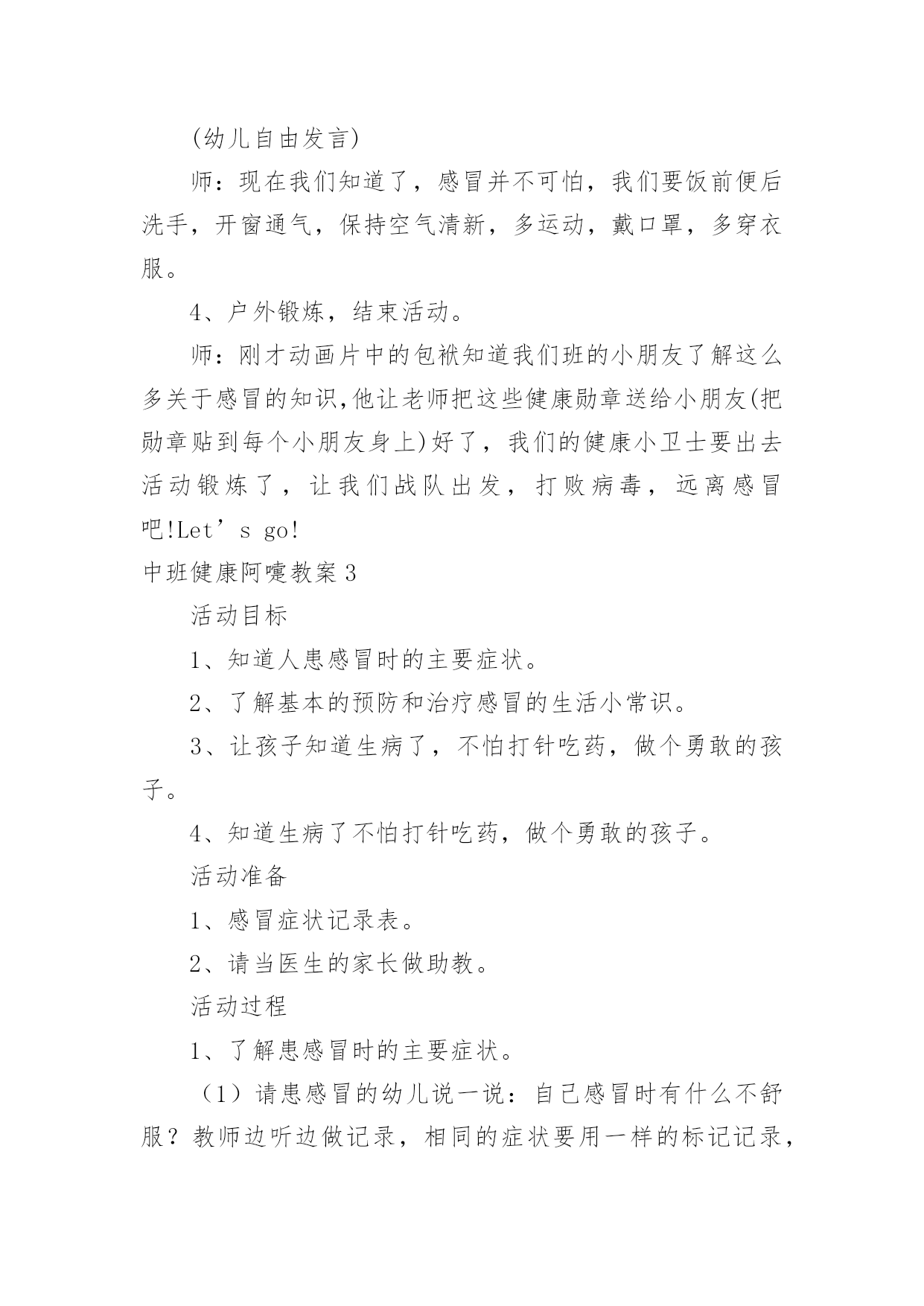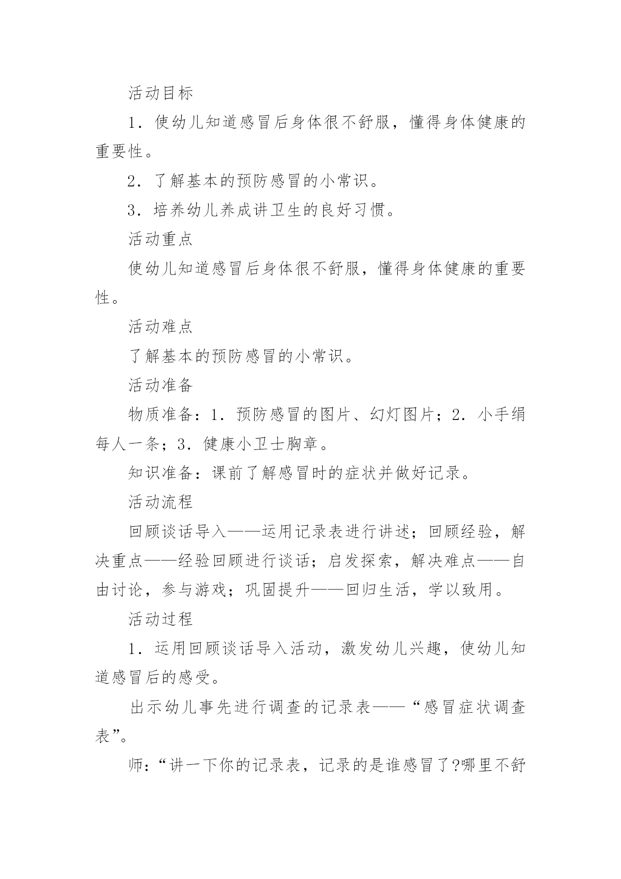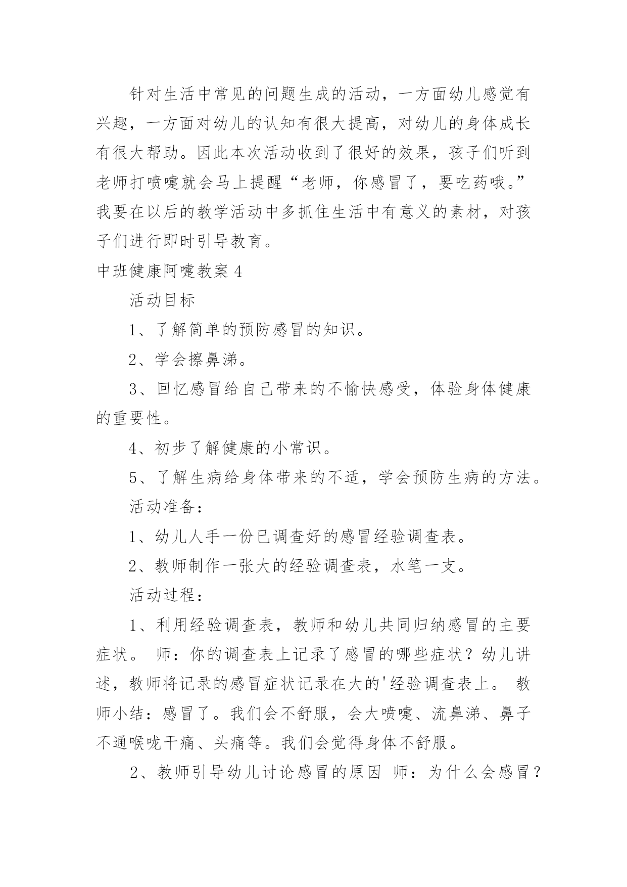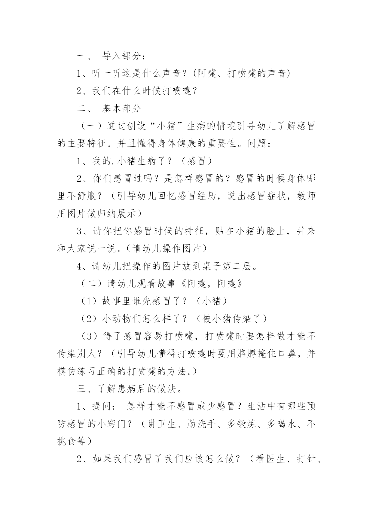中班健康阿嚏教案中班健康阿嚏教案作为一位优秀的人民教师,往往需要进行教案编写工作,借助教案可以提高教学质量,收到预期的教学效果。那么你有了解过教案吗?以下是小编为大家整理的中班健康阿嚏教案,欢迎大家借鉴与参考,希望对大家有所帮助。中班健康阿嚏教案1活动目标:1、知道感冒了身体很不舒服,懂得身体健康的重要性。2、了解基本的预防感冒的生活小常识。3、培养幼儿养成讲究卫生的良好习惯。活动重点:使幼儿知道感冒后身体很不舒服,懂得身体健康的重要性。活动难点:了解基本的预防感冒的小常识。活动准备:1、小猪图片若干2、教学视频3、预防感冒的歌曲活动过程:一、导入部分:1、听一听这是什么声音?(阿嚏、打喷嚏的声音)2、我们在什么时候打喷嚏?二、基本部分(一)通过创设“小猪”生病的情境引导幼儿了解感冒的主要特征。并且懂得身体健康的重要性。问题:1、我的.小猪生病了?(感冒)2、你们感冒过吗?是怎样感冒的?感冒的时候身体哪里不舒服?(引导幼儿回忆感冒经历,说出感冒症状,教师用图片做归纳展示)3、请你把你感冒时候的特征,贴在小猪的脸上,并来和大家说一说。(请幼儿操作图片)4、请幼儿把操作的图片放到桌子第二层。(二)请幼儿观看故事《阿嚏,阿嚏》(1)故事里谁先感冒了?(小猪)(2)小动物们怎么样了?(被小猪传染了)(3)得了感冒容易打喷嚏,打喷嚏时要怎样做才能不传染别人?(引导幼儿懂得打喷嚏时要用胳膊掩住口鼻,并模仿练习正确的打喷嚏的方法。)三、了解患病后的做法。1、提问:怎样才能不感冒或少感冒?生活中有哪些预防感冒的小窍门?(讲卫生、勤洗手、多锻炼、多喝水、不挑食等)2、如果我们感冒了我们应该怎么做?(看医生、打针、吃药、多喝开水、注意休息、不去公共场所……)3、如果我们从外面回到家里应该先干什么?重点:学习洗手的正确方法并模仿练习。儿歌:搓搓搓,搓手心,搓搓搓,搓手背,换只手,再搓搓,冲冲冲,冲冲手,冲冲冲,冲干净,关上龙头甩三下,一二三!真干净!4、通过识别、粘贴“健康小贴士”的活动提升幼儿预防感冒的经验,教师提供多种图片给幼儿观察,请幼儿选出预防感冒的好方法,粘贴在健康宝宝周围。四、结束活动:师幼共同随巧虎的音乐跳起来,结束活动。1、我们知道了有关于感冒的很多知识,请小朋友回到家和爸爸妈妈分享我们学到的知识好吗?2、现在请小朋友们和巧虎一起来做一做预防感冒的运动吧!中班健康阿嚏教案2活动目标:1、幼儿知道感冒后的症状,懂的身体健康的重要性。2、了解基本的治疗和预防感冒的小常识。活动准备:动画视频一个、记录表一张、健康勋章若干活动过程:1、运用谈话导入活动,激发幼儿兴趣,使幼儿知道感冒后症状。师:小朋(“阿嚏”)友们(“阿嚏”)好!(阿嚏)(教师故作感冒打阿嚏)你们看老师这是怎么了!幼:感冒了师:那你们感冒过吗,你感冒是什么样子的呢?(教师出示表格,将幼儿所说内容记录在图表中,如下图)2、引导幼儿回顾经验,知道患感冒后的做法。师:我们感冒了会难受、头疼、发烧、咳嗽、流鼻涕、打喷嚏,有的小朋友还不能上幼儿园,所以,有一个健康的身体是很重要的。那我们要是感冒了怎么办呢?幼1:去看医生。”幼2:多喝水幼3:吃药(多穿衣服、打针、打点滴、多吃水果等等)师:小朋友们说得真好,我们如果感冒了,一定要及时去看医生,配合医生的治疗,按时吃药,多喝开水,注意休息,多吃瓜果蔬菜。还有,如果我们班有小朋友感冒了,我们要关心他,照顾他,做一个乐于助人好孩子。3、幼儿观看视频,讨论:怎样预防感冒。师:看了刚才的动画,想一想:故事里怎样预防感冒的?幼1:平时多运动。幼2:感冒流行时,不去公共场所。幼3:早晨多用冷水洗脸。师:刚才小朋友说了那么多预防感冒的.方法。现在我们再联系自己在生活中是怎样预防感冒的(幼儿自由发言)师:现在我们知道了,感冒并不可怕,我们要饭前便后洗手,开窗通气,保持空气清新,多运动,戴口罩,多穿衣服。4、户外锻炼,结束活动。师:刚才动画片中的包袱知道我们班的小朋友了解这么多关于感冒的知识,他让老师把这些健康勋章送给小朋友(把勋章贴到每个小朋友身上)好了,我们的健康小卫士要出去活动锻炼了,让我们战队出发,打败病毒,远离感冒吧!Let’sgo!中班健康阿嚏教案3活动目标1、知道人患感冒时的主要症状。2、了解基本的预防和治疗感冒的生活小常识。3、让孩子知道生病了,不怕打针吃药,做个勇敢的孩子。4、知道生病了不怕打针吃药,做个勇敢的孩子。活动准备1、感冒症状记录表。2、请当医生的家长做助教。活动过程1、了解患感冒时的主要症状。(1)请患感冒的幼儿说一说:自己感冒时有什么不舒服?教师边听边做记录,相同的症状要用一样的标记记录,便于幼儿总结。(2)小结:人患感冒时很难受,会打喷嚏、流鼻涕、鼻塞、喉咙干痛、头疼、咳嗽等,有时还会发烧,严重时会导致小朋友不能上幼儿