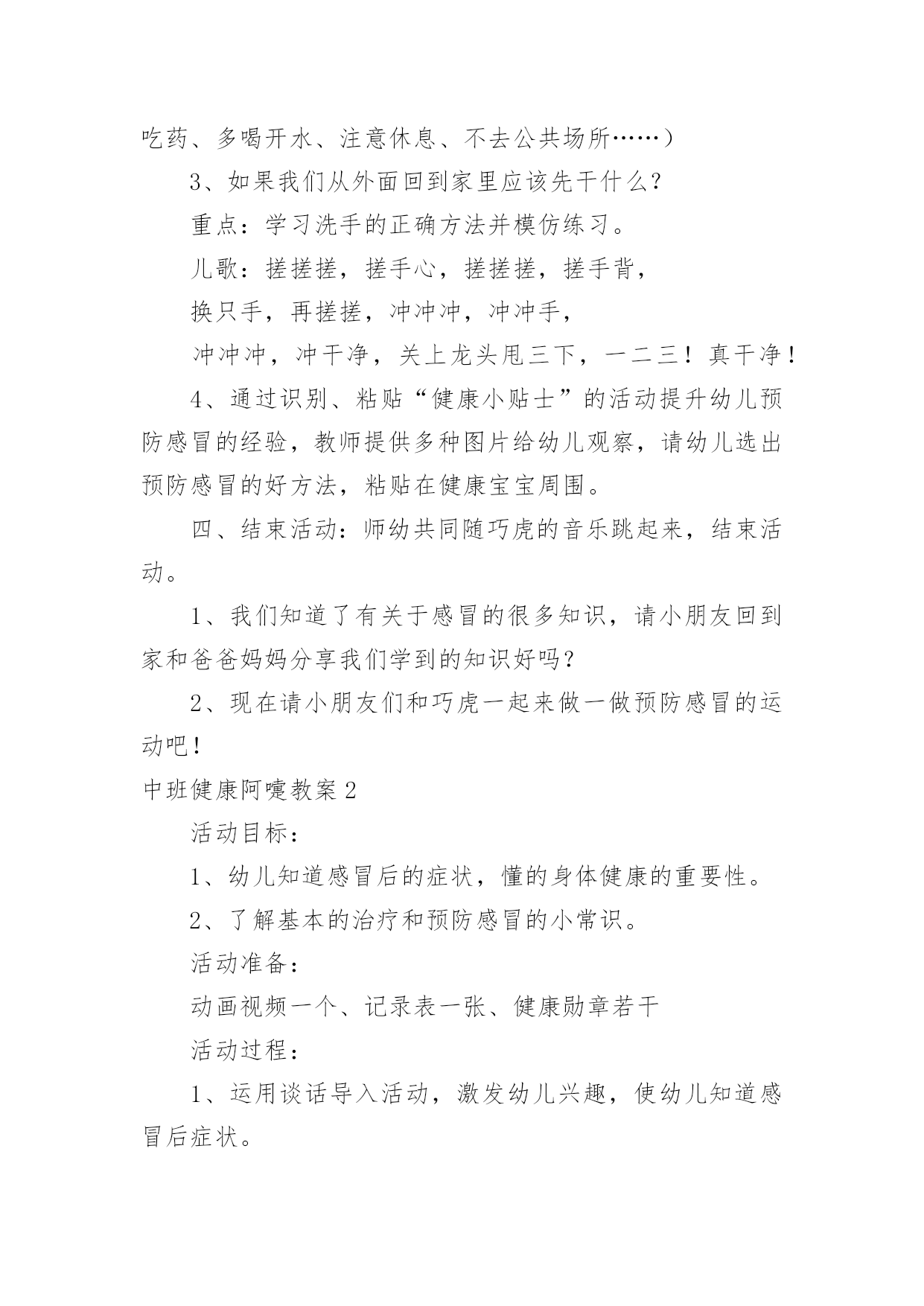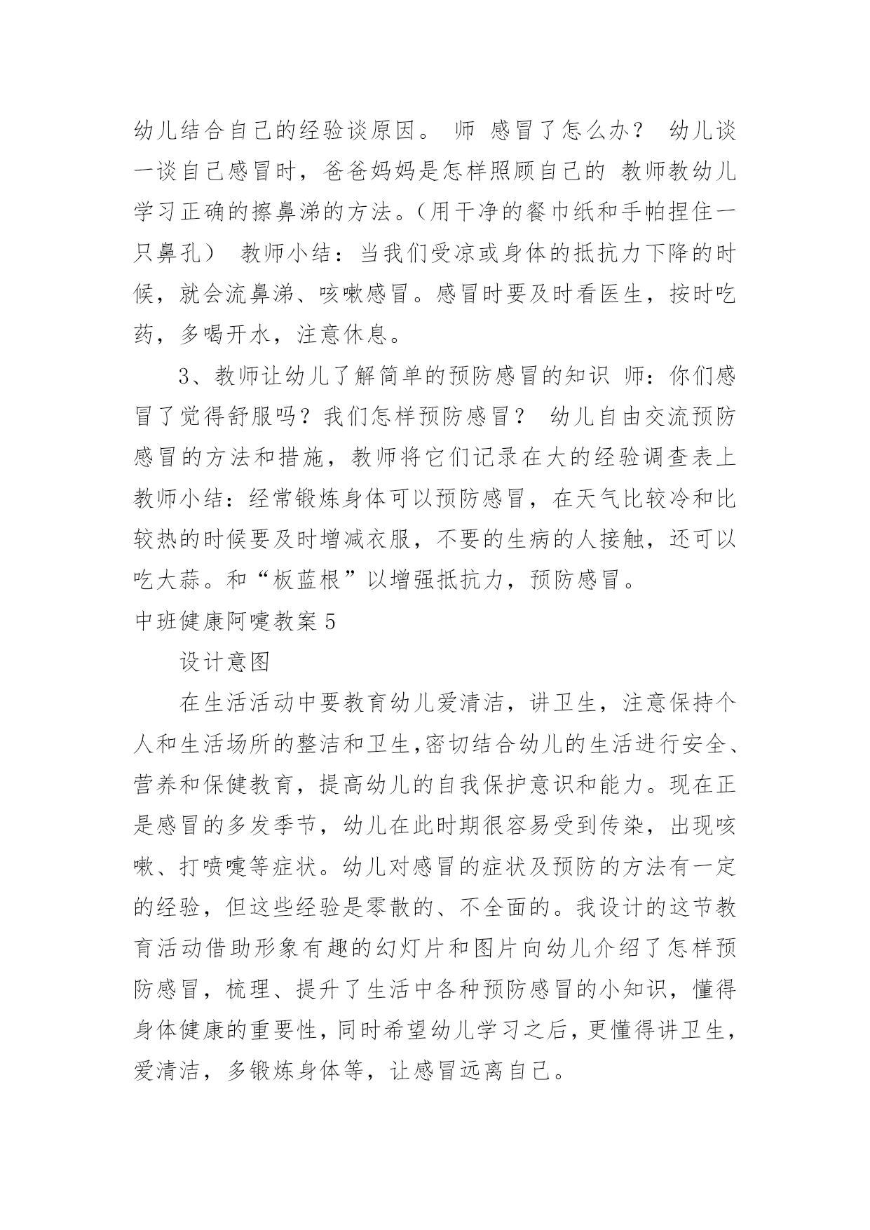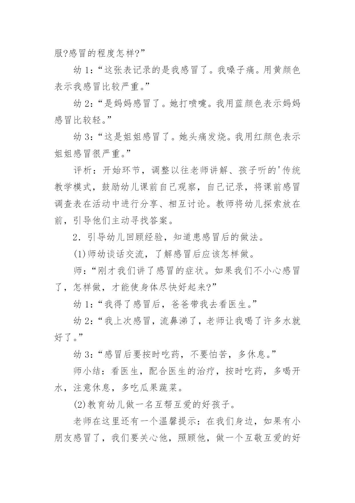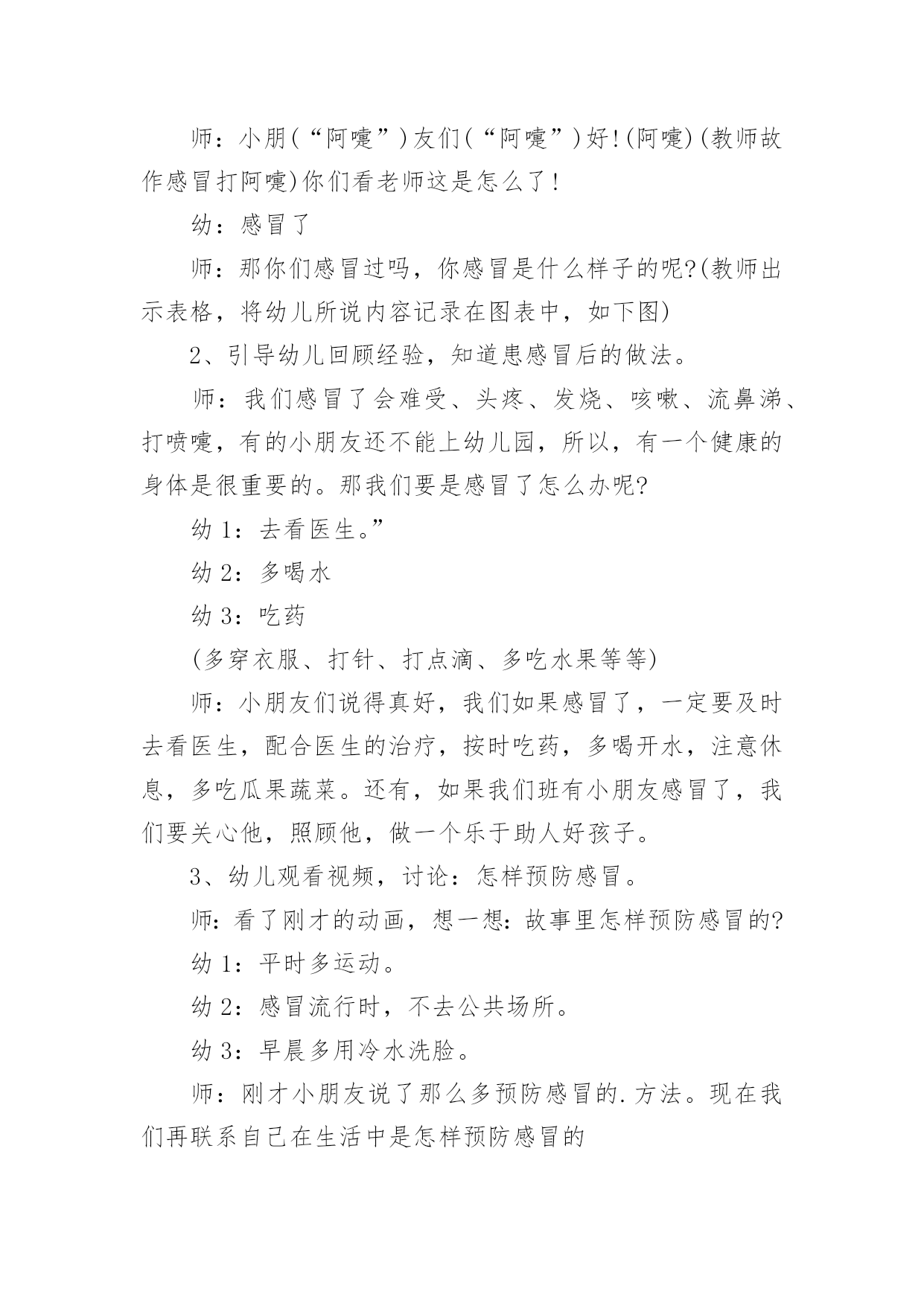 中班健康阿嚏教案中班健康阿嚏教案作为一位优秀的人民教师,往往需要进行教案编写工作,借助教案可以提高教学质量,收到预期的教学效果。那么你有了解过教案吗?以下是小编为大家整理的中班健康阿嚏教案,欢迎大家借鉴与参考,希望对大家有所帮助。中班健康阿嚏教案1活动目标:1、知道感冒了身体很不舒服,懂得身体健康的重要性。2、了解基本的预防感冒的生活小常识。3、培养幼儿养成讲究卫生的良好习惯。活动重点:使幼儿知道感冒后身体很不舒服,懂得身体健康的重要性。活动难点:了解基本的预防感冒的小常识。活动准备:1、小猪图片若干2、教学视频3、预防感冒的歌曲活动过程:一、导入部分:1、听一听这是什么声音?(阿嚏、打喷嚏的声音)2、我们在什么时候打喷嚏?二、基本部分(一)通过创设“小猪”生病的情境引导幼儿了解感冒的主要特征。并且懂得身体健康的重要性。问题:1、我的.小猪生病了?(感冒)2、你们感冒过吗?是怎样感冒的?感冒的时候身体哪里不舒服?(引导幼儿回忆感冒经历,说出感冒症状,教师用图片做归纳展示)3、请你把你感冒时候的特征,贴在小猪的脸上,并来和大家说一说。(请幼儿操作图片)4、请幼儿把操作的图片放到桌子第二层。(二)请幼儿观看故事《阿嚏,阿嚏》(1)故事里谁先感冒了?(小猪)(2)小动物们怎么样了?(被小猪传染了)(3)得了感冒容易打喷嚏,打喷嚏时要怎样做才能不传染别人?(引导幼儿懂得打喷嚏时要用胳膊掩住口鼻,并模仿练习正确的打喷嚏的方法。)三、了解患病后的做法。1、提问:怎样才能不感冒或少感冒?生活中有哪些预防感冒的小窍门?(讲卫生、勤洗手、多锻炼、多喝水、不挑食等)2、如果我们感冒了我们应该怎么做?(看医生、打针、吃药、多喝开水、注意休息、不去公共场所……)3、如果我们从外面回到家里应该先干什么?重点:学习洗手的正确方法并模仿练习。儿歌:搓搓搓,搓手心,搓搓搓,搓手背,换只手,再搓搓,冲冲冲,冲冲手,冲冲冲,冲干净,关上龙头甩三下,一二三!真干净!4、通过识别、粘贴“健康小贴士”的活动提升幼儿预防感冒的经验,教师提供多种图片给幼儿观察,请幼儿选出预防感冒的好方法,粘贴在健康宝宝周围。四、结束活动:师幼共同随巧虎的音乐跳起来,结束活动。1、我们知道了有关于感冒的很多知识,请小朋友回到家和爸爸妈妈分享我们学到的知识好吗?2、现在请小朋友们和巧虎一起来做一做预防感冒的运动吧!中班健康阿嚏教案2活动目标:1、幼儿知道感冒后的症状,懂的身体健康的重要性。2、了解基本的治疗和预防感冒的小常识。活动准备:动画视频一个、记录表一张、健康勋章若干活动过程:1、运用谈话导入活动,激发幼儿兴趣,使幼儿知道感冒后症状。师:小朋(“阿嚏”)友们(“阿嚏”)好!(阿嚏)(教师故作感冒打阿嚏)你们看老师这是怎么了!幼:感冒了师:那你们感冒过吗,你感冒是什么样子的呢?(教师出示表格,将幼儿所说内容记录在图表中,如下图)2、引导幼儿回顾经验,知道患感冒后的做法。师:我们感冒了会难受、头疼、发烧、咳嗽、流鼻涕、打喷嚏,有的小朋友还不能上幼儿园,所以,有一个健康的身体是很重要的。那我们要是感冒了怎么办呢?幼1:去看医生。”幼2:多喝水幼3:吃药(多穿衣服、打针、打点滴、多吃水果等等)师:小朋友们说得真好,我们如果感冒了,一定要及时去看医生,配合医生的治疗,按时吃药,多喝开水,注意休息,多吃瓜果蔬菜。还有,如果我们班有小朋友感冒了,我们要关心他,照顾他,做一个乐于助人好孩子。3、幼儿观看视频,讨论:怎样预防感冒。师:看了刚才的动画,想一想:故事里怎样预防感冒的?幼1:平时多运动。幼2:感冒流行时,不去公共场所。幼3:早晨多用冷水洗脸。师:刚才小朋友说了那么多预防感冒的.方法。现在我们再联系自己在生活中是怎样预防感冒的(幼儿自由发言)师:现在我们知道了,感冒并不可怕,我们要饭前便后洗手,开窗通气,保持空气清新,多运动,戴口罩,多穿衣服。4、户外锻炼,结束活动。师:刚才动画片中的包袱知道我们班的小朋友了解这么多关于感冒的知识,他让老师把这些健康勋章送给小朋友(把勋章贴到每个小朋友身上)好了,我们的健康小卫士要出去活动锻炼了,让我们战队出发,打败病毒,远离感冒吧!Let’sgo!中班健康阿嚏教案3活动目标1、知道人患感冒时的主要症状。2、了解基本的预防和治疗感冒的生活小常识。3、让孩子知道生病了,不怕打针吃药,做个勇敢的孩子。4、知道生病了不怕打针吃药,做个勇敢的孩子。活动准备1、感冒症状记录表。2、请当医生的家长做助教。活动过程1、了解患感冒时的主要症状。(1)请患感冒的幼儿说一说:自己感冒时有什么不舒服?教师边听边做记录,相同的症状要用一样的标记记录,便于幼儿总结。(2)小结:人患感冒时很难受,会打喷嚏、流鼻涕、鼻塞、喉咙干痛、头疼、咳嗽等,有时还会发烧,严重时会导致小朋友不能上幼儿