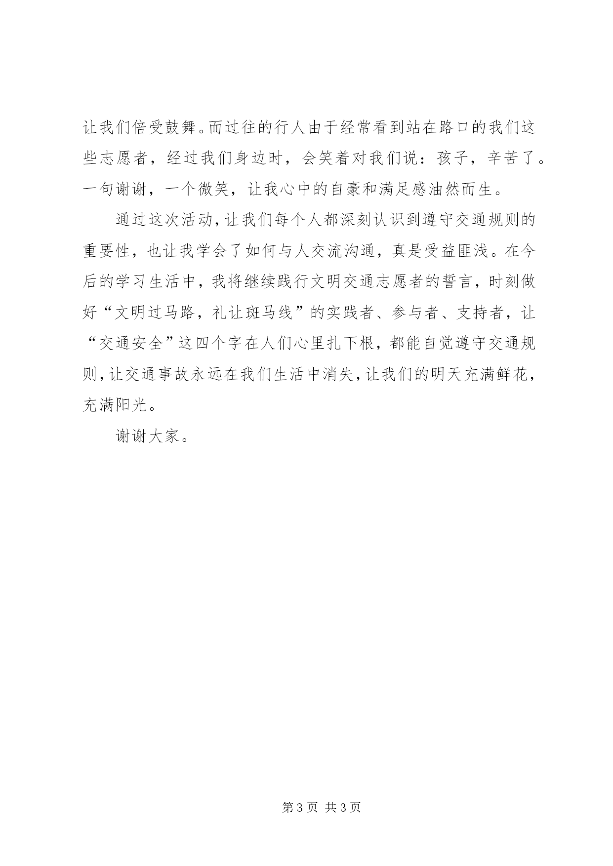 第PAGE\*Arabic\*MERGEFORMAT3页共NUMPAGES\*MERGEFORMAT3页交通安全发言稿下面是我们文秘114的小编给大家推荐的交通安全发言稿供大家参阅。尊敬的各位领导,叔叔阿姨们:大家下午好。我叫xxx,是高级中学的二年三班的学生,作为一名文明交通志愿者,我积极参加“文明过马路,礼让斑马线”主题实践活动。在活动中深刻认识到了文明交通不仅是促进社会城市文明和谐的重要体现,更是维系着每一个家庭的幸福和安宁,今天我想与各位叔叔阿姨共同分享一下我的一点体会。“文明过马路,礼让斑马线”实践活动开始前期,县妇联为我们32名文明交通志愿者订制了统一的志愿者服装、帽子和小红旗,并邀请县交警大队指导员王宝林叔叔针对劝导的方式、指挥手势和非机动车遵守交通信号规定,如何纠正行人不走人行横道等不良交通行为进行了生动的文明交通知识培训。使我们既了解了交通安全知识又掌握了疏导、指挥交通的基本正规动作和操作要领。看着衣服上醒目的志愿者标志,我们每个人的心中都格外激动,大家对即将进行的志愿者工作充满着期待。为了能更好地参与这次活动,我还查找了很多关于安全知识的材料,发现只要提到交通,说到安全,似乎处处都充满着血腥味,看到许多可怕又真实的交通事例,让我更坚定了做好文明交通志愿者的信念和决心。活动启动后,我们分成四组,分别在上下班高峰期协助交警负责长安街、康华街和北大直路等路口处的交通秩序,具体任务是劝导行人不闯红灯,不乱穿马路,引导大家文明行车,安全出行。刚到路口服务的时候,行人车辆的交通文明意识还比较单薄,总能看到一些惊心动魄的场面。例如:早上要送孩子上学,家长为了赶时间,顾不上路灯已经变成了红灯,冒着被车撞的危险骑着摩托车就冲过了路口;有的骑车人为了能快速通过路口,还不等交通指示灯变绿,就将车骑向了路中间;行人不走斑马线,横穿马路现象屡见不鲜;不看红绿灯在车流中随意过马路现象时有发生。对于发生在路口的种种不文明现象,这在以前还没有成为文明志愿者时,我也对此不以为然,而当我成为一名志愿者,在学到交通知识后才意识到,如果行人车辆不遵守交通规则,那埋下的安全隐患是非常可怕的。每次看到不遵守交通文明现象时,我们都积极主动上前劝导,有的市民在听到我们的劝导后能及时改正自己的行为,而有的人最初并不理解我们,瞪着眼睛说我们多管闲事,耽误了他的时间,依然我行我素横穿马路……虽然偶尔会遇到这种情况,但是我们并不气馁,在交警叔叔的指导下依然坚持每天耐心的劝导违规的行人和司机,搀扶爷爷、奶奶过马路,制止小学生在马路上玩耍疯闹。就这样,不知不觉中,路口不遵守交通文明的人少了,这让我们倍受鼓舞。而过往的行人由于经常看到站在路口的我们这些志愿者,经过我们身边时,会笑着对我们说:孩子,辛苦了。一句谢谢,一个微笑,让我心中的自豪和满足感油然而生。通过这次活动,让我们每个人都深刻认识到遵守交通规则的重要性,也让我学会了如何与人交流沟通,真是受益匪浅。在今后的学习生活中,我将继续践行文明交通志愿者的誓言,时刻做好“文明过马路,礼让斑马线”的实践者、参与者、支持者,让“交通安全”这四个字在人们心里扎下根,都能自觉遵守交通规则,让交通事故永远在我们生活中消失,让我们的明天充满鲜花,充满阳光。谢谢大家。