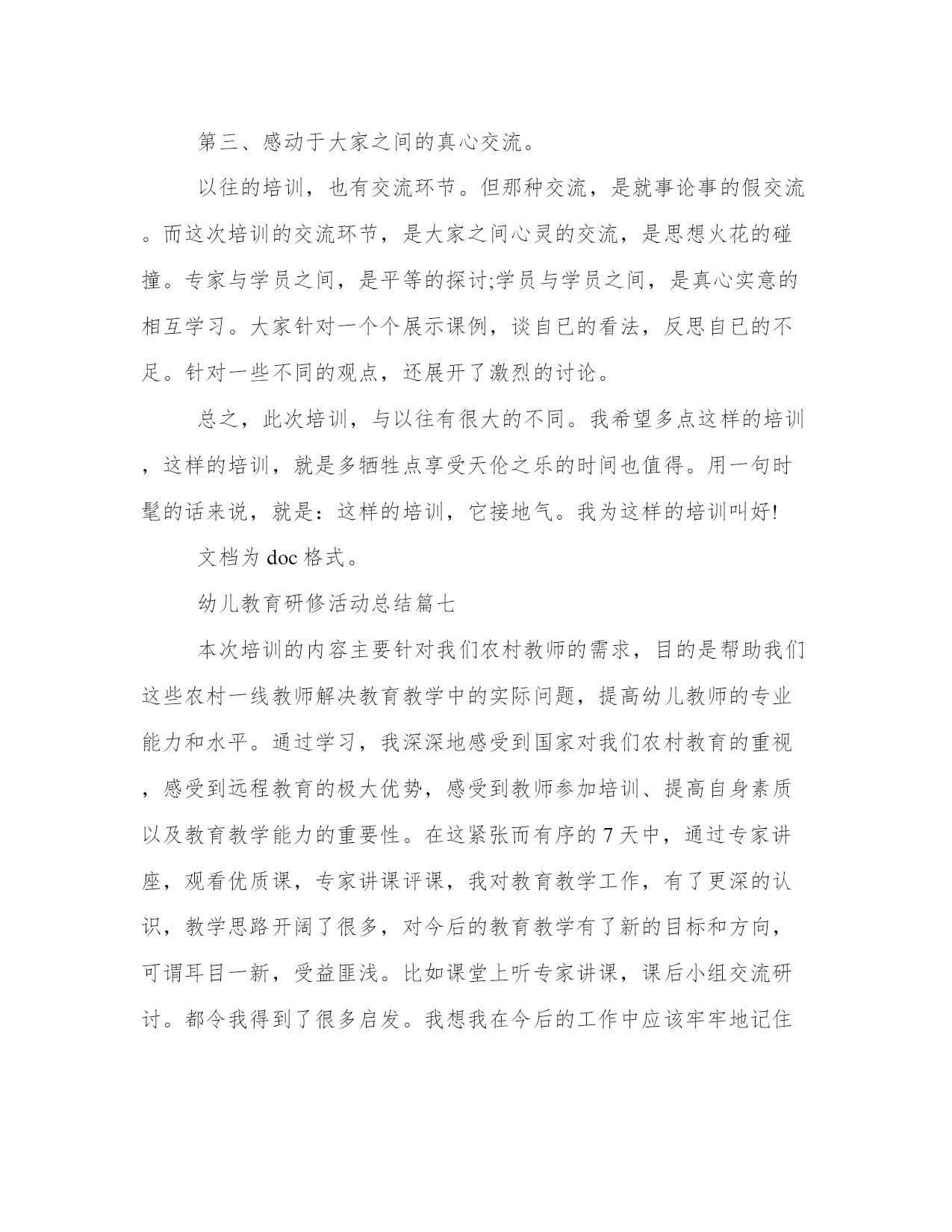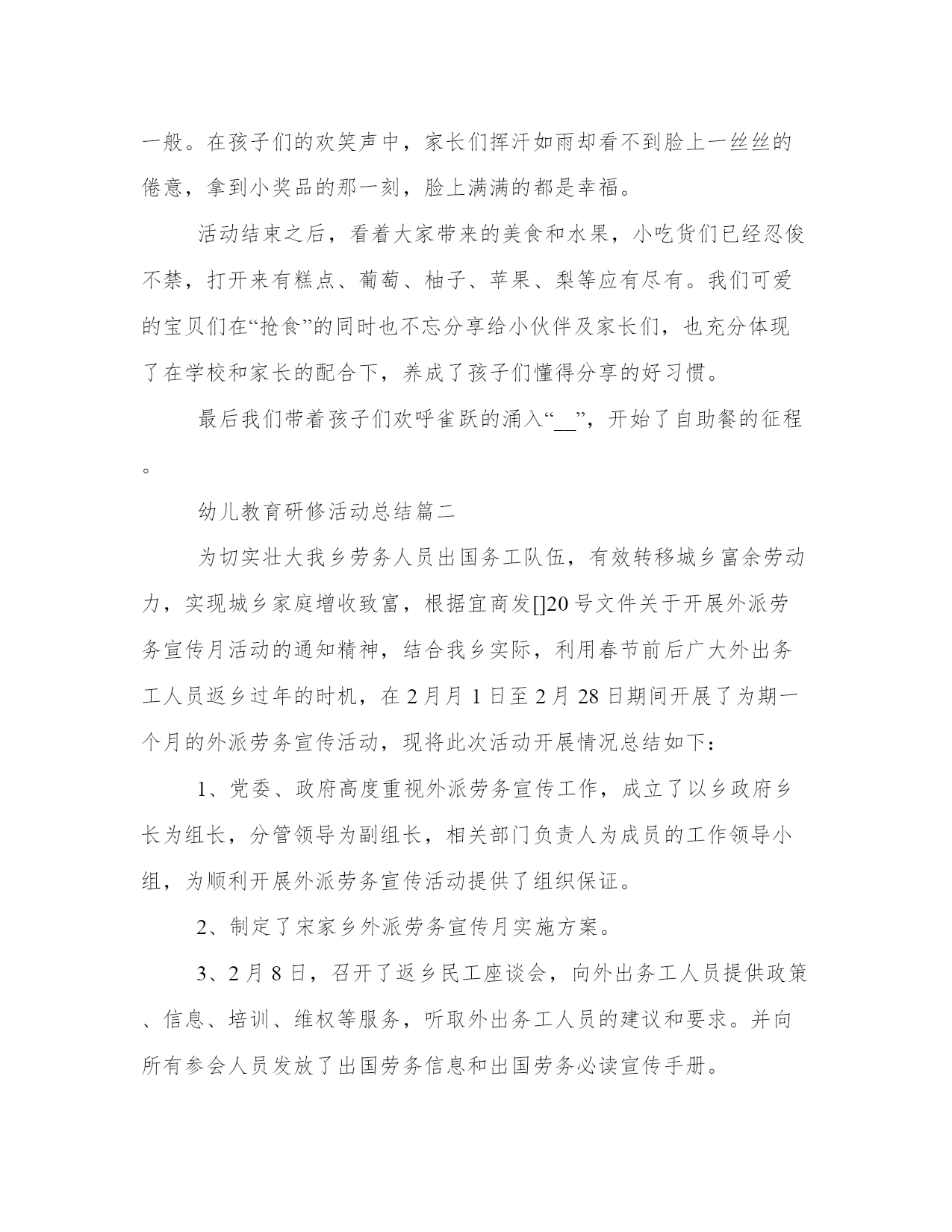 幼儿教育研修活动总结(汇总22篇)写总结可以让我们清晰地看到自己的优势和不足,从而有针对性地改进和提升。写一篇较为完美的总结需要我们能够站在全局的高度思考问题,注重整体的把握。以下是一些经典的总结案例,供大家参考和学习。幼儿教育研修活动总结篇一__年11月16日,我们大一班的孩子们在家长和老师的陪同下,度过了一个难忘而又非常有意义的周末。活动在其乐融融和开心娱乐的氛围中度过。周日秋高气爽、风和日丽,家长和孩子们都神清气爽早早就来到了顺峰山公园,10点钟大家准时集中,看着大家提着各自准备的美食和水果那场面也是醉了!首先和孩子们围起一圈,向孩子们讲述了为什么一年会有四季之分,春夏秋冬又有什么区别。当叫孩子自己举例说说每个季节有什么特点的时候,孩子们欢呼雀跃的争先恐后回答,各种表述玲琅满目:有春天的花、夏天的雨、秋天的落叶、冬天的寒风等等,充分调动了孩子们的积极性,同时也体现了孩子们对生活及大自然的认识。接下来是孩子和家长们亲子活动的环节——背宝贝。家长们早已经摩拳擦掌跃跃欲试了,家长们派上的代表有的是爸爸,有的是妈妈,个个都精神抖擞。妈妈们也巾帼不让须眉,仿佛是一场爱的拉力赛一般。在孩子们的欢笑声中,家长们挥汗如雨却看不到脸上一丝丝的倦意,拿到小奖品的那一刻,脸上满满的都是幸福。活动结束之后,看着大家带来的美食和水果,小吃货们已经忍俊不禁,打开来有糕点、葡萄、柚子、苹果、梨等应有尽有。我们可爱的宝贝们在“抢食”的同时也不忘分享给小伙伴及家长们,也充分体现了在学校和家长的配合下,养成了孩子们懂得分享的好习惯。最后我们带着孩子们欢呼雀跃的涌入“__”,开始了自助餐的征程。幼儿教育研修活动总结篇二为切实壮大我乡劳务人员出国务工队伍,有效转移城乡富余劳动力,实现城乡家庭增收致富,根据宜商发[]20号文件关于开展外派劳务宣传月活动的通知精神,结合我乡实际,利用春节前后广大外出务工人员返乡过年的时机,在2月月1日至2月28日期间开展了为期一个月的外派劳务宣传活动,现将此次活动开展情况总结如下:1、党委、政府高度重视外派劳务宣传工作,成立了以乡政府乡长为组长,分管领导为副组长,相关部门负责人为成员的工作领导小组,为顺利开展外派劳务宣传活动提供了组织保证。2、制定了宋家乡外派劳务宣传月实施方案。3、2月8日,召开了返乡民工座谈会,向外出务工人员提供政策、信息、培训、维权等服务,听取外出务工人员的建议和要求。并向所有参会人员发放了出国劳务信息和出国劳务必读宣传手册。4、充分利用广播电视、会议、墙报、标语、设立咨询点、免费发放各种宣传资料等手段,开展形式多样的宣传活动。此次活动共免费发放就业再就业政策、外派信息、慰问信、出国务工手册、维权手册、免费培训资料等共500多份,接受出国劳务咨询15人次。此次宣传咨询活动,大力宣传外派劳务的目的意义,使广大群众了解国家关于出国劳务的规定、程序和注意事项,防止上当受骗,更好地维护自身的合法权利。通过此次宣传月活动的开展,切实转变了劳务人员的思想观念,消除了顾虑,使部份以前不愿出国务工的人员愿意出国务工挣钱,创业致富。统一了全乡各级干部对外派劳务工作的认识,增强了责任感,为我乡外派劳务工作营造了一个良好的社会氛围,本次活动深受广大群众的欢迎,也达到了预期目的,为促进我乡外派劳务工作的开展、带动地方经济发展、完成上级下达给我乡的外派劳务目标任务奠定了基础。幼儿教育研修活动总结篇三本学期,我们以参评宁波市星级教研组为契机,充分整合了各方面的优质资源。我们在组织校本研修活动中充分考虑教师的主体性,立足教师的需求,发现教师的优点,并搭建平台促进教师间的相互学习与提高。本学期,校本研修仍旧按着一个主题四个阶段的常规模式进行展开。我们重点抓了市小学语文名师学科主题研修展示活动和浙江省实验学校城乡互助共同体“奋进之星”课堂教学展示评比活动,这两个活动分别由我们学校的副校长吕龙飞老师和副教导葛杨杰老师承担。虽然没有非常明显的四个阶段,但中间的磨课过程非常具体,使很多老师都从中有收获。像吕老师的珍珠鸟一课,针对组内正在分析的略读课文“四环”教学有效性的实践分析课题,尝试了略读课文的批注式教学,磨课教师对其“初读、批注、汇报、点拨”四个教学环节展开了激烈的思维碰撞,大家在交流研讨中共同探索,卓有成效。又如葛老师的难忘的一课,几番探索,几度重来,几乎所有的'老师都参与了磨课这一过程。这样以点带面的培训方式,还是收到了很好的效果。幼儿教育研修活动总结篇四xx月xx日xx月xx日,我参加了“命好题(有效评价)”校本培训活动。正值酷暑之际,又当休息之时,虽然辛苦,但是却和大家一样,感觉充实、快乐,因为收获颇多。钱志亮教授的视屏讲座有效课堂哪儿来——兼论怎样上好一节课,给我留下了深刻的印象。他从概念