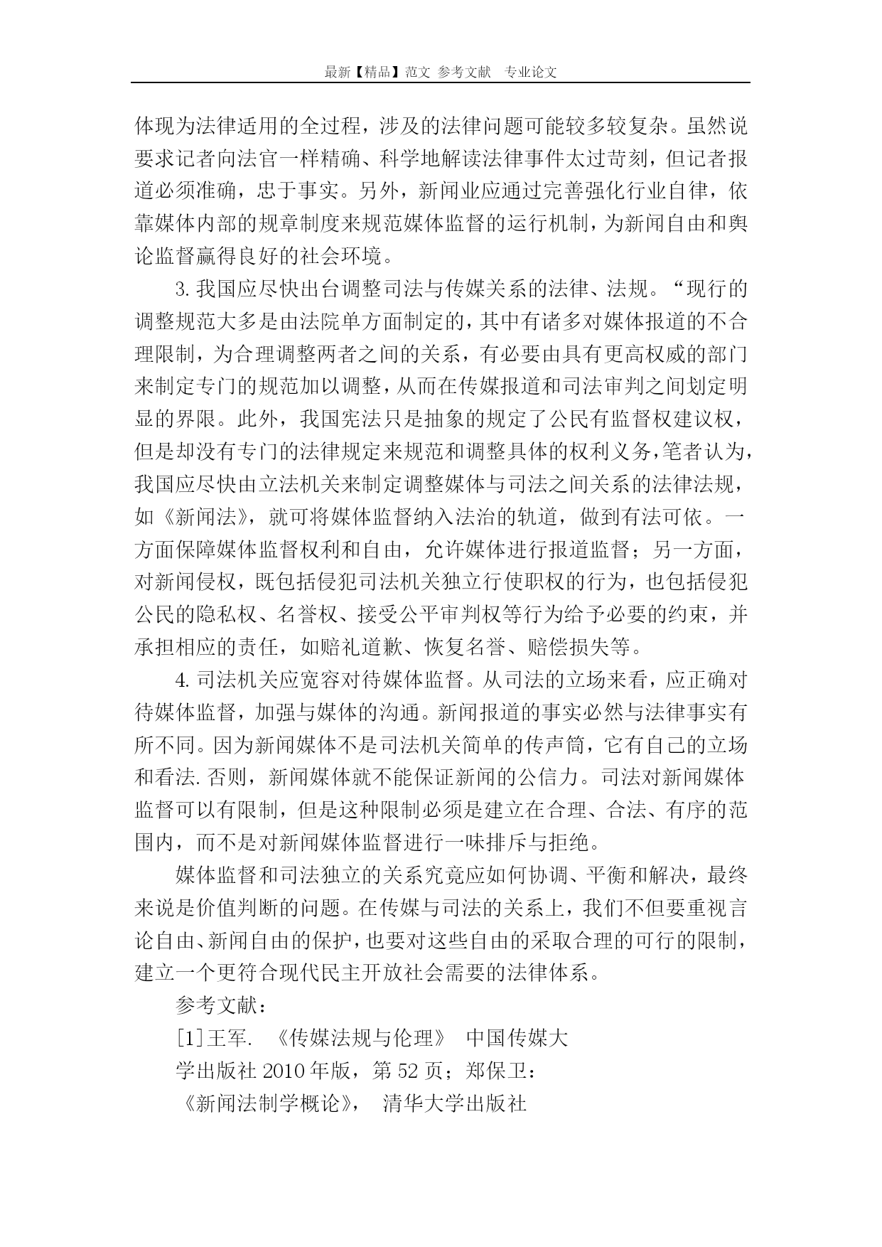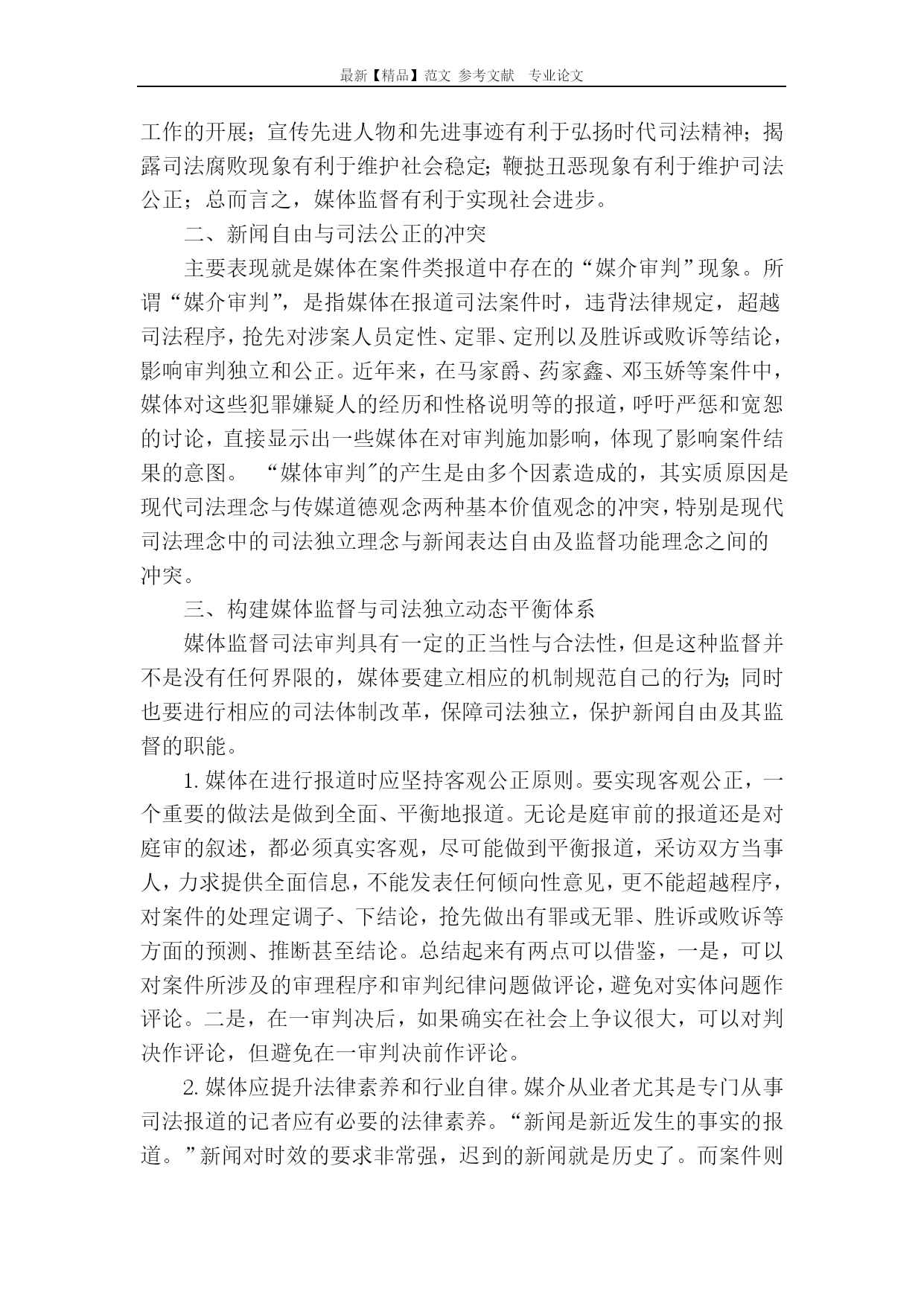 最新【精品】范文参考文献专业论文浅析媒体监督与司法独立浅析媒体监督与司法独立[摘要]媒体监督与司法独立实际上是宪法赋予公民的两种基本权利的不同表达,二者在现阶段表现出诸多冲突。为此,我国应当采取有效措施对媒体监督和司法独立之间的紧张关系进行权衡,明确界线,将冲突转化为平衡与默契。[关键词]媒体监督;司法独立;平衡体系广播电视、网络、报纸杂志等传媒在现代生活中的重要性显然而意见,以至于被人称为“第四种权力”,以区别于立法、行政、司法三权。而司法被认为是维护社会公正的“最后一道屏障”,在实施依法治国的进程中,司法不公、司法腐败现象以及诸多个案等历来受到传媒较多的关注。新闻报道、舆论监督是社会公众获取信息、表达意愿的主要渠道,也是传媒自身的生存法则;而司法独立又是审判的内在要求。媒体监督与司法独立如何在依法治国的过程中保持一种动态的平衡应该是一个引起关注的问题。一、媒体监督与司法独立的良性互动关系其实无论是媒体监督也好,还是司法独立也罢,二者的最终价值都在于追求社会正义。媒体发挥其舆论导向作用,对司法活动的积极评价能够拓展和强化司法行为的社会效果,树立司法机关的良好形象,推进中国的法治进程;其对司法行为的正当的评价则会引导公众对司法机构施加强大的舆论压力,促使不公正的司法行为得到及时的纠正,起到一种纠错的作用,与此同时对司法机关滥用职权、损害司法公正的行为起到一种预防的作用。也正是媒体的这种巨大舆论导向力使其具备了监督社会监督司法的能力。媒体通过对司法行为的报道论说及评价,发挥其预防与纠错的功效,客观上起着一种正面的监督与警示的作用。司法界需要媒体监督,媒体监督有利于司法公正的实现和司法权威的树立,他们希望通过媒体的有效的合法性监督来提高自己的业务素质,树立自身良好的社会形象。媒体报道法院工作有利于促进审判工作的开展;宣传先进人物和先进事迹有利于弘扬时代司法精神;揭露司法腐败现象有利于维护社会稳定;鞭挞丑恶现象有利于维护司法公正;总而言之,媒体监督有利于实现社会进步。二、新闻自由与司法公正的冲突主要表现就是媒体在案件类报道中存在的“媒介审判”现象。所谓“媒介审判”,是指媒体在报道司法案件时,违背法律规定,超越司法程序,抢先对涉案人员定性、定罪、定刑以及胜诉或败诉等结论,影响审判独立和公正。近年来,在马家爵、药家鑫、邓玉娇等案件中,媒体对这些犯罪嫌疑人的经历和性格说明等的报道,呼吁严惩和宽恕的讨论,直接显示出一些媒体在对审判施加影响,体现了影响案件结果的意图。“媒体审判"的产生是由多个因素造成的,其实质原因是现代司法理念与传媒道德观念两种基本价值观念的冲突,特别是现代司法理念中的司法独立理念与新闻表达自由及监督功能理念之间的冲突。三、构建媒体监督与司法独立动态平衡体系媒体监督司法审判具有一定的正当性与合法性,但是这种监督并不是没有任何界限的,媒体要建立相应的机制规范自己的行为;同时也要进行相应的司法体制改革,保障司法独立,保护新闻自由及其监督的职能。1.媒体在进行报道时应坚持客观公正原则。要实现客观公正,一个重要的做法是做到全面、平衡地报道。无论是庭审前的报道还是对庭审的叙述,都必须真实客观,尽可能做到平衡报道,采访双方当事人,力求提供全面信息,不能发表任何倾向性意见,更不能超越程序,对案件的处理定调子、下结论,抢先做出有罪或无罪、胜诉或败诉等方面的预测、推断甚至结论。总结起来有两点可以借鉴,一是,可以对案件所涉及的审理程序和审判纪律问题做评论,避免对实体问题作评论。二是,在一审判决后,如果确实在社会上争议很大,可以对判决作评论,但避免在一审判决前作评论。2.媒体应提升法律素养和行业自律。媒介从业者尤其是专门从事司法报道的记者应有必要的法律素养。“新闻是新近发生的事实的报道。”新闻对时效的要求非常强,迟到的新闻就是历史了。而案件则体现为法律适用的全过程,涉及的法律问题可能较多较复杂。虽然说要求记者向法官一样精确、科学地解读法律事件太过苛刻,但记者报道必须准确,忠于事实。另外,新闻业应通过完善强化行业自律,依靠媒体内部的规章制度来规范媒体监督的运行机制,为新闻自由和舆论监督赢得良好的社会环境。3.我国应尽快出台调整司法与传媒关系的法律、法规。“现行的调整规范大多是由法院单方面制定的,其中有诸多对媒体报道的不合理限制,为合理调整两者之间的关系,有必要由具有更高权威的部门来制定专门的规范加以调整,从而在传媒报道和司法审判之间划定明显的界限。此外,我国宪法只是抽象的规定了公民有监督权建议权,但是却没有专门的法律规定来规范和调整具体的权利义务,笔者认为,我国应尽快由立法机关来制定调整媒体与司法之间关系的法律法规,如《新闻法》,就可将媒体监督纳入法治的轨道,做到有法可依。一方面保障媒体监督权利和自由,允许媒体进