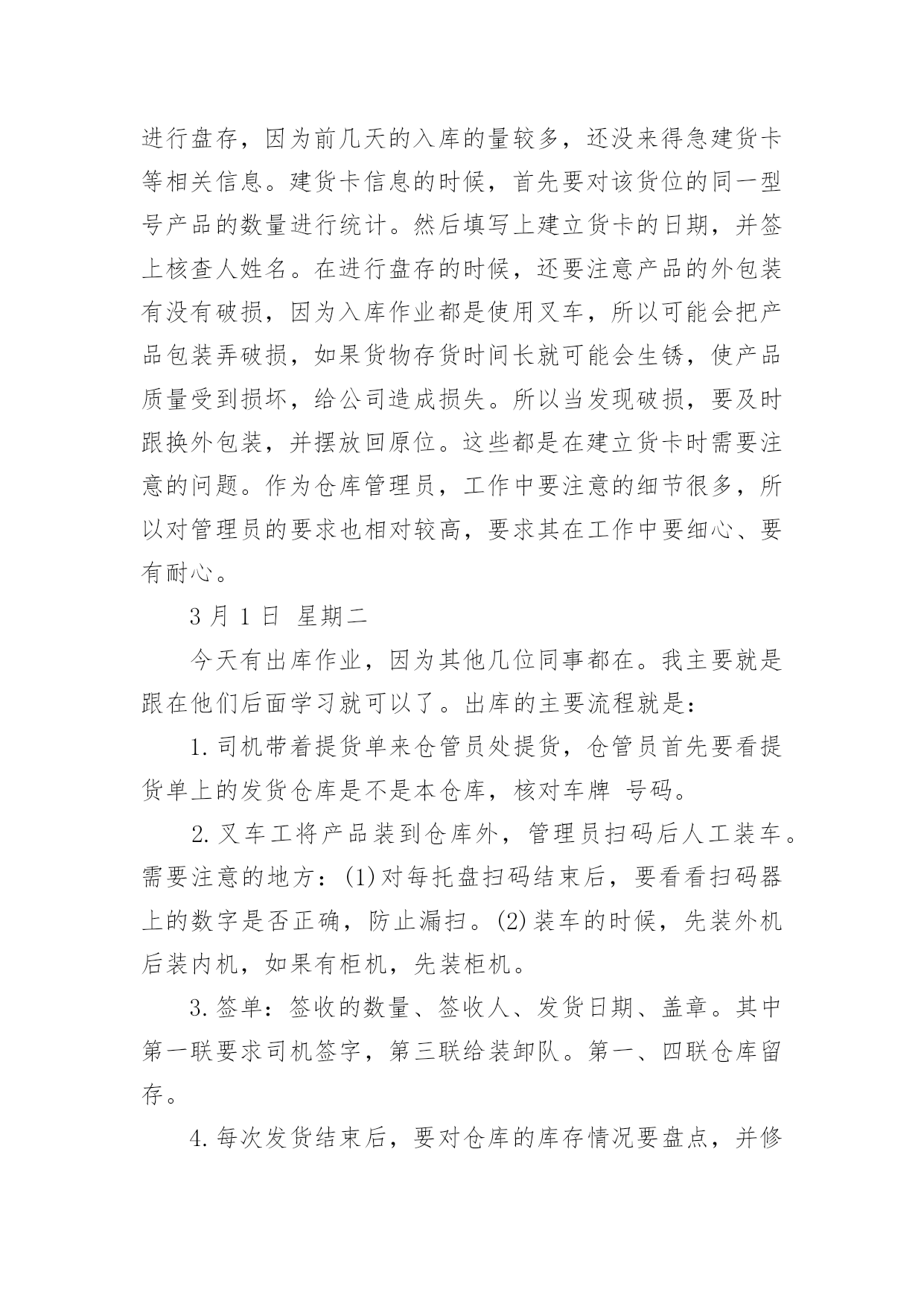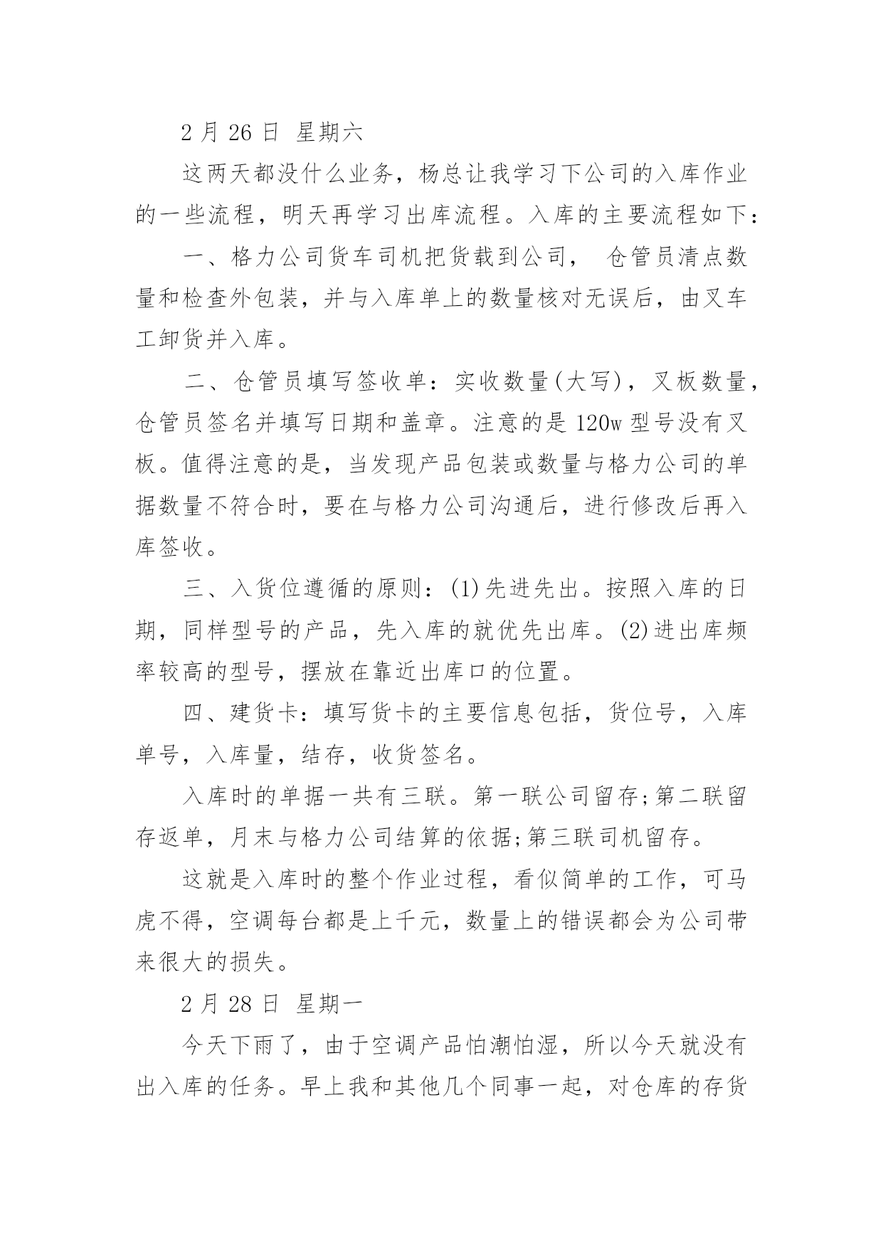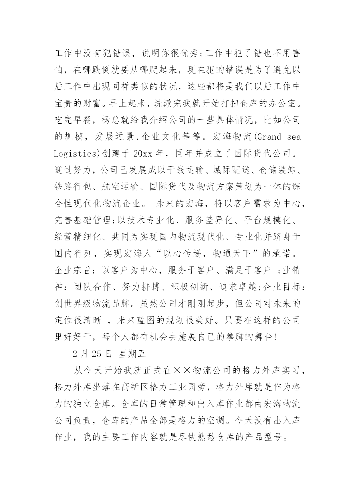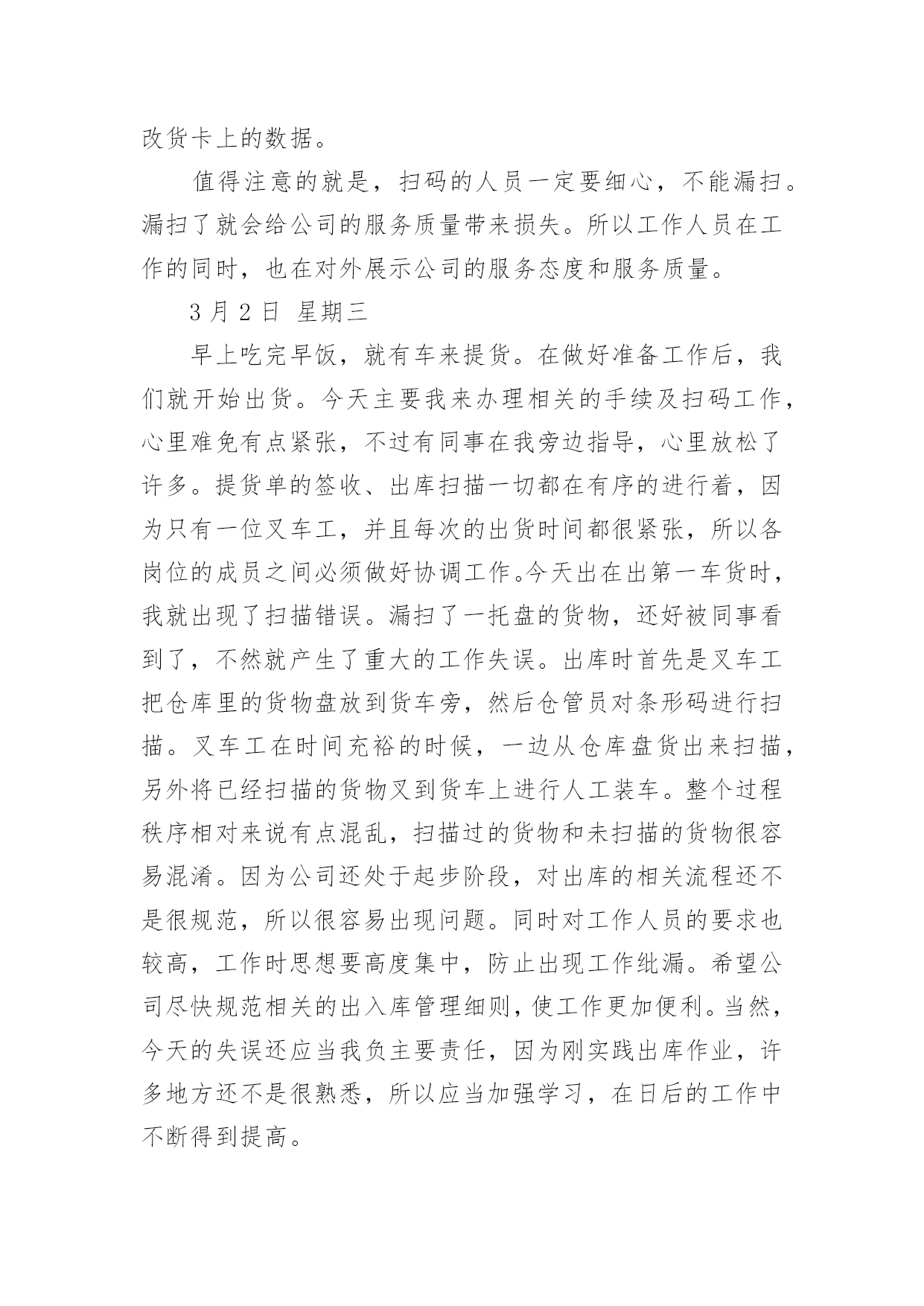 物流实习日记物流实习日记四篇物流实习日记篇12月23日星期三今天对我来说是不平凡的一天,因为是我已经开始工作了。这也算是离开校园生活,踏入社会的一个新的起点吧。尽管杨总说早上来接我,但我还是自己坚持坐公交过去。虽然交通不是很方便,要转3次公交。来到仓库,我收拾了下自己的行李,然后杨总陪我在仓库里转了转,并向我介绍了公司的一些情况,以及未来的发展规划。××物流有限责任公司的发展正处于起步阶段,公司的各项规章制度和基础的一些配套设施还不是很完善,员工的住宿条件等都有待改善。宏海的发展眼光很独特,公司目前的业务主要是给格力、京东方、联合利华、美的等知名的大型企业做库存管理,我所在的实习库区,就是格力的外库。格力外库坐落于格力工业园旁,外库的主要业务是对工厂生产的产品的入库和出库作业。虽然这边的条件比较艰苦,但我愿意挑战自我,从最基础的工作做起,脚踏实地完成每项工作!2月24日星期四第一天正式上班,心里难免有些激动,因为我已经这是踏入工作岗位了,同时也有些紧张,担心自己的工作做不好。我告诉自己,没有谁在刚刚参加工作的时候,是一帆风顺的。工作中没有犯错误,说明你很优秀;工作中犯了错也不用害怕,在哪跌倒就要从哪爬起来,现在犯的错误是为了避免以后工作中出现同样类似的状况,这些都将是我们以后工作中宝贵的财富。早上起来,洗漱完我就开始打扫仓库的办公室。吃完早餐,杨总就给我介绍公司的一些具体情况,比如公司的规模,发展远景,企业文化等等。宏海物流(GrandseaLogistics)创建于20xx年,同年并成立了国际货代公司。通过努力,公司已发展成以干线运输、城际配送、仓储装卸、铁路行包、航空运输、国际货代及物流方案策划为一体的综合性现代化物流企业。未来的宏海,将以客户需求为中心,完善基础管理;以技术专业化、服务差异化、平台规模化、经营精细化、共同为实现国内物流现代化、专业化并跻身于国内行列,实现宏海人“以心传递,物通天下”的承诺。企业宗旨:以客户为中心,服务于客户、满足于客户;业精神:团队合作、努力拼搏、积极创新、追求卓越;企业目标:创世界级物流品牌。虽然公司才刚刚起步,但公司对未来的定位很清晰,未来蓝图的规划很美好。只要在这样的公司里好好干,每个人都有机会去施展自己的拳脚的舞台!2月25日星期五从今天开始我就正式在××物流公司的格力外库实习,格力外库坐落在高新区格力工业园旁,格力外库就是作为格力的独立仓库。仓库的日常管理和出入库作业都由宏海物流公司负责,仓库的产品全部是格力的空调。今天没有出入库作业,我的主要工作内容就是尽快熟悉仓库的产品型号。2月26日星期六这两天都没什么业务,杨总让我学习下公司的入库作业的一些流程,明天再学习出库流程。入库的主要流程如下:一、格力公司货车司机把货载到公司,仓管员清点数量和检查外包装,并与入库单上的数量核对无误后,由叉车工卸货并入库。二、仓管员填写签收单:实收数量(大写),叉板数量,仓管员签名并填写日期和盖章。注意的是120w型号没有叉板。值得注意的是,当发现产品包装或数量与格力公司的单据数量不符合时,要在与格力公司沟通后,进行修改后再入库签收。三、入货位遵循的原则:(1)先进先出。按照入库的日期,同样型号的产品,先入库的就优先出库。(2)进出库频率较高的型号,摆放在靠近出库口的位置。四、建货卡:填写货卡的主要信息包括,货位号,入库单号,入库量,结存,收货签名。入库时的单据一共有三联。第一联公司留存;第二联留存返单,月末与格力公司结算的依据;第三联司机留存。这就是入库时的整个作业过程,看似简单的工作,可马虎不得,空调每台都是上千元,数量上的错误都会为公司带来很大的损失。2月28日星期一今天下雨了,由于空调产品怕潮怕湿,所以今天就没有出入库的任务。早上我和其他几个同事一起,对仓库的存货进行盘存,因为前几天的入库的量较多,还没来得急建货卡等相关信息。建货卡信息的时候,首先要对该货位的同一型号产品的数量进行统计。然后填写上建立货卡的日期,并签上核查人姓名。在进行盘存的时候,还要注意产品的外包装有没有破损,因为入库作业都是使用叉车,所以可能会把产品包装弄破损,如果货物存货时间长就可能会生锈,使产品质量受到损坏,给公司造成损失。所以当发现破损,要及时跟换外包装,并摆放回原位。这些都是在建立货卡时需要注意的问题。作为仓库管理员,工作中要注意的细节很多,所以对管理员的要求也相对较高,要求其在工作中要细心、要有耐心。3月1日星期二今天有出库作业,因为其他几位同事都在。我主要就是跟在他们后面学习就可以了。出库的主要流程就是:1.司机带着提货单来仓管员处提货,仓管员首先要看提货单上的发货仓库是不是本仓库,核对车牌号码。2.叉车工将产品装到仓库外,管理员扫码后人工装车。需要注意的地方:(1)对每托盘扫码结束后,要看看扫码器上的数