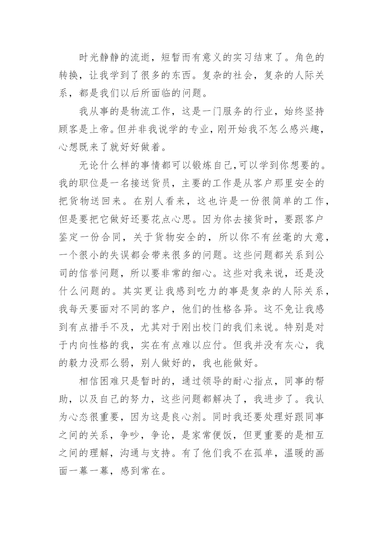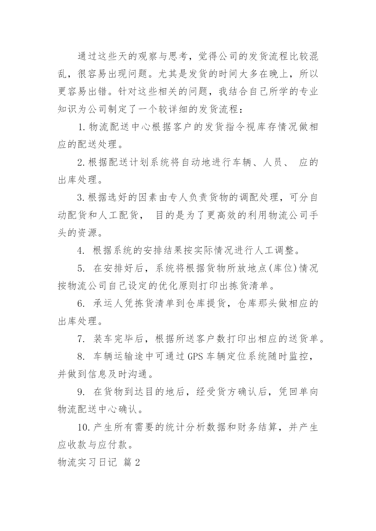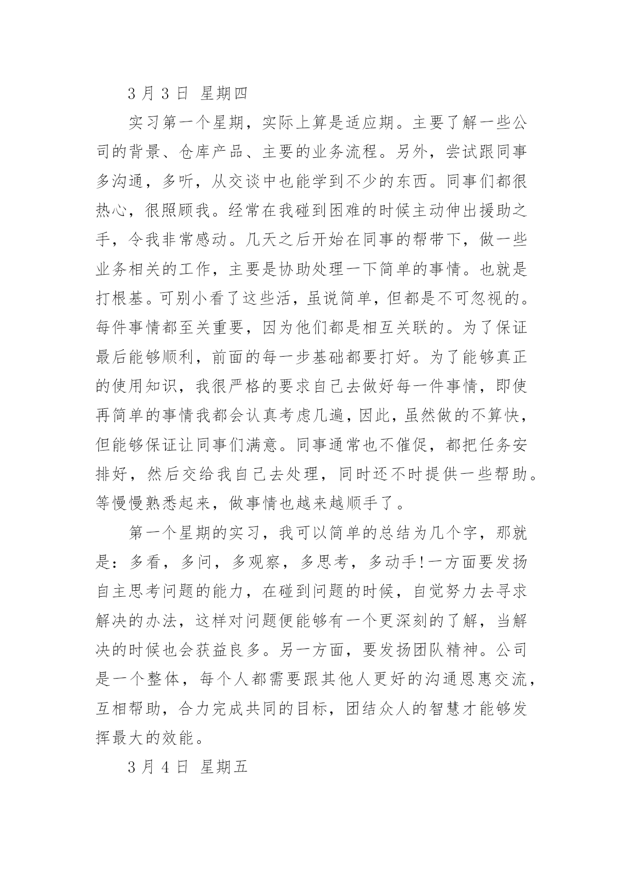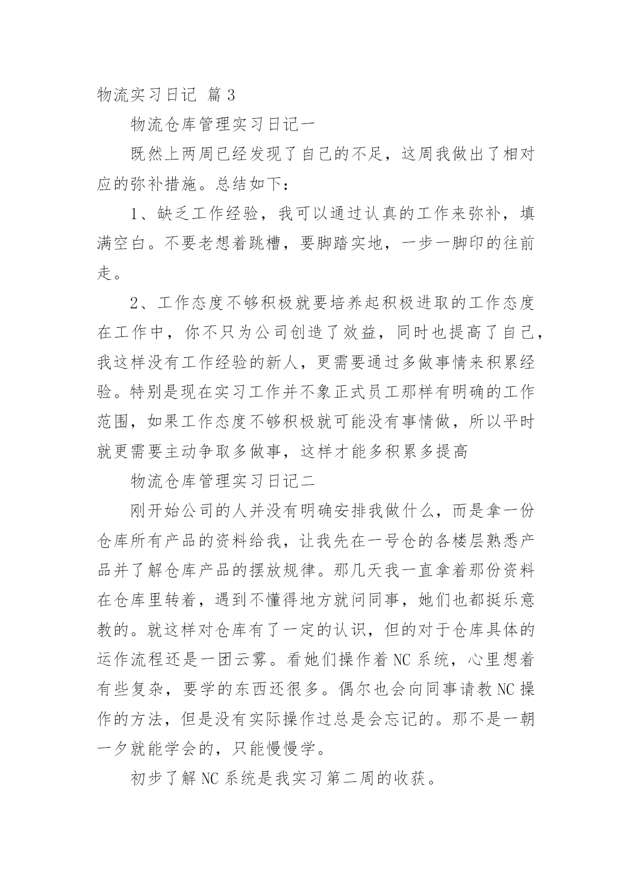 物流实习日记物流实习日记四篇物流实习日记篇12月23日星期三今天对我来说是不平凡的一天,因为是我已经开始工作了。这也算是离开校园生活,踏入社会的一个新的起点吧。尽管杨总说早上来接我,但我还是自己坚持坐公交过去。虽然交通不是很方便,要转3次公交。来到仓库,我收拾了下自己的行李,然后杨总陪我在仓库里转了转,并向我介绍了公司的一些情况,以及未来的发展规划。××物流有限责任公司的发展正处于起步阶段,公司的各项规章制度和基础的一些配套设施还不是很完善,员工的住宿条件等都有待改善。宏海的发展眼光很独特,公司目前的业务主要是给格力、京东方、联合利华、美的等知名的大型企业做库存管理,我所在的实习库区,就是格力的外库。格力外库坐落于格力工业园旁,外库的主要业务是对工厂生产的产品的入库和出库作业。虽然这边的条件比较艰苦,但我愿意挑战自我,从最基础的工作做起,脚踏实地完成每项工作!2月24日星期四第一天正式上班,心里难免有些激动,因为我已经这是踏入工作岗位了,同时也有些紧张,担心自己的工作做不好。我告诉自己,没有谁在刚刚参加工作的时候,是一帆风顺的。工作中没有犯错误,说明你很优秀;工作中犯了错也不用害怕,在哪跌倒就要从哪爬起来,现在犯的错误是为了避免以后工作中出现同样类似的状况,这些都将是我们以后工作中宝贵的财富。早上起来,洗漱完我就开始打扫仓库的办公室。吃完早餐,杨总就给我介绍公司的一些具体情况,比如公司的规模,发展远景,企业文化等等。宏海物流(GrandseaLogistics)创建于20xx年,同年并成立了国际货代公司。通过努力,公司已发展成以干线运输、城际配送、仓储装卸、铁路行包、航空运输、国际货代及物流方案策划为一体的综合性现代化物流企业。未来的宏海,将以客户需求为中心,完善基础管理;以技术专业化、服务差异化、平台规模化、经营精细化、共同为实现国内物流现代化、专业化并跻身于国内行列,实现宏海人“以心传递,物通天下”的承诺。企业宗旨:以客户为中心,服务于客户、满足于客户;业精神:团队合作、努力拼搏、积极创新、追求卓越;企业目标:创世界级物流品牌。虽然公司才刚刚起步,但公司对未来的定位很清晰,未来蓝图的规划很美好。只要在这样的公司里好好干,每个人都有机会去施展自己的拳脚的舞台!2月25日星期五从今天开始我就正式在××物流公司的格力外库实习,格力外库坐落在高新区格力工业园旁,格力外库就是作为格力的独立仓库。仓库的日常管理和出入库作业都由宏海物流公司负责,仓库的产品全部是格力的空调。今天没有出入库作业,我的主要工作内容就是尽快熟悉仓库的产品型号。2月26日星期六这两天都没什么业务,杨总让我学习下公司的入库作业的一些流程,明天再学习出库流程。入库的主要流程如下:一、格力公司货车司机把货载到公司,仓管员清点数量和检查外包装,并与入库单上的数量核对无误后,由叉车工卸货并入库。二、仓管员填写签收单:实收数量(大写),叉板数量,仓管员签名并填写日期和盖章。注意的是120w型号没有叉板。值得注意的是,当发现产品包装或数量与格力公司的单据数量不符合时,要在与格力公司沟通后,进行修改后再入库签收。三、入货位遵循的原则:(1)先进先出。按照入库的日期,同样型号的产品,先入库的就优先出库。(2)进出库频率较高的型号,摆放在靠近出库口的位置。四、建货卡:填写货卡的主要信息包括,货位号,入库单号,入库量,结存,收货签名。入库时的单据一共有三联。第一联公司留存;第二联留存返单,月末与格力公司结算的依据;第三联司机留存。这就是入库时的整个作业过程,看似简单的工作,可马虎不得,空调每台都是上千元,数量上的错误都会为公司带来很大的损失。2月28日星期一今天下雨了,由于空调产品怕潮怕湿,所以今天就没有出入库的任务。早上我和其他几个同事一起,对仓库的存货进行盘存,因为前几天的入库的量较多,还没来得急建货卡等相关信息。建货卡信息的时候,首先要对该货位的同一型号产品的数量进行统计。然后填写上建立货卡的日期,并签上核查人姓名。在进行盘存的时候,还要注意产品的外包装有没有破损,因为入库作业都是使用叉车,所以可能会把产品包装弄破损,如果货物存货时间长就可能会生锈,使产品质量受到损坏,给公司造成损失。所以当发现破损,要及时跟换外包装,并摆放回原位。这些都是在建立货卡时需要注意的问题。作为仓库管理员,工作中要注意的细节很多,所以对管理员的要求也相对较高,要求其在工作中要细心、要有耐心。3月1日星期二今天有出库作业,因为其他几位同事都在。我主要就是跟在他们后面学习就可以了。出库的主要流程就是:1.司机带着提货单来仓管员处提货,仓管员首先要看提货单上的发货仓库是不是本仓库,核对车牌号码。2.叉车工将产品装到仓库外,管理员扫码后人工装车。需要注意的地方:(1)对每托盘扫码结束后,要看看扫码器上的数