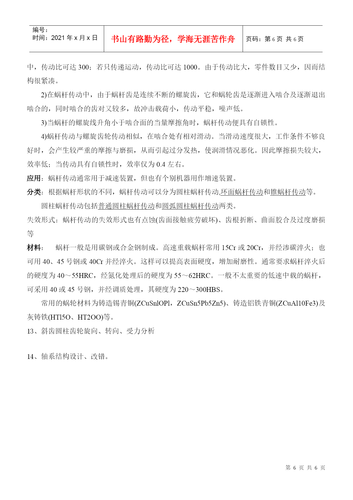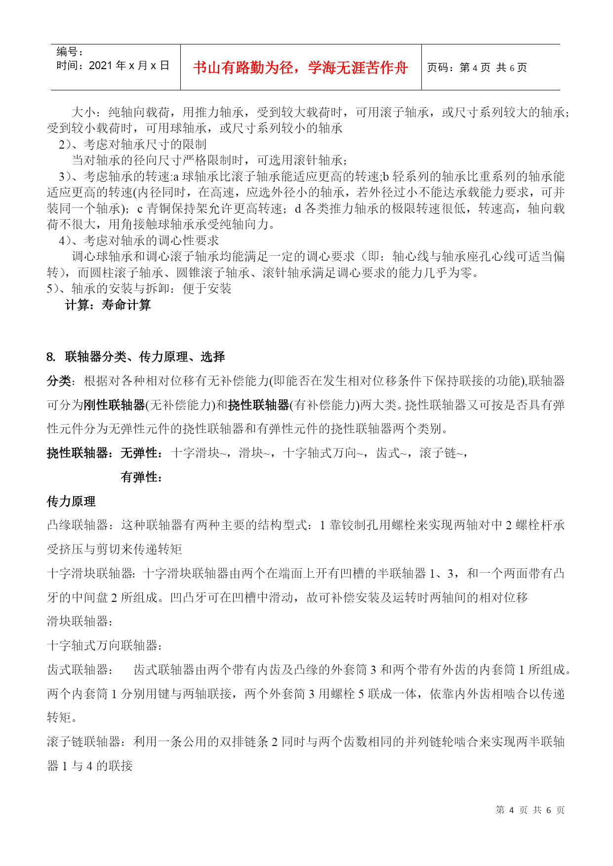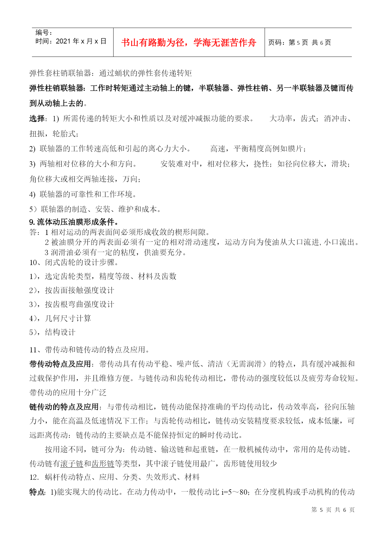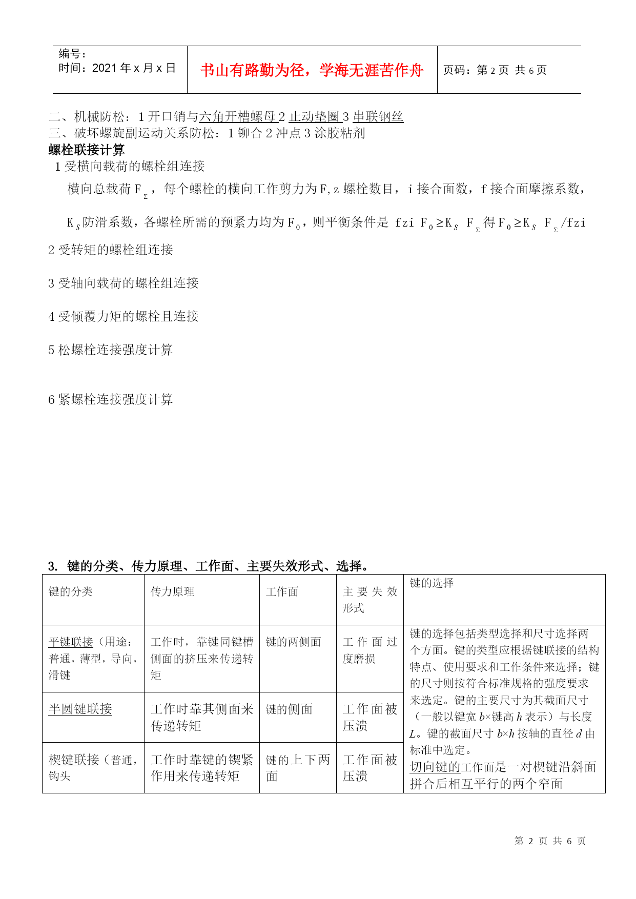 编号:时间:2021年x月x日书山有路勤为径,学海无涯苦作舟页码:第PAGE6页共NUMPAGES6页第PAGE\*MERGEFORMAT6页共NUMPAGES\*MERGEFORMAT6页1.传动带的分类,带传动的设计准则、运动分析、应力分析、弹性滑动现象。分类:按工作原理不同,带传动分为摩擦型带传动和啮合型带传动。摩擦型带传动,按传动带的横截面积形状不同,分为平带传动,圆带传动,V带传动,多楔带传动;啮合型带传动也称为同步带传动。设计准则:在保证不打滑的条件下,带传动具有一定的疲劳强度和寿命。运动分析:在安装带传动时,传动带即以一定的预紧力F0紧套在两个带轮上。由于预紧力F0的作用。带和带轮的接触面上就产生了正压力。带传动不工作时传动带两边的拉力相等,都等于F0(如下列左图所示)。F1+F2=2F0紧边拉力F1松边拉力F2有效拉力Fe,总摩擦力Ff即等于带所传递的有效拉力,即有:Fe=Ff=F1-F2F1=F0+Fe/2F2=F0-Fe/2P=Fev/1000最小初拉力(F0)min临界摩擦力Ffc或临界有效拉力Fec,Fec=Ffc=2(F0)min应力分析:弹性滑动现象:带传动在工作时,带受到拉力后要产生弹性变形。在小带轮上,带拉力从F1降低到F2,带的弹性变量减少,因此带相对小带轮向后退缩,使带速度比小带轮速度v1小;在大带轮上,带拉力F2上升为F1,带的弹性变量增加,因此带相对大带轮向前伸长,使带速度比大带轮速度v2大。这种由于带的弹性变形面引起的带与带轮间的微量滑动,称为带传动的弹性滑动。总有紧松边,所以总有滑动而无法避免。2.螺纹连接的防松方法、螺栓联接计算防松答:一、摩擦防松:1HYPERLINK"file:///E:\\机械\\机械设计\\jxsj\\ch05\\html\\02-01.htm"\l"#"\t"_self"对顶螺母2HYPERLINK"file:///E:\\机械\\机械设计\\jxsj\\ch05\\html\\02-01.htm"\l"#"\t"_self"弹簧垫圈3HYPERLINK"file:///E:\\机械\\机械设计\\jxsj\\ch05\\html\\02-01.htm"\l"#"\t"_self"自锁螺母二、机械防松:1开口销与HYPERLINK"file:///E:\\机械\\机械设计\\jxsj\\ch05\\html\\02-01.htm"\l"#"\t"_self"六角开槽螺母2HYPERLINK"file:///E:\\机械\\机械设计\\jxsj\\ch05\\html\\02-01.htm"\l"#"\t"_self"止动垫圈3HYPERLINK"file:///E:\\机械\\机械设计\\jxsj\\ch05\\html\\02-01.htm"\l"#"\t"_self"串联钢丝三、破坏螺旋副运动关系防松:1铆合2冲点3涂胶粘剂螺栓联接计算1受横向载荷的螺栓组连接横向总载荷F,每个螺栓的横向工作剪力为F,z螺栓数目,i接合面数,f接合面摩擦系数,K防滑系数,各螺栓所需的预紧力均为F,则平衡条件是fziFKF得FKF/fzi2受转矩的螺栓组连接3受轴向载荷的螺栓组连接4受倾覆力矩的螺栓且连接5松螺栓连接强度计算6紧螺栓连接强度计算3.键的分类、传力原理、工作面、主要失效形式、选择。键的分类传力原理工作面主要失效形式键的选择HYPERLINK"file:///E:\\机械\\机械设计\\jxsj\\ch06\\html\\01-01.htm"\t"_self"平键联接(用途:普通,薄型,导向,滑键工作时,靠键同键槽侧面的挤压来传递转矩键的两侧面工作面过度磨损键的选择包括类型选择和尺寸选择两个方面。键的类型应根据键联接的结构特点、使用要求和工作条件来选择;键的尺寸则按符合标准规格的强度要求来选定。键的主要尺寸为其截面尺寸(一般以键宽b×键高h表示)与长度L。键的截面尺寸b×h按轴的直径d由标准中选定。HYPERLINK"file:///E:\\机械\\机械设计\\jxsj\\ch06\\html\\01-04.htm"切向键的工作面是一对楔键沿斜面拼合后相互平行的两个窄面HYPERLINK"file:///E:\\机械\\机械设计\\jxsj\\ch06\\html\\01.htm"\l"#"\t"_self"半圆键联接工作时靠其侧面来传递转矩键的侧面工作面被压溃HYPERLINK"file:///E:\\机械\\机械设计\\jxsj\\ch06\\html\\01-03.htm"楔键联接(普