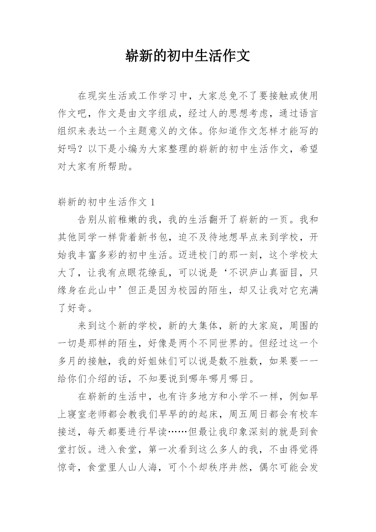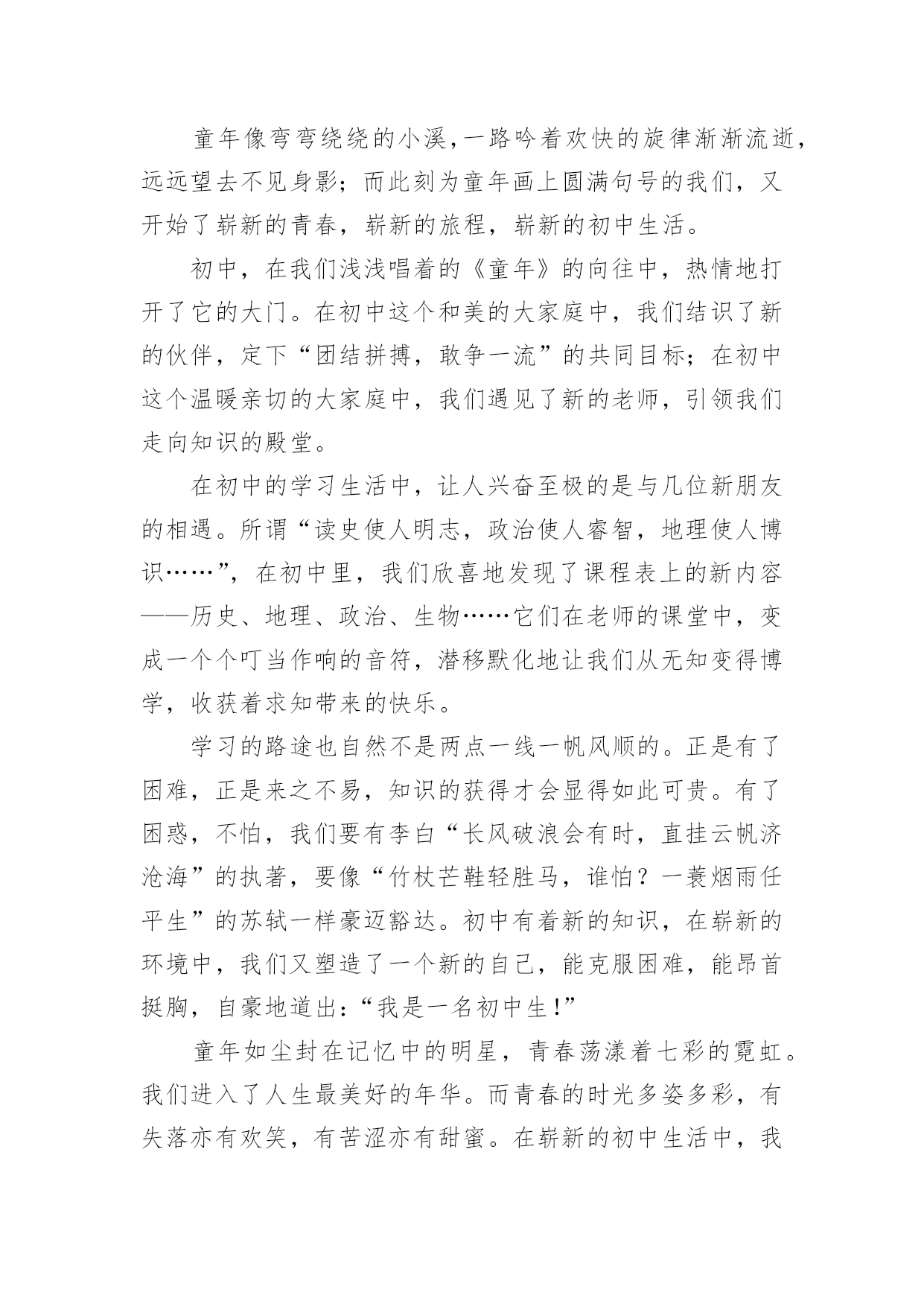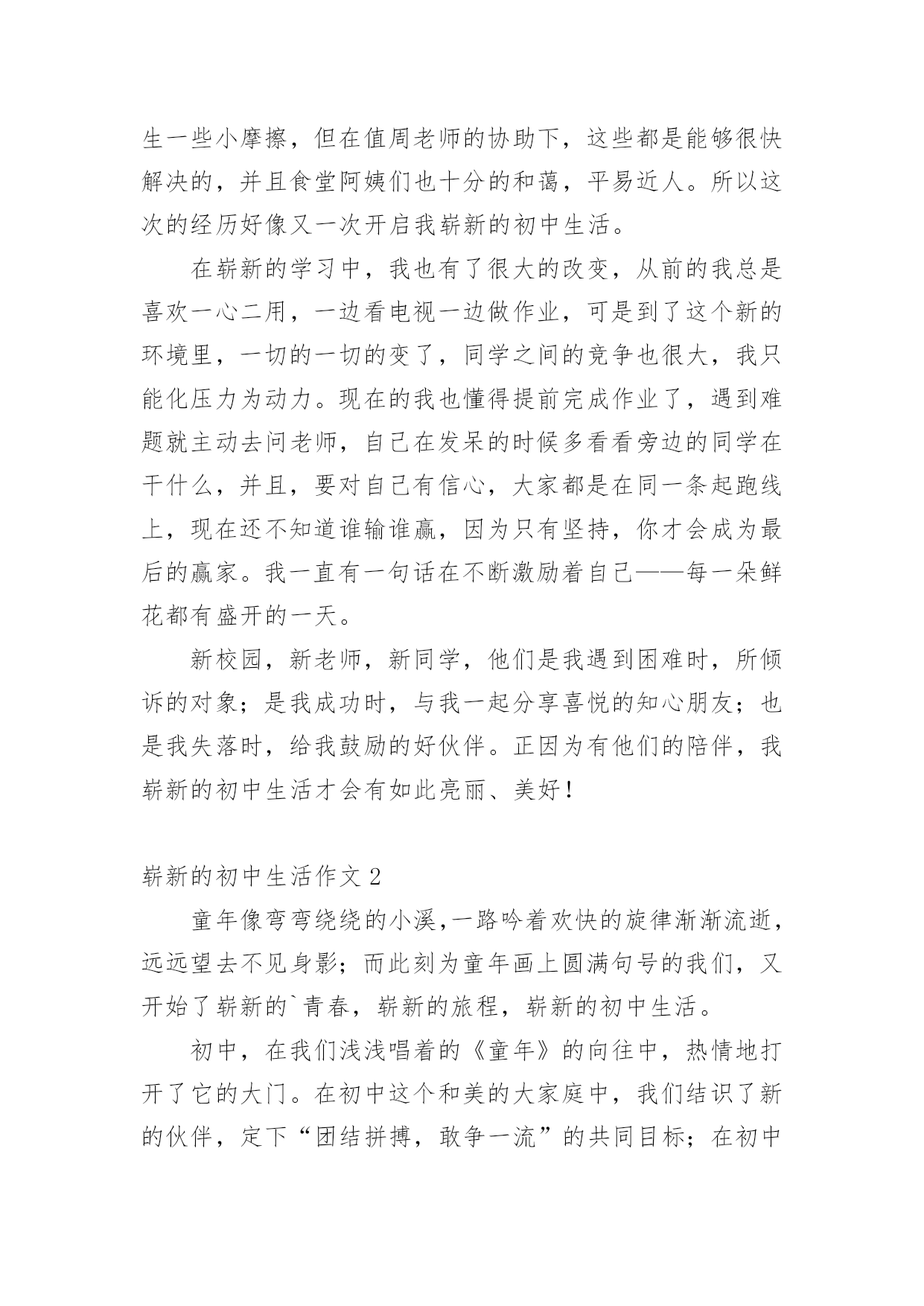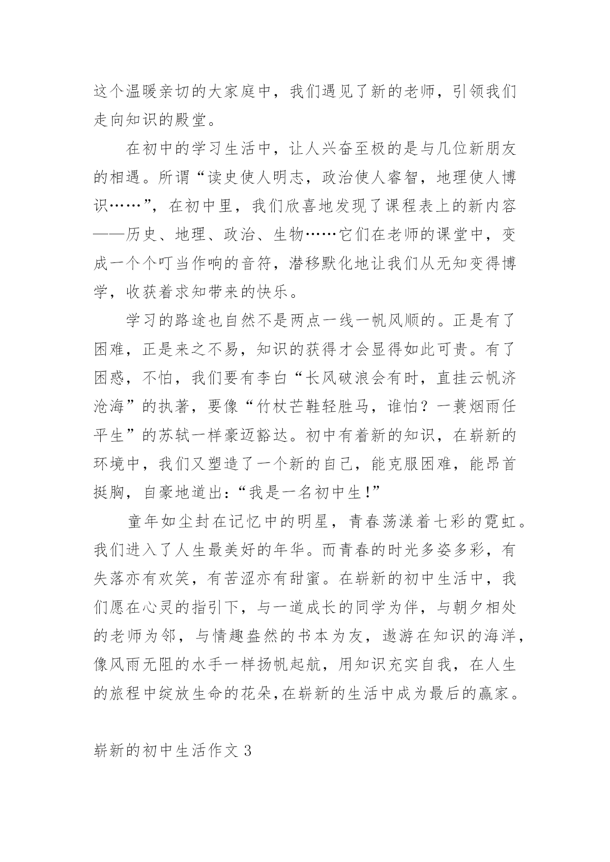崭新的初中生活作文在现实生活或工作学习中,大家总免不了要接触或使用作文吧,作文是由文字组成,经过人的思想考虑,通过语言组织来表达一个主题意义的文体。你知道作文怎样才能写的好吗?以下是小编为大家整理的崭新的初中生活作文,希望对大家有所帮助。崭新的初中生活作文1告别从前稚嫩的我,我的生活翻开了崭新的一页。我和其他同学一样背着新书包,迫不及待地想早点来到学校,开始我丰富多彩的初中生活。迈进校门的那一刻,这个学校太大了,让我有点眼花缭乱,可以说是‘不识庐山真面目,只缘身在此山中’但正是因为校园的陌生,却又让我对它充满了好奇。来到这个新的学校,新的大集体,新的大家庭,周围的一切是那样的陌生,好像是两个不同世界的。但经过这一个多月的接触,我的好姐妹们可以说是数不胜数,如果要一一给你们介绍的话,不知要说到哪年哪月哪日。在崭新的生活中,也有许多地方和小学不一样,例如早上寝室老师都会教我们早早的的起床,周五周日都会有校车接送,每天都要进行早读……但最让我印象深刻的就是到食堂打饭。进入食堂,第一次看到这么多人的我,不由得觉得惊奇,食堂里人山人海,可个个却秩序井然,偶尔可能会发生一些小摩擦,但在值周老师的协助下,这些都是能够很快解决的,并且食堂阿姨们也十分的和蔼,平易近人。所以这次的经历好像又一次开启我崭新的初中生活。在崭新的学习中,我也有了很大的改变,从前的我总是喜欢一心二用,一边看电视一边做作业,可是到了这个新的环境里,一切的一切的变了,同学之间的竞争也很大,我只能化压力为动力。现在的我也懂得提前完成作业了,遇到难题就主动去问老师,自己在发呆的时候多看看旁边的同学在干什么,并且,要对自己有信心,大家都是在同一条起跑线上,现在还不知道谁输谁赢,因为只有坚持,你才会成为最后的赢家。我一直有一句话在不断激励着自己——每一朵鲜花都有盛开的一天。新校园,新老师,新同学,他们是我遇到困难时,所倾诉的对象;是我成功时,与我一起分享喜悦的知心朋友;也是我失落时,给我鼓励的好伙伴。正因为有他们的陪伴,我崭新的初中生活才会有如此亮丽、美好!崭新的初中生活作文2童年像弯弯绕绕的小溪,一路吟着欢快的旋律渐渐流逝,远远望去不见身影;而此刻为童年画上圆满句号的我们,又开始了崭新的`青春,崭新的旅程,崭新的初中生活。初中,在我们浅浅唱着的《童年》的向往中,热情地打开了它的大门。在初中这个和美的大家庭中,我们结识了新的伙伴,定下“团结拼搏,敢争一流”的共同目标;在初中这个温暖亲切的大家庭中,我们遇见了新的老师,引领我们走向知识的殿堂。在初中的学习生活中,让人兴奋至极的是与几位新朋友的相遇。所谓“读史使人明志,政治使人睿智,地理使人博识……”,在初中里,我们欣喜地发现了课程表上的新内容——历史、地理、政治、生物……它们在老师的课堂中,变成一个个叮当作响的音符,潜移默化地让我们从无知变得博学,收获着求知带来的快乐。学习的路途也自然不是两点一线一帆风顺的。正是有了困难,正是来之不易,知识的获得才会显得如此可贵。有了困惑,不怕,我们要有李白“长风破浪会有时,直挂云帆济沧海”的执著,要像“竹杖芒鞋轻胜马,谁怕?一蓑烟雨任平生”的苏轼一样豪迈豁达。初中有着新的知识,在崭新的环境中,我们又塑造了一个新的自己,能克服困难,能昂首挺胸,自豪地道出:“我是一名初中生!”童年如尘封在记忆中的明星,青春荡漾着七彩的霓虹。我们进入了人生最美好的年华。而青春的时光多姿多彩,有失落亦有欢笑,有苦涩亦有甜蜜。在崭新的初中生活中,我们愿在心灵的指引下,与一道成长的同学为伴,与朝夕相处的老师为邻,与情趣盎然的书本为友,遨游在知识的海洋,像风雨无阻的水手一样扬帆起航,用知识充实自我,在人生的旅程中绽放生命的花朵,在崭新的生活中成为最后的赢家。崭新的初中生活作文3童年像弯弯绕绕的小溪,一路吟着欢快的旋律渐渐流逝,远远望去不见身影;而此刻为童年画上圆满句号的我们,又开始了崭新的青春,崭新的旅程,崭新的初中生活。初中,在我们浅浅唱着的《童年》的向往中,热情地打开了它的大门。在初中这个和美的大家庭中,我们结识了新的伙伴,定下“团结拼搏,敢争一流”的共同目标;在初中这个温暖亲切的大家庭中,我们遇见了新的老师,引领我们走向知识的殿堂。在初中的学习生活中,让人兴奋至极的是与几位新朋友的相遇。所谓“读史使人明志,政治使人睿智,地理使人博识……”,在初中里,我们欣喜地发现了课程表上的新内容——历史、地理、政治、生物……它们在老师的课堂中,变成一个个叮当作响的音符,潜移默化地让我们从无知变得博学,收获着求知带来的快乐。学习的路途也自然不是两点一线一帆风顺的。正是有了困难,正是来之不易,知识的获得才会显得如此可贵。有了困惑,不怕,我们要有李白“长风破浪会有时,直挂云帆济沧海”的执著,要像“竹杖芒鞋轻胜马,谁怕?一蓑烟雨任平生”的苏