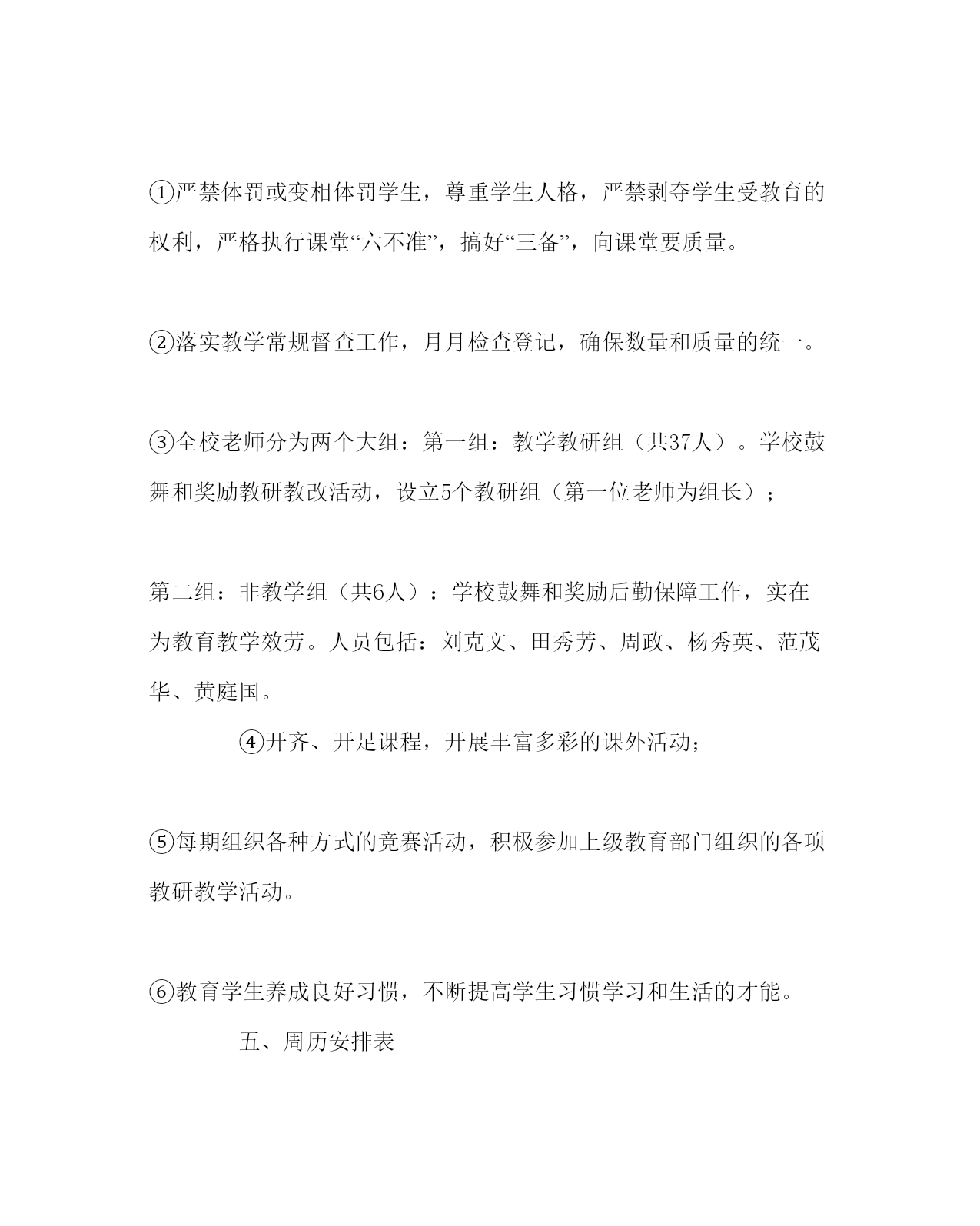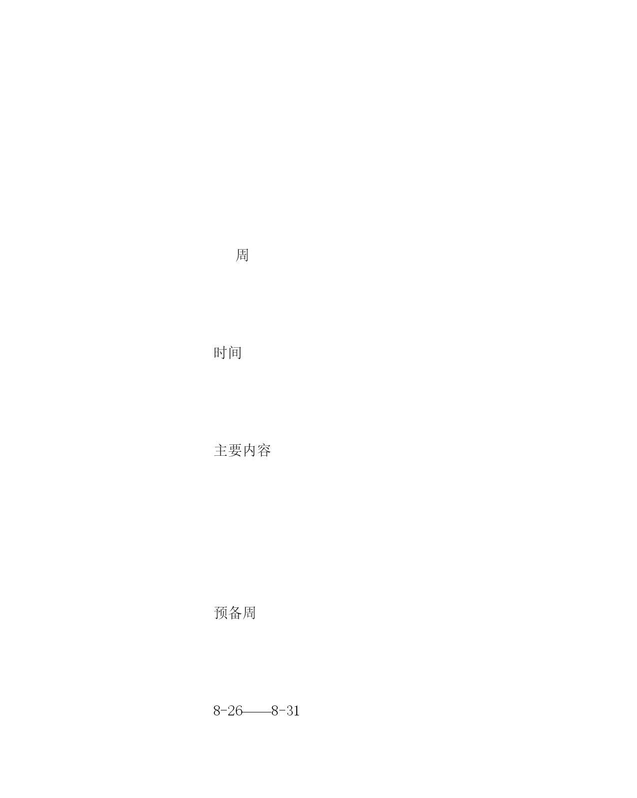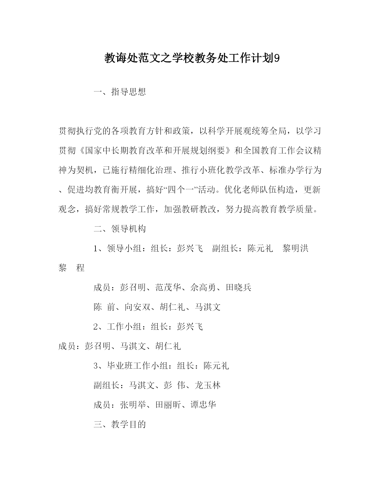 教诲处范文之学校教务处工作计划9一、指导思想贯彻执行党的各项教育方针和政策,以科学开展观统筹全局,以学习贯彻《国家中长期教育改革和开展规划纲要》和全国教育工作会议精神为契机,已施行精细化治理、推行小班化教学改革、标准办学行为、促进均教育衡开展,搞好“四个一”活动。优化老师队伍构造,更新观念,搞好常规教学工作,加强教研教改,努力提高教育教学质量。二、领导机构1、领导小组:组长:彭兴飞副组长:陈元礼黎明洪黎程成员:彭召明、范茂华、佘高勇、田晓兵陈前、向安双、胡仁礼、马淇文2、工作小组:组长:彭兴飞成员:彭召明、马淇文、胡仁礼3、毕业班工作小组:组长:陈元礼副组长:马淇文、彭伟、龙玉林成员:张明举、田丽昕、谭忠华三、教学目的1、实在加强德育工作,提高学生思想品德素养,从严治校,进一步贯彻落实全国教育会议精神,使学生德育评估合格率达98%以上。2、进一步稳固“普九”成果,实在抓好控辍保学工作,力争稳固率达97%,认真落实、施行局施行精细化治理、推行小班化教学改革的决定。3、转变教育观念,面向全体学生,保护、关怀、鼓舞后进生,力争差生转化率达90%。4、培养学生良好习惯,积极锻炼身体,体育合格率达90%以上,达标率达95%以上,健康知识知晓率达98%以上。5、狠抓实验教学,搞好理化生、信息技术实验操作考试。6、力争各科抽考成绩进入全县前十名。7、老师年终考评合格率达100%;校本研修工作、老师专业成长计划工作再上一个台阶。8、加强材料建立,进一步标准档案治理。9、加强班主任队伍建立,确保班主任工作的到位。10、狠抓毕业班的工作,使之成为教育教学工作的重点,为明年的毕业会考工作打下坚实的根底。11、加强师德师风建立,积极配合学校开展“守师德、正教风、树形象”活动,搞好老师、学生的“四个模样”建立。12、努力搞好示范校的创办工作,为合格学校建立绘花添彩。四、主要措施1、加强师生政治思想工作,充分发挥党支部和团委会的作用。进一步做好“四个模样”建立。充分发挥团员、“十佳学生”、“优秀干部”、“三好学生”的榜样带头作用,努力构建学校、家庭、社会“三结合”的教育体系。2、稳固“普九”成果,加强控辍力度,实行年级承包、班主任包班,科任老师包学生的责任制,奖优罚劣,稳固率达95%以上才能评优。3、强化教育教学的过程治理,狠抓教学常规及教研教改活动,努力提高教育效果和教学质量。(参见《湘西自治州教学常规》)①严禁体罚或变相体罚学生,尊重学生人格,严禁剥夺学生受教育的权利,严格执行课堂“六不准”,搞好“三备”,向课堂要质量。②落实教学常规督查工作,月月检查登记,确保数量和质量的统一。③全校老师分为两个大组:第一组:教学教研组(共37人)。学校鼓舞和奖励教研教改活动,设立5个教研组(第一位老师为组长);第二组:非教学组(共6人):学校鼓舞和奖励后勤保障工作,实在为教育教学效劳。人员包括:刘克文、田秀芳、周政、杨秀英、范茂华、黄庭国。④开齐、开足课程,开展丰富多彩的课外活动;⑤每期组织各种方式的竞赛活动,积极参加上级教育部门组织的各项教研教学活动。⑥教育学生养成良好习惯,不断提高学生习惯学习和生活的才能。五、周历安排表周时间主要内容预备周8-26——8-31老师报到,政治学习、学生报名一9-01——9-03上课,核查学生人数、搞好开学的劝学工作二9-04——9-09开学典礼、拟定各种制度,完成各项计划三9-11——9-16学生定案、学籍清理,各种计划、新进老师预备公开课四9-18——9-23成立校园广播站,文学社,七年级语文、数学公开课五9-25——9-30七年级历史公开课、八年级英语公开课、全校作文大赛六10-1——10-07国庆长假七10-08——10-14八年级数学、文科组新课程公开课及讨论会,九年级第一次月考八10-16——10-21九年级心理教育活动、七年级英语单词竞赛九10-23——10-28七、八年级第一次月考、九年级第二次月考十10-30——11-4月考总结、常规教学检查十一11-06——11-11班级拔河竞赛,学校田径运动会十二11-13——11-18九年级化学、物理,八年级生物竞赛十三11-20——11-25理科组新课程公开课及讨论会十四11-27——12-02教学常规检查、班级乒乓球竞赛、搜集老师个人专业成长计划材料