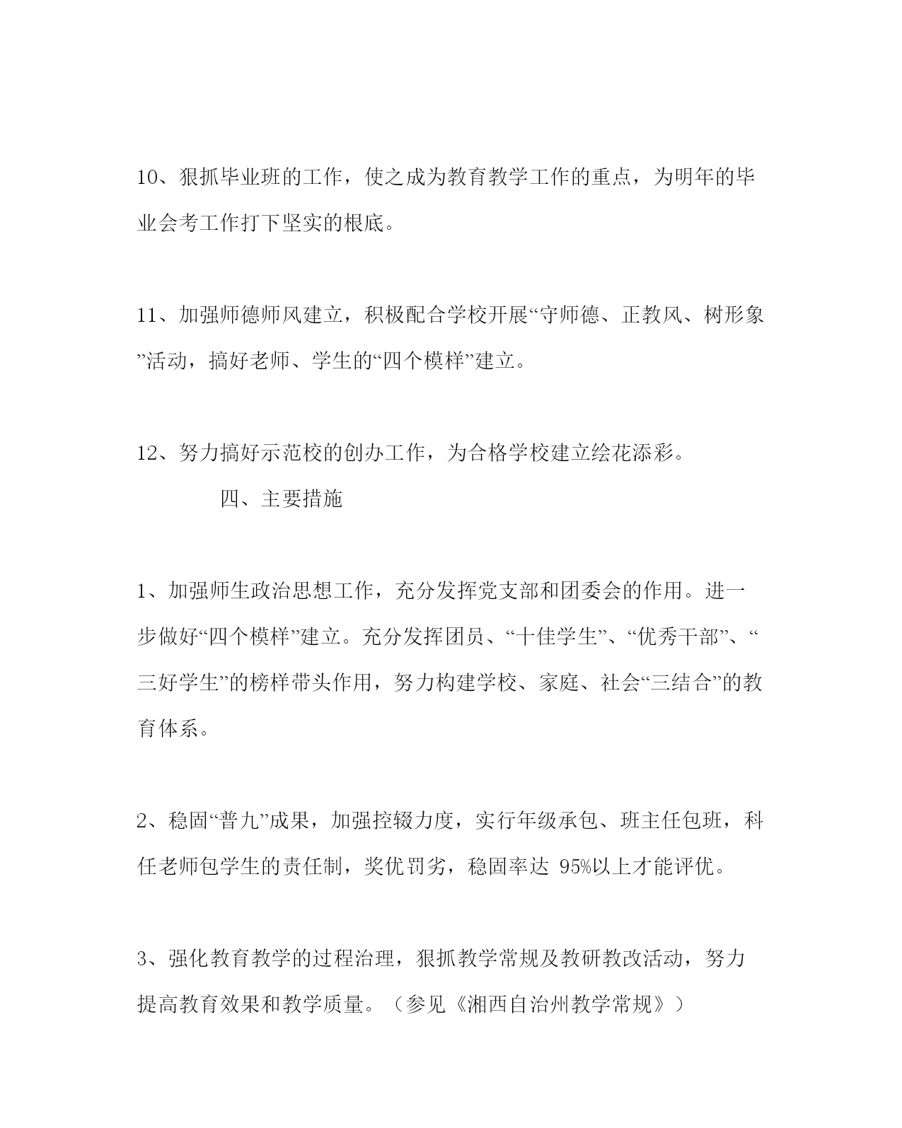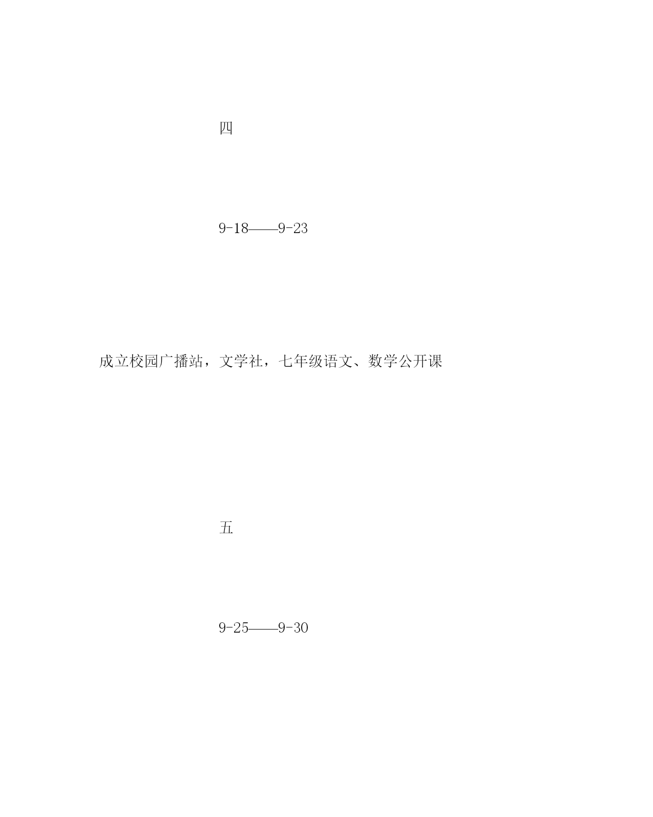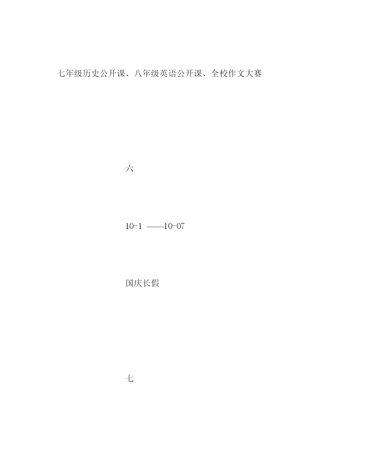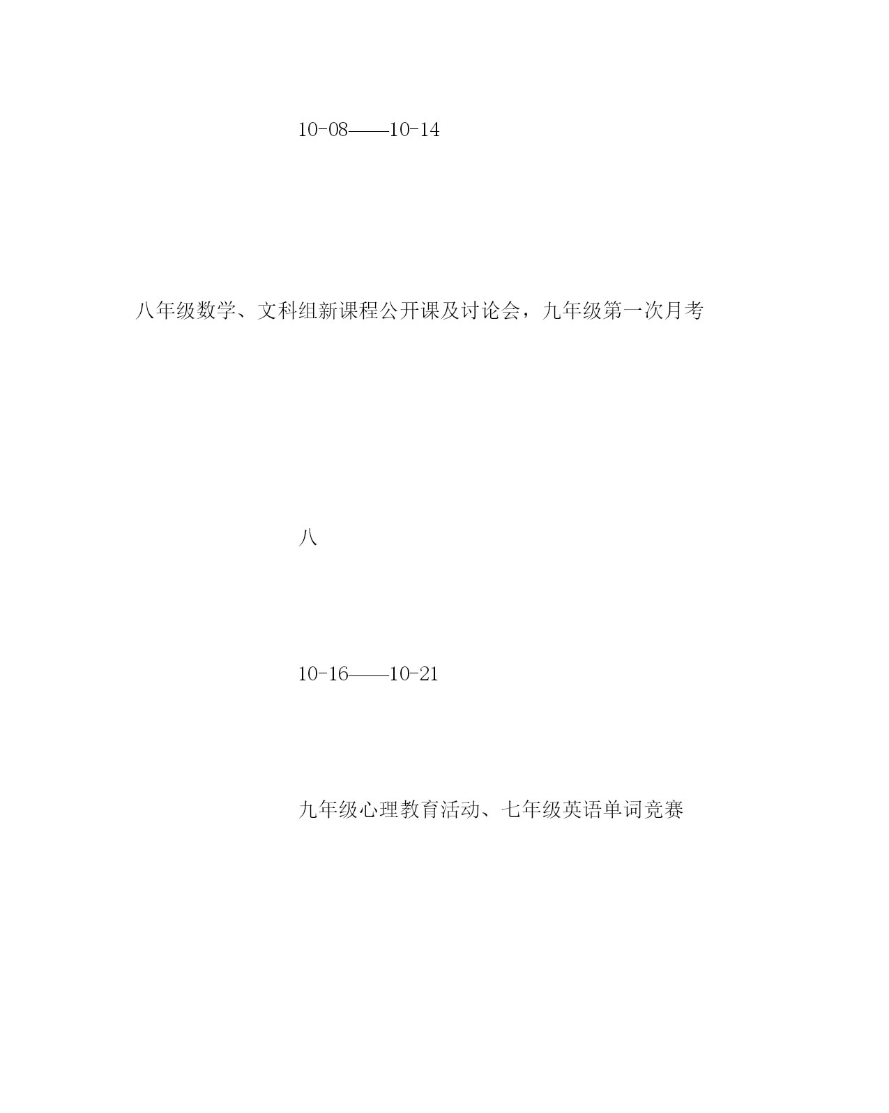 教诲处范文之学校教务处工作计划9一、指导思想贯彻执行党的各项教育方针和政策,以科学开展观统筹全局,以学习贯彻《国家中长期教育改革和开展规划纲要》和全国教育工作会议精神为契机,已施行精细化治理、推行小班化教学改革、标准办学行为、促进均教育衡开展,搞好“四个一”活动。优化老师队伍构造,更新观念,搞好常规教学工作,加强教研教改,努力提高教育教学质量。二、领导机构1、领导小组:组长:彭兴飞副组长:陈元礼黎明洪黎程成员:彭召明、范茂华、佘高勇、田晓兵陈前、向安双、胡仁礼、马淇文2、工作小组:组长:彭兴飞成员:彭召明、马淇文、胡仁礼3、毕业班工作小组:组长:陈元礼副组长:马淇文、彭伟、龙玉林成员:张明举、田丽昕、谭忠华三、教学目的1、实在加强德育工作,提高学生思想品德素养,从严治校,进一步贯彻落实全国教育会议精神,使学生德育评估合格率达98%以上。2、进一步稳固“普九”成果,实在抓好控辍保学工作,力争稳固率达97%,认真落实、施行局施行精细化治理、推行小班化教学改革的决定。3、转变教育观念,面向全体学生,保护、关怀、鼓舞后进生,力争差生转化率达90%。4、培养学生良好习惯,积极锻炼身体,体育合格率达90%以上,达标率达95%以上,健康知识知晓率达98%以上。5、狠抓实验教学,搞好理化生、信息技术实验操作考试。6、力争各科抽考成绩进入全县前十名。7、老师年终考评合格率达100%;校本研修工作、老师专业成长计划工作再上一个台阶。8、加强材料建立,进一步标准档案治理。9、加强班主任队伍建立,确保班主任工作的到位。10、狠抓毕业班的工作,使之成为教育教学工作的重点,为明年的毕业会考工作打下坚实的根底。11、加强师德师风建立,积极配合学校开展“守师德、正教风、树形象”活动,搞好老师、学生的“四个模样”建立。12、努力搞好示范校的创办工作,为合格学校建立绘花添彩。四、主要措施1、加强师生政治思想工作,充分发挥党支部和团委会的作用。进一步做好“四个模样”建立。充分发挥团员、“十佳学生”、“优秀干部”、“三好学生”的榜样带头作用,努力构建学校、家庭、社会“三结合”的教育体系。2、稳固“普九”成果,加强控辍力度,实行年级承包、班主任包班,科任老师包学生的责任制,奖优罚劣,稳固率达95%以上才能评优。3、强化教育教学的过程治理,狠抓教学常规及教研教改活动,努力提高教育效果和教学质量。(参见《湘西自治州教学常规》)①严禁体罚或变相体罚学生,尊重学生人格,严禁剥夺学生受教育的权利,严格执行课堂“六不准”,搞好“三备”,向课堂要质量。②落实教学常规督查工作,月月检查登记,确保数量和质量的统一。③全校老师分为两个大组:第一组:教学教研组(共37人)。学校鼓舞和奖励教研教改活动,设立5个教研组(第一位老师为组长);第二组:非教学组(共6人):学校鼓舞和奖励后勤保障工作,实在为教育教学效劳。人员包括:刘克文、田秀芳、周政、杨秀英、范茂华、黄庭国。④开齐、开足课程,开展丰富多彩的课外活动;⑤每期组织各种方式的竞赛活动,积极参加上级教育部门组织的各项教研教学活动。⑥教育学生养成良好习惯,不断提高学生习惯学习和生活的才能。五、周历安排表周时间主要内容预备周8-26——8-31老师报到,政治学习、学生报名一9-01——9-03上课,核查学生人数、搞好开学的劝学工作二9-04——9-09开学典礼、拟定各种制度,完成各项计划三9-11——9-16学生定案、学籍清理,各种计划、新进老师预备公开课四9-18——9-23成立校园广播站,文学社,七年级语文、数学公开课五9-25——9-30七年级历史公开课、八年级英语公开课、全校作文大赛六10-1——10-07国庆长假七10-08——10-14八年级数学、文科组新课程公开课及讨论会,九年级第一次月考八10-16——10-21九年级心理教育活动、七年级英语单词竞赛九10-23——10-28七、八年级第一次月考、九年级第二次月考十10-30——11-4月考总结、常规教学检查十一11-06——11-11班级拔河竞赛,学校田径运动会十二11-13——11-18九年级化学、物理,八年级生物竞赛十三11-20——11-25理科组新课程公开课及讨论会十四11-27——12-02教学常规检查、班级乒乓球竞赛、搜集老师个人专业成长计划材料