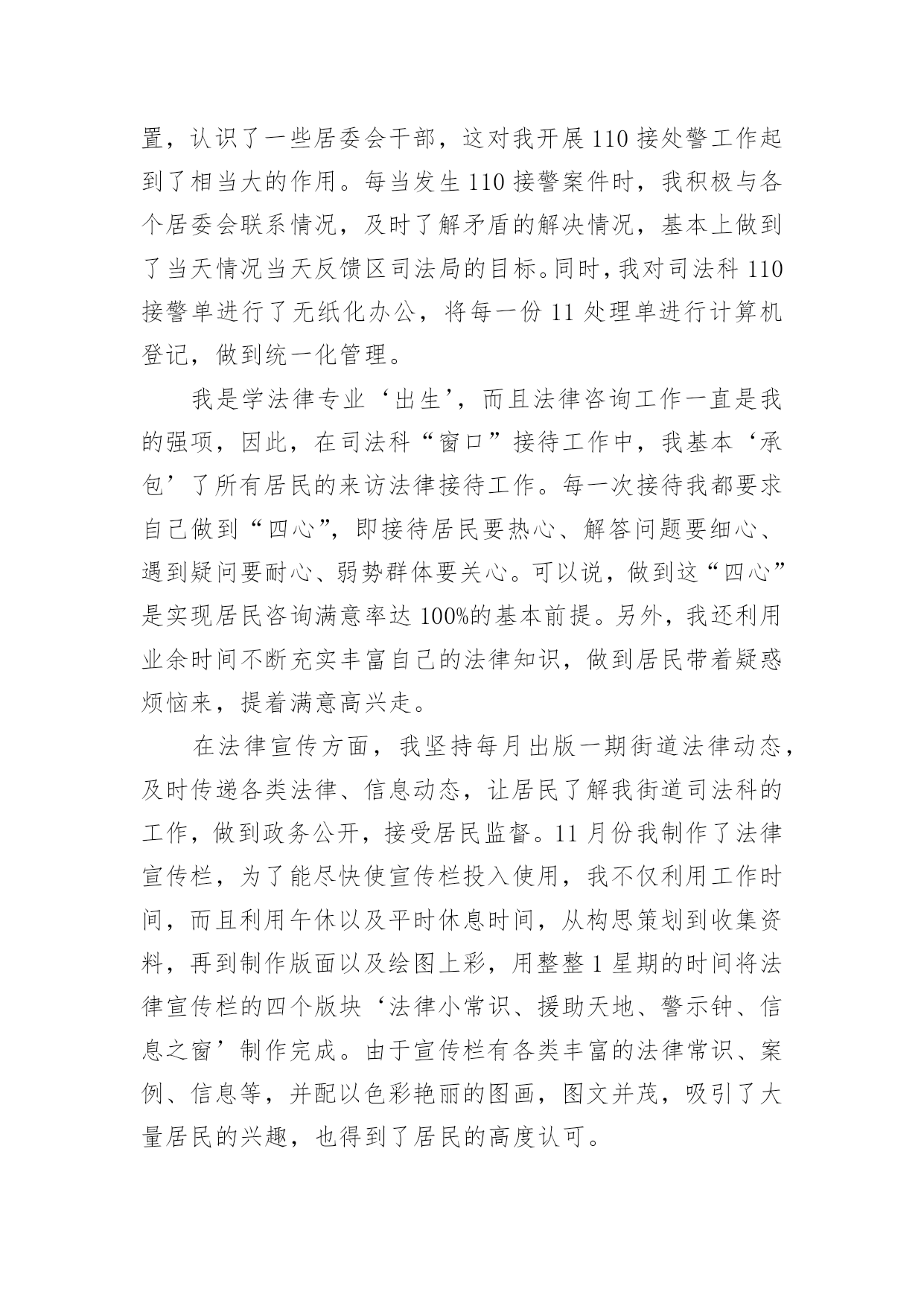 街道司法科秘书的个人工作总结街道司法科秘书的个人工作总结总结是对过去一定时期的工作、学习或思想情况进行回顾、分析,并做出客观评价的书面材料,它可使零星的、肤浅的、表面的感性认知上升到全面的、系统的、本质的理性认识上来,为此要我们写一份总结。你所见过的总结应该是什么样的?下面是小编帮大家整理的街道司法科秘书的个人工作总结,供大家参考借鉴,希望可以帮助到有需要的朋友。时间如梭,一眨眼已经是XX年的年末了,我被作为储备干部派遣到街道工作已整整半年了。半年的时间虽然十分短暂,但是对我来说意义却是十分重大的,因为这是我走出校园这座‘象牙塔’、跨入社会后的第一份工作,也是我人生中的一次社会角色转变。回顾这半年来的工作,有领导的关心,有同事的关怀,有工作中的挫折,也有取得的小小成绩,工作使我学到了丰富的实践知识、工作技巧以及做人的道理。110接处警是我在街道司法科的第一项工作,起初,由于我以前未从事过街道方面的工作,加上对周围地区的不熟悉,因此,工作效率不是很高,但是,在司法科负责人和办公室其他工作人员的`帮助下,我很快了解了街道内的×个居委会,并且通过走访形式,熟悉了各居委会所在的地理位置,认识了一些居委会干部,这对我开展110接处警工作起到了相当大的作用。每当发生110接警案件时,我积极与各个居委会联系情况,及时了解矛盾的解决情况,基本上做到了当天情况当天反馈区司法局的目标。同时,我对司法科110接警单进行了无纸化办公,将每一份11处理单进行计算机登记,做到统一化管理。我是学法律专业‘出生’,而且法律咨询工作一直是我的强项,因此,在司法科“窗口”接待工作中,我基本‘承包’了所有居民的来访法律接待工作。每一次接待我都要求自己做到“四心”,即接待居民要热心、解答问题要细心、遇到疑问要耐心、弱势群体要关心。可以说,做到这“四心”是实现居民咨询满意率达100%的基本前提。另外,我还利用业余时间不断充实丰富自己的法律知识,做到居民带着疑惑烦恼来,提着满意高兴走。在法律宣传方面,我坚持每月出版一期街道法律动态,及时传递各类法律、信息动态,让居民了解我街道司法科的工作,做到政务公开,接受居民监督。11月份我制作了法律宣传栏,为了能尽快使宣传栏投入使用,我不仅利用工作时间,而且利用午休以及平时休息时间,从构思策划到收集资料,再到制作版面以及绘图上彩,用整整1星期的时间将法律宣传栏的四个版块‘法律小常识、援助天地、警示钟、信息之窗’制作完成。由于宣传栏有各类丰富的法律常识、案例、信息等,并配以色彩艳丽的图画,图文并茂,吸引了大量居民的兴趣,也得到了居民的高度认可。总而言之,工作才刚刚开始,取得的成绩也仅仅代表过去,我知道,我不懂的东西还很多,要学习的也很多,一时的沾沾自喜或骄傲自满都是不可取的,因此,在今后的工作中我仍然要继续努力学习业务知识,积累实践经验,兢兢业业,踏实勤奋;在政治思想上,要处处以公务员的标准严格要求自己,积极要求上进。我相信,随着时间的推移,我会将工作做得更好。