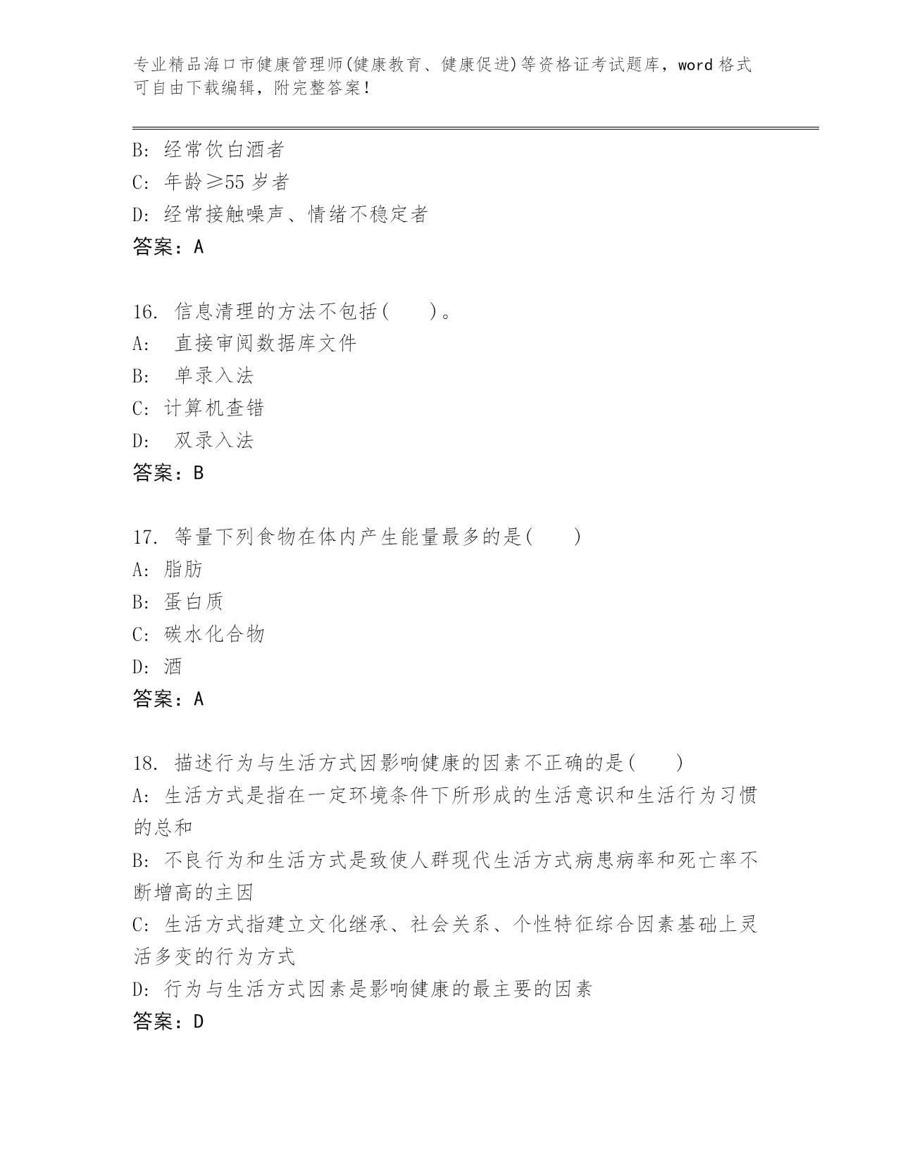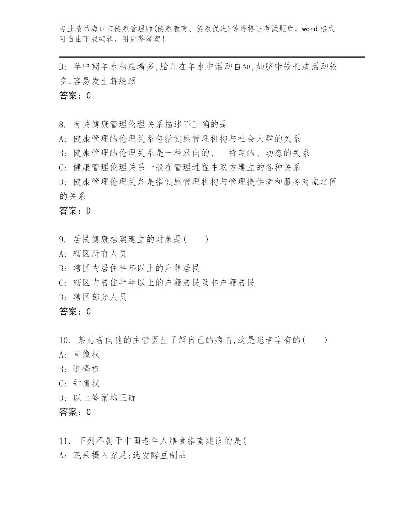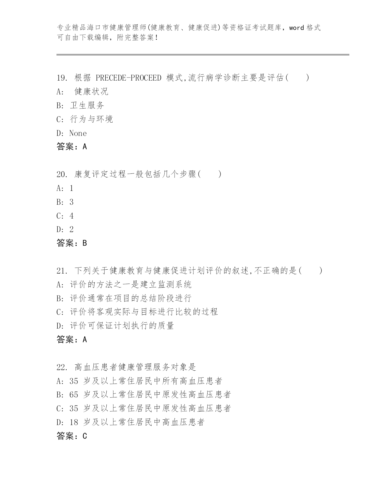 内部培训海口市健康管理师(健康教育、健康促进)等资格证考试题库大全【全优】