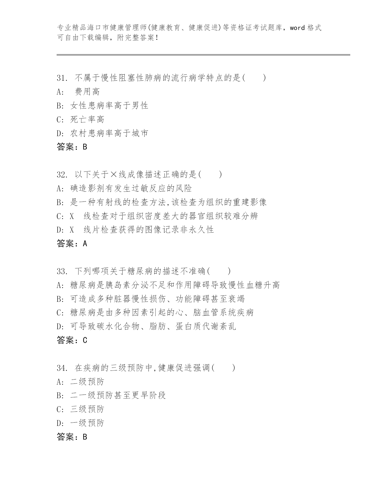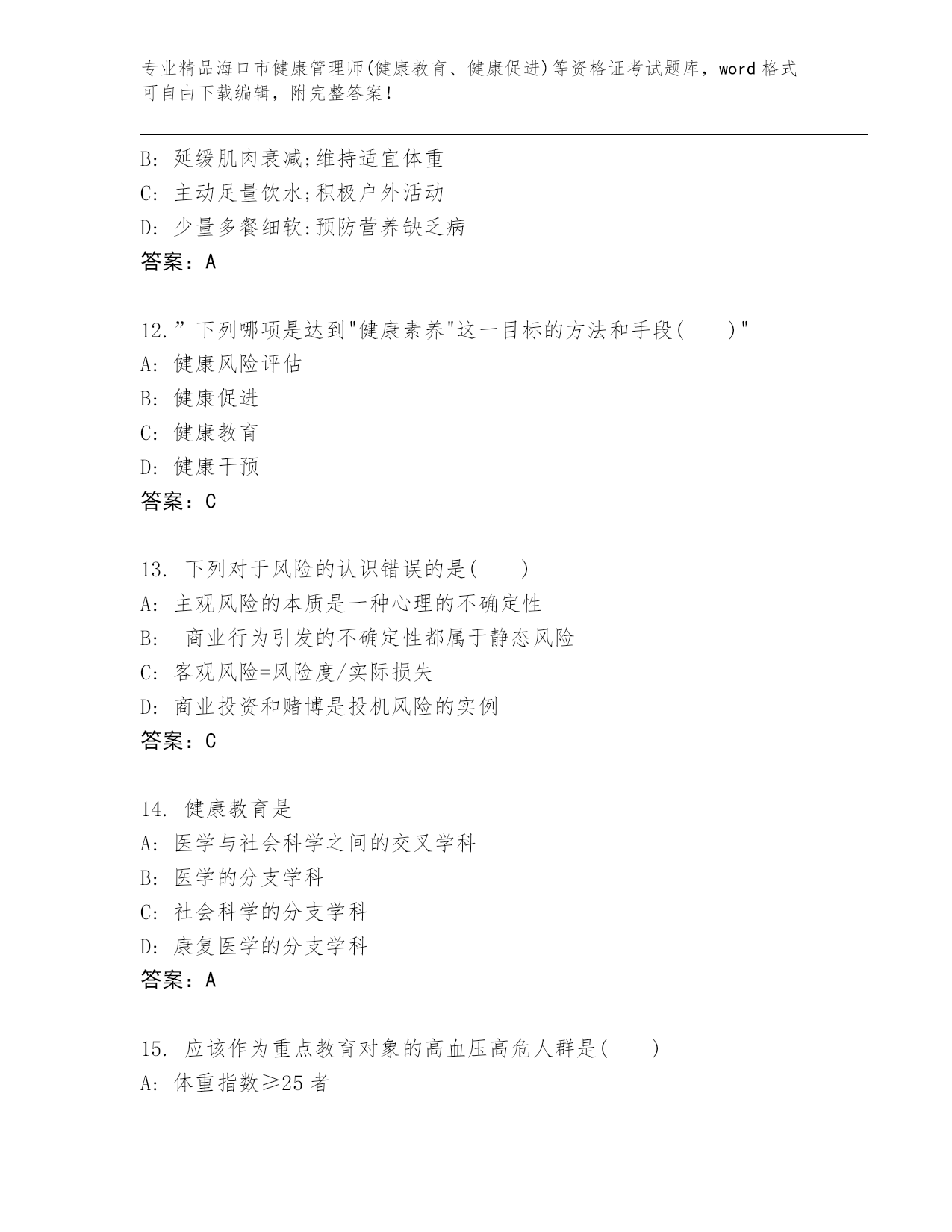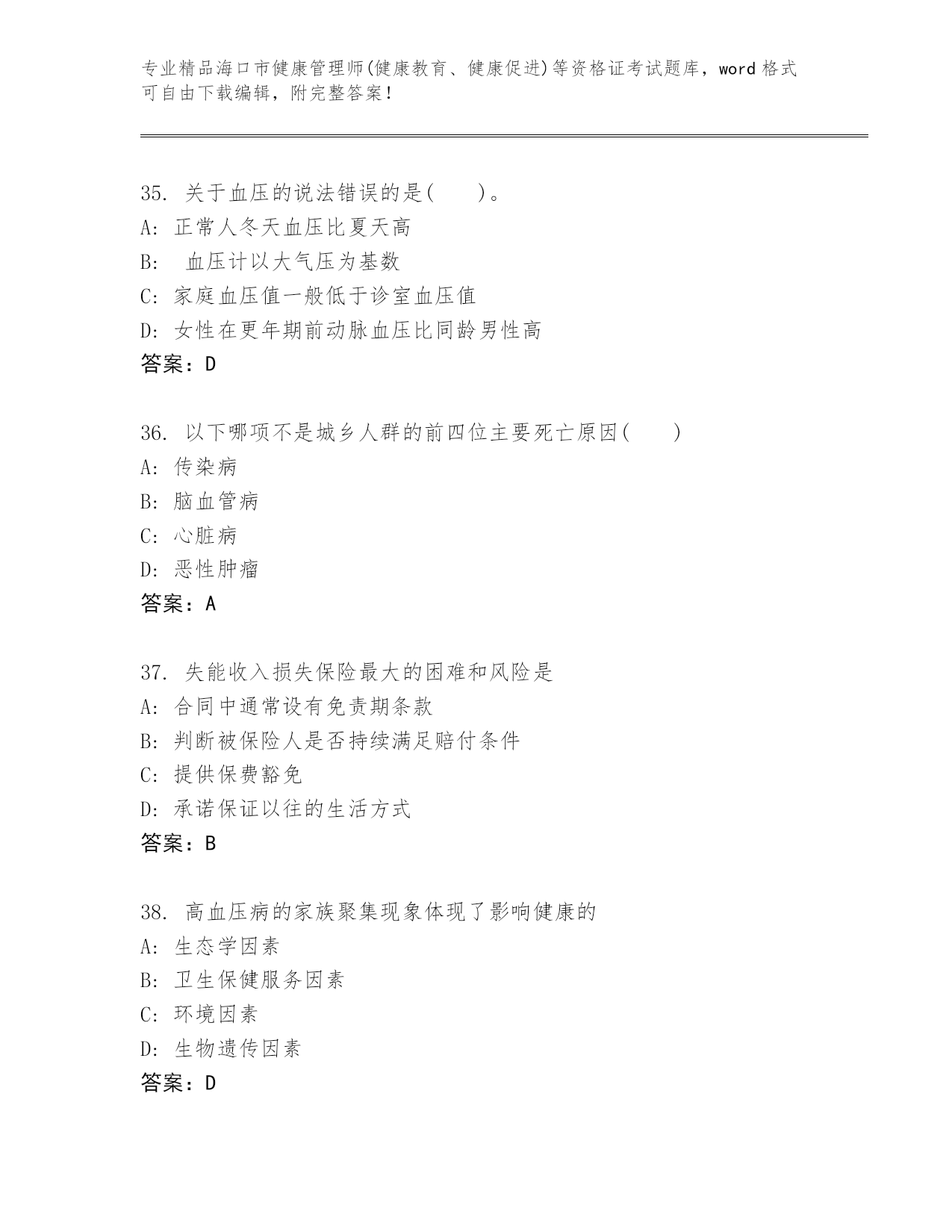 内部培训海口市健康管理师(健康教育、健康促进)等资格证考试题库大全【全优】