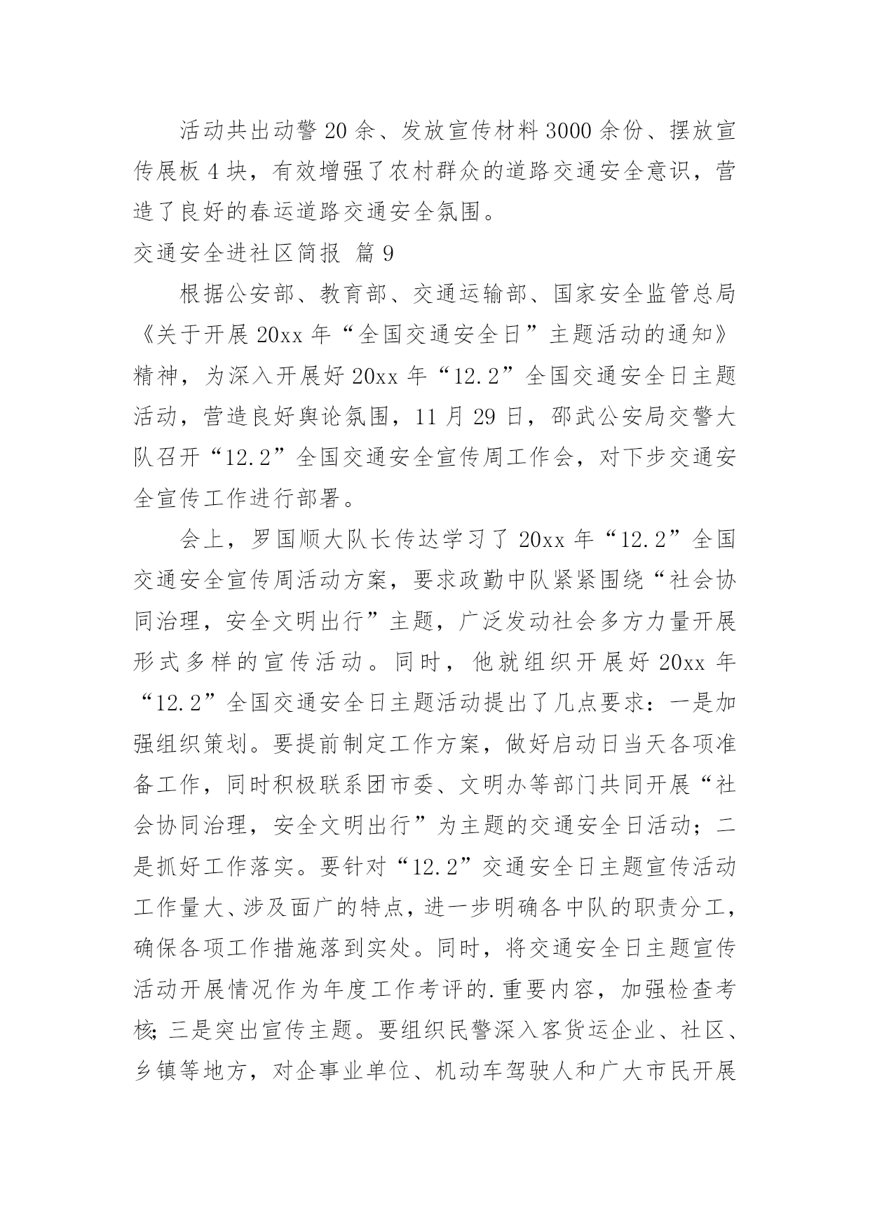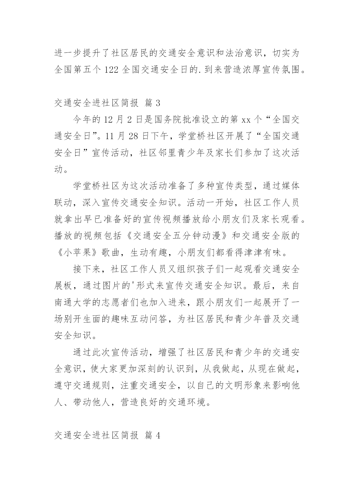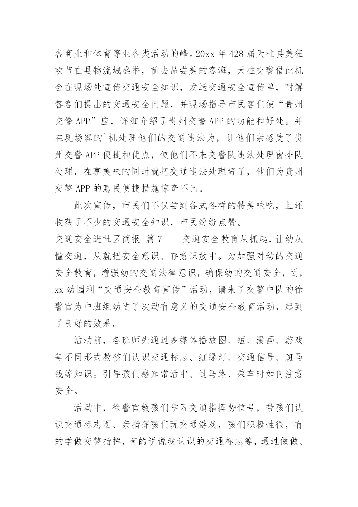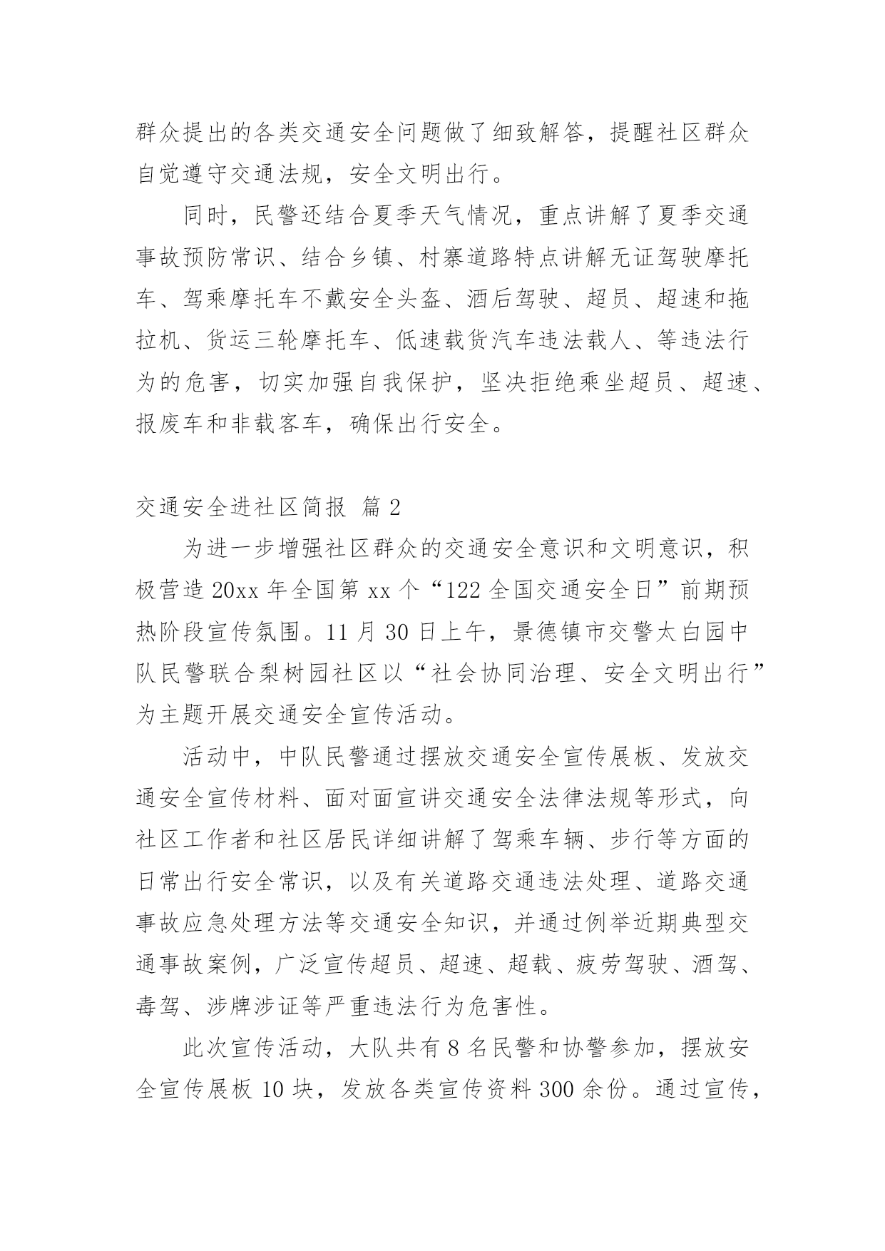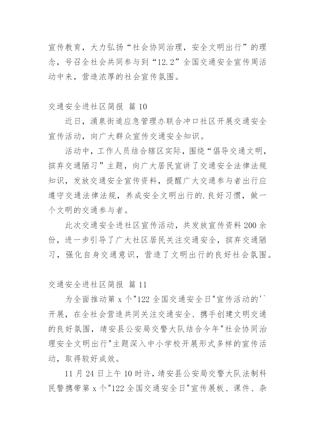 交通安全进社区简报交通安全进社区简报(精选15篇)在不断进步的时代,大家总少不了接触一些耳熟能详的简报吧,简报具有一般报纸新闻性的特点,这是共性;它又有本身的特点。那要怎么写好简报呢?以下是小编帮大家整理的交通安全进社区简报(精选15篇),欢迎大家分享。交通安全进社区简报篇1为认真贯彻落实第21个全国“安全生产月”相关工作,以道路交通事故预防“减量控大”为目的,紧扣安全宣传“七进”活动,以“遵守安全生产法当好第一责任人”主题,精心准备,贞丰县公安局交通警察大队积极开展交通安全进社区活动,营造全社会共同关注交通安全的浓厚氛围。活动中,民警通过悬挂横幅标语、摆放事故案例展板,结合当前正在开展的“一盔一带”安全守护行动等重点工作内容,结合社区居民以电动车出行居多,交通安全意识淡薄的实际情况,采用通俗易懂、简单明了的'语言,面向社区居民详细介绍了安全出行、紧急避险等方面的交通知识。着重对酒驾醉驾、骑摩托车不戴安全头盔、驾车不系安全带、驾驶违规电动三、四轮车上路等交通违法行为的危害性、不佩戴安全头盔驾驶摩托车或电动自行车、不系安全带驾驶机动车的事故进行讲解,警示教育社区居民骑乘电动车、摩托车要自觉戴好安全头盔,驾驶机动车要系好安全带,并针对群众提出的各类交通安全问题做了细致解答,提醒社区群众自觉遵守交通法规,安全文明出行。同时,民警还结合夏季天气情况,重点讲解了夏季交通事故预防常识、结合乡镇、村寨道路特点讲解无证驾驶摩托车、驾乘摩托车不戴安全头盔、酒后驾驶、超员、超速和拖拉机、货运三轮摩托车、低速载货汽车违法载人、等违法行为的危害,切实加强自我保护,坚决拒绝乘坐超员、超速、报废车和非载客车,确保出行安全。交通安全进社区简报篇2为进一步增强社区群众的交通安全意识和文明意识,积极营造20xx年全国第xx个“122全国交通安全日”前期预热阶段宣传氛围。11月30日上午,景德镇市交警太白园中队民警联合梨树园社区以“社会协同治理、安全文明出行”为主题开展交通安全宣传活动。活动中,中队民警通过摆放交通安全宣传展板、发放交通安全宣传材料、面对面宣讲交通安全法律法规等形式,向社区工作者和社区居民详细讲解了驾乘车辆、步行等方面的日常出行安全常识,以及有关道路交通违法处理、道路交通事故应急处理方法等交通安全知识,并通过例举近期典型交通事故案例,广泛宣传超员、超速、超载、疲劳驾驶、酒驾、毒驾、涉牌涉证等严重违法行为危害性。此次宣传活动,大队共有8名民警和协警参加,摆放安全宣传展板10块,发放各类宣传资料300余份。通过宣传,进一步提升了社区居民的交通安全意识和法治意识,切实为全国第五个122全国交通安全日的.到来营造浓厚宣传氛围。交通安全进社区简报篇3今年的12月2日是国务院批准设立的第xx个“全国交通安全日”。11月28日下午,学堂桥社区开展了“全国交通安全日”宣传活动,社区邻里青少年及家长们参加了这次活动。学堂桥社区为这次活动准备了多种宣传类型,通过媒体联动,深入宣传交通安全知识。活动一开始,社区工作人员就拿出早已准备好的宣传视频播放给小朋友们及家长观看。播放的视频包括《交通安全五分钟动漫》和交通安全版的《小苹果》歌曲,生动有趣,小朋友们都看得津津有味。接下来,社区工作人员又组织孩子们一起观看交通安全展板,通过图片的'形式来宣传交通安全知识。最后,来自南通大学的志愿者们也加入进来,跟小朋友们一起展开了一场别开生面的趣味互动问答,为社区居民和青少年普及交通安全知识。通过此次宣传活动,增强了社区居民和青少年的交通安全意识,使大家更加深刻的认识到,从我做起,从现在做起,遵守交通规则,注重交通安全,以自己的文明形象来影响他人、带动他人,营造良好的交通环境。交通安全进社区简报篇4今天(12月2日)是第xx个“全国交通安全日”,今年活动的主题是“社会协同治理、安全文明出行”。吉木萨尔县文明办、县交通大队、吉木萨尔镇各社区工作人员共计100余人,在吉木萨尔县北庭商贸城前进行交通安全知识普法宣传。据了解,协同治理是社会治理的一个重要理念和创新模式,对解决道路交通安全这样一个极其复杂的系统工程来讲具有非常重要的意义。近年来,我县开展交通安全社会协同治理的工作成效主要体现:县委、县政府组织全县开展“吉木萨尔县文明大行动”,把文明交通创建作为重要内容推进,全民齐参与,交通环境明显改善,交通参与者交通安全意识明显提高。我县文明交通主题系列活动影响不断增强,先后策划开展各类交通安全主题宣传活动,社会群众广泛参与,共同倡导文明交通理念。吉木萨尔县交通大队大队长呼吁:道路交通安全必须坚持生命至上、安全第一的原则,实行依法治理、社会共治、全民参与,实现责任共担、风险共治、安全共享。道路交通安全关系到每一个人的生命、人身和公私财产的`安全,因此也需要每个人的关心、支持和行动。我们必须