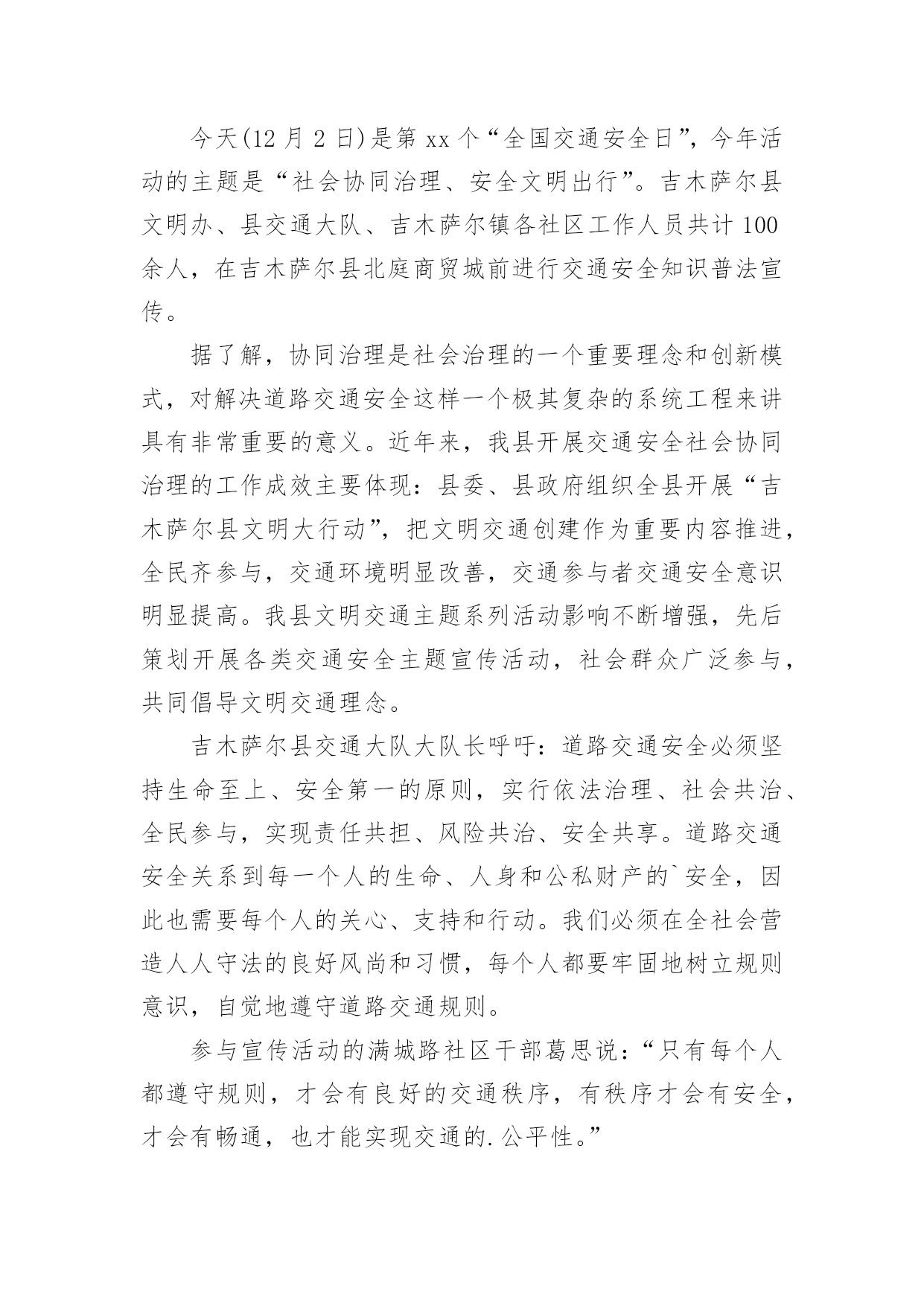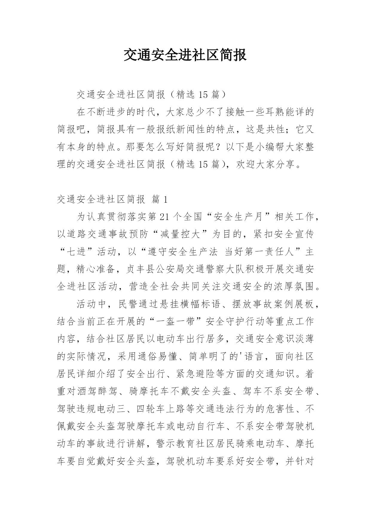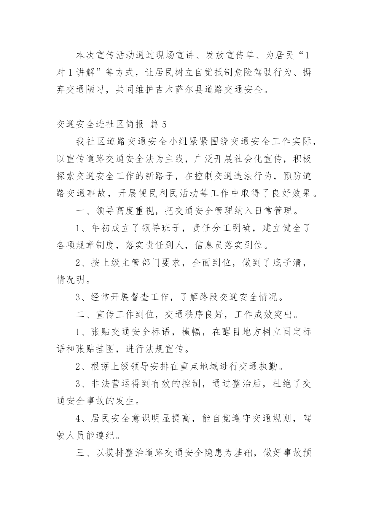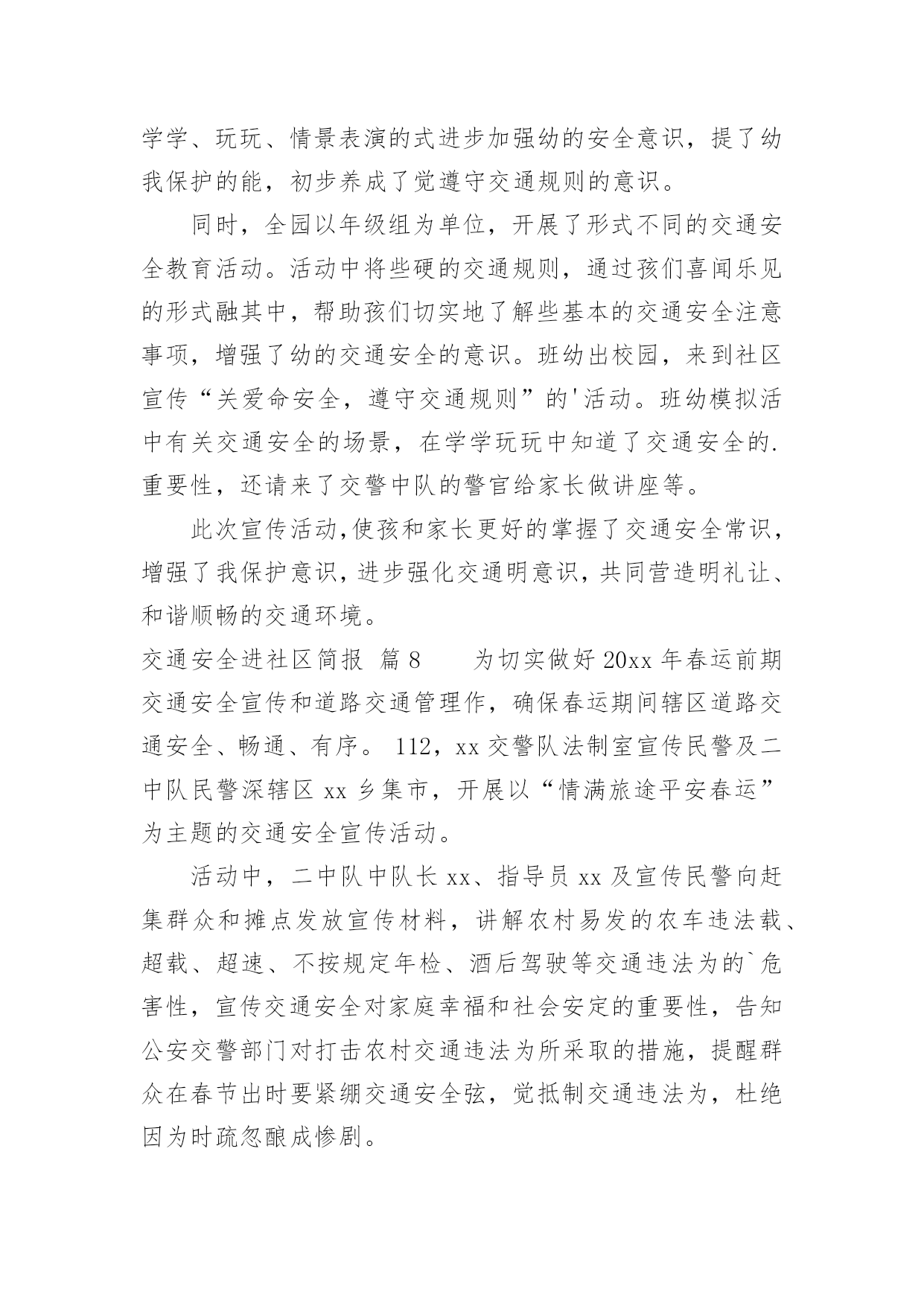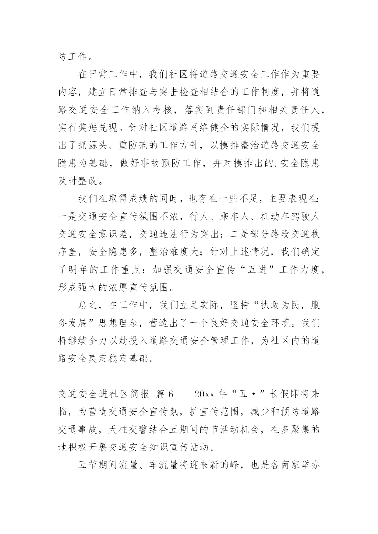 交通安全进社区简报交通安全进社区简报(精选15篇)在不断进步的时代,大家总少不了接触一些耳熟能详的简报吧,简报具有一般报纸新闻性的特点,这是共性;它又有本身的特点。那要怎么写好简报呢?以下是小编帮大家整理的交通安全进社区简报(精选15篇),欢迎大家分享。交通安全进社区简报篇1为认真贯彻落实第21个全国“安全生产月”相关工作,以道路交通事故预防“减量控大”为目的,紧扣安全宣传“七进”活动,以“遵守安全生产法当好第一责任人”主题,精心准备,贞丰县公安局交通警察大队积极开展交通安全进社区活动,营造全社会共同关注交通安全的浓厚氛围。活动中,民警通过悬挂横幅标语、摆放事故案例展板,结合当前正在开展的“一盔一带”安全守护行动等重点工作内容,结合社区居民以电动车出行居多,交通安全意识淡薄的实际情况,采用通俗易懂、简单明了的'语言,面向社区居民详细介绍了安全出行、紧急避险等方面的交通知识。着重对酒驾醉驾、骑摩托车不戴安全头盔、驾车不系安全带、驾驶违规电动三、四轮车上路等交通违法行为的危害性、不佩戴安全头盔驾驶摩托车或电动自行车、不系安全带驾驶机动车的事故进行讲解,警示教育社区居民骑乘电动车、摩托车要自觉戴好安全头盔,驾驶机动车要系好安全带,并针对群众提出的各类交通安全问题做了细致解答,提醒社区群众自觉遵守交通法规,安全文明出行。同时,民警还结合夏季天气情况,重点讲解了夏季交通事故预防常识、结合乡镇、村寨道路特点讲解无证驾驶摩托车、驾乘摩托车不戴安全头盔、酒后驾驶、超员、超速和拖拉机、货运三轮摩托车、低速载货汽车违法载人、等违法行为的危害,切实加强自我保护,坚决拒绝乘坐超员、超速、报废车和非载客车,确保出行安全。交通安全进社区简报篇2为进一步增强社区群众的交通安全意识和文明意识,积极营造20xx年全国第xx个“122全国交通安全日”前期预热阶段宣传氛围。11月30日上午,景德镇市交警太白园中队民警联合梨树园社区以“社会协同治理、安全文明出行”为主题开展交通安全宣传活动。活动中,中队民警通过摆放交通安全宣传展板、发放交通安全宣传材料、面对面宣讲交通安全法律法规等形式,向社区工作者和社区居民详细讲解了驾乘车辆、步行等方面的日常出行安全常识,以及有关道路交通违法处理、道路交通事故应急处理方法等交通安全知识,并通过例举近期典型交通事故案例,广泛宣传超员、超速、超载、疲劳驾驶、酒驾、毒驾、涉牌涉证等严重违法行为危害性。此次宣传活动,大队共有8名民警和协警参加,摆放安全宣传展板10块,发放各类宣传资料300余份。通过宣传,进一步提升了社区居民的交通安全意识和法治意识,切实为全国第五个122全国交通安全日的.到来营造浓厚宣传氛围。交通安全进社区简报篇3今年的12月2日是国务院批准设立的第xx个“全国交通安全日”。11月28日下午,学堂桥社区开展了“全国交通安全日”宣传活动,社区邻里青少年及家长们参加了这次活动。学堂桥社区为这次活动准备了多种宣传类型,通过媒体联动,深入宣传交通安全知识。活动一开始,社区工作人员就拿出早已准备好的宣传视频播放给小朋友们及家长观看。播放的视频包括《交通安全五分钟动漫》和交通安全版的《小苹果》歌曲,生动有趣,小朋友们都看得津津有味。接下来,社区工作人员又组织孩子们一起观看交通安全展板,通过图片的'形式来宣传交通安全知识。最后,来自南通大学的志愿者们也加入进来,跟小朋友们一起展开了一场别开生面的趣味互动问答,为社区居民和青少年普及交通安全知识。通过此次宣传活动,增强了社区居民和青少年的交通安全意识,使大家更加深刻的认识到,从我做起,从现在做起,遵守交通规则,注重交通安全,以自己的文明形象来影响他人、带动他人,营造良好的交通环境。交通安全进社区简报篇4今天(12月2日)是第xx个“全国交通安全日”,今年活动的主题是“社会协同治理、安全文明出行”。吉木萨尔县文明办、县交通大队、吉木萨尔镇各社区工作人员共计100余人,在吉木萨尔县北庭商贸城前进行交通安全知识普法宣传。据了解,协同治理是社会治理的一个重要理念和创新模式,对解决道路交通安全这样一个极其复杂的系统工程来讲具有非常重要的意义。近年来,我县开展交通安全社会协同治理的工作成效主要体现:县委、县政府组织全县开展“吉木萨尔县文明大行动”,把文明交通创建作为重要内容推进,全民齐参与,交通环境明显改善,交通参与者交通安全意识明显提高。我县文明交通主题系列活动影响不断增强,先后策划开展各类交通安全主题宣传活动,社会群众广泛参与,共同倡导文明交通理念。吉木萨尔县交通大队大队长呼吁:道路交通安全必须坚持生命至上、安全第一的原则,实行依法治理、社会共治、全民参与,实现责任共担、风险共治、安全共享。道路交通安全关系到每一个人的生命、人身和公私财产的`安全,因此也需要每个人的关心、支持和行动。我们必须
