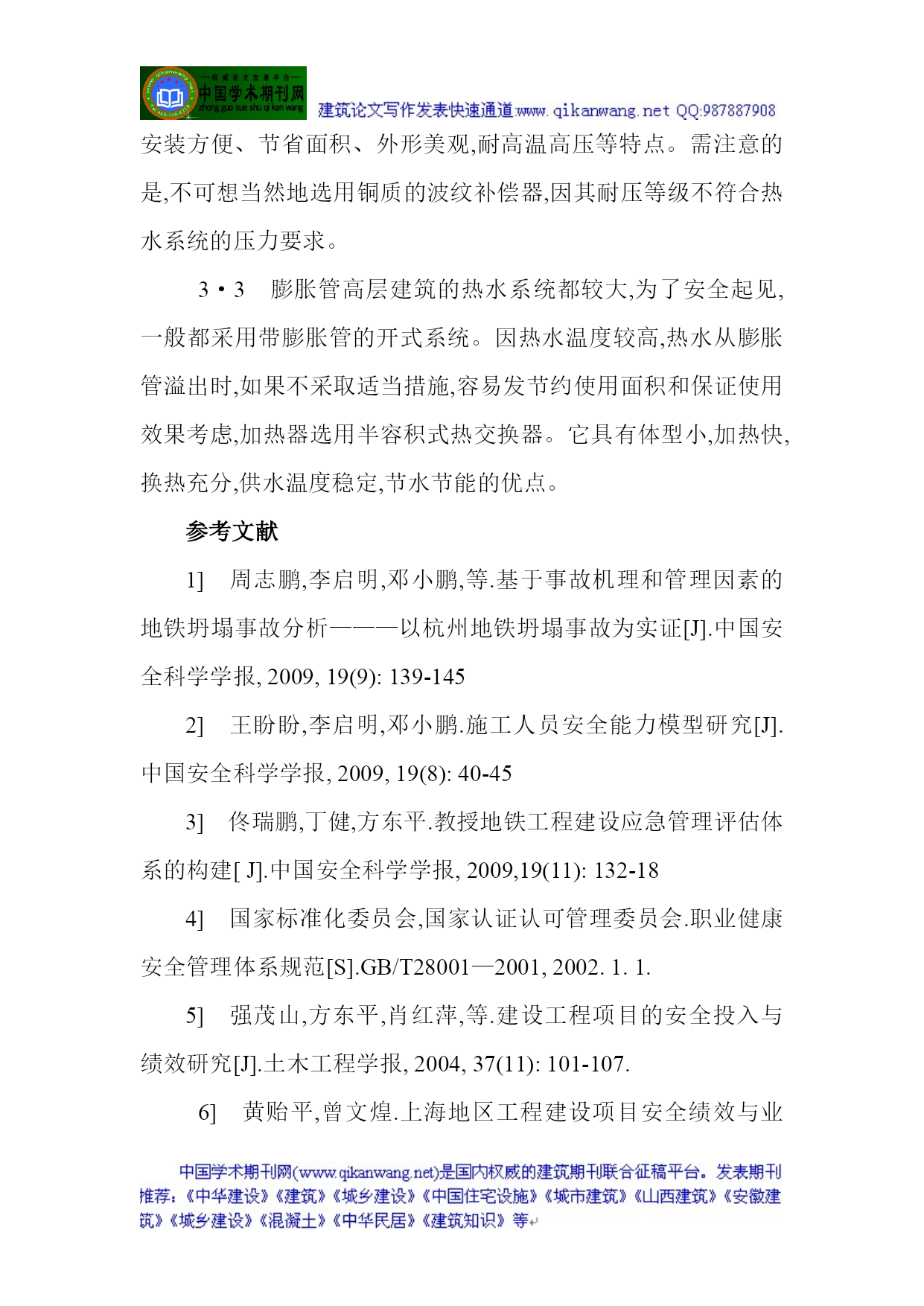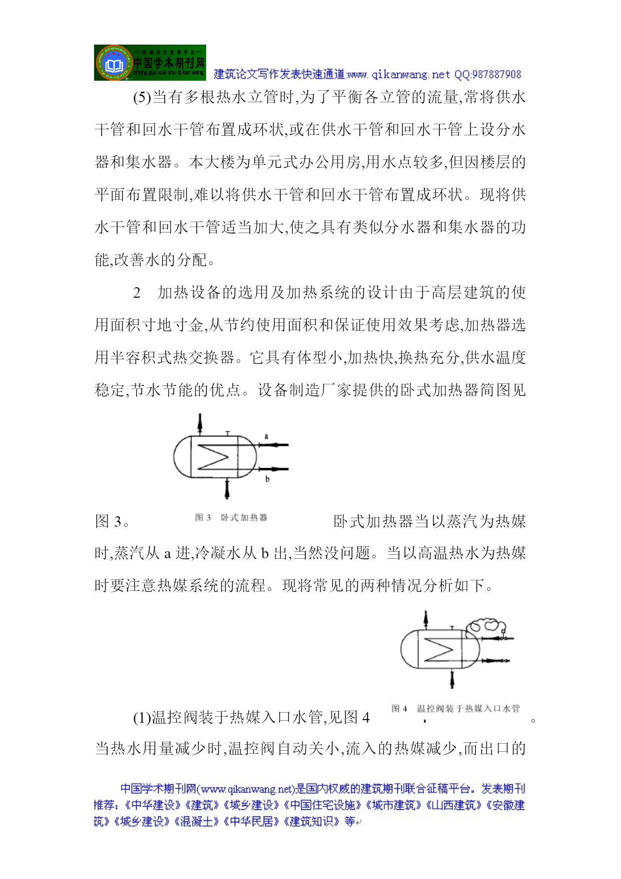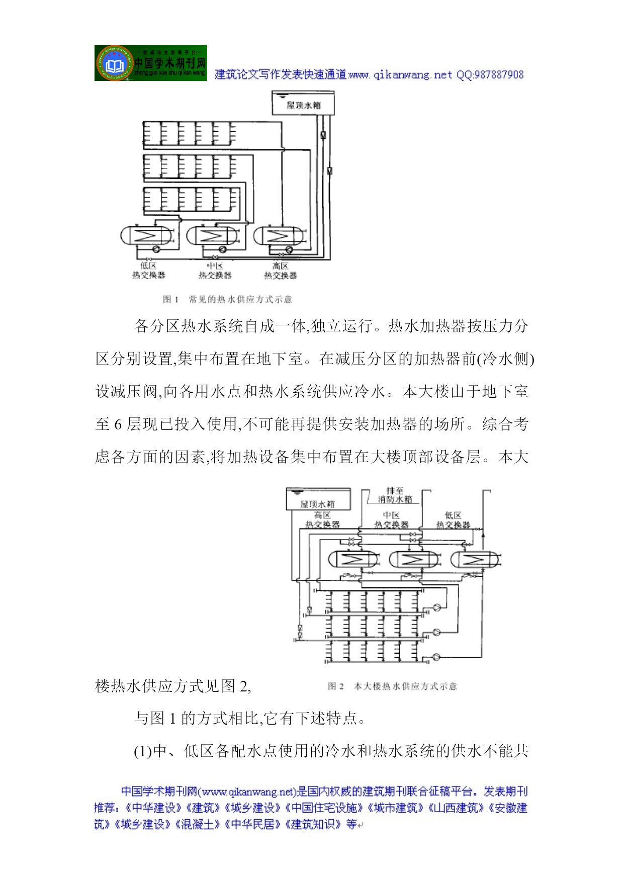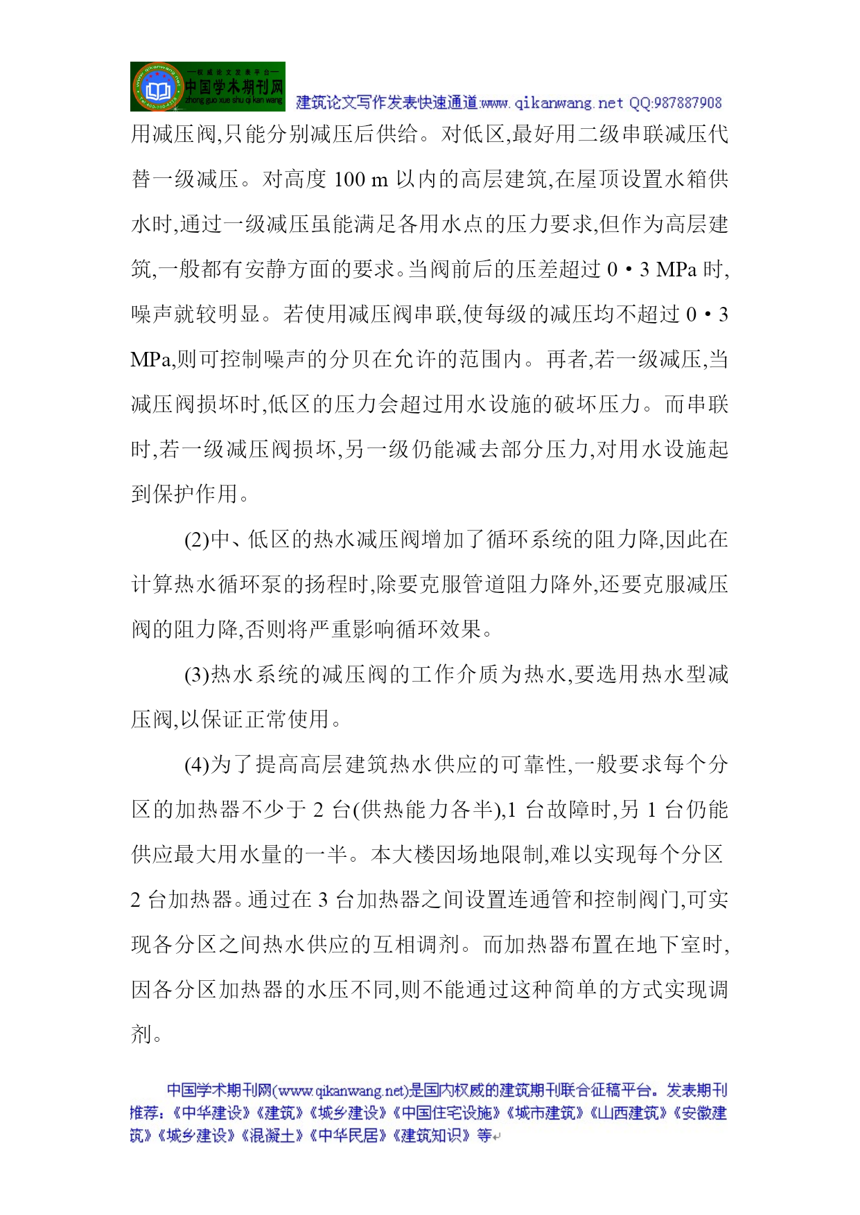 建筑水系统设计论文:建筑热水系统的设计体会【摘要】介绍了高层建筑的加热器布置在顶部设备层时,热水供应系统的特点,温控阀的安装事宜,减压阀、伸缩器、膨胀管、热水循环泵等的选用或安装要点。关键词高层建筑热水供应系统加热系统减压阀伸缩器膨胀管热水循环泵0概述上海某大楼属Ⅰ类高层民用建筑,高99·7m,地下1~2层为车库,1~3层为商场,4层为休闲健身,5~21层为单元式办公用房,22~24层为会议展览用房。1998年完成设计,后因资金问题,仅完成6层的建设并已投入使用。2002年又开始续建工程的重新设计。新设计既要考虑与原有设施的衔接,又要满足大楼新的功能要求,还要满足新的规范的要求。下面结合工程实际,谈谈高层建筑热水系统的设计体会。1热水供应系统的设计根据高层建筑使用热水的特点,热水供应系统要实行与给水系统一致的竖向分区,并由相应的给水系统供水,保证各用水点的冷、热水压力均衡,以取得良好的使用效果。常见的热水供应方式见图1,各分区热水系统自成一体,独立运行。热水加热器按压力分区分别设置,集中布置在地下室。在减压分区的加热器前(冷水侧)设减压阀,向各用水点和热水系统供应冷水。本大楼由于地下室至6层现已投入使用,不可能再提供安装加热器的场所。综合考虑各方面的因素,将加热设备集中布置在大楼顶部设备层。本大楼热水供应方式见图2,与图1的方式相比,它有下述特点。(1)中、低区各配水点使用的冷水和热水系统的供水不能共用减压阀,只能分别减压后供给。对低区,最好用二级串联减压代替一级减压。对高度100m以内的高层建筑,在屋顶设置水箱供水时,通过一级减压虽能满足各用水点的压力要求,但作为高层建筑,一般都有安静方面的要求。当阀前后的压差超过0·3MPa时,噪声就较明显。若使用减压阀串联,使每级的减压均不超过0·3MPa,则可控制噪声的分贝在允许的范围内。再者,若一级减压,当减压阀损坏时,低区的压力会超过用水设施的破坏压力。而串联时,若一级减压阀损坏,另一级仍能减去部分压力,对用水设施起到保护作用。(2)中、低区的热水减压阀增加了循环系统的阻力降,因此在计算热水循环泵的扬程时,除要克服管道阻力降外,还要克服减压阀的阻力降,否则将严重影响循环效果。(3)热水系统的减压阀的工作介质为热水,要选用热水型减压阀,以保证正常使用。(4)为了提高高层建筑热水供应的可靠性,一般要求每个分区的加热器不少于2台(供热能力各半),1台故障时,另1台仍能供应最大用水量的一半。本大楼因场地限制,难以实现每个分区2台加热器。通过在3台加热器之间设置连通管和控制阀门,可实现各分区之间热水供应的互相调剂。而加热器布置在地下室时,因各分区加热器的水压不同,则不能通过这种简单的方式实现调剂。(5)当有多根热水立管时,为了平衡各立管的流量,常将供水干管和回水干管布置成环状,或在供水干管和回水干管上设分水器和集水器。本大楼为单元式办公用房,用水点较多,但因楼层的平面布置限制,难以将供水干管和回水干管布置成环状。现将供水干管和回水干管适当加大,使之具有类似分水器和集水器的功能,改善水的分配。2加热设备的选用及加热系统的设计由于高层建筑的使用面积寸地寸金,从节约使用面积和保证使用效果考虑,加热器选用半容积式热交换器。它具有体型小,加热快,换热充分,供水温度稳定,节水节能的优点。设备制造厂家提供的卧式加热器简图见图3。卧式加热器当以蒸汽为热媒时,蒸汽从a进,冷凝水从b出,当然没问题。当以高温热水为热媒时要注意热媒系统的流程。现将常见的两种情况分析如下。(1)温控阀装于热媒入口水管,见图4。当热水用量减少时,温控阀自动关小,流入的热媒减少,而出口的流量没有自动控制,如果流出的量不能与流入的量同步减少,就可能使热媒管中形成负压,产生气蚀,影响传热效果,甚至缩短加热器的使用寿命。(2)温控阀装于热媒出口水管,见图5。当热水用量减少时,温控阀自动关小,热媒管中的压力会相应增加,不会产生不良影响。另外,在高温热水的进出口水管上,建议均装上温度计和压力表,运行中通过查看进出口温度和压力的变化,可及时掌握加热器的状况,以适时采取必要的维护措施。需注意的是,当热媒管径小于80mm时,装温度计的管段要局部扩径为80mm,否则测量出的温度会有较大的偏差。3系统器材的选用及设置3·1减压阀因为中、低区各配水点使用的冷水和热水系统的供水不能共用减压阀,只能分别减压后供给。为了各配水点处压力平衡,应选用质量可靠的可调式减压阀,将同一分区的冷水和热水压力调至平衡。3·2伸缩器本大楼的配置要求较高,因此热水管道使用紫铜管。铜管的膨胀量较大,每米达1·37mm,因此直管较长时,要设置伸缩器。各种伸缩器中,以不锈钢波纹补偿器较好,它具有安装方便、节省面积、外形美观,耐高温高压等特点。需注意
