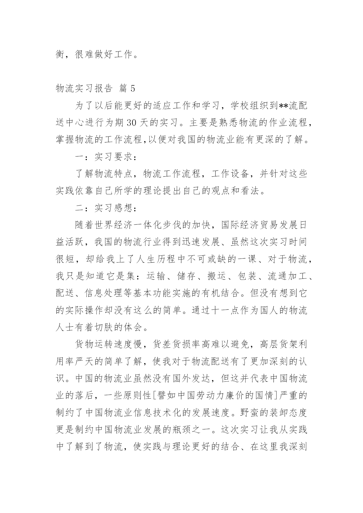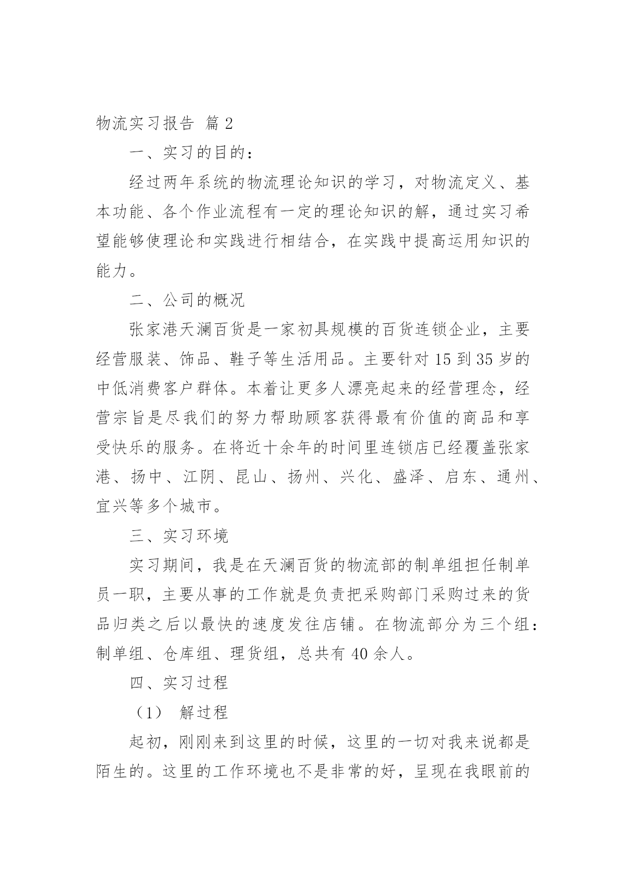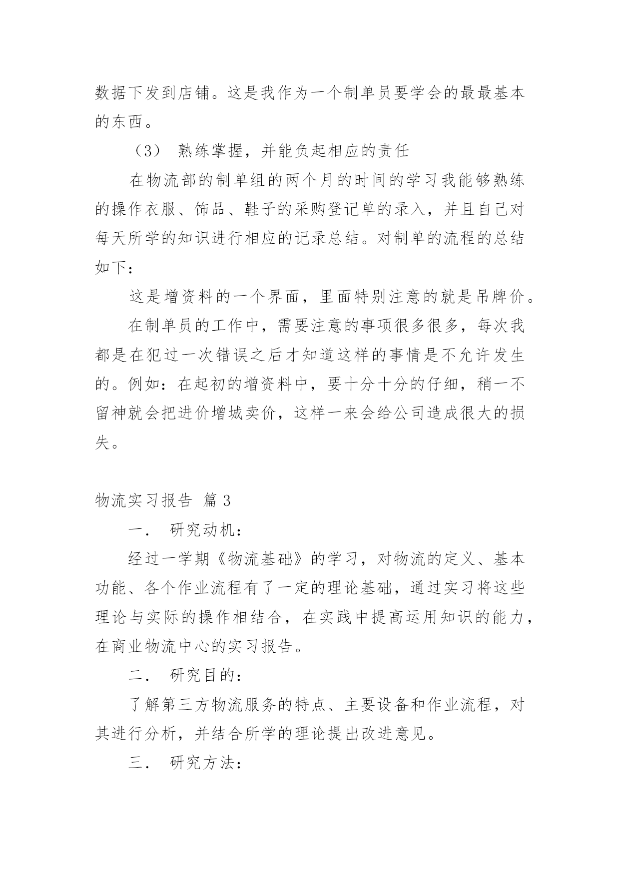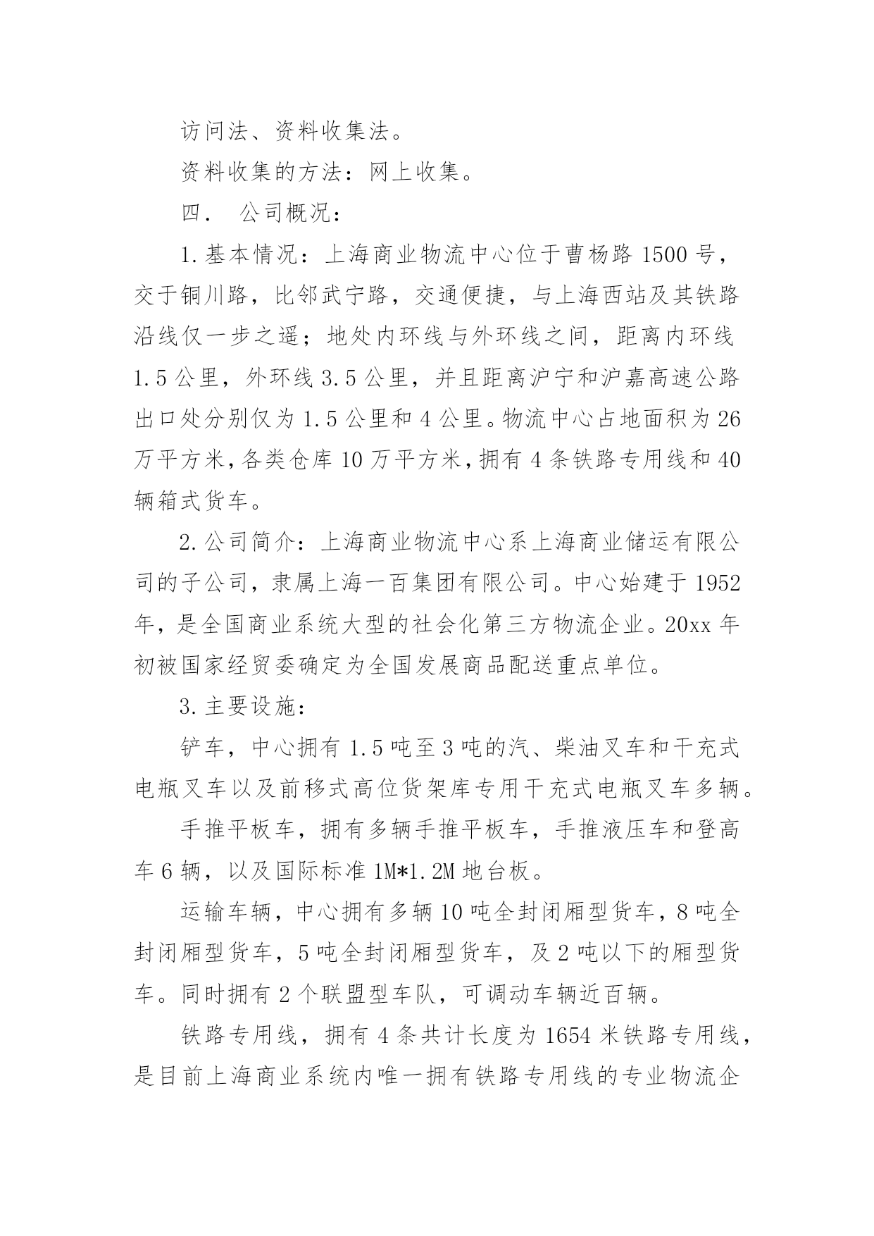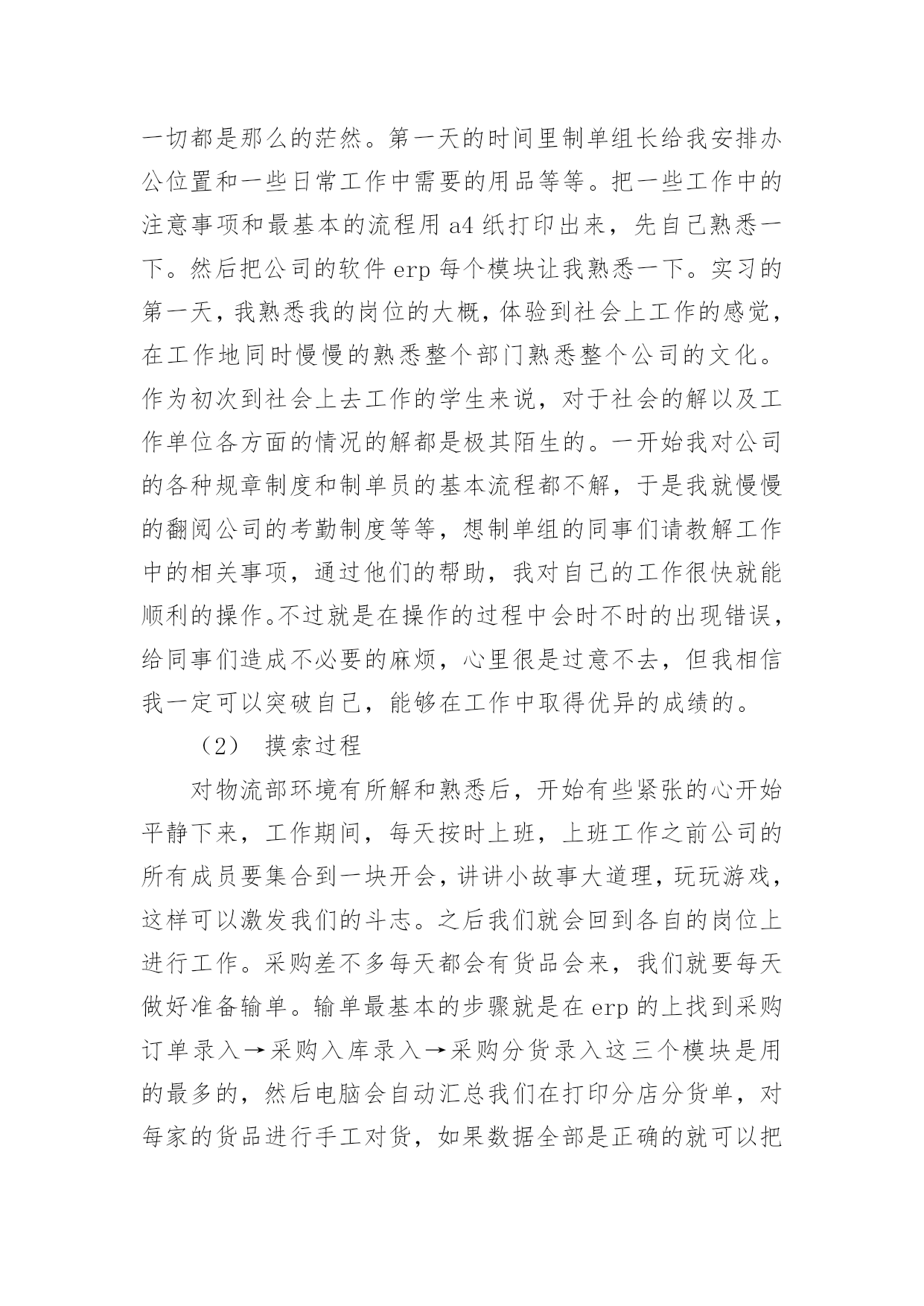 物流实习报告关于物流实习报告模板汇编9篇随着个人的文明素养不断提升,越来越多人会去使用报告,报告中提到的所有信息应该是准确无误的。你所见过的报告是什么样的呢?以下是小编为大家整理的物流实习报告9篇,希望能够帮助到大家。物流实习报告篇1时间过得太快了,这也将是我写的最后一篇周记了,我也要真真正正的离开学校了,以前盼望着上班倒真的离开了,还真有些不舍的,不舍得我的同学,我的宿舍,以及大学校园里的点点滴滴,那里有我青春的印记,有我年少的青涩,离开以后我就真的长大了,背着责任,离开生活两年多的校园在这段实习的日子里,我学到了很多书本上学不到的东西。现在的我不再是那个什么都不懂得小小子了,有自己的见解,也可以独立去面对工作中所遇到的一切问题。不会畏惧一切困难,在实习期间我们接触社会,面对社会上的一切美好的,黑暗的事物。去磨练自己的意志,锻炼自己的各方面才能,发觉自己的潜力。在这段时间,我收获的东西真是数不胜数呀.这将是我以后工作的经验啊物流实习报告篇2一、实习的目的:经过两年系统的物流理论知识的学习,对物流定义、基本功能、各个作业流程有一定的理论知识的解,通过实习希望能够使理论和实践进行相结合,在实践中提高运用知识的能力。二、公司的概况张家港天澜百货是一家初具规模的百货连锁企业,主要经营服装、饰品、鞋子等生活用品。主要针对15到35岁的中低消费客户群体。本着让更多人漂亮起来的经营理念,经营宗旨是尽我们的努力帮助顾客获得最有价值的商品和享受快乐的服务。在将近十余年的时间里连锁店已经覆盖张家港、扬中、江阴、昆山、扬州、兴化、盛泽、启东、通州、宜兴等多个城市。三、实习环境实习期间,我是在天澜百货的物流部的制单组担任制单员一职,主要从事的工作就是负责把采购部门采购过来的货品归类之后以最快的速度发往店铺。在物流部分为三个组:制单组、仓库组、理货组,总共有40余人。四、实习过程(1)解过程起初,刚刚来到这里的时候,这里的一切对我来说都是陌生的。这里的工作环境也不是非常的好,呈现在我眼前的一切都是那么的茫然。第一天的时间里制单组长给我安排办公位置和一些日常工作中需要的用品等等。把一些工作中的注意事项和最基本的流程用a4纸打印出来,先自己熟悉一下。然后把公司的软件erp每个模块让我熟悉一下。实习的第一天,我熟悉我的岗位的大概,体验到社会上工作的感觉,在工作地同时慢慢的熟悉整个部门熟悉整个公司的文化。作为初次到社会上去工作的学生来说,对于社会的解以及工作单位各方面的情况的解都是极其陌生的。一开始我对公司的各种规章制度和制单员的基本流程都不解,于是我就慢慢的翻阅公司的考勤制度等等,想制单组的同事们请教解工作中的相关事项,通过他们的帮助,我对自己的工作很快就能顺利的操作。不过就是在操作的过程中会时不时的出现错误,给同事们造成不必要的麻烦,心里很是过意不去,但我相信我一定可以突破自己,能够在工作中取得优异的成绩的。(2)摸索过程对物流部环境有所解和熟悉后,开始有些紧张的心开始平静下来,工作期间,每天按时上班,上班工作之前公司的所有成员要集合到一块开会,讲讲小故事大道理,玩玩游戏,这样可以激发我们的斗志。之后我们就会回到各自的岗位上进行工作。采购差不多每天都会有货品会来,我们就要每天做好准备输单。输单最基本的步骤就是在erp的上找到采购订单录入→采购入库录入→采购分货录入这三个模块是用的最多的,然后电脑会自动汇总我们在打印分店分货单,对每家的货品进行手工对货,如果数据全部是正确的就可以把数据下发到店铺。这是我作为一个制单员要学会的最最基本的东西。(3)熟练掌握,并能负起相应的责任在物流部的制单组的两个月的时间的学习我能够熟练的操作衣服、饰品、鞋子的采购登记单的录入,并且自己对每天所学的知识进行相应的记录总结。对制单的流程的总结如下:这是增资料的一个界面,里面特别注意的就是吊牌价。在制单员的工作中,需要注意的事项很多很多,每次我都是在犯过一次错误之后才知道这样的事情是不允许发生的。例如:在起初的增资料中,要十分十分的仔细,稍一不留神就会把进价增城卖价,这样一来会给公司造成很大的损失。物流实习报告篇3一.研究动机:经过一学期《物流基础》的学习,对物流的定义、基本功能、各个作业流程有了一定的理论基础,通过实习将这些理论与实际的操作相结合,在实践中提高运用知识的能力,在商业物流中心的实习报告。二.研究目的:了解第三方物流服务的特点、主要设备和作业流程,对其进行分析,并结合所学的理论提出改进意见。三.研究方法:访问法、资料收集法。资料收集的方法:网上收集。四.公司概况:1.基本情况:上海商业物流中心位于曹杨路1500号,交于铜川路,比邻武宁路,交通便捷,与上海西站及其铁路沿线仅一步之遥;地处内环线与外环线之间,距离内环线1.5公里,外环线3.5公里,并且距离沪宁和沪嘉