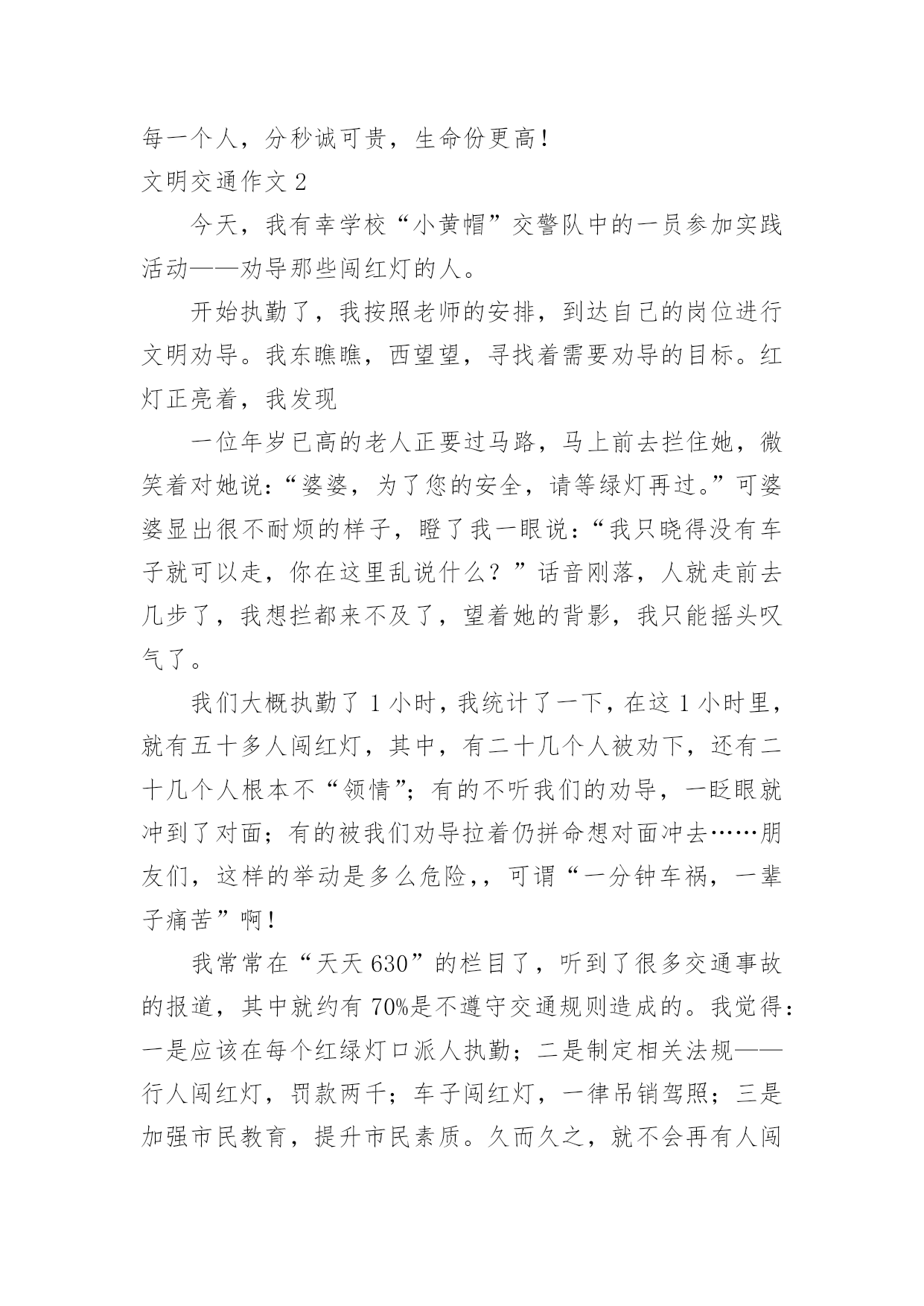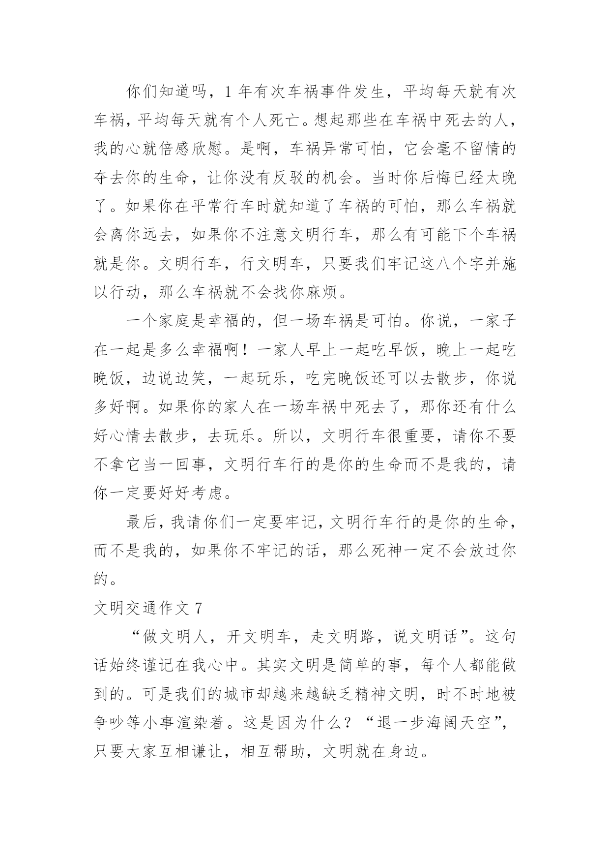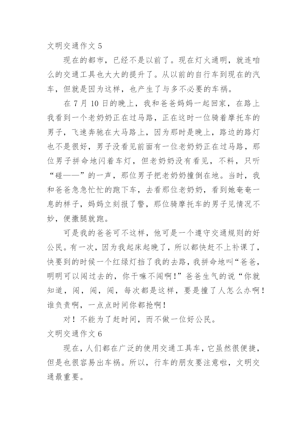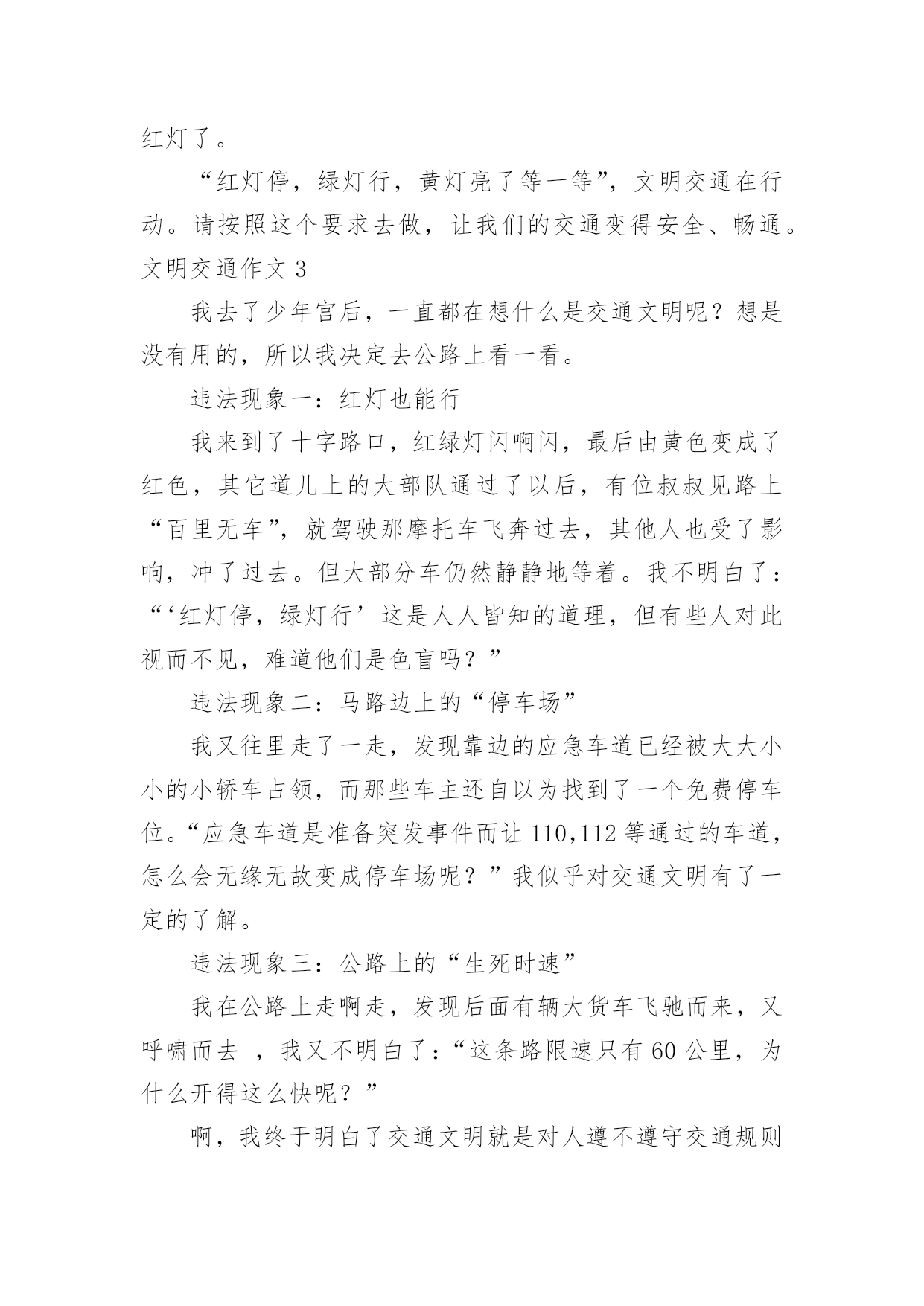 文明交通作文【荐】文明交通作文无论在学习、工作或是生活中,大家都经常接触到作文吧,作文根据写作时限的不同可以分为限时作文和非限时作文。那要怎么写好作文呢?下面是小编帮大家整理的文明交通作文,欢迎阅读与收藏。文明交通作文1有些交通事故是因为司机酒后驾驶,因神志不清导致交通事故,在此提醒司机叔叔阿姨们,希望您在开车前少喝酒,不要逞能。如果喝酒了,就要坐出租车或公交车回家,避免交通事故给您和他人带来麻烦。我曾经有亲眼看过一条生命是怎样死于交通的。有一天上午,一名喝的烂醉的司机开着私家车奔驰在马路上。正巧,一只黑色流浪狗走向马路中间,车像一匹脱了缰的野马冲向狗。只听小狗的一声嘶叫,便倒在血泊里……这是一条多么可爱的生命啊,这只小狗太可怜了,虽然汽车给我们带来的方便很大,但是夺去无辜生命的人太多太多了。我还记得从前学过的关于安全的儿歌,“交通安全很重要,交通秩序要记牢;从小养成好习惯,不在马路玩游戏;行走要走人行道,没有行道往右靠;一慢二看三通过,莫与车辆去抢道。”大家一定要把“文明交通,平安出行”这句话记在心中,时刻牢记血的教训。让我们不断地掌握更多的交通知识,时刻遵守交通规则,感染身边每一个人,分秒诚可贵,生命份更高!文明交通作文2今天,我有幸学校“小黄帽”交警队中的一员参加实践活动——劝导那些闯红灯的人。开始执勤了,我按照老师的安排,到达自己的岗位进行文明劝导。我东瞧瞧,西望望,寻找着需要劝导的目标。红灯正亮着,我发现一位年岁已高的老人正要过马路,马上前去拦住她,微笑着对她说:“婆婆,为了您的安全,请等绿灯再过。”可婆婆显出很不耐烦的样子,瞪了我一眼说:“我只晓得没有车子就可以走,你在这里乱说什么?”话音刚落,人就走前去几步了,我想拦都来不及了,望着她的背影,我只能摇头叹气了。我们大概执勤了1小时,我统计了一下,在这1小时里,就有五十多人闯红灯,其中,有二十几个人被劝下,还有二十几个人根本不“领情”;有的不听我们的劝导,一眨眼就冲到了对面;有的被我们劝导拉着仍拼命想对面冲去……朋友们,这样的举动是多么危险,,可谓“一分钟车祸,一辈子痛苦”啊!我常常在“天天630”的栏目了,听到了很多交通事故的报道,其中就约有70%是不遵守交通规则造成的。我觉得:一是应该在每个红绿灯口派人执勤;二是制定相关法规——行人闯红灯,罚款两千;车子闯红灯,一律吊销驾照;三是加强市民教育,提升市民素质。久而久之,就不会再有人闯红灯了。“红灯停,绿灯行,黄灯亮了等一等”,文明交通在行动。请按照这个要求去做,让我们的交通变得安全、畅通。文明交通作文3我去了少年宫后,一直都在想什么是交通文明呢?想是没有用的,所以我决定去公路上看一看。违法现象一:红灯也能行我来到了十字路口,红绿灯闪啊闪,最后由黄色变成了红色,其它道儿上的大部队通过了以后,有位叔叔见路上“百里无车”,就驾驶那摩托车飞奔过去,其他人也受了影响,冲了过去。但大部分车仍然静静地等着。我不明白了:“‘红灯停,绿灯行’这是人人皆知的道理,但有些人对此视而不见,难道他们是色盲吗?”违法现象二:马路边上的“停车场”我又往里走了一走,发现靠边的应急车道已经被大大小小的小轿车占领,而那些车主还自以为找到了一个免费停车位。“应急车道是准备突发事件而让110,112等通过的车道,怎么会无缘无故变成停车场呢?”我似乎对交通文明有了一定的了解。违法现象三:公路上的“生死时速”我在公路上走啊走,发现后面有辆大货车飞驰而来,又呼啸而去,我又不明白了:“这条路限速只有60公里,为什么开得这么快呢?”啊,我终于明白了交通文明就是对人遵不遵守交通规则的体现,我们太缺少交通文明的意识了,所以要从小养成遵守交通规则的习惯,做一个“交通文明人”。文明交通作文4不管是刮风下雨还是夏日炎炎,我们都能看到马路中央穿着黄背心,熟练地指挥着交通的警察叔叔。“有这么多红绿灯,为什么还要警察叔叔呢?”我不解地问妈妈。妈妈告诉我,这是因为大家都没有遵守交通规则。行人应该走人行道,自行车、机动车应该走非机动车道,汽车、公交车开机动车道,大家各行各道。但是有些人为了争一时之快,往往做出一些不文明的行为。记得有一次,妈妈带我去看电影。路上看见有一辆黑色电瓶车,在红灯快要结束的时候,就开了过去,结果那辆电瓶车被警察叔叔叫住了。车主知道自己闯红灯了,乖乖地交了罚款,就灰溜溜地开走了。我在想,这样做太丢脸了,我们可不能犯这种错误。等我们到了下一个十字路口时,发现一辆粉红色的电瓶车和汽车撞在了一起。那个电动车主人摔在地上起不来。后来警察叔叔到了,发现电瓶车乱开车道,而那个汽车司机速度较快,两个人都有错,都罚了款。后来我发现:人行道上停了电动车,非机动车道上停着汽车,电动车没有路,只能上机动车道了。我想:只要大家都遵守交通规则,那样就可以避免很多交通事故。予人方便,予