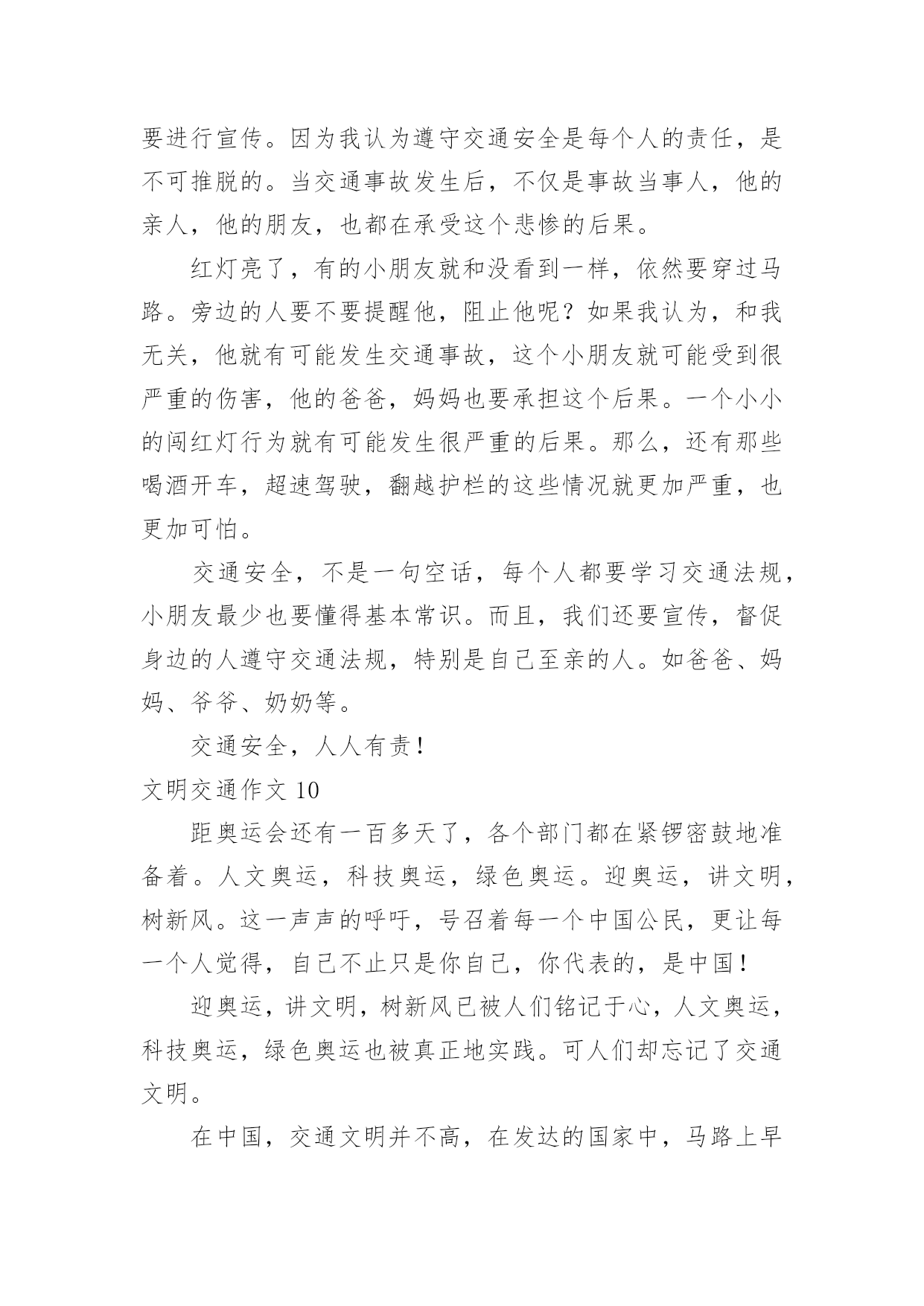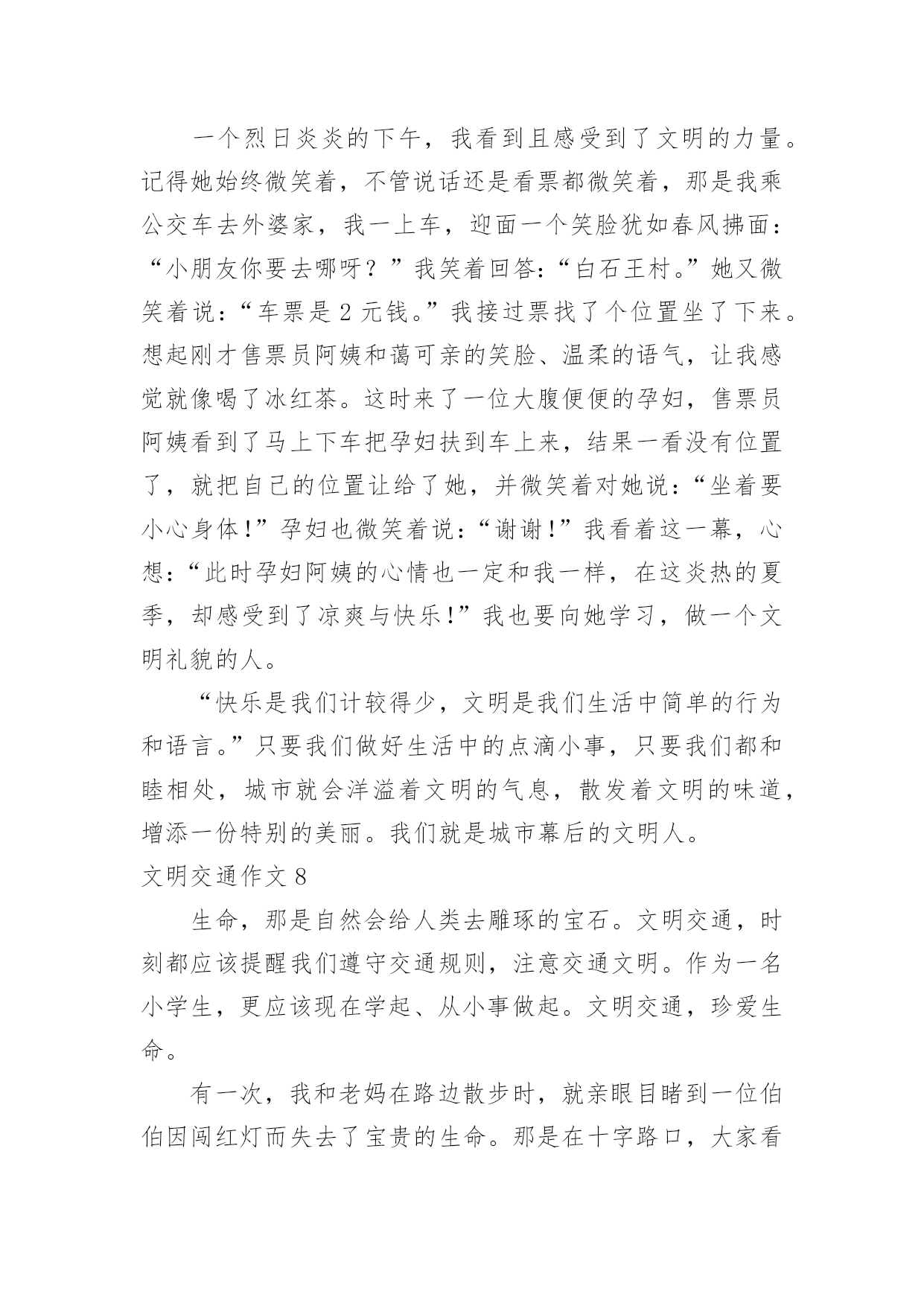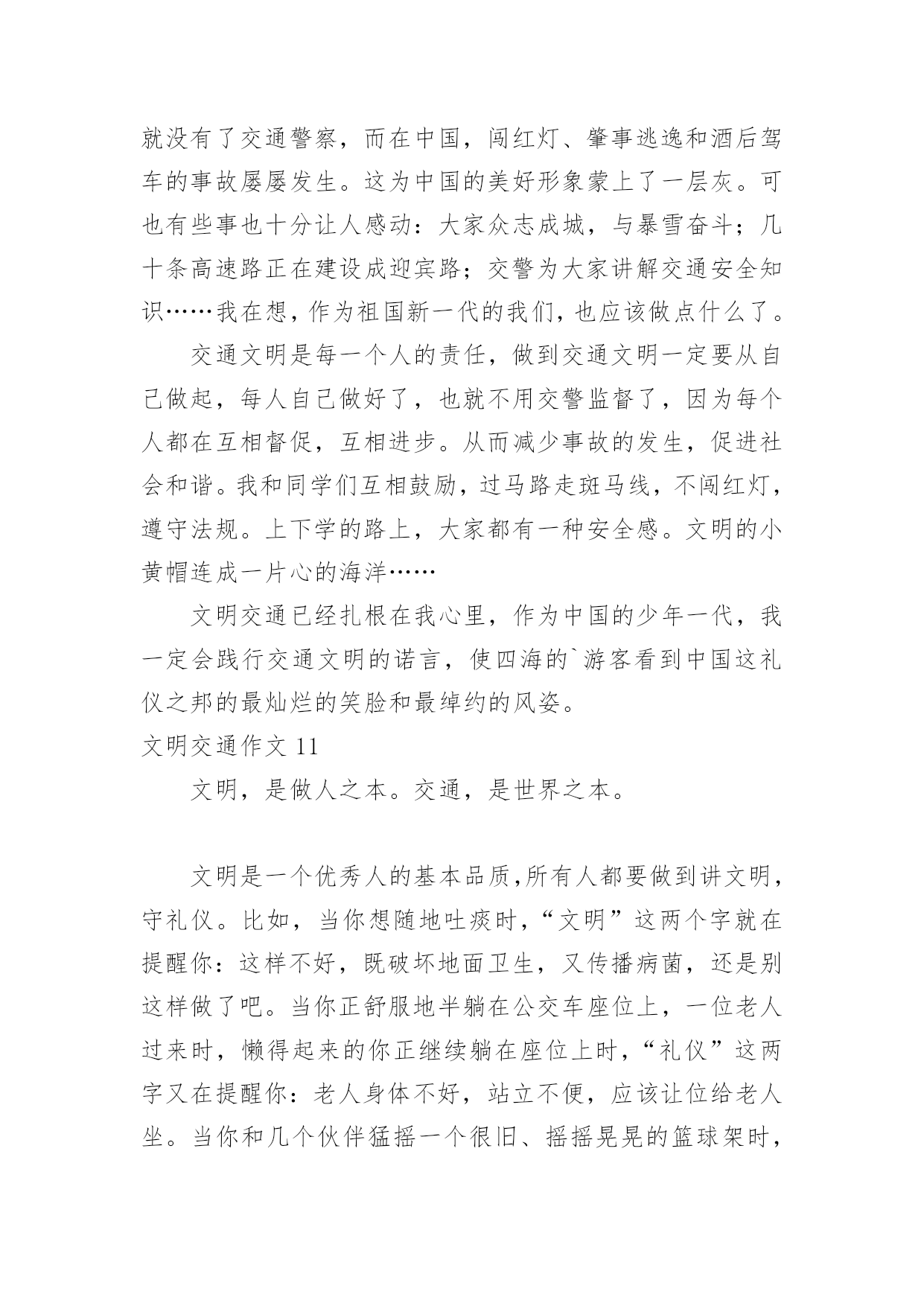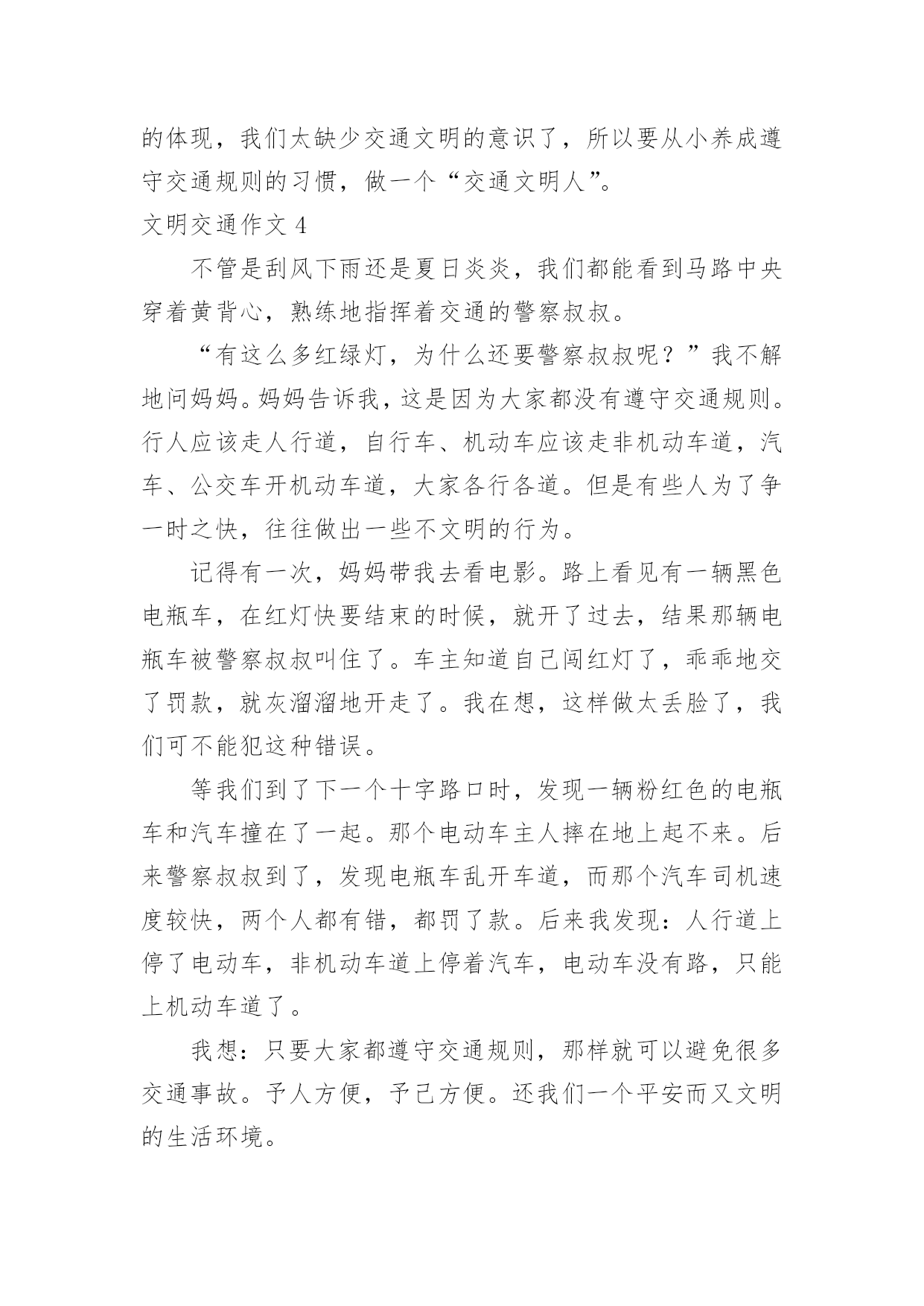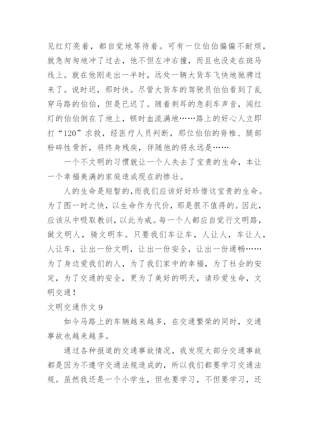文明交通作文【荐】文明交通作文无论在学习、工作或是生活中,大家都经常接触到作文吧,作文根据写作时限的不同可以分为限时作文和非限时作文。那要怎么写好作文呢?下面是小编帮大家整理的文明交通作文,欢迎阅读与收藏。文明交通作文1有些交通事故是因为司机酒后驾驶,因神志不清导致交通事故,在此提醒司机叔叔阿姨们,希望您在开车前少喝酒,不要逞能。如果喝酒了,就要坐出租车或公交车回家,避免交通事故给您和他人带来麻烦。我曾经有亲眼看过一条生命是怎样死于交通的。有一天上午,一名喝的烂醉的司机开着私家车奔驰在马路上。正巧,一只黑色流浪狗走向马路中间,车像一匹脱了缰的野马冲向狗。只听小狗的一声嘶叫,便倒在血泊里……这是一条多么可爱的生命啊,这只小狗太可怜了,虽然汽车给我们带来的方便很大,但是夺去无辜生命的人太多太多了。我还记得从前学过的关于安全的儿歌,“交通安全很重要,交通秩序要记牢;从小养成好习惯,不在马路玩游戏;行走要走人行道,没有行道往右靠;一慢二看三通过,莫与车辆去抢道。”大家一定要把“文明交通,平安出行”这句话记在心中,时刻牢记血的教训。让我们不断地掌握更多的交通知识,时刻遵守交通规则,感染身边每一个人,分秒诚可贵,生命份更高!文明交通作文2今天,我有幸学校“小黄帽”交警队中的一员参加实践活动——劝导那些闯红灯的人。开始执勤了,我按照老师的安排,到达自己的岗位进行文明劝导。我东瞧瞧,西望望,寻找着需要劝导的目标。红灯正亮着,我发现一位年岁已高的老人正要过马路,马上前去拦住她,微笑着对她说:“婆婆,为了您的安全,请等绿灯再过。”可婆婆显出很不耐烦的样子,瞪了我一眼说:“我只晓得没有车子就可以走,你在这里乱说什么?”话音刚落,人就走前去几步了,我想拦都来不及了,望着她的背影,我只能摇头叹气了。我们大概执勤了1小时,我统计了一下,在这1小时里,就有五十多人闯红灯,其中,有二十几个人被劝下,还有二十几个人根本不“领情”;有的不听我们的劝导,一眨眼就冲到了对面;有的被我们劝导拉着仍拼命想对面冲去……朋友们,这样的举动是多么危险,,可谓“一分钟车祸,一辈子痛苦”啊!我常常在“天天630”的栏目了,听到了很多交通事故的报道,其中就约有70%是不遵守交通规则造成的。我觉得:一是应该在每个红绿灯口派人执勤;二是制定相关法规——行人闯红灯,罚款两千;车子闯红灯,一律吊销驾照;三是加强市民教育,提升市民素质。久而久之,就不会再有人闯红灯了。“红灯停,绿灯行,黄灯亮了等一等”,文明交通在行动。请按照这个要求去做,让我们的交通变得安全、畅通。文明交通作文3我去了少年宫后,一直都在想什么是交通文明呢?想是没有用的,所以我决定去公路上看一看。违法现象一:红灯也能行我来到了十字路口,红绿灯闪啊闪,最后由黄色变成了红色,其它道儿上的大部队通过了以后,有位叔叔见路上“百里无车”,就驾驶那摩托车飞奔过去,其他人也受了影响,冲了过去。但大部分车仍然静静地等着。我不明白了:“‘红灯停,绿灯行’这是人人皆知的道理,但有些人对此视而不见,难道他们是色盲吗?”违法现象二:马路边上的“停车场”我又往里走了一走,发现靠边的应急车道已经被大大小小的小轿车占领,而那些车主还自以为找到了一个免费停车位。“应急车道是准备突发事件而让110,112等通过的车道,怎么会无缘无故变成停车场呢?”我似乎对交通文明有了一定的了解。违法现象三:公路上的“生死时速”我在公路上走啊走,发现后面有辆大货车飞驰而来,又呼啸而去,我又不明白了:“这条路限速只有60公里,为什么开得这么快呢?”啊,我终于明白了交通文明就是对人遵不遵守交通规则的体现,我们太缺少交通文明的意识了,所以要从小养成遵守交通规则的习惯,做一个“交通文明人”。文明交通作文4不管是刮风下雨还是夏日炎炎,我们都能看到马路中央穿着黄背心,熟练地指挥着交通的警察叔叔。“有这么多红绿灯,为什么还要警察叔叔呢?”我不解地问妈妈。妈妈告诉我,这是因为大家都没有遵守交通规则。行人应该走人行道,自行车、机动车应该走非机动车道,汽车、公交车开机动车道,大家各行各道。但是有些人为了争一时之快,往往做出一些不文明的行为。记得有一次,妈妈带我去看电影。路上看见有一辆黑色电瓶车,在红灯快要结束的时候,就开了过去,结果那辆电瓶车被警察叔叔叫住了。车主知道自己闯红灯了,乖乖地交了罚款,就灰溜溜地开走了。我在想,这样做太丢脸了,我们可不能犯这种错误。等我们到了下一个十字路口时,发现一辆粉红色的电瓶车和汽车撞在了一起。那个电动车主人摔在地上起不来。后来警察叔叔到了,发现电瓶车乱开车道,而那个汽车司机速度较快,两个人都有错,都罚了款。后来我发现:人行道上停了电动车,非机动车道上停着汽车,电动车没有路,只能上机动车道了。我想:只要大家都遵守交通规则,那样就可以避免很多交通事故。予人方便,予