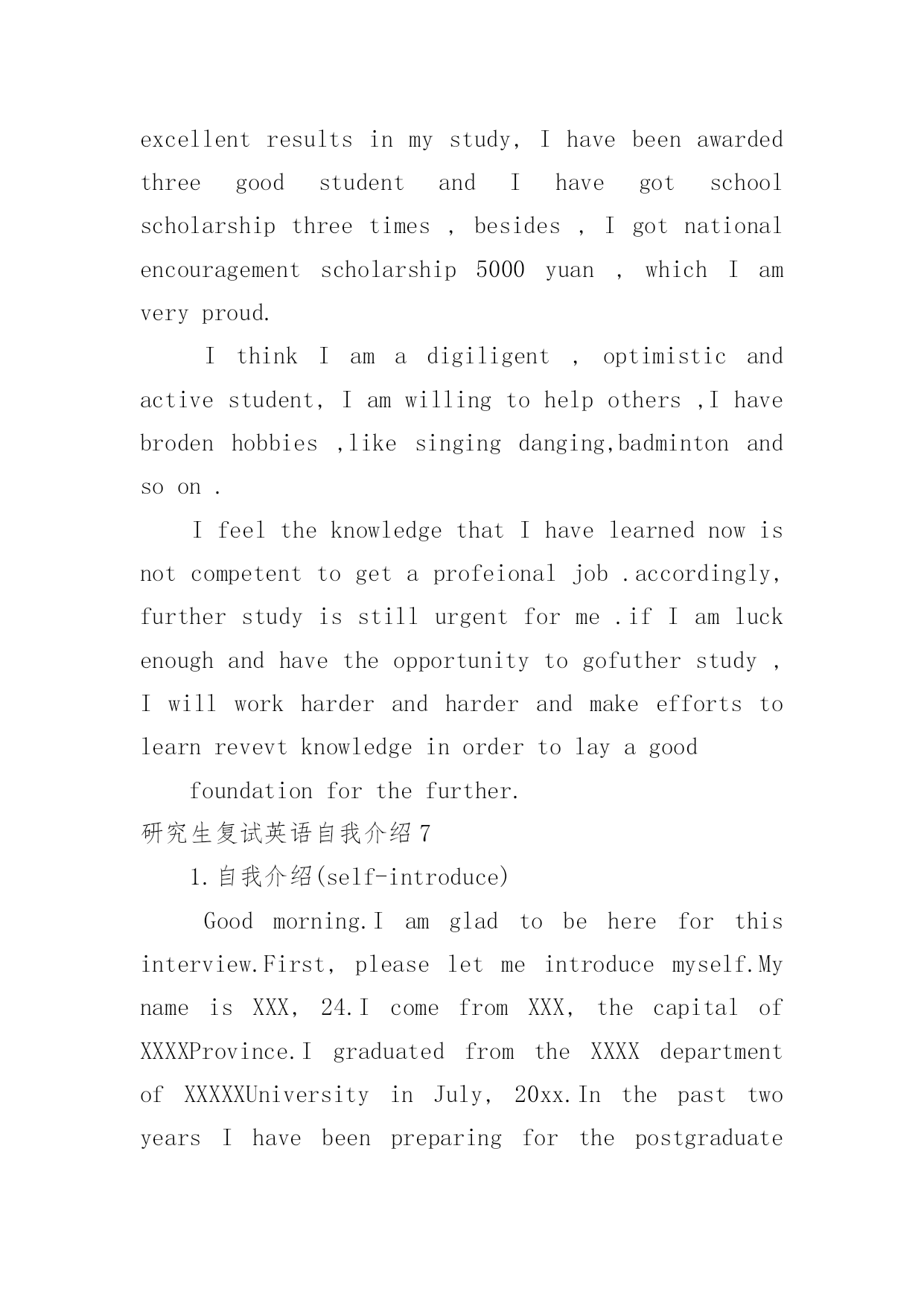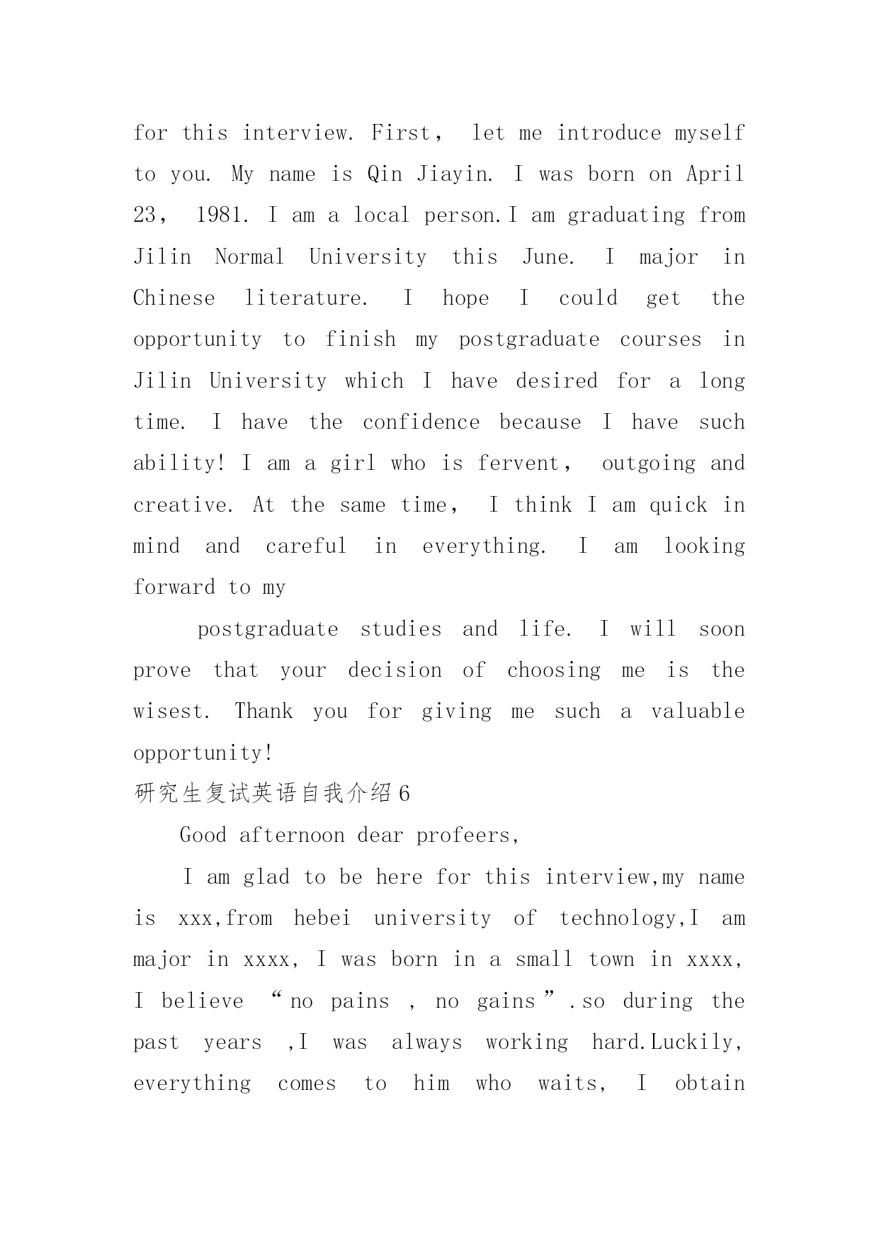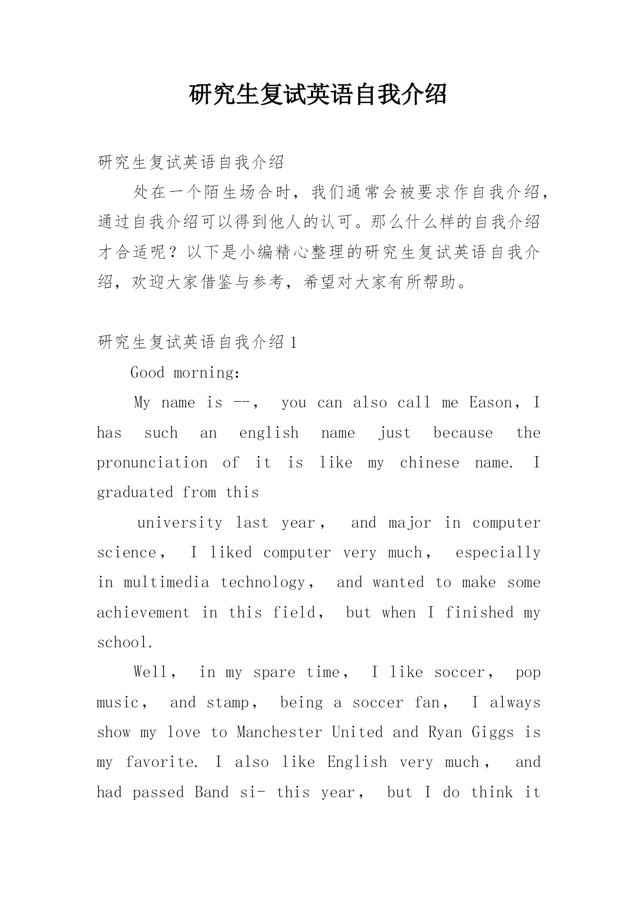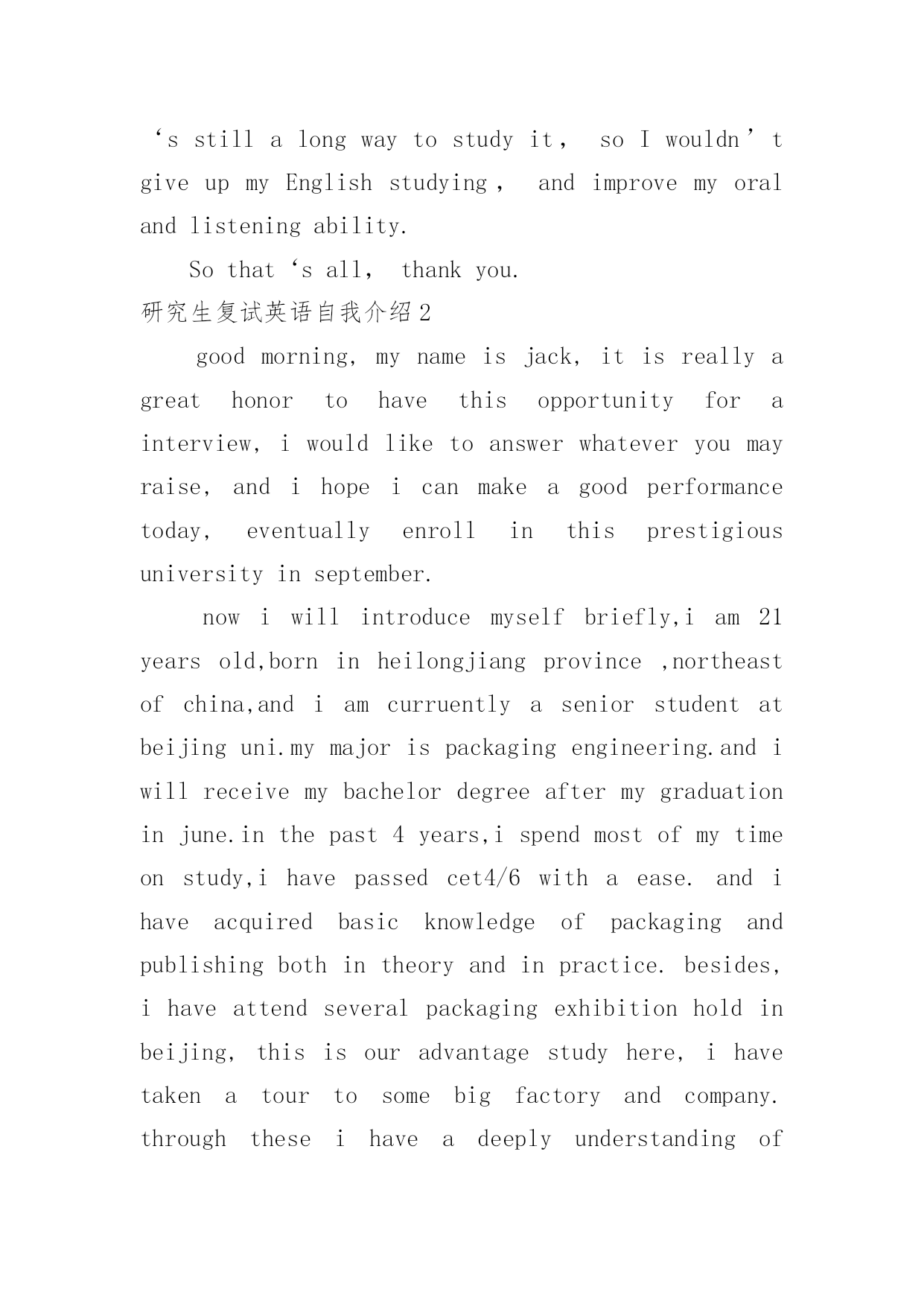 研究生复试英语自我介绍研究生复试英语自我介绍处在一个陌生场合时,我们通常会被要求作自我介绍,通过自我介绍可以得到他人的认可。那么什么样的自我介绍才合适呢?以下是小编精心整理的研究生复试英语自我介绍,欢迎大家借鉴与参考,希望对大家有所帮助。研究生复试英语自我介绍1Goodmorning:Mynameis--,youcanalsocallmeEason,Ihassuchanenglishnamejustbecausethepronunciationofitislikemychinesename.Igraduatedfromthisuniversitylastyear,andmajorincomputerscience,Ilikedcomputerverymuch,especiallyinmultimediatechnology,andwantedtomakesomeachievementinthisfield,butwhenIfinishedmyschool.Well,inmysparetime,Ilikesoccer,popmusic,andstamp,beingasoccerfan,IalwaysshowmylovetoManchesterUnitedandRyanGiggsismyfavorite.IalsolikeEnglishverymuch,andhadpassedBandsi-thisyear,butIdothinkit‘sstillalongwaytostudyit,soIwouldn’tgiveupmyEnglishstudying,andimprovemyoralandlisteningability.Sothat‘sall,thankyou.研究生复试英语自我介绍2goodmorning,mynameisjack,itisreallyagreathonortohavethisopportunityforainterview,iwouldliketoanswerwhateveryoumayraise,andihopeicanmakeagoodperformancetoday,eventuallyenrollinthisprestigiousuniversityinseptember.nowiwillintroducemyselfbriefly,iam21yearsold,borninheilongjiangprovince,northeastofchina,andiamcurruentlyaseniorstudentatbeijinguni.mymajorispackagingengineering.andiwillreceivemybachelordegreeaftermygraduationinjune.inthepast4years,ispendmostofmytimeonstudy,ihavepassedcet4/6withaease.andihaveacquiredbasicknowledgeofpackagingandpublishingbothintheoryandinpractice.besides,ihaveattendseveralpackagingexhibitionholdinbeijing,thisisouradvantagestudyhere,ihavetakenatourtosomebigfactoryandcompany.throughtheseihaveadeeplyunderstandingofdomesticpackagingindustry.comparedtodevelopedcountriessuchasus,unfortunately,althoughwehavemadeextraordinaryprogresssince1978,ourpackagingindustryarestillunderdeveloped,mess,unstable,thesituationofemployeesinthisfieldareawkard.butihavefullconfidenceinabrightfutureifonlyoureconomycankeepthegrowthpacestill.iguessyoumaybeinterestedinthereasonitchtolaw,andwhatismyplanduringgraduatestudylife,iwouldliketotellyouthatpursuelawisoneofmylifelonggoal,ilikemymajorpackagingandiwontgiveup,ificanpursuemymast