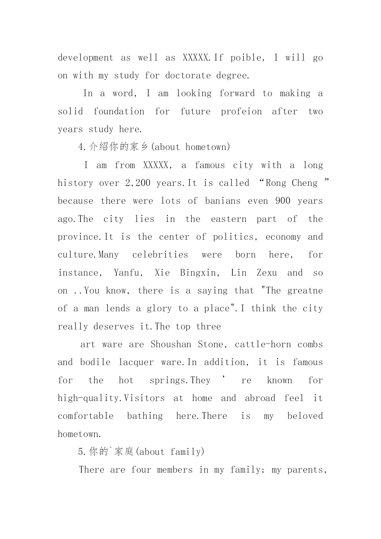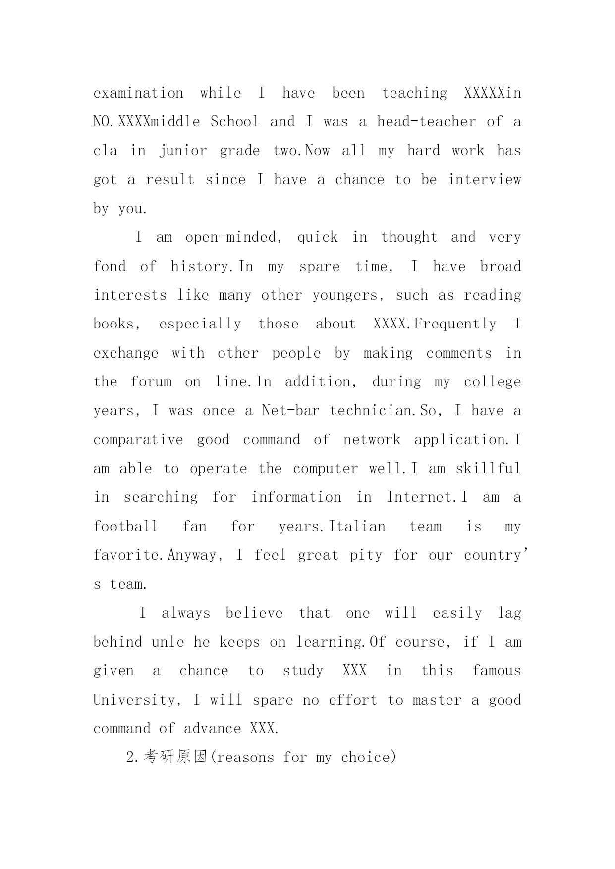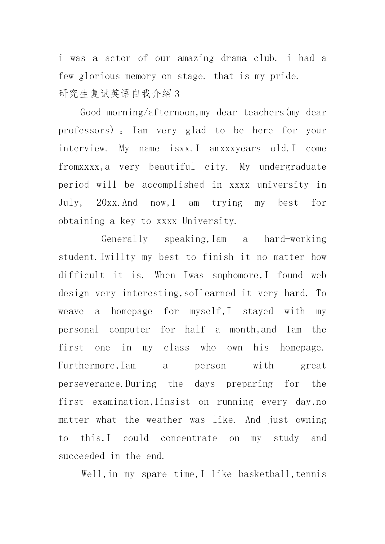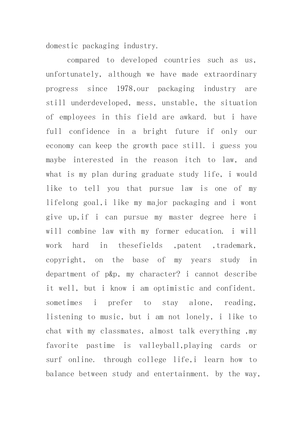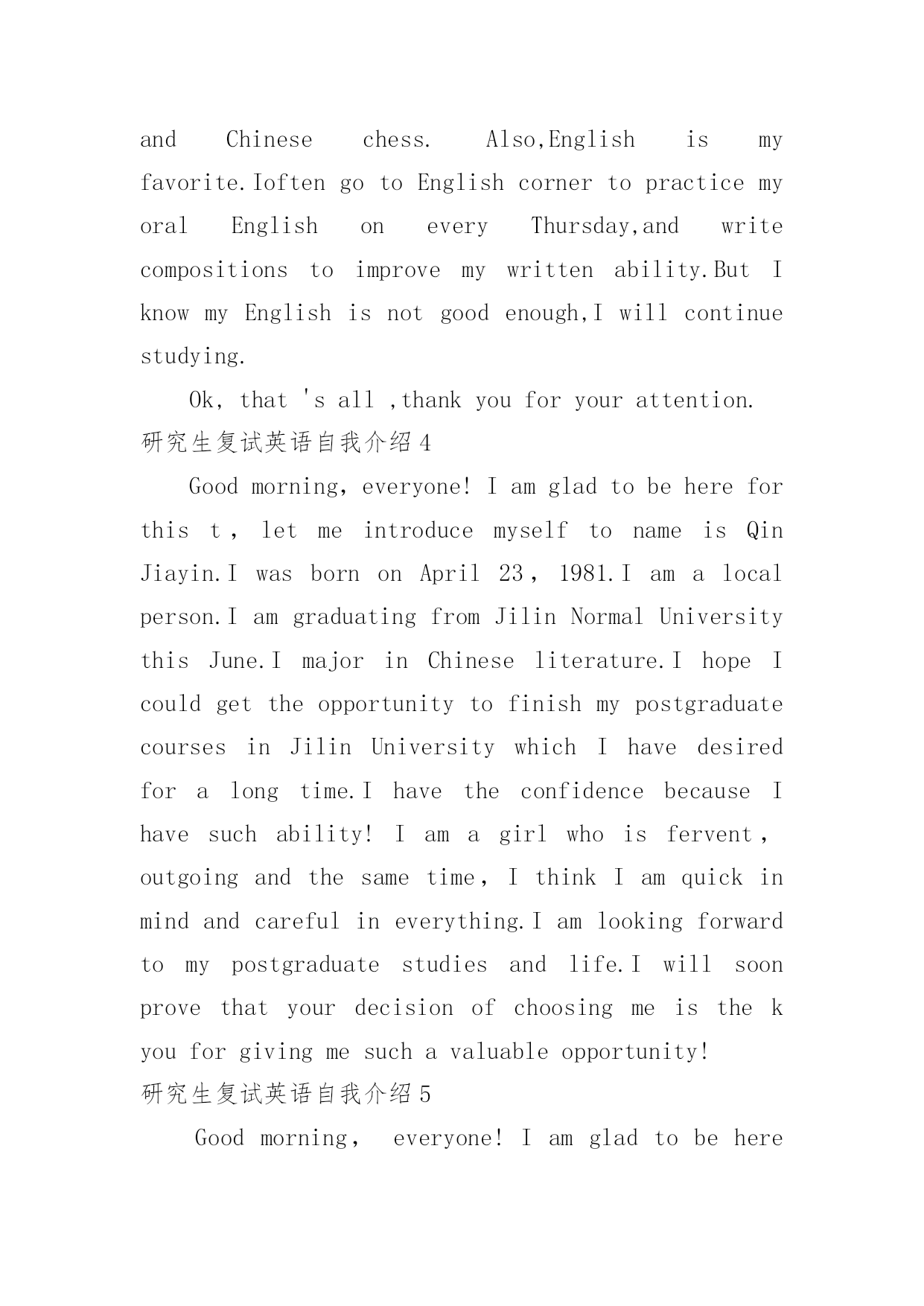 研究生复试英语自我介绍研究生复试英语自我介绍处在一个陌生场合时,我们通常会被要求作自我介绍,通过自我介绍可以得到他人的认可。那么什么样的自我介绍才合适呢?以下是小编精心整理的研究生复试英语自我介绍,欢迎大家借鉴与参考,希望对大家有所帮助。研究生复试英语自我介绍1Goodmorning:Mynameis--,youcanalsocallmeEason,Ihassuchanenglishnamejustbecausethepronunciationofitislikemychinesename.Igraduatedfromthisuniversitylastyear,andmajorincomputerscience,Ilikedcomputerverymuch,especiallyinmultimediatechnology,andwantedtomakesomeachievementinthisfield,butwhenIfinishedmyschool.Well,inmysparetime,Ilikesoccer,popmusic,andstamp,beingasoccerfan,IalwaysshowmylovetoManchesterUnitedandRyanGiggsismyfavorite.IalsolikeEnglishverymuch,andhadpassedBandsi-thisyear,butIdothinkit‘sstillalongwaytostudyit,soIwouldn’tgiveupmyEnglishstudying,andimprovemyoralandlisteningability.Sothat‘sall,thankyou.研究生复试英语自我介绍2goodmorning,mynameisjack,itisreallyagreathonortohavethisopportunityforainterview,iwouldliketoanswerwhateveryoumayraise,andihopeicanmakeagoodperformancetoday,eventuallyenrollinthisprestigiousuniversityinseptember.nowiwillintroducemyselfbriefly,iam21yearsold,borninheilongjiangprovince,northeastofchina,andiamcurruentlyaseniorstudentatbeijinguni.mymajorispackagingengineering.andiwillreceivemybachelordegreeaftermygraduationinjune.inthepast4years,ispendmostofmytimeonstudy,ihavepassedcet4/6withaease.andihaveacquiredbasicknowledgeofpackagingandpublishingbothintheoryandinpractice.besides,ihaveattendseveralpackagingexhibitionholdinbeijing,thisisouradvantagestudyhere,ihavetakenatourtosomebigfactoryandcompany.throughtheseihaveadeeplyunderstandingofdomesticpackagingindustry.comparedtodevelopedcountriessuchasus,unfortunately,althoughwehavemadeextraordinaryprogresssince1978,ourpackagingindustryarestillunderdeveloped,mess,unstable,thesituationofemployeesinthisfieldareawkard.butihavefullconfidenceinabrightfutureifonlyoureconomycankeepthegrowthpacestill.iguessyoumaybeinterestedinthereasonitchtolaw,andwhatismyplanduringgraduatestudylife,iwouldliketotellyouthatpursuelawisoneofmylifelonggoal,ilikemymajorpackagingandiwontgiveup,ificanpursuemymast