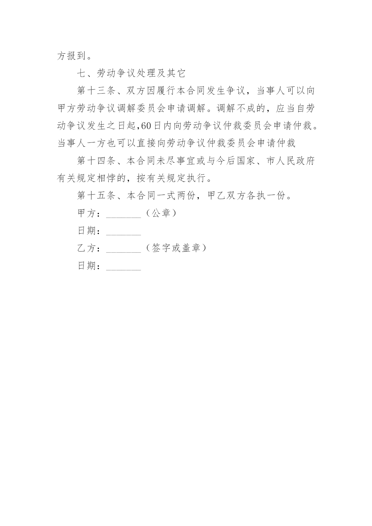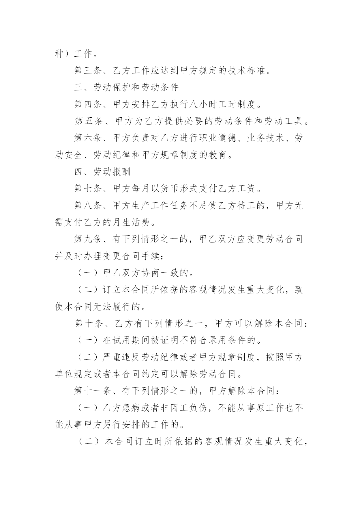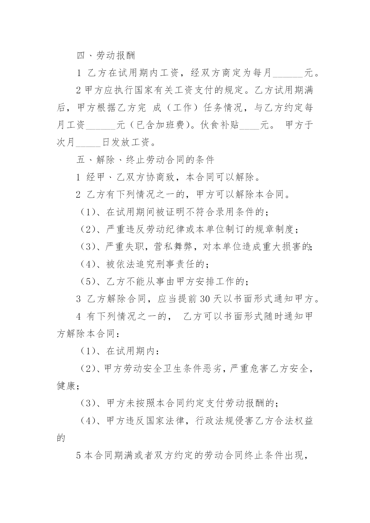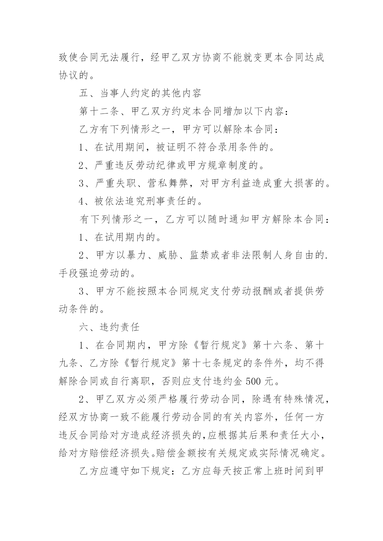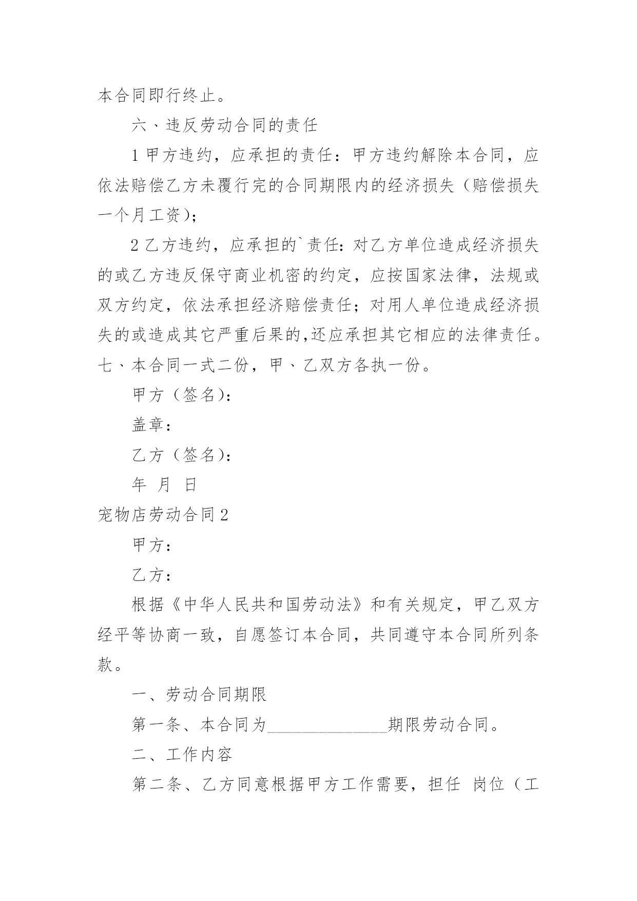 宠物店劳动合同宠物店劳动合同2篇随着广大人民群众法律意识的普遍提高,能够利用到合同的场合越来越多,合同是企业发展中一个非常重要的因素。那么大家知道合法的合同书怎么写吗?以下是小编整理的宠物店劳动合同,希望对大家有所帮助。宠物店劳动合同1甲方:乙方:依据中华人民共和国劳动法及国家﹑省﹑市﹑有关法律﹑法规﹑规章的规定,甲乙双方经平等协商一致,同意签订本劳动合同。一﹑合同期限1有固定期限:合同自年月日起,至年月日止。2无固定期限:合同自年月日起覆行。二﹑工作内容1甲方安排乙方从事__________________工作,乙方愿意服从甲方安排,并认真执行和完成生产任务。三﹑工作时间每天12小时,半月轮班,无固定休息日。四﹑劳动报酬1乙方在试用期内工资,经双方商定为每月______元。2甲方应执行国家有关工资支付的规定。乙方试用期满后,甲方根据乙方完成(工作)任务情况,与乙方约定每月工资______元(已含加班费)。伙食补贴____元。甲方于次月_____日发放工资。五﹑解除﹑终止劳动合同的条件1经甲﹑乙双方协商致,本合同可以解除。2乙方有下列情况之一的,甲方可以解除本合同。(1)、在试用期间被证明不符合录用条件的;(2)、严重违反劳动纪律或本单位制订的规章制度;(3)、严重失职,营私舞弊,对本单位造成重大损害的;(4)、被依法追究刑事责任的;(5)、乙方不能从事由甲方安排工作的;3乙方解除合同,应当提前30天以书面形式通知甲方。4有下列情况之一的,乙方可以书面形式随时通知甲方解除本合同:(1)、在试用期内:(2)、甲方劳动安全卫生条件恶劣,严重危害乙方安全,健康;(3)、甲方未按照本合同约定支付劳动报酬的;(4)、甲方违反国家法律,行政法规侵害乙方合法权益的5本合同期满或者双方约定的劳动合同终止条件出现,本合同即行终止。六﹑违反劳动合同的责任1甲方违约,应承担的责任:甲方违约解除本合同,应依法赔偿乙方未覆行完的合同期限内的经济损失(赔偿损失一个月工资);2乙方违约,应承担的`责任:对乙方单位造成经济损失的或乙方违反保守商业机密的约定,应按国家法律,法规或双方约定,依法承担经济赔偿责任;对用人单位造成经济损失的或造成其它严重后果的,还应承担其它相应的法律责任。七﹑本合同一式二份,甲﹑乙双方各执一份。甲方(签名):盖章:乙方(签名):年月日宠物店劳动合同2甲方:乙方:根据《中华人民共和国劳动法》和有关规定,甲乙双方经平等协商一致,自愿签订本合同,共同遵守本合同所列条款。一、劳动合同期限第一条、本合同为______________期限劳动合同。二、工作内容第二条、乙方同意根据甲方工作需要,担任岗位(工种)工作。第三条、乙方工作应达到甲方规定的技术标准。三、劳动保护和劳动条件第四条、甲方安排乙方执行八小时工时制度。第五条、甲方为乙方提供必要的劳动条件和劳动工具。第六条、甲方负责对乙方进行职业道德、业务技术、劳动安全、劳动纪律和甲方规章制度的教育。四、劳动报酬第七条、甲方每月以货币形式支付乙方工资。第八条、甲方生产工作任务不足使乙方待工的,甲方无需支付乙方的月生活费。第九条、有下列情形之一的,甲乙双方应变更劳动合同并及时办理变更合同手续:(一)甲乙双方协商一致的。(二)订立本合同所依据的客观情况发生重大变化,致使本合同无法履行的。第十条、乙方有下列情形之一,甲方可以解除本合同:(一)在试用期间被证明不符合录用条件的。(二)严重违反劳动纪律或者甲方规章制度,按照甲方单位规定或者本合同约定可以解除劳动合同。第十一条、有下列情形之一的,甲方解除本合同:(一)乙方患病或者非因工负伤,不能从事原工作也不能从事甲方另行安排的工作的。(二)本合同订立时所依据的客观情况发生重大变化,致使合同无法履行,经甲乙双方协商不能就变更本合同达成协议的。五、当事人约定的其他内容第十二条、甲乙双方约定本合同增加以下内容:乙方有下列情形之一,甲方可以解除本合同:1、在试用期间,被证明不符合录用条件的。2、严重违反劳动纪律或甲方规章制度的。3、严重失职、营私舞弊,对甲方利益造成重大损害的。4、被依法追究刑事责任的。有下列情形之一,乙方可以随时通知甲方解除本合同:1、在试用期内的。2、甲方以暴力、威胁、监禁或者非法限制人身自由的.手段强迫劳动的。3、甲方不能按照本合同规定支付劳动报酬或者提供劳动条件的。六、违约责任1、在合同期内,甲方除《暂行规定》第十六条、第十九条、乙方除《暂行规定》第十七条规定的条件外,均不得解除合同或自行离职,否则应支付违约金500元。2、甲乙双方必须严格履行劳动合同,除遇有特殊情况,经双方协商一致不能履行劳动合同的有关内容外,任何一方违反合同给对方造成经济损失的,应根据其后果和责任大小,给对方赔偿经济损失。赔偿金额按有关规定或实际情况确定。乙方应遵守如
