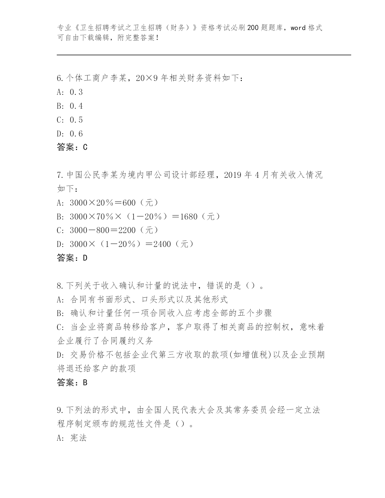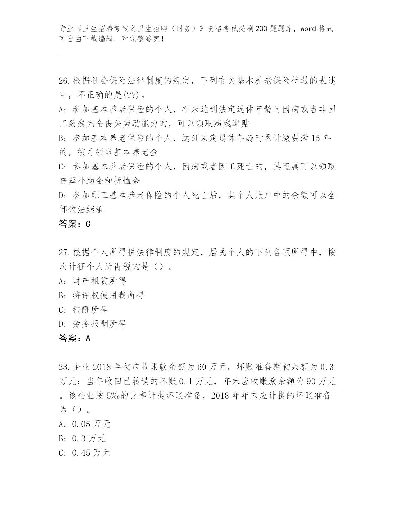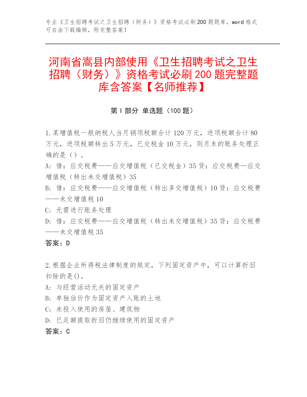 河南省嵩县内部使用《卫生招聘考试之卫生招聘(财务)》资格考试必刷200题完整题库含答案【名师推荐】