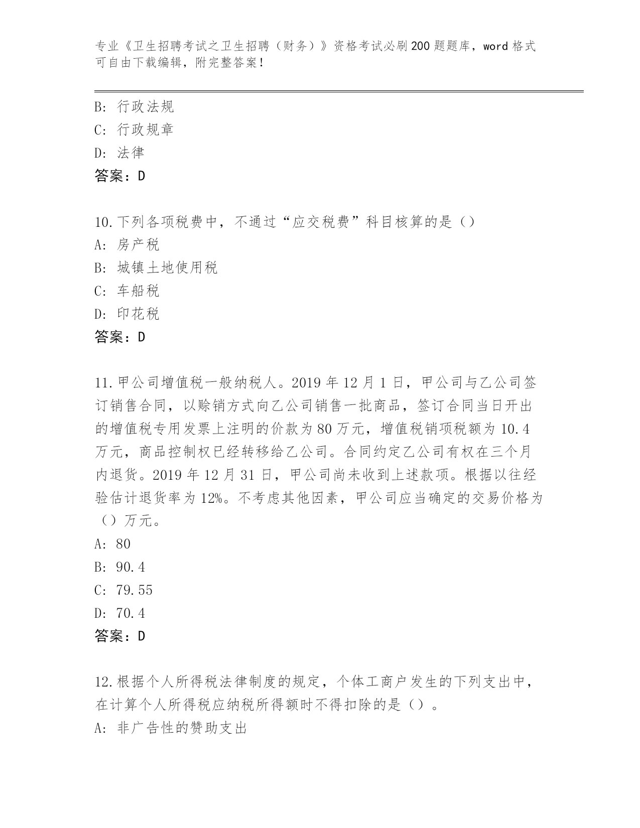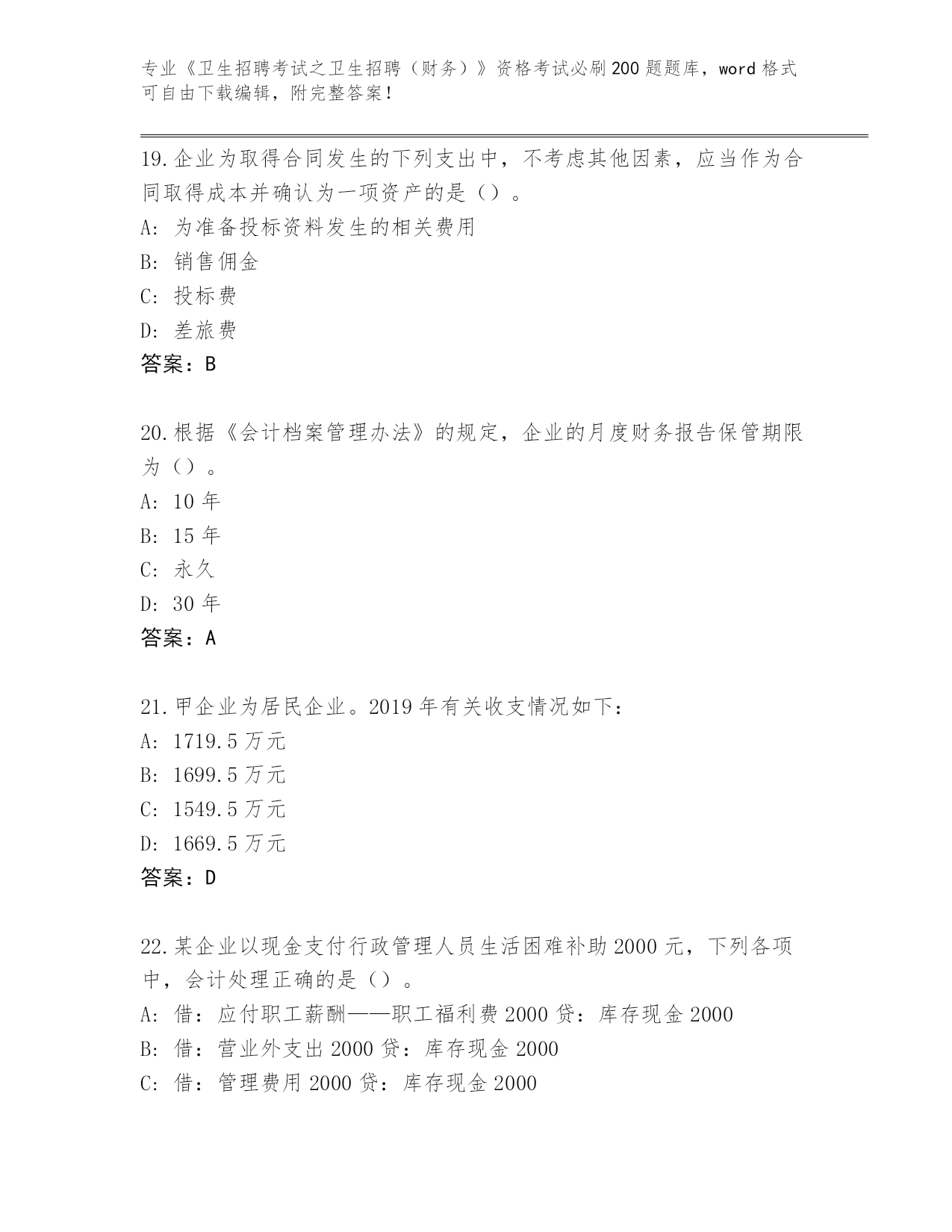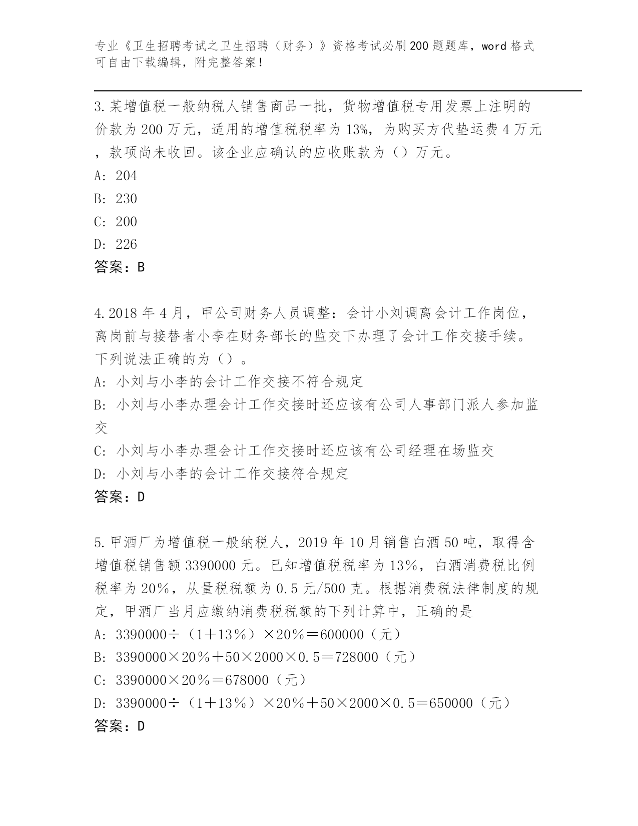 河南省卢氏县内部使用《卫生招聘考试之卫生招聘(财务)》资格考试必刷200题完整题库含答案(名师推荐)