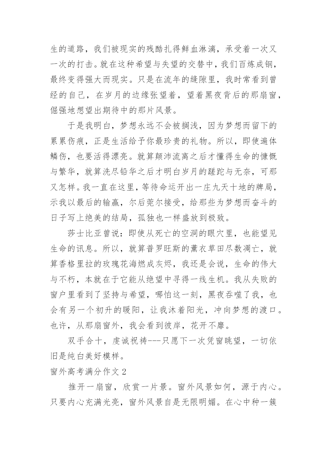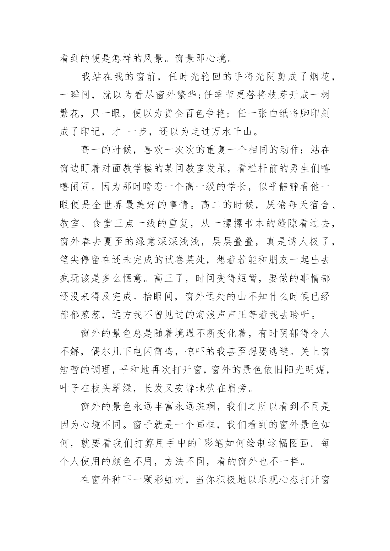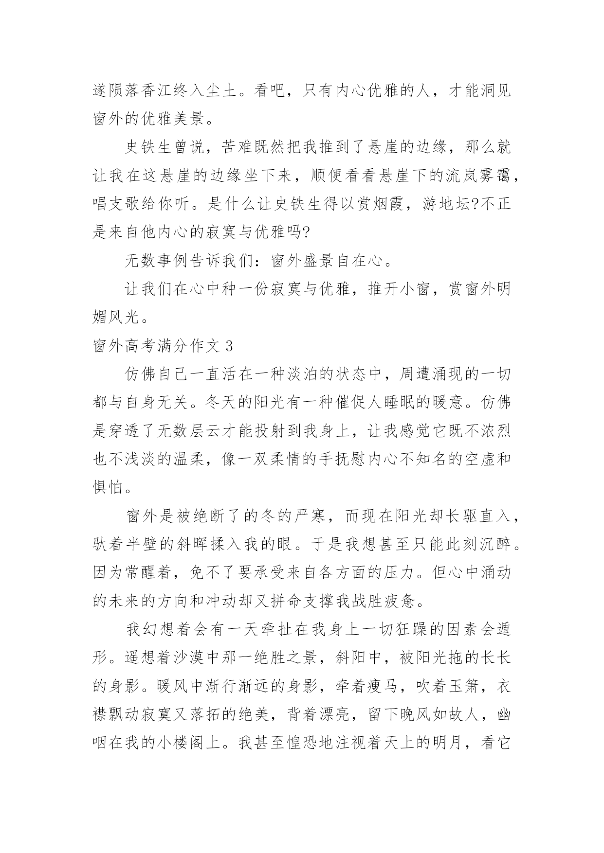 窗外高考满分作文窗外高考满分作文在学习、工作或生活中,大家一定都接触过作文吧,作文是人们以书面形式表情达意的言语活动。怎么写作文才能避免踩雷呢?以下是小编精心整理的窗外高考满分作文,仅供参考,大家一起来看看吧。窗外高考满分作文1静好岁月缓缓流淌,徜徉在清浅流年的光影里,阳光轻吻着脸颊,微风抚过青春里明媚的忧伤。这样简单明净的日子里,我努力追寻着生命中的那抹温暖,努力地想要从生命的窗口里,望见那最美的一片风景。安妮宝贝曾说:花开得太好,所以摇摇欲坠,这一切的事情,老得这样快。还记得当初,夏日午后照耀着暖阳的教室里,从后桌传来的纸条和那清澈明净的笑容。还记得当初,骑着自行车打闹着路过生长着爬山虎的红墙,风把笑声带到远方。还记得当初,一群人肩并肩躺在操场的草坪上,望着天空纯净的蓝,任微风拂过脸颊。而如今,身边的人早已散落各方,不复当初的模样。偶尔还会想起他们,带着回忆里的美好的笑和相见不如怀念的伤感。当时光纺成的纱被绣成华美的图腾,我们被岁月的车轮载着渐行渐远,也渐渐与最初的梦想背道而驰。记忆里的窗口那单纯美好的想法早已模糊,生活中我们望见的是荆棘丛生的道路,我们被现实的残酷扎得鲜血淋漓,承受着一次又一次的打击。就在这种希望与失望的交替中,我们百炼成钢,最终变得强大而现实。只是在流年的缝隙里,我时常看到曾经的自己,在岁月的边缘张望着,望着黑夜背后的那扇窗,倔强地想望出期待中的那片风景。于是我明白,梦想永远不会被搁浅,因为梦想而留下的累累伤痕,正是生活给予你最珍贵的礼物。所以,即使遍体鳞伤,也要活得漂亮。就算颠沛流离之后才懂得生命的慷慨与繁华,就算洗尽铅华之后才明白岁月的蹉跎与无奈,可那又怎样。我一直在这里,等待命运开出一庄九天十地的牌局,示我以最后的输赢,尔后莞尔接受,给那些为梦想而奋斗的日子写上绝美的结局,孤独也一样盛放到极致。莎士比亚曾说:即使从死亡的空洞的眼穴里,也能望见生命的讯息。所以,就算普罗旺斯的薰衣草田尽数凋亡,就算香格里拉的玫瑰花海燃成灰烬,我还是会说,生命的伟大与不朽,本就在于它能从绝望中寻得一线生机。我从失败的窗户里看到了坚持与希望,哪怕这一刻,黑夜吞噬了我,也会有另一个初升的暖阳,让我沐着阳光,冲向梦想的渡口。也许,从那扇窗外,我会看到彼岸,花开不靡。双手合十,虔诚祝祷---只愿下一次凭窗眺望,一切依旧是纯白美好模样。窗外高考满分作文2推开一扇窗,欣赏一片景。窗外风景如何,源于内心。只要内心充满光亮,窗外风景自是无限明媚。在心中种一簇淡菊,身入俗世,眼中亦是优雅之景;在心中洒一树荫翳,身处樊笼,眼中是清爽之色;在心中坠一滴甘露,身处闹市,眼中亦是寂静无限。林徽因说,真正的平静,不是避开车马喧嚣,而是在内心修篱种菊。尽管如流往事,每一天都涛声依旧,只要我们放弃执念,便可寂静安然。是啊,保持内心的平静,方可看到寂寞恬淡之景。打开《围城》的窗子,钱钟书先生饱览寂静学问之景。不管外界如何吹捧,钱钟书只管在清华园那盏孤灯下,持一颗寂静之心与学问为友,在书海中泛舟。推开窗,钱钟书看到了静,而这静,正是来自他本心的寂静安然。而生活中不乏这样的人:急于炫耀自己的一时成就,内心浮躁,推开窗子,他看到的只能是喧闹嘈杂。只有内心平静的人,才能看到寂静恬淡的景色。我不禁想起,三毛内心保持优雅,推开窗子,她看到的是撒哈拉的长河落日。保持内心优雅,三毛与丈夫荷西投入沙漠的怀抱,远离俗世,她做了她的“素人渔夫”,以内心的优雅,看到了她那灿烂的依米小花。正如同她自己说的:“如果有来生,要做一棵树,站成永恒,没有悲欢的姿势。一半在尘土里安详,一半在风里飞扬,一半洒落阴凉,一半沐浴阳光。”保持内心的优雅,启而视之,三毛看到了黄沙漫漫中的优雅落日,沐浴阳光。而在民国这个乱世,阮玲玉作为一代默片之后,却没有以内心的优雅对待流言,她从窗子里看到的只是人言可畏,遂陨落香江终入尘土。看吧,只有内心优雅的人,才能洞见窗外的优雅美景。史铁生曾说,苦难既然把我推到了悬崖的边缘,那么就让我在这悬崖的边缘坐下来,顺便看看悬崖下的流岚雾霭,唱支歌给你听。是什么让史铁生得以赏烟霞,游地坛?不正是来自他内心的寂寞与优雅吗?无数事例告诉我们:窗外盛景自在心。让我们在心中种一份寂寞与优雅,推开小窗,赏窗外明媚风光。窗外高考满分作文3仿佛自己一直活在一种淡泊的状态中,周遭涌现的一切都与自身无关。冬天的阳光有一种催促人睡眠的暖意。仿佛是穿透了无数层云才能投射到我身上,让我感觉它既不浓烈也不浅淡的温柔,像一双柔情的手抚慰内心不知名的空虚和惧怕。窗外是被绝断了的冬的严寒,而现在阳光却长驱直入,驮着半壁的斜晖揉入我的眼。于是我想甚至只能此刻沉醉。因为常醒着,免不了要承受来自各方面的压力。但心中涌动的未来的方向和冲动却又拼命支撑我战胜疲惫。我幻想着会有一天牵扯在我身上一切狂躁的因素会