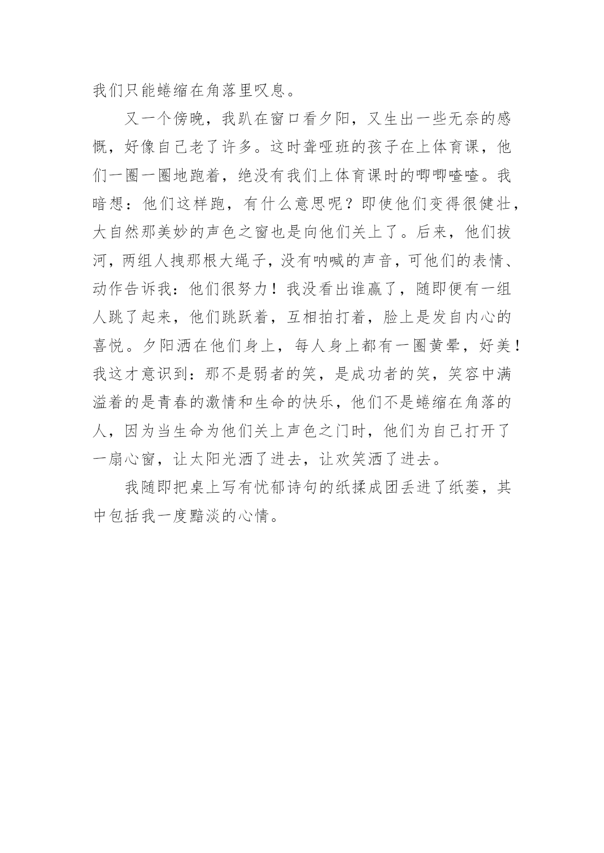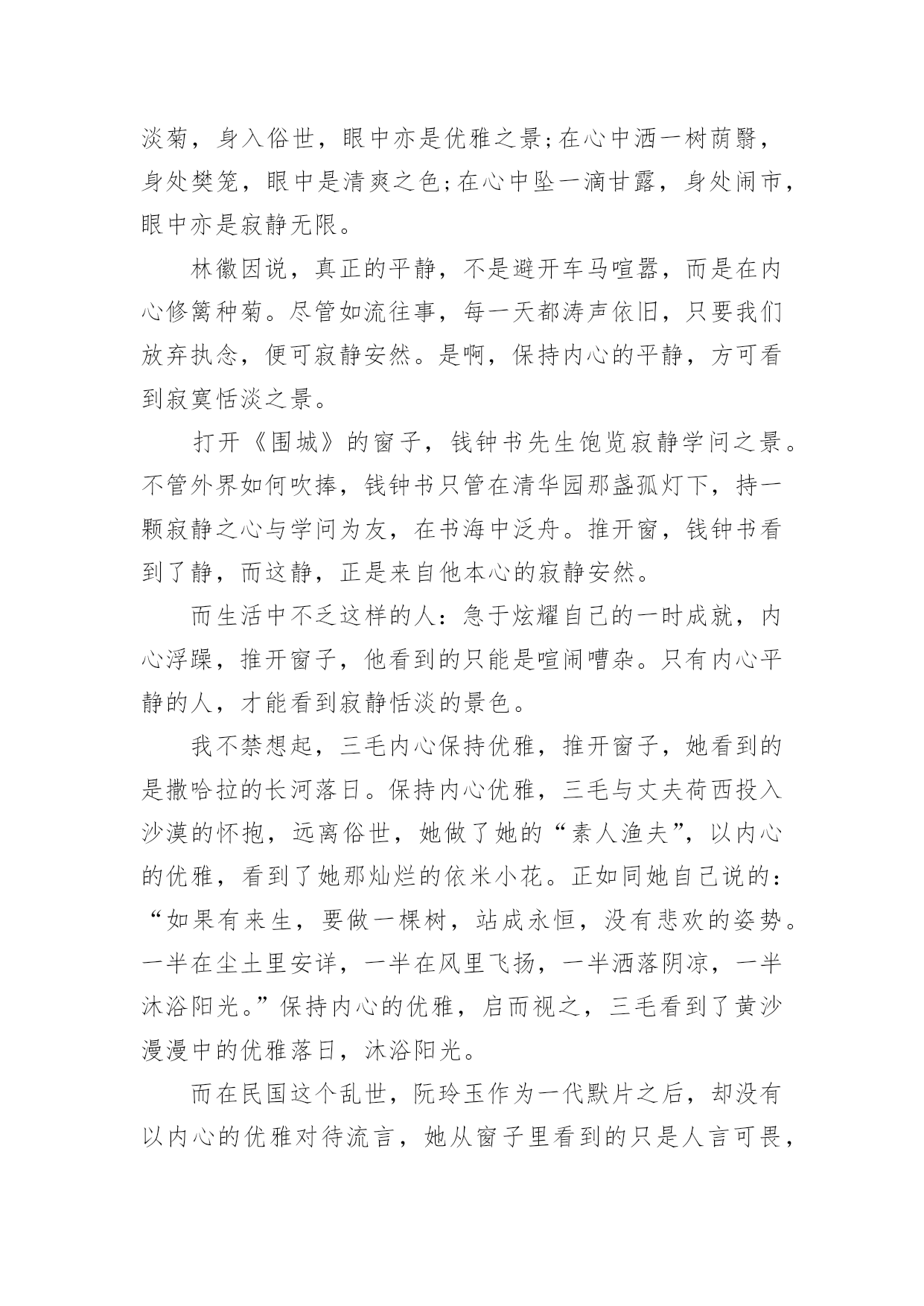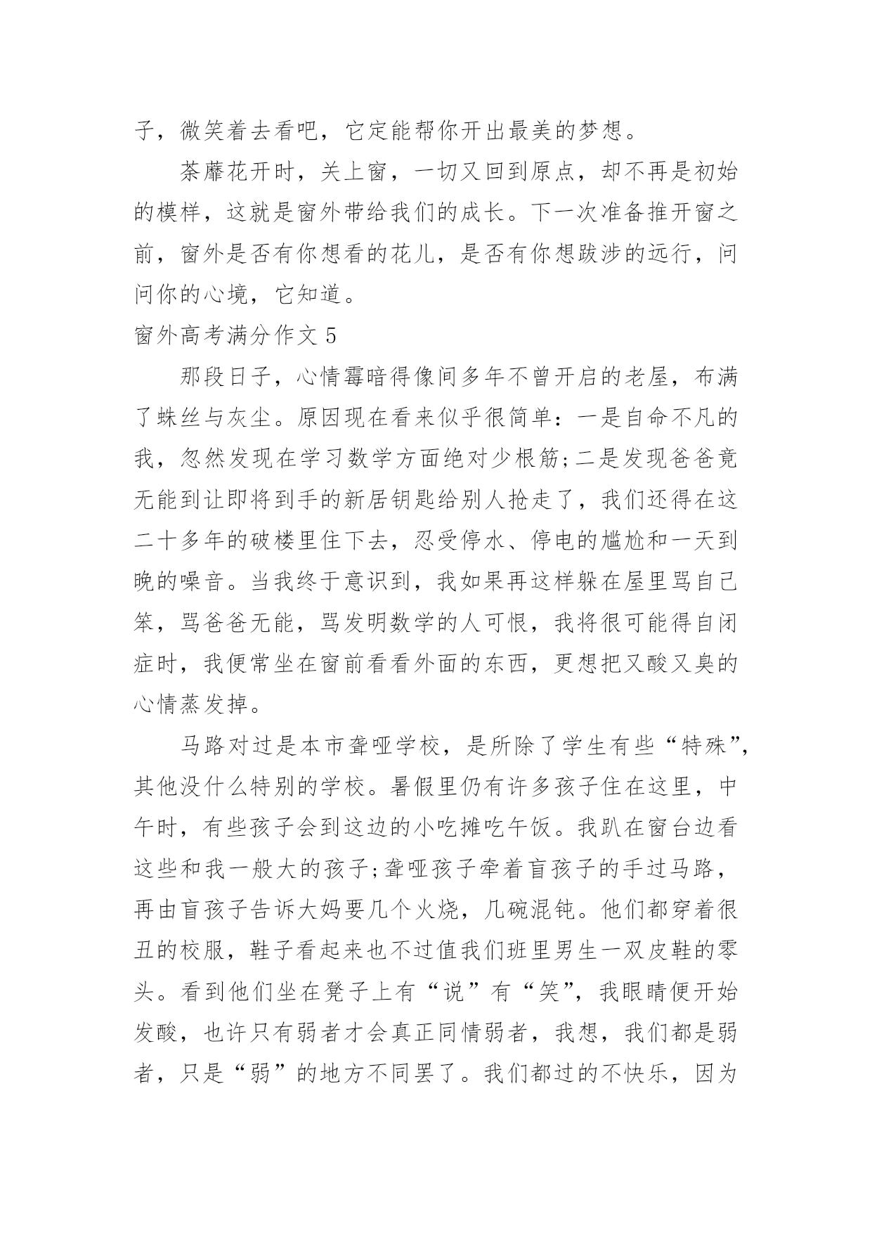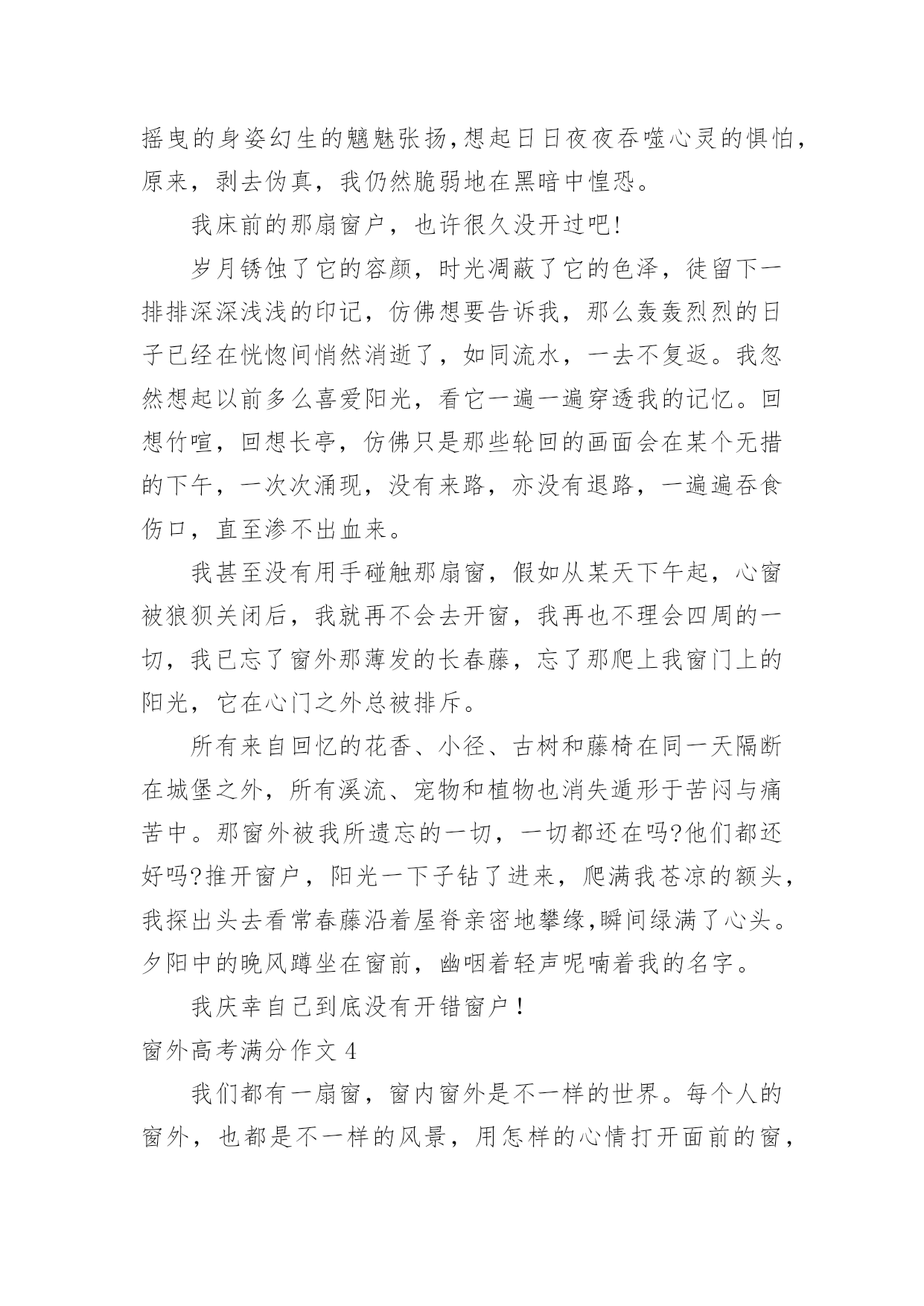 窗外高考满分作文窗外高考满分作文在学习、工作或生活中,大家一定都接触过作文吧,作文是人们以书面形式表情达意的言语活动。怎么写作文才能避免踩雷呢?以下是小编精心整理的窗外高考满分作文,仅供参考,大家一起来看看吧。窗外高考满分作文1静好岁月缓缓流淌,徜徉在清浅流年的光影里,阳光轻吻着脸颊,微风抚过青春里明媚的忧伤。这样简单明净的日子里,我努力追寻着生命中的那抹温暖,努力地想要从生命的窗口里,望见那最美的一片风景。安妮宝贝曾说:花开得太好,所以摇摇欲坠,这一切的事情,老得这样快。还记得当初,夏日午后照耀着暖阳的教室里,从后桌传来的纸条和那清澈明净的笑容。还记得当初,骑着自行车打闹着路过生长着爬山虎的红墙,风把笑声带到远方。还记得当初,一群人肩并肩躺在操场的草坪上,望着天空纯净的蓝,任微风拂过脸颊。而如今,身边的人早已散落各方,不复当初的模样。偶尔还会想起他们,带着回忆里的美好的笑和相见不如怀念的伤感。当时光纺成的纱被绣成华美的图腾,我们被岁月的车轮载着渐行渐远,也渐渐与最初的梦想背道而驰。记忆里的窗口那单纯美好的想法早已模糊,生活中我们望见的是荆棘丛生的道路,我们被现实的残酷扎得鲜血淋漓,承受着一次又一次的打击。就在这种希望与失望的交替中,我们百炼成钢,最终变得强大而现实。只是在流年的缝隙里,我时常看到曾经的自己,在岁月的边缘张望着,望着黑夜背后的那扇窗,倔强地想望出期待中的那片风景。于是我明白,梦想永远不会被搁浅,因为梦想而留下的累累伤痕,正是生活给予你最珍贵的礼物。所以,即使遍体鳞伤,也要活得漂亮。就算颠沛流离之后才懂得生命的慷慨与繁华,就算洗尽铅华之后才明白岁月的蹉跎与无奈,可那又怎样。我一直在这里,等待命运开出一庄九天十地的牌局,示我以最后的输赢,尔后莞尔接受,给那些为梦想而奋斗的日子写上绝美的结局,孤独也一样盛放到极致。莎士比亚曾说:即使从死亡的空洞的眼穴里,也能望见生命的讯息。所以,就算普罗旺斯的薰衣草田尽数凋亡,就算香格里拉的玫瑰花海燃成灰烬,我还是会说,生命的伟大与不朽,本就在于它能从绝望中寻得一线生机。我从失败的窗户里看到了坚持与希望,哪怕这一刻,黑夜吞噬了我,也会有另一个初升的暖阳,让我沐着阳光,冲向梦想的渡口。也许,从那扇窗外,我会看到彼岸,花开不靡。双手合十,虔诚祝祷---只愿下一次凭窗眺望,一切依旧是纯白美好模样。窗外高考满分作文2推开一扇窗,欣赏一片景。窗外风景如何,源于内心。只要内心充满光亮,窗外风景自是无限明媚。在心中种一簇淡菊,身入俗世,眼中亦是优雅之景;在心中洒一树荫翳,身处樊笼,眼中是清爽之色;在心中坠一滴甘露,身处闹市,眼中亦是寂静无限。林徽因说,真正的平静,不是避开车马喧嚣,而是在内心修篱种菊。尽管如流往事,每一天都涛声依旧,只要我们放弃执念,便可寂静安然。是啊,保持内心的平静,方可看到寂寞恬淡之景。打开《围城》的窗子,钱钟书先生饱览寂静学问之景。不管外界如何吹捧,钱钟书只管在清华园那盏孤灯下,持一颗寂静之心与学问为友,在书海中泛舟。推开窗,钱钟书看到了静,而这静,正是来自他本心的寂静安然。而生活中不乏这样的人:急于炫耀自己的一时成就,内心浮躁,推开窗子,他看到的只能是喧闹嘈杂。只有内心平静的人,才能看到寂静恬淡的景色。我不禁想起,三毛内心保持优雅,推开窗子,她看到的是撒哈拉的长河落日。保持内心优雅,三毛与丈夫荷西投入沙漠的怀抱,远离俗世,她做了她的“素人渔夫”,以内心的优雅,看到了她那灿烂的依米小花。正如同她自己说的:“如果有来生,要做一棵树,站成永恒,没有悲欢的姿势。一半在尘土里安详,一半在风里飞扬,一半洒落阴凉,一半沐浴阳光。”保持内心的优雅,启而视之,三毛看到了黄沙漫漫中的优雅落日,沐浴阳光。而在民国这个乱世,阮玲玉作为一代默片之后,却没有以内心的优雅对待流言,她从窗子里看到的只是人言可畏,遂陨落香江终入尘土。看吧,只有内心优雅的人,才能洞见窗外的优雅美景。史铁生曾说,苦难既然把我推到了悬崖的边缘,那么就让我在这悬崖的边缘坐下来,顺便看看悬崖下的流岚雾霭,唱支歌给你听。是什么让史铁生得以赏烟霞,游地坛?不正是来自他内心的寂寞与优雅吗?无数事例告诉我们:窗外盛景自在心。让我们在心中种一份寂寞与优雅,推开小窗,赏窗外明媚风光。窗外高考满分作文3仿佛自己一直活在一种淡泊的状态中,周遭涌现的一切都与自身无关。冬天的阳光有一种催促人睡眠的暖意。仿佛是穿透了无数层云才能投射到我身上,让我感觉它既不浓烈也不浅淡的温柔,像一双柔情的手抚慰内心不知名的空虚和惧怕。窗外是被绝断了的冬的严寒,而现在阳光却长驱直入,驮着半壁的斜晖揉入我的眼。于是我想甚至只能此刻沉醉。因为常醒着,免不了要承受来自各方面的压力。但心中涌动的未来的方向和冲动却又拼命支撑我战胜疲惫。我幻想着会有一天牵扯在我身上一切狂躁的因素会