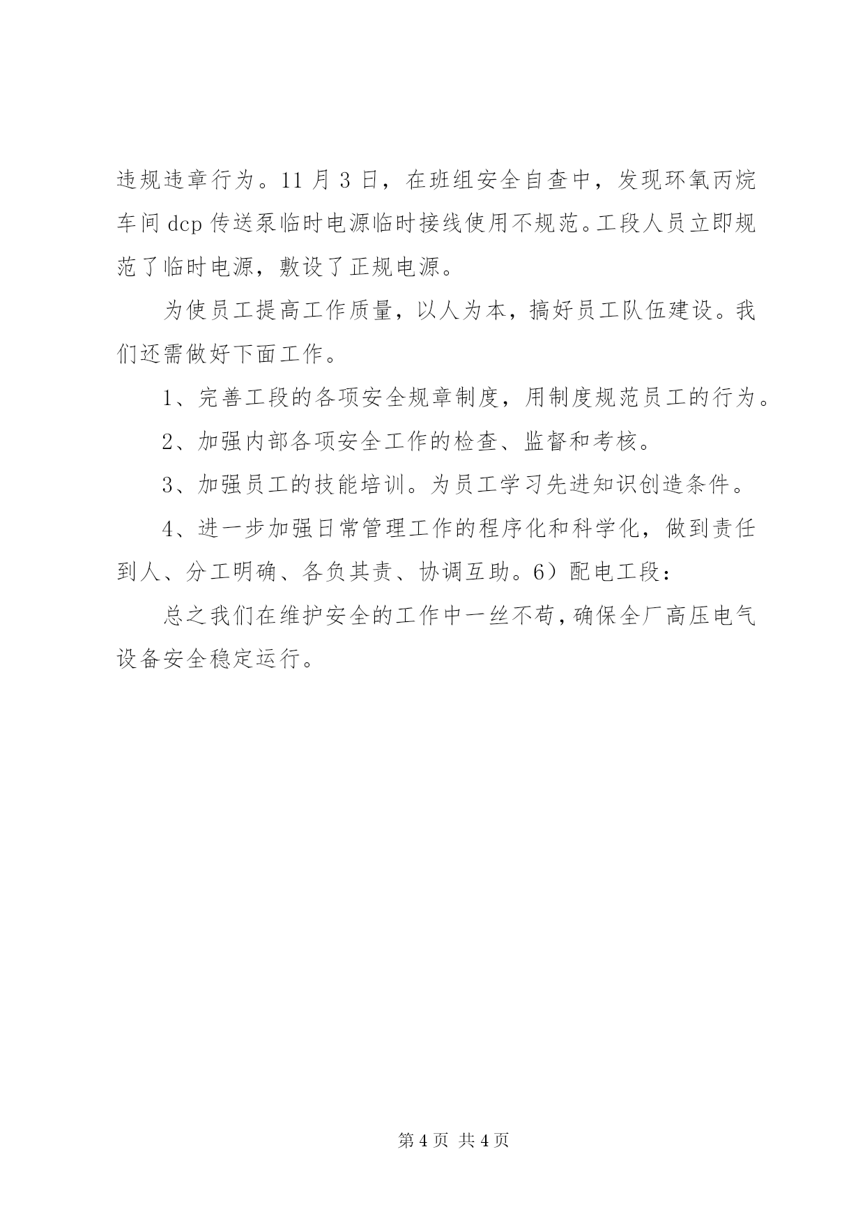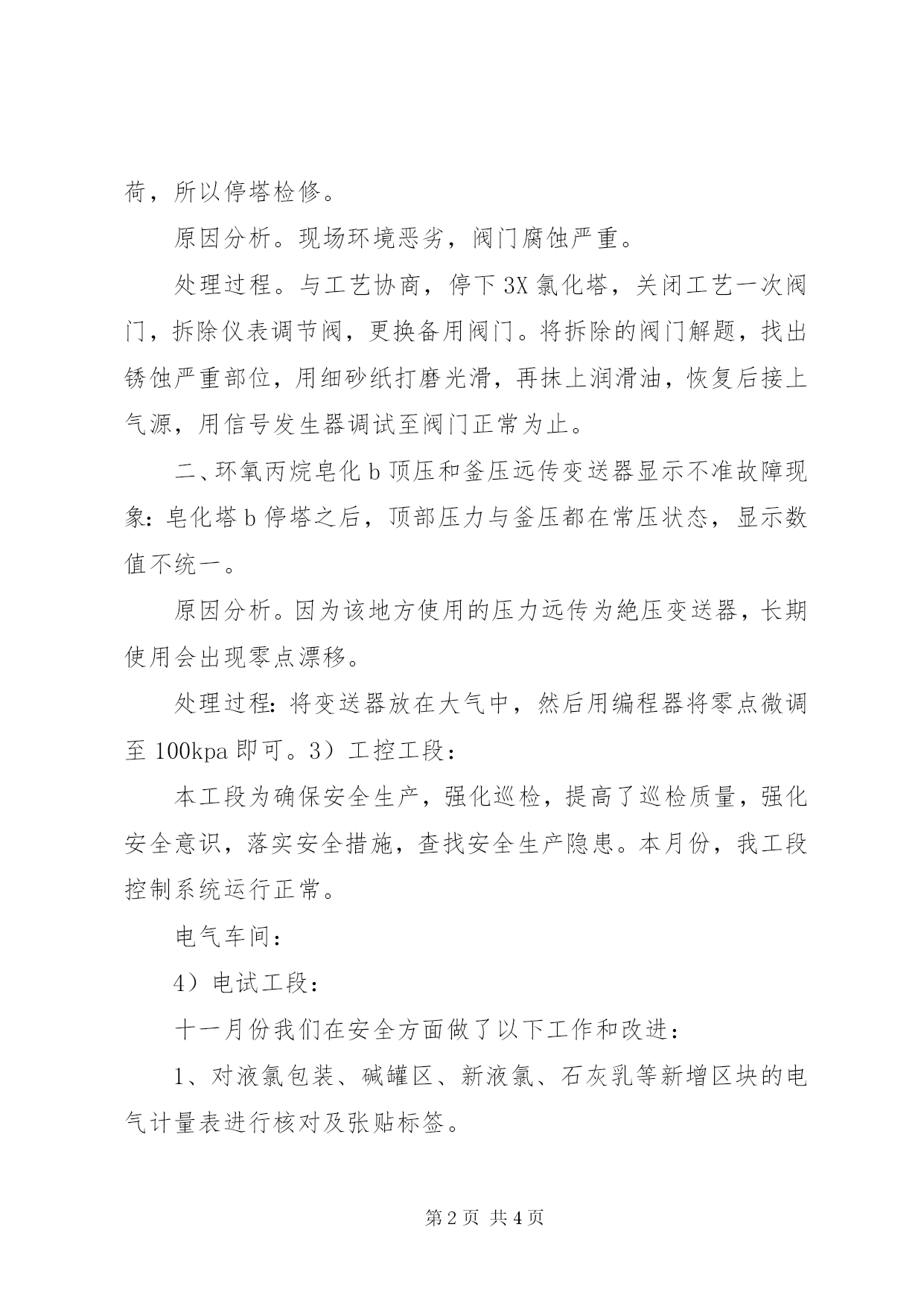 第PAGE\*Arabic\*MERGEFORMAT4页共NUMPAGES\*MERGEFORMAT4页11月安全环保工作总结电仪车间十一月安全总结十一月份本车间为了安全生产,进行了以下学习工作。督促隐患治理以确保安全生产,从基础工作入手,强化安全意识,落实安全措施,查找安全生产隐患。把车间安全会议精神及时传达到工段每一位员工,职工安全意识显著增强;平时加大巡检力度,提高了巡检质量,电气装置仪表装置均运行良好。下面以各工段为单位进行分类汇总。仪表车间各工段:1)碱修工段:本月份,我工段仪表装置运行正常,无停车事故发生。离子膜两套装置满负荷运行,对部分调节阀进行日常维护,确保每台调节阀正常运行。对部分ph计进行了维护保养,对即将到寿命的电极进行更换,使工艺得到较为准确的数据。n槽阳极液位阀门反馈杆故障,紧固后正常投入运行。对部分阀门气源管出现爆裂情况进行整改,协调工艺将部分气源管更换。气化部分循环水调节阀盘根出泄漏,无法动作,重点对其维护。粒碱装置本月份连续运行,氢气减压阀出现故障,更换后正常投用。强调氢气自立式减压阀不能随便调节。熔碱泵电拌热温度信号线被损坏,更换新热电偶投用。2)氯修工段:一、三氯乙烯3X氯化塔氯气流量调节阀故障故障现象。阀门开度达不到100%,流量不能满足工艺满负荷,所以停塔检修。原因分析。现场环境恶劣,阀门腐蚀严重。处理过程。与工艺协商,停下3X氯化塔,关闭工艺一次阀门,拆除仪表调节阀,更换备用阀门。将拆除的阀门解题,找出锈蚀严重部位,用细砂纸打磨光滑,再抹上润滑油,恢复后接上气源,用信号发生器调试至阀门正常为止。二、环氧丙烷皂化b顶压和釜压远传变送器显示不准故障现象:皂化塔b停塔之后,顶部压力与釜压都在常压状态,显示数值不统一。原因分析。因为该地方使用的压力远传为絶压变送器,长期使用会出现零点漂移。处理过程:将变送器放在大气中,然后用编程器将零点微调至100kpa即可。3)工控工段:本工段为确保安全生产,强化巡检,提高了巡检质量,强化安全意识,落实安全措施,查找安全生产隐患。本月份,我工段控制系统运行正常。电气车间:4)电试工段:十一月份我们在安全方面做了以下工作和改进:1、对液氯包装、碱罐区、新液氯、石灰乳等新增区块的电气计量表进行核对及张贴标签。2、对1375kw柴油发电机更换电池以保证发电机正常的启动电压。3、我们对更换下来的电池进行活化处理,以保证我们有一组备用电池来随时可以更换。4、对东瑞化工的10kv的能源计量网络表进行核对,对不正确的信息重新整改。5)电修工段。十一月份电修工段以确保安全生产为主要工作目标,以加强巡检,提高巡检质量,查找隐患,及时整改为主要工作任务,从基础工作入手,强化安全意识,落实安全措施,查找安全生产隐患。本月,工段组织员工严格清查并统计了各个区块的异常机泵,包括声音异常、振动异常、温度异常以及电流异常的各机泵,及时上报了公司。另外,在11月10日前,工段将可能存在隐患得电机统计完毕。工段进一步加强劳动纪律,加大各项管理力度。在临时用电的管理方面,要求每天由专人至少巡检一次,临时用电的使用要严格履行各项手续,并详细对使用记录进行登记。日常工作中,夜班值班人员必须将各项已完成的工作、未完成的工作详细记录,并认真交接班。在电气设备运行和维护过程中,员工能够严格遵守各项规章制度,特别是工作票和临时用电、高空作业制度,没有发现任何违规违章行为。11月3日,在班组安全自查中,发现环氧丙烷车间dcp传送泵临时电源临时接线使用不规范。工段人员立即规范了临时电源,敷设了正规电源。为使员工提高工作质量,以人为本,搞好员工队伍建设。我们还需做好下面工作。1、完善工段的各项安全规章制度,用制度规范员工的行为。2、加强内部各项安全工作的检查、监督和考核。3、加强员工的技能培训。为员工学习先进知识创造条件。4、进一步加强日常管理工作的程序化和科学化,做到责任到人、分工明确、各负其责、协调互助。6)配电工段:总之我们在维护安全的工作中一丝不苟,确保全厂高压电气设备安全稳定运行。