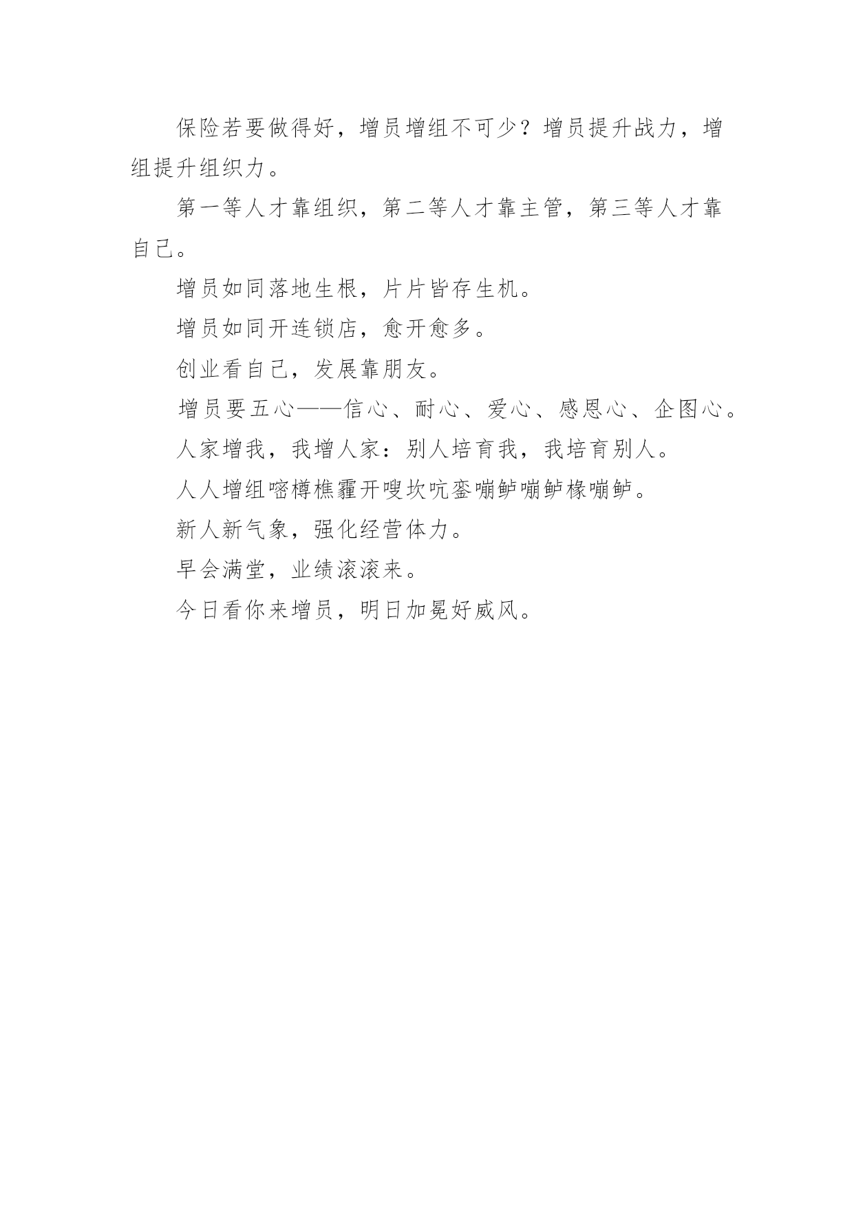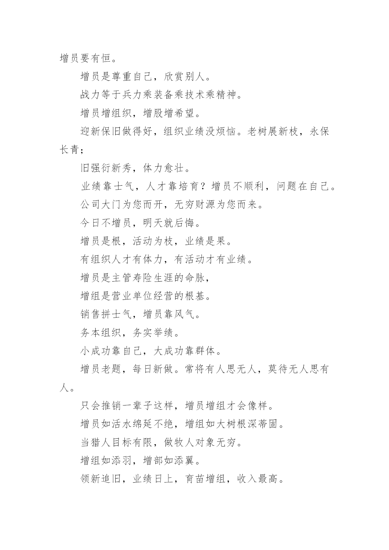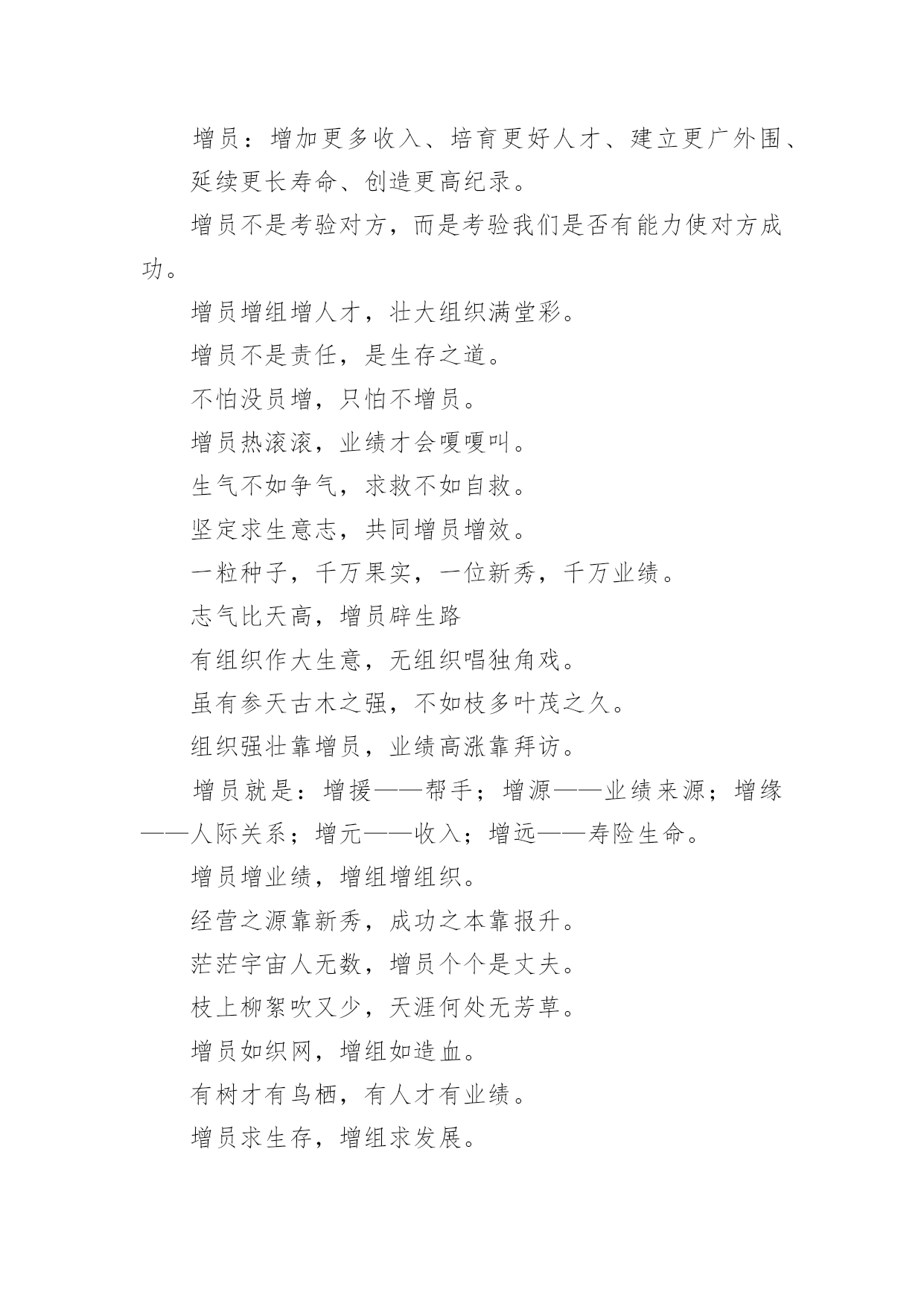 保险公司口号保险公司口号大全无论是身处学校还是步入社会,大家肯定对各类口号都很熟悉吧,口号具有在理智上启发人们,在情感上打动人们的作用。那么什么样的口号才更具感染力呢?以下是小编为大家整理的保险公司口号大全,欢迎大家借鉴与参考,希望对大家有所帮助。增员无师父,耐心就增有。寿险生命的意义在增员。有员千里来相助,育组报答万里情。月月增六员,经营万万年。能增员,业绩好;有组织,寿命长。攻则胜,守则败。饮水思源,薪火相传。欲知过去因(组织),就看现在果(业绩);欲知未来果(业绩),就看现在因(组织)。有“心”就有“新”,有“新”就有“薪”有木才有材,有人才有财;育才如增财,育才如置产。单枪匹马人孤势单,招兵买马人多势众。树大好遮荫,人多业绩广。不断地接触新人,等于不断地拥有收入来源。增员要有量,增员要有步,增员要有法,增员要有力,增员要有恒。增员是尊重自己,欣赏别人。战力等于兵力乘装备乘技术乘精神。增员增组织,增股增希望。迎新保旧做得好,组织业绩没烦恼。老树展新枝,永保长青;旧强衍新秀,体力愈壮。业绩靠士气,人才靠培育?增员不顺利,问题在自己。公司大门为您而开,无穷财源为您而来。今日不增员,明天就后悔。增员是根,活动为枝,业绩是果。有组织人才有体力,有活动才有业绩。增员是主管寿险生涯的命脉,增组是营业单位经营的根基。销售拼士气,增员靠风气。务本组织,务实举绩。小成功靠自己,大成功靠群体。增员老题,每日新做。常将有人思无人,莫待无人思有人。只会推销一辈子这样,增员增组才会像样。增员如活水绵延不绝,增组如大树根深蒂固。当猎人目标有限,做牧人对象无穷。增组如添羽,增部如添翼。领新追旧,业绩日上,育苗增组,收入最高。增员:增加更多收入、培育更好人才、建立更广外围、延续更长寿命、创造更高纪录。增员不是考验对方,而是考验我们是否有能力使对方成功。增员增组增人才,壮大组织满堂彩。增员不是责任,是生存之道。不怕没员增,只怕不增员。增员热滚滚,业绩才会嗄嗄叫。生气不如争气,求救不如自救。坚定求生意志,共同增员增效。一粒种子,千万果实,一位新秀,千万业绩。志气比天高,增员辟生路有组织作大生意,无组织唱独角戏。虽有参天古木之强,不如枝多叶茂之久。组织强壮靠增员,业绩高涨靠拜访。增员就是:增援——帮手;增源——业绩来源;增缘——人际关系;增元——收入;增远——寿险生命。增员增业绩,增组增组织。经营之源靠新秀,成功之本靠报升。茫茫宇宙人无数,增员个个是丈夫。枝上柳絮吹又少,天涯何处无芳草。增员如织网,增组如造血。有树才有鸟栖,有人才有业绩。增员求生存,增组求发展。保险若要做得好,增员增组不可少?增员提升战力,增组提升组织力。第一等人才靠组织,第二等人才靠主管,第三等人才靠自己。增员如同落地生根,片片皆存生机。增员如同开连锁店,愈开愈多。创业看自己,发展靠朋友。增员要五心——信心、耐心、爱心、感恩心、企图心。人家增我,我增人家:别人培育我,我培育别人。人人增组嘧樽樵霾开嗖坎吭銮嘣鲈嘣鲈椽嘣鲈。新人新气象,强化经营体力。早会满堂,业绩滚滚来。今日看你来增员,明日加冕好威风。