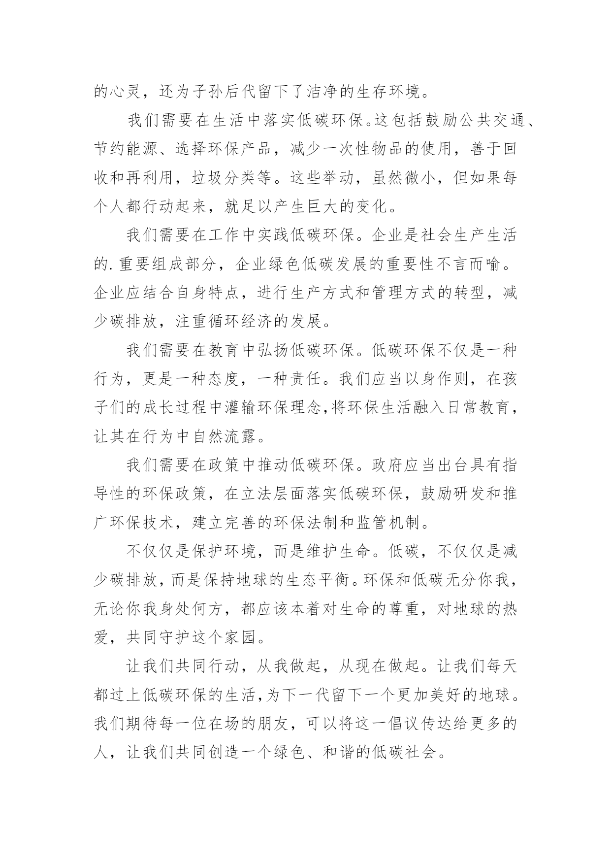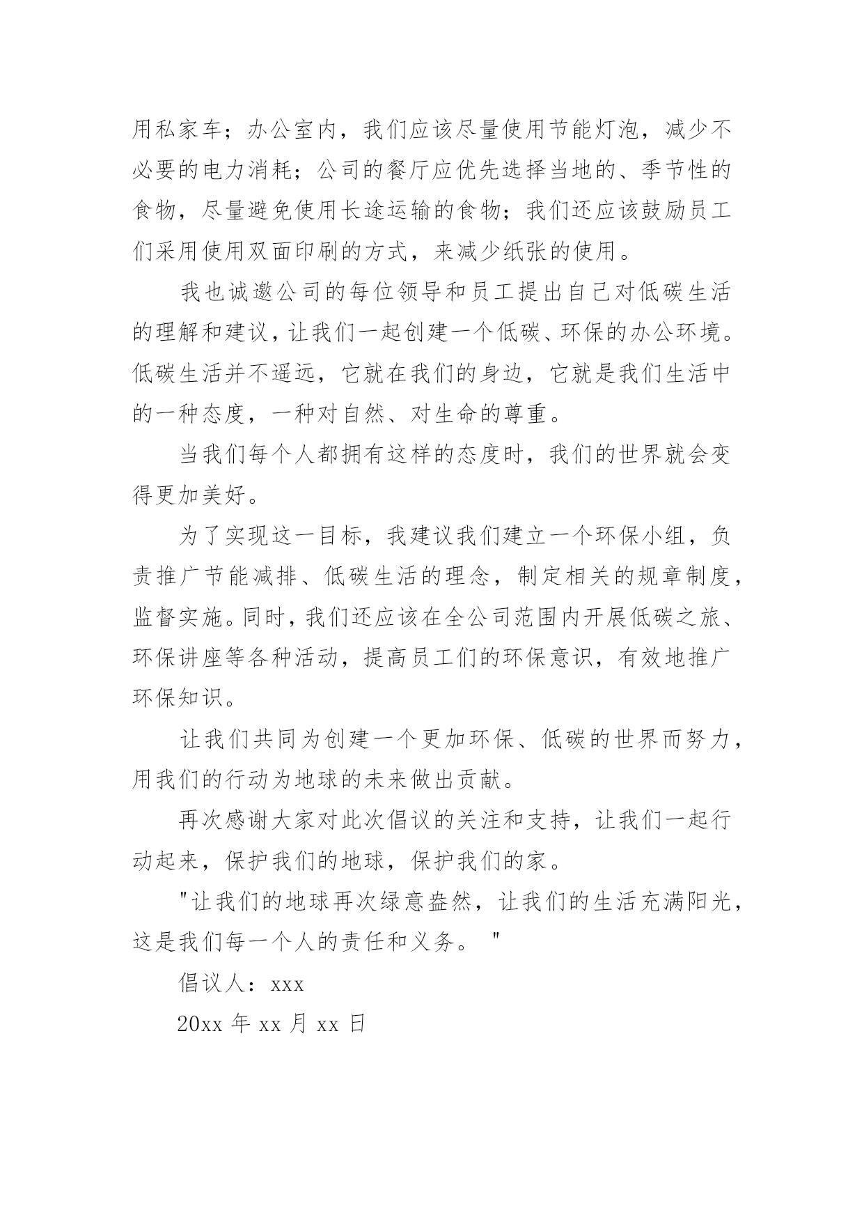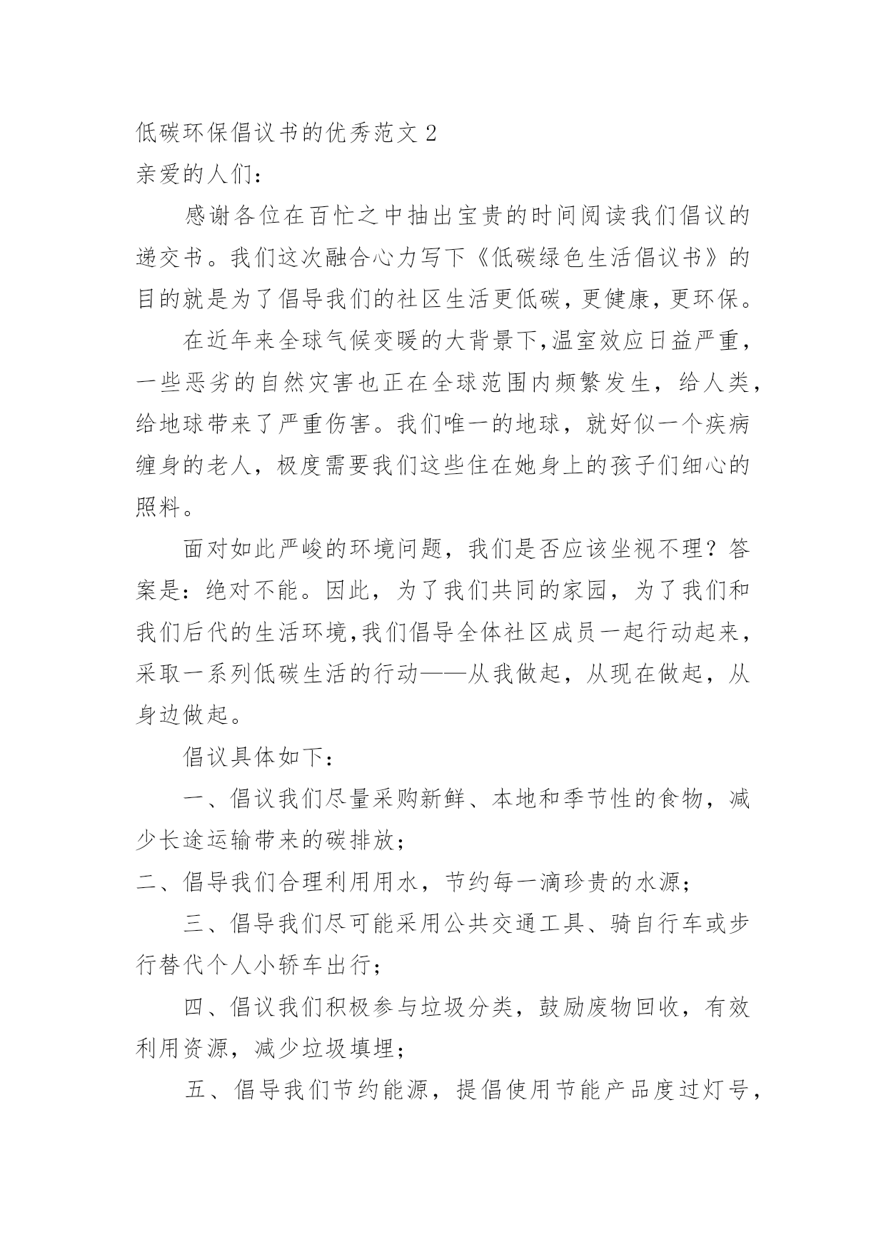 低碳环保倡议书的优秀低碳环保倡议书的优秀范文在不断进步的时代,倡议书的使用频率越来越高,倡议书本身不具有很强的约束力,有关人员可以表示响应,也可以不表示响应。相信许多人会觉得倡议书很难写吧,下面是小编帮大家整理的低碳环保倡议书的优秀范文,欢迎阅读与收藏。低碳环保倡议书的优秀范文1亲爱的人们:我在这里,作为公司的策划人,倡议我们一起投身到保护我们居住的地球这一伟大的事业中去。前一段时间,我参观了几个用户的工厂,和他们的工作人员交谈时,我深深地意识到,我们的工作与保护环境息息相关。日常生活中的每一个细小动作,都会对我们的生存环境产生影响,我们需要更积极的态度来面对这个问题。为此,我希望我们所有的'员工能够尊重自然、尊重环境,尽我们最大的能力,减少排放的二氧化碳,参与到低碳生活的行列中来,养成节约能源、节约资源的好习惯。我相信,只有我们每个人都参与进来,才能最大限度地降低碳排放,保护我们的地球。我们需要采取一些实质性的措施,比如:鼓励员工使用公共交通工具上下班,尽量避免用私家车;办公室内,我们应该尽量使用节能灯泡,减少不必要的电力消耗;公司的餐厅应优先选择当地的、季节性的食物,尽量避免使用长途运输的食物;我们还应该鼓励员工们采用使用双面印刷的方式,来减少纸张的使用。我也诚邀公司的每位领导和员工提出自己对低碳生活的理解和建议,让我们一起创建一个低碳、环保的办公环境。低碳生活并不遥远,它就在我们的身边,它就是我们生活中的一种态度,一种对自然、对生命的尊重。当我们每个人都拥有这样的态度时,我们的世界就会变得更加美好。为了实现这一目标,我建议我们建立一个环保小组,负责推广节能减排、低碳生活的理念,制定相关的规章制度,监督实施。同时,我们还应该在全公司范围内开展低碳之旅、环保讲座等各种活动,提高员工们的环保意识,有效地推广环保知识。让我们共同为创建一个更加环保、低碳的世界而努力,用我们的行动为地球的未来做出贡献。再次感谢大家对此次倡议的关注和支持,让我们一起行动起来,保护我们的地球,保护我们的家。"让我们的地球再次绿意盎然,让我们的生活充满阳光,这是我们每一个人的责任和义务。"倡议人:xxx20xx年xx月xx日低碳环保倡议书的优秀范文2亲爱的人们:感谢各位在百忙之中抽出宝贵的时间阅读我们倡议的递交书。我们这次融合心力写下《低碳绿色生活倡议书》的目的就是为了倡导我们的社区生活更低碳,更健康,更环保。在近年来全球气候变暖的大背景下,温室效应日益严重,一些恶劣的自然灾害也正在全球范围内频繁发生,给人类,给地球带来了严重伤害。我们唯一的地球,就好似一个疾病缠身的老人,极度需要我们这些住在她身上的孩子们细心的照料。面对如此严峻的环境问题,我们是否应该坐视不理?答案是:绝对不能。因此,为了我们共同的家园,为了我们和我们后代的生活环境,我们倡导全体社区成员一起行动起来,采取一系列低碳生活的行动——从我做起,从现在做起,从身边做起。倡议具体如下:一、倡议我们尽量采购新鲜、本地和季节性的食物,减少长途运输带来的碳排放;二、倡导我们合理利用用水,节约每一滴珍贵的水源;三、倡导我们尽可能采用公共交通工具、骑自行车或步行替代个人小轿车出行;四、倡议我们积极参与垃圾分类,鼓励废物回收,有效利用资源,减少垃圾填埋;五、倡导我们节约能源,提倡使用节能产品度过灯号,晚间不用电器尽量关闭。以上五点倡议,涵盖了我们日常生活的各个方面。我们希望并相信,只要我们每一个人都能遵循并实践,就能在我们的社区中形成一股强大的低碳生活的新风尚。我们相信,小步走得快,只要每个人都能尽自己的一份力,就能推动全社区、乃至全人类走向一个更健康、更绿色、更可持续的未来。我们坚信,我们的'地球,是值得我们去爱的,让我们携手并肩,行动起来,珍爱这个属于我们的家园。一起期待我们的社区在所有成员的共同努力下,成为一片绿色的翡翠,一个低碳的乐园,一个带给我们无尽的幸福和欢乐的避风港。让我们共同前行,为了我们的地球、为了我们的未来!倡议人:xxx20xx年xx月xx日低碳环保倡议书的优秀范文3亲爱的人们:环保以其独特的性质和价值,已经深深渗透到我们每个人的日常生活中。然而,我们面临的环境问题仍然严峻。气候变化、水污染、空气污染、土地退化等问题让我们深感危机。低碳环保生活方式的推广,有赖于全社会每一个人的实实在在的行动。它不仅使我们与自然和谐共生,净化了人们的心灵,还为子孙后代留下了洁净的生存环境。我们需要在生活中落实低碳环保。这包括鼓励公共交通、节约能源、选择环保产品,减少一次性物品的使用,善于回收和再利用,垃圾分类等。这些举动,虽然微小,但如果每个人都行动起来,就足以产生巨大的变化。我们需要在工作中实践低碳环保。企业是社会生产生活的.重要组成部分,企业绿色低碳发展的重要性不言而喻。企业应结合自身特点,进行